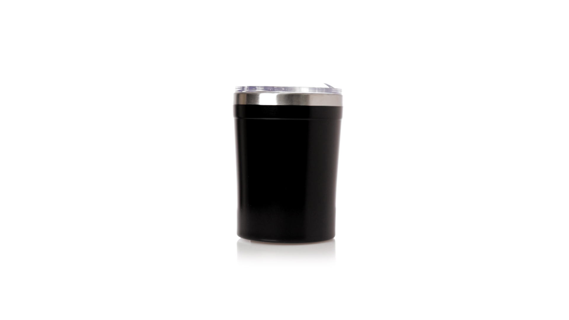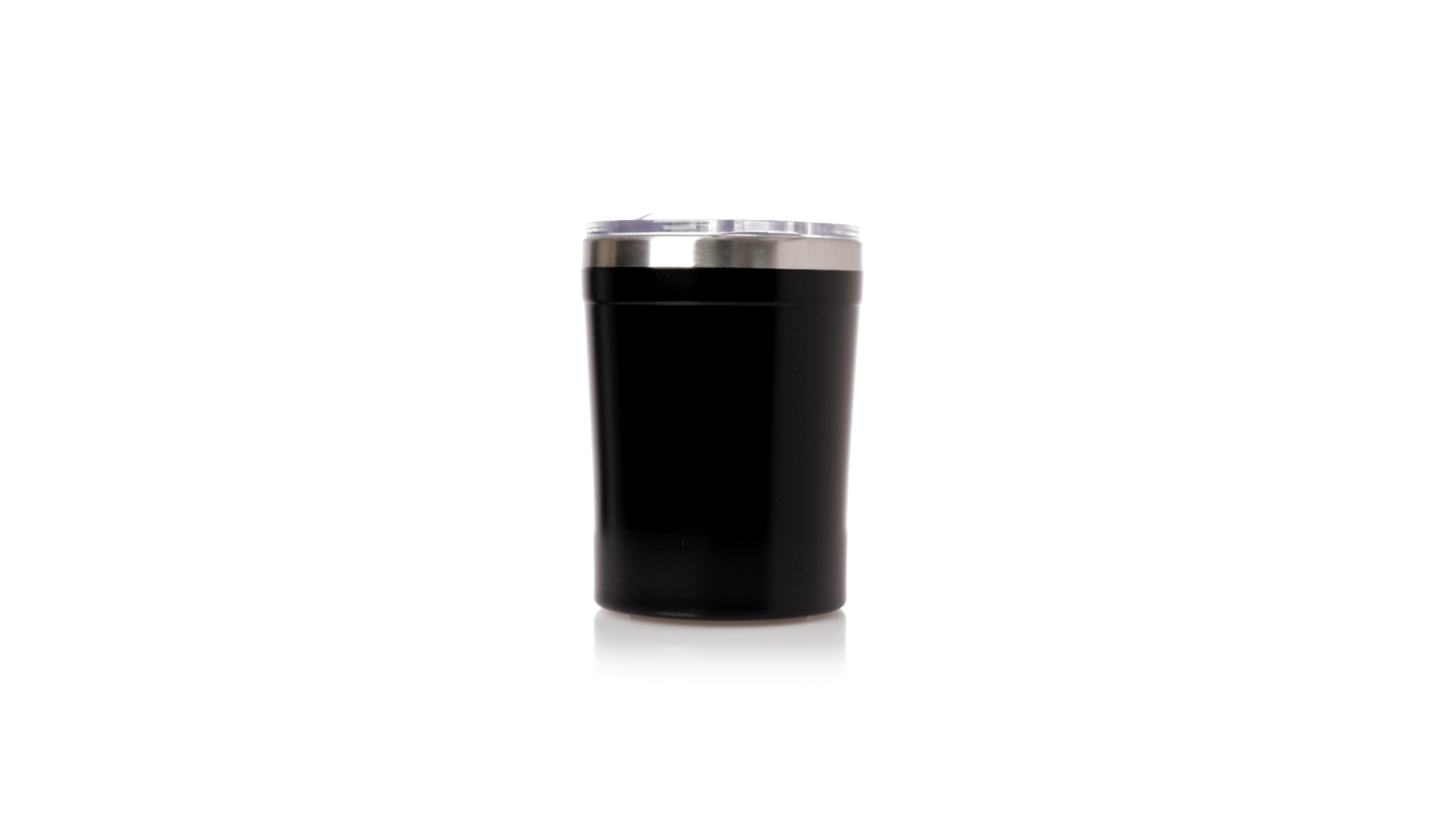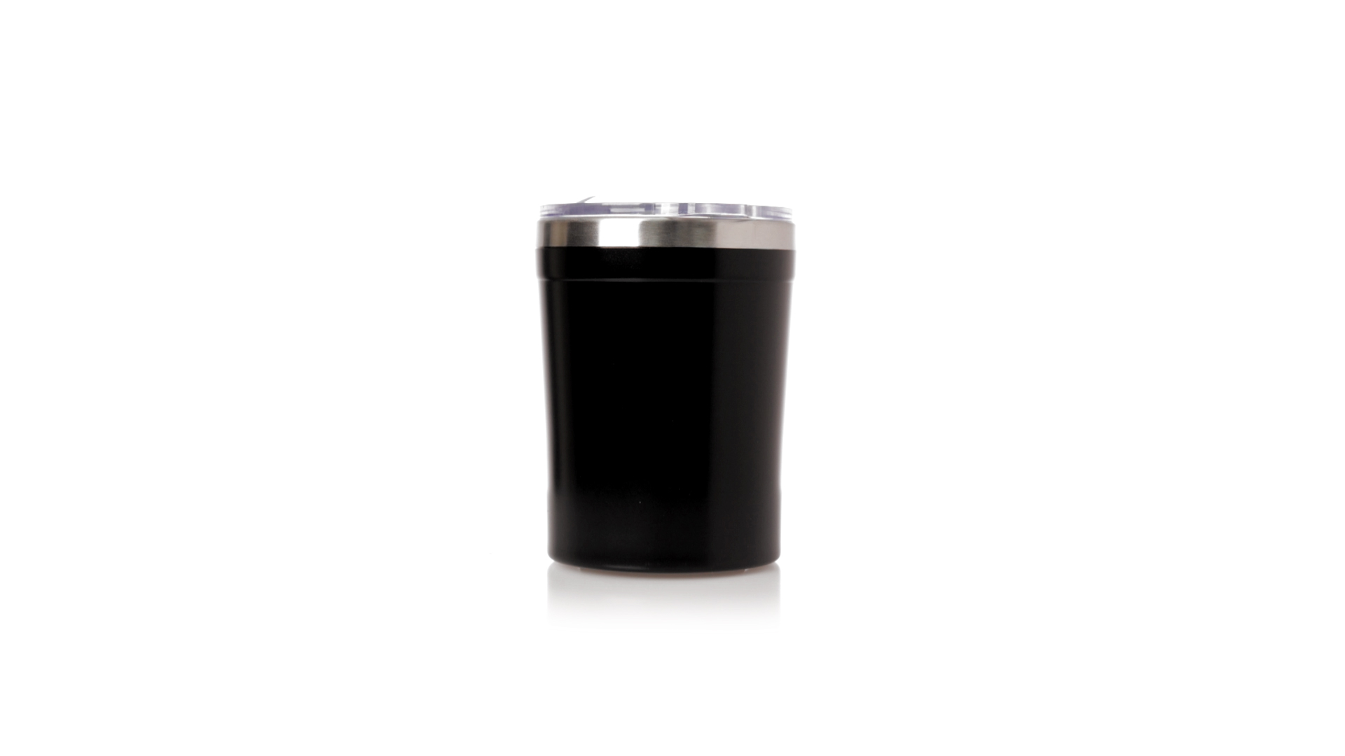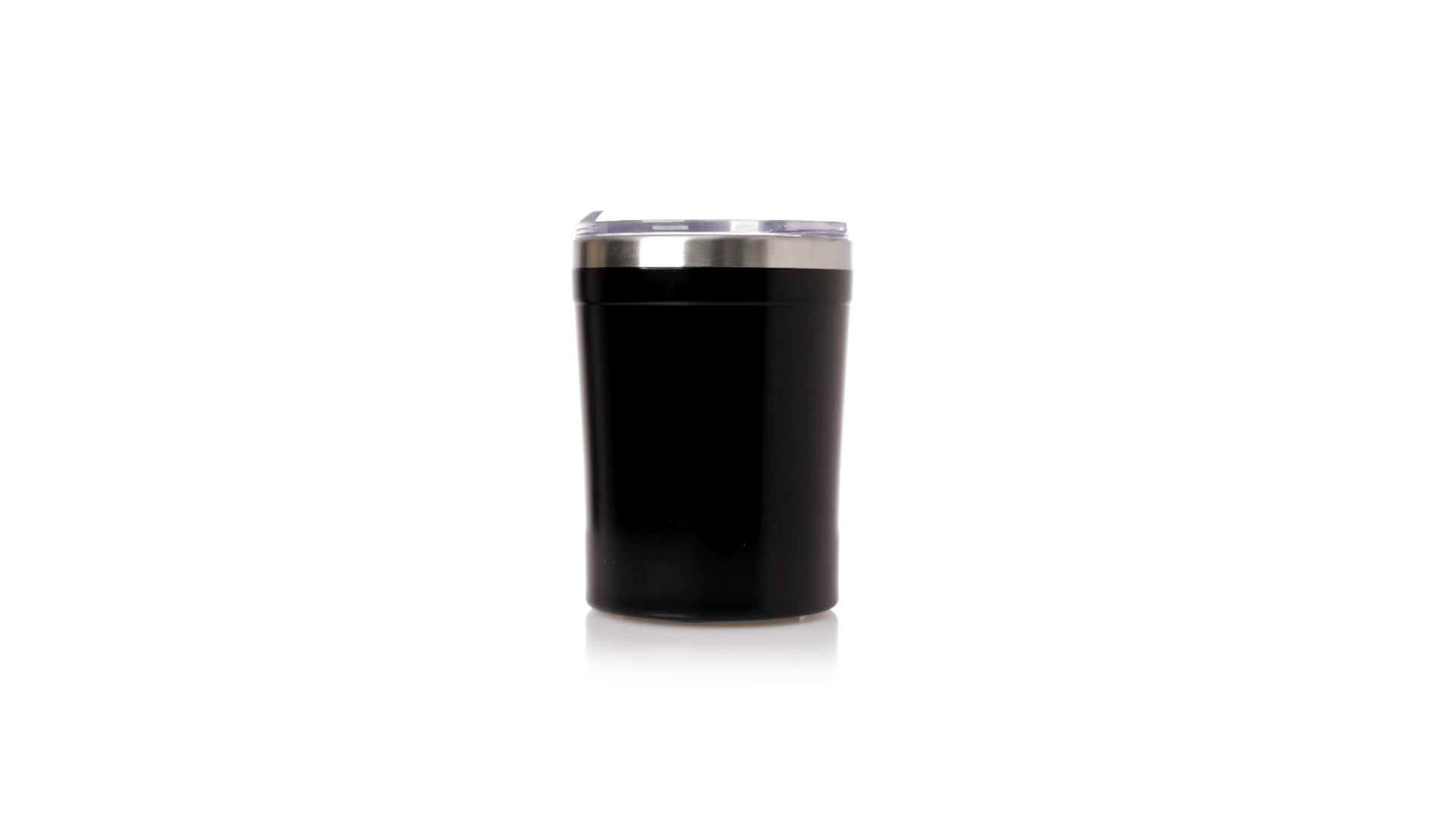 Thermobecher aus rostfreiem Stahl mit einem Fassungsvermögen von 350 ml. Aussen aus PP, mit Spender und leicht zu öffnendem Deckel. BPA-frei. Präsentiert in einer individuellen Kraft-Design-Box.