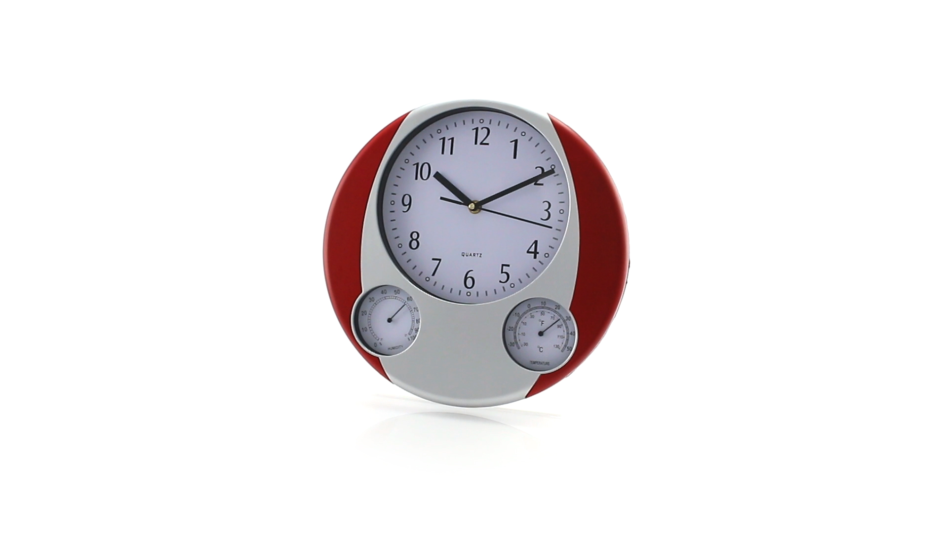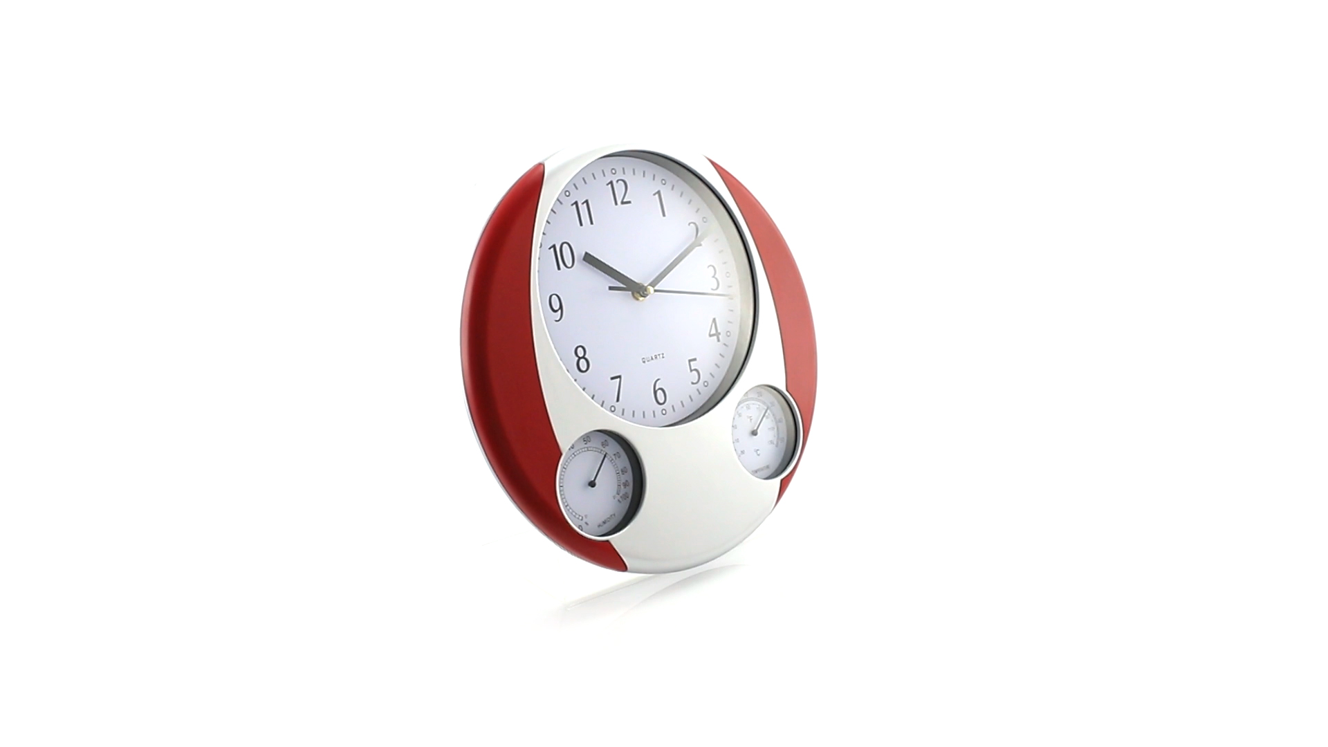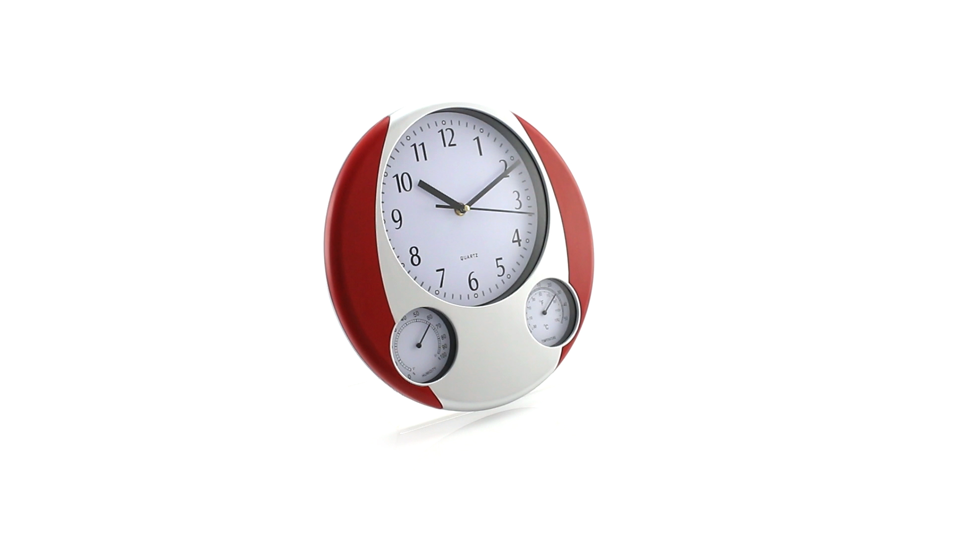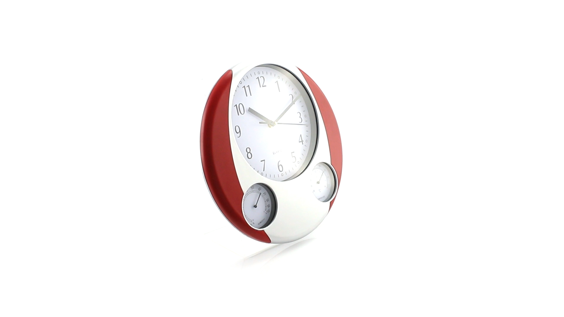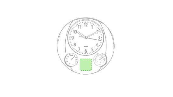 Analoge Wanduhr mit rundem Design, integriertem Thermometer und Luftfeuchtigkeitsmesser. Batteriebetrieben - Typ AA nicht inklusive. Präsentiert in einer individuellen Box.