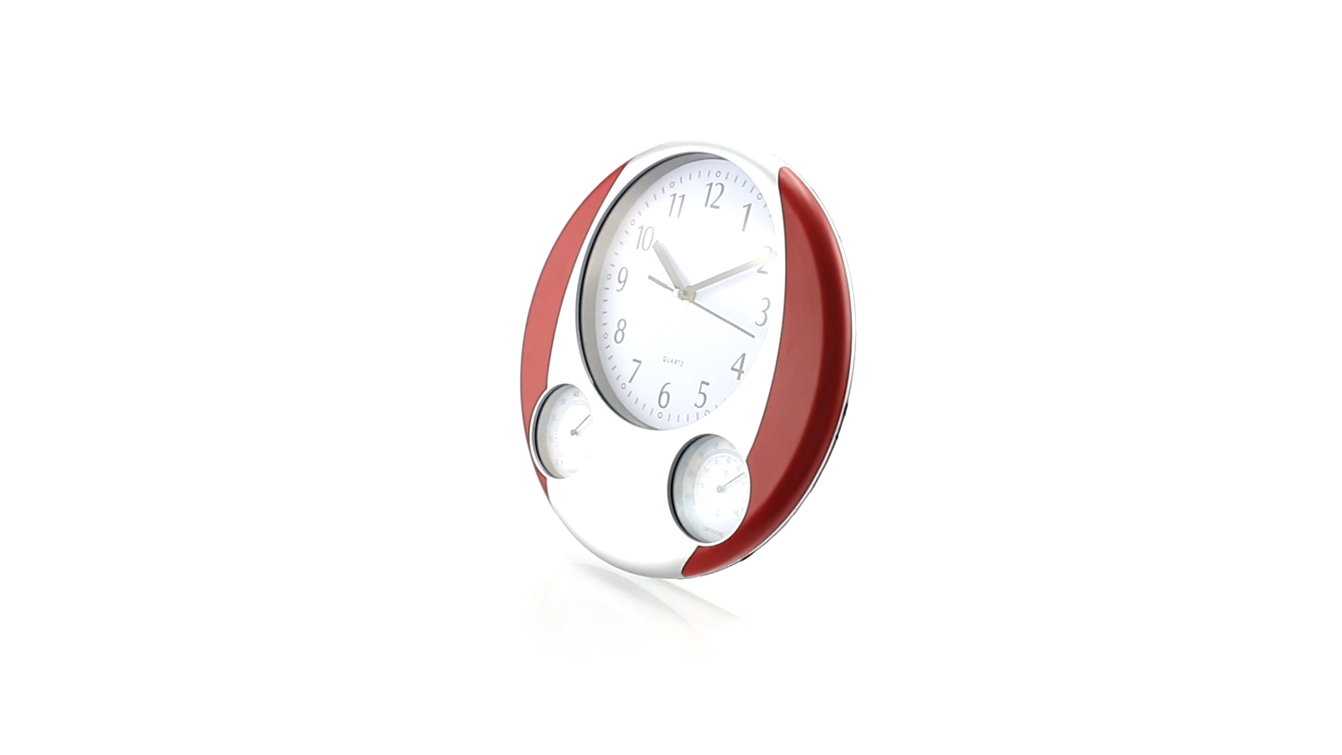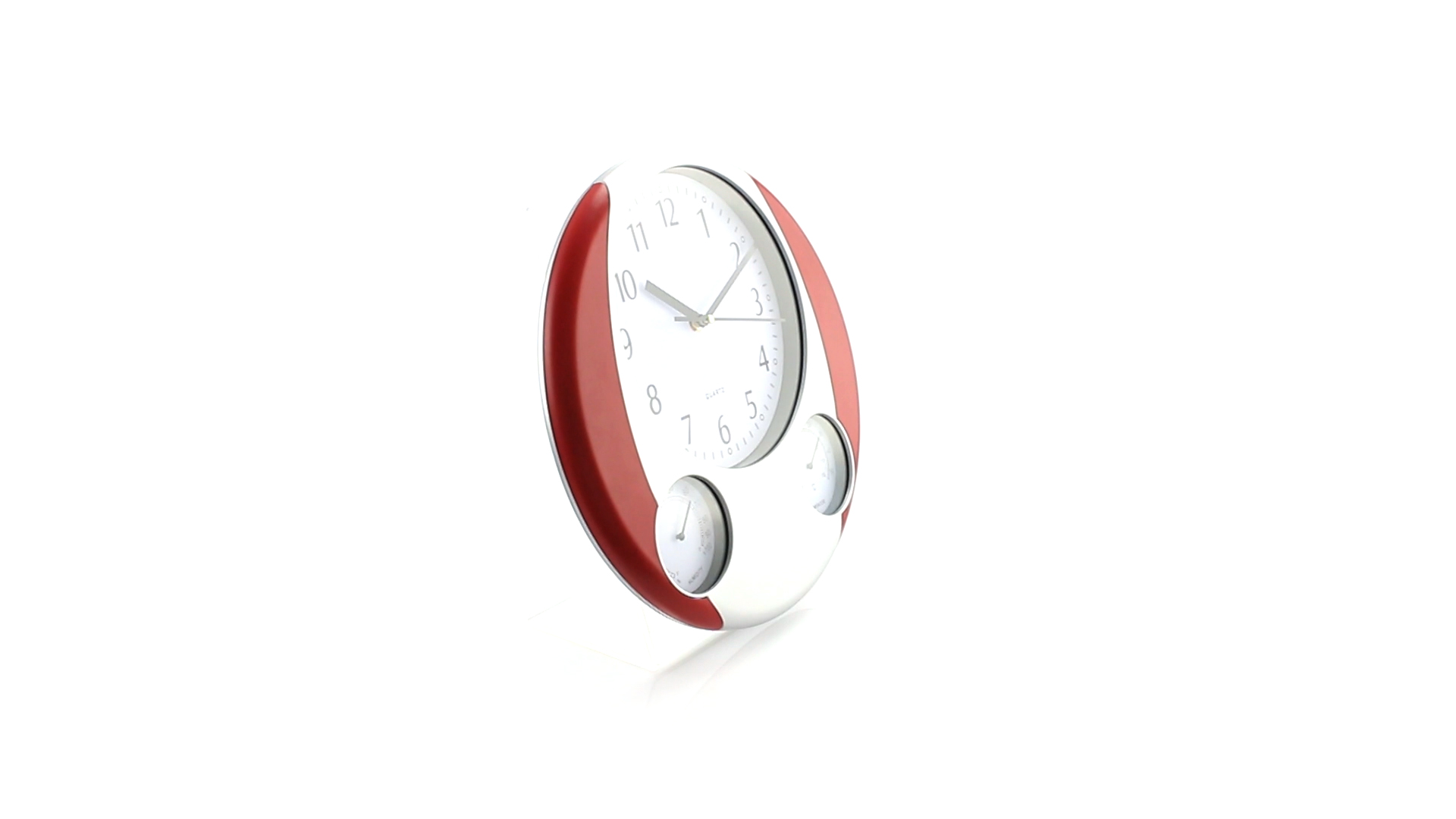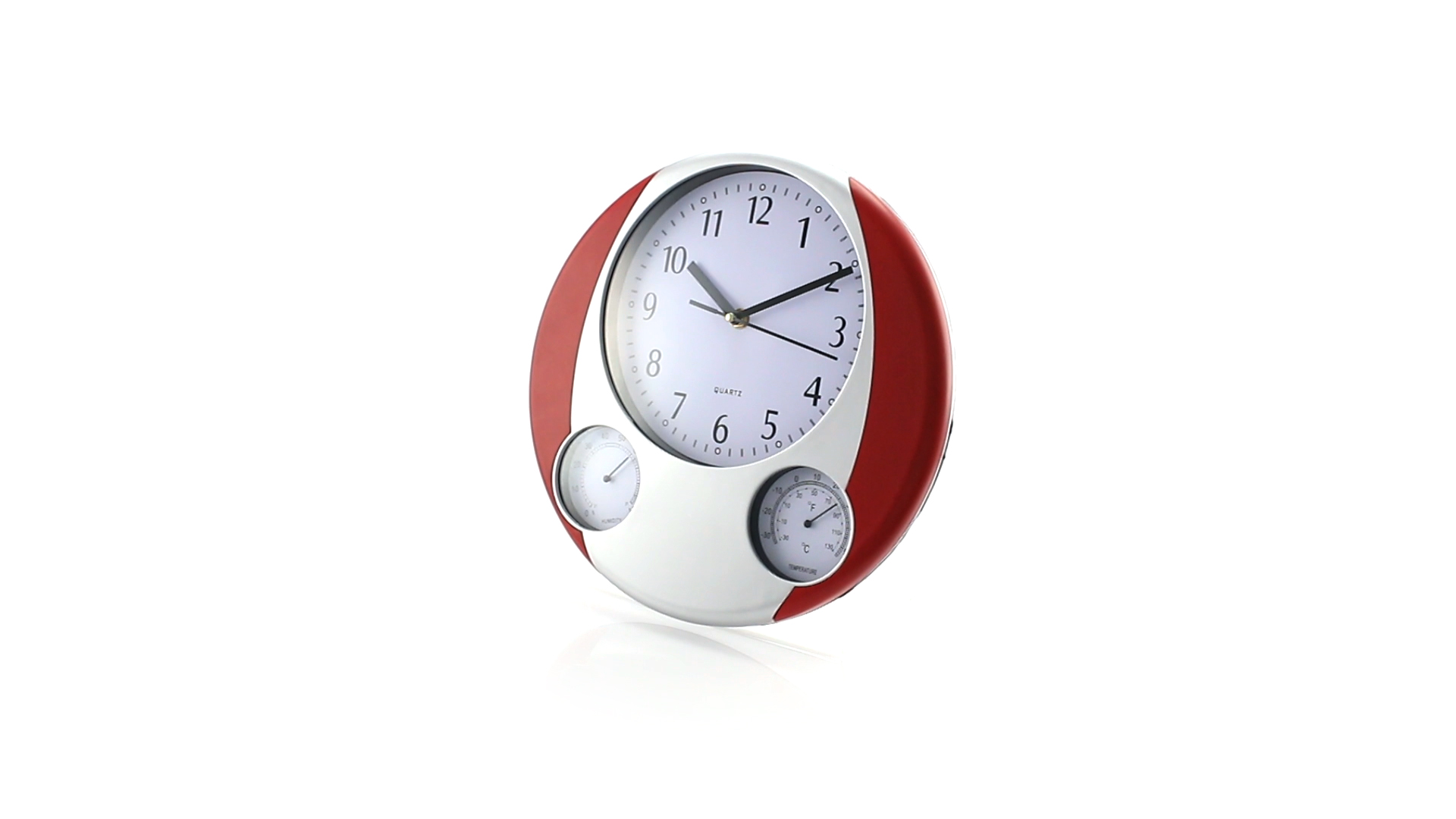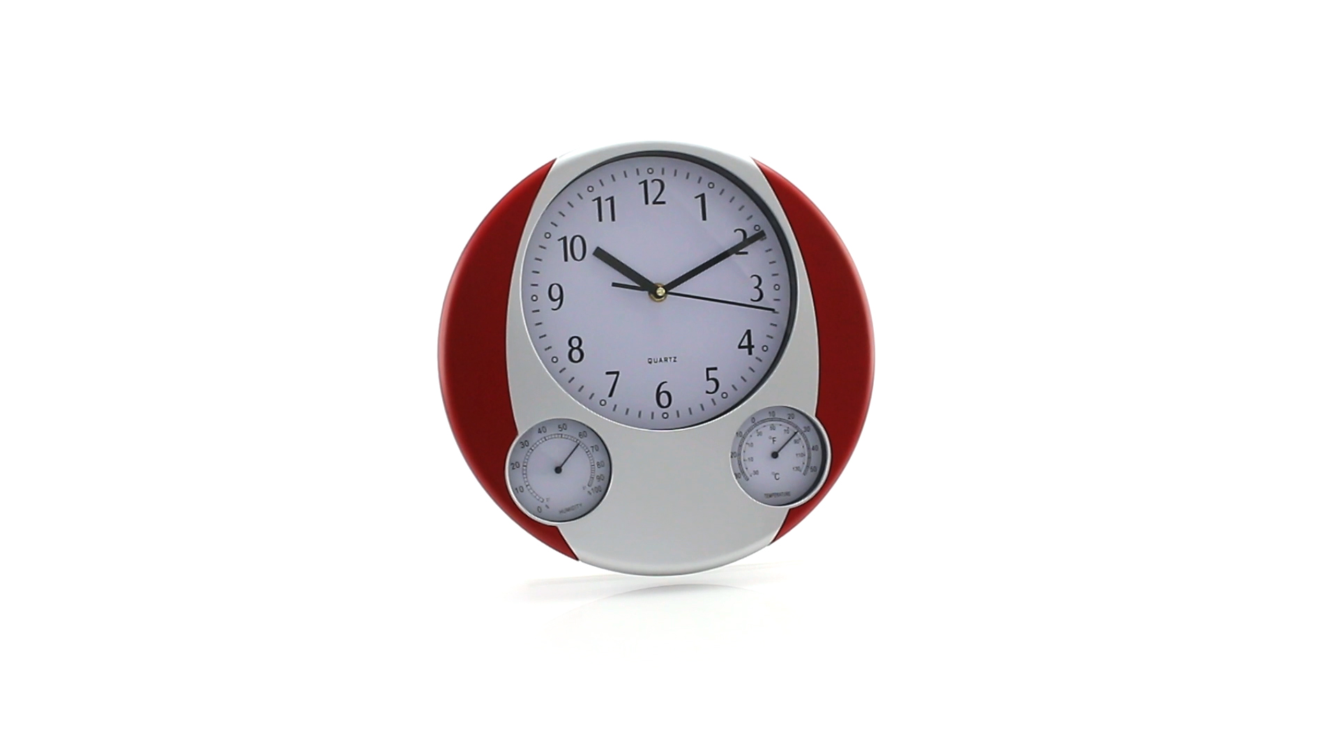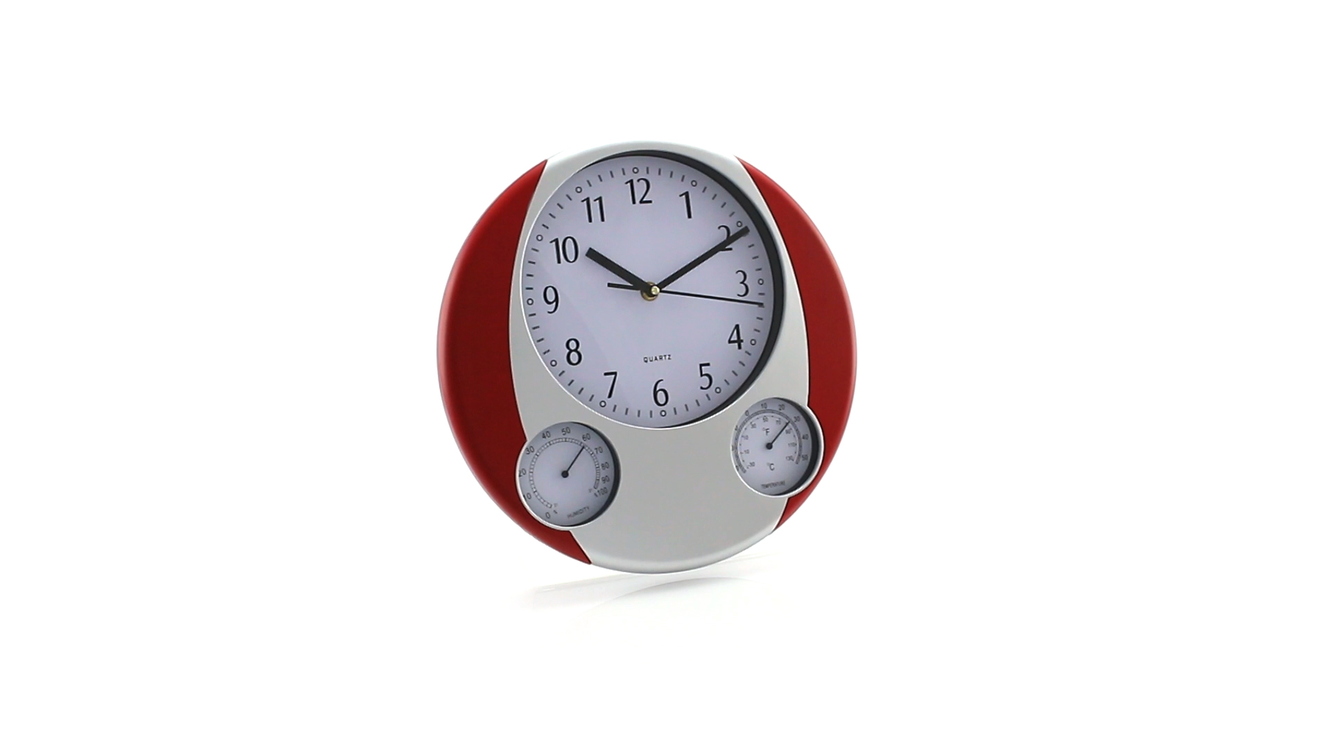 Analoge Wanduhr mit rundem Design, integriertem Thermometer und Luftfeuchtigkeitsmesser. Batteriebetrieben - Typ AA nicht inklusive. Präsentiert in einer individuellen Box.