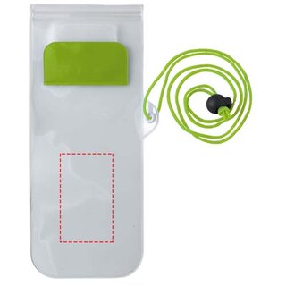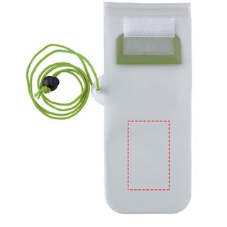 Aufbewahrungsbeutel mit milchiger, weisser Rückseite, transparentem, klarem Touchscreen Frontfenster mit Reissverschluss und farbigem Überschlag mit Klettverschluss. Inklusive Nackenband mit Kordelzug.