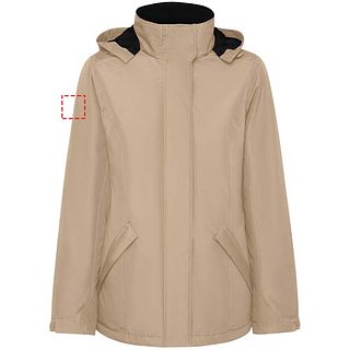 Wasserabweisende, wattierte Parkajacke für Damen. Schlanke Passform. Hoher Kragen mit einrollbarer und abnehmbarer Kapuze mit Klettverschluss. Mittig durchgehender Reissverschluss mit Patte. Seitentaschen mit Reissverschluss und fester Patte. Innentasche mit Klettverschluss. Verstellbare Ärmelbündchen mit Klettverschluss. Verstärkungen im Rücken und auf der linken Brust.
