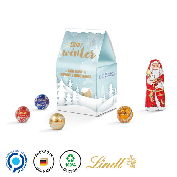 Aussergewöhnlich schokoladig und äusserst köstlich: Unser bemerkenswertes Weihnachtshaus, welches individuell gestaltet werden kann, beherbergt vier bunt gemischte Lindor Mini Kugeln und einen edlen Lindt Weihnachtsmann. Eine wunderbare Möglichkeit, vorweihnachtliche Grüsse zu verschicken und sicherzustellen, dass sie in bester Erinnerung bleiben. Dieses Geschenk stammt aus einer umweltfreundlichen Produktion, die zu 100 % klimaneutral ist.