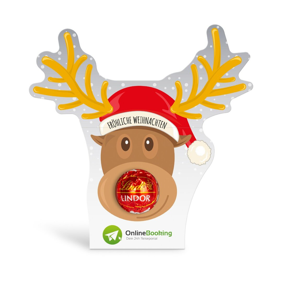 Feinste Lindor Kugel aus Milchschokolade oder Schokolade feinherb in individuell bedruckter Klemmkartonage in Form eines Rentiers.