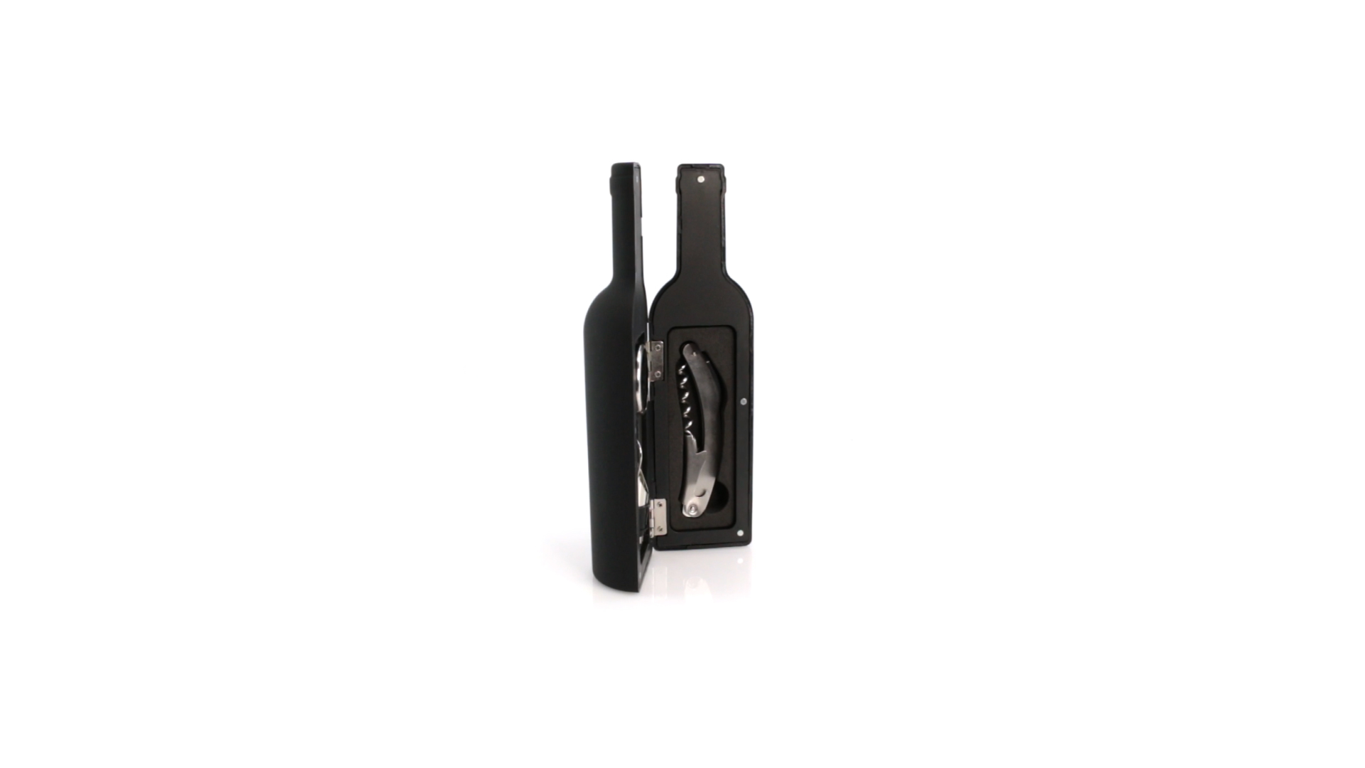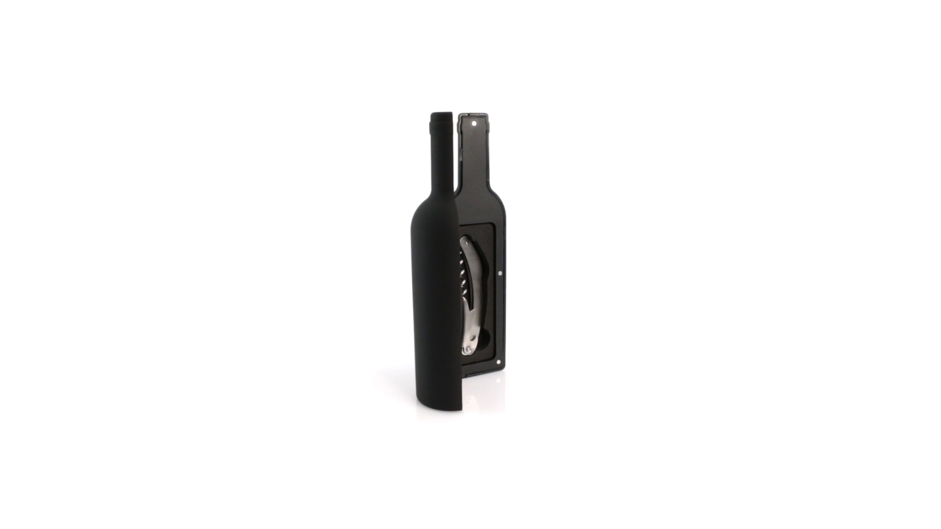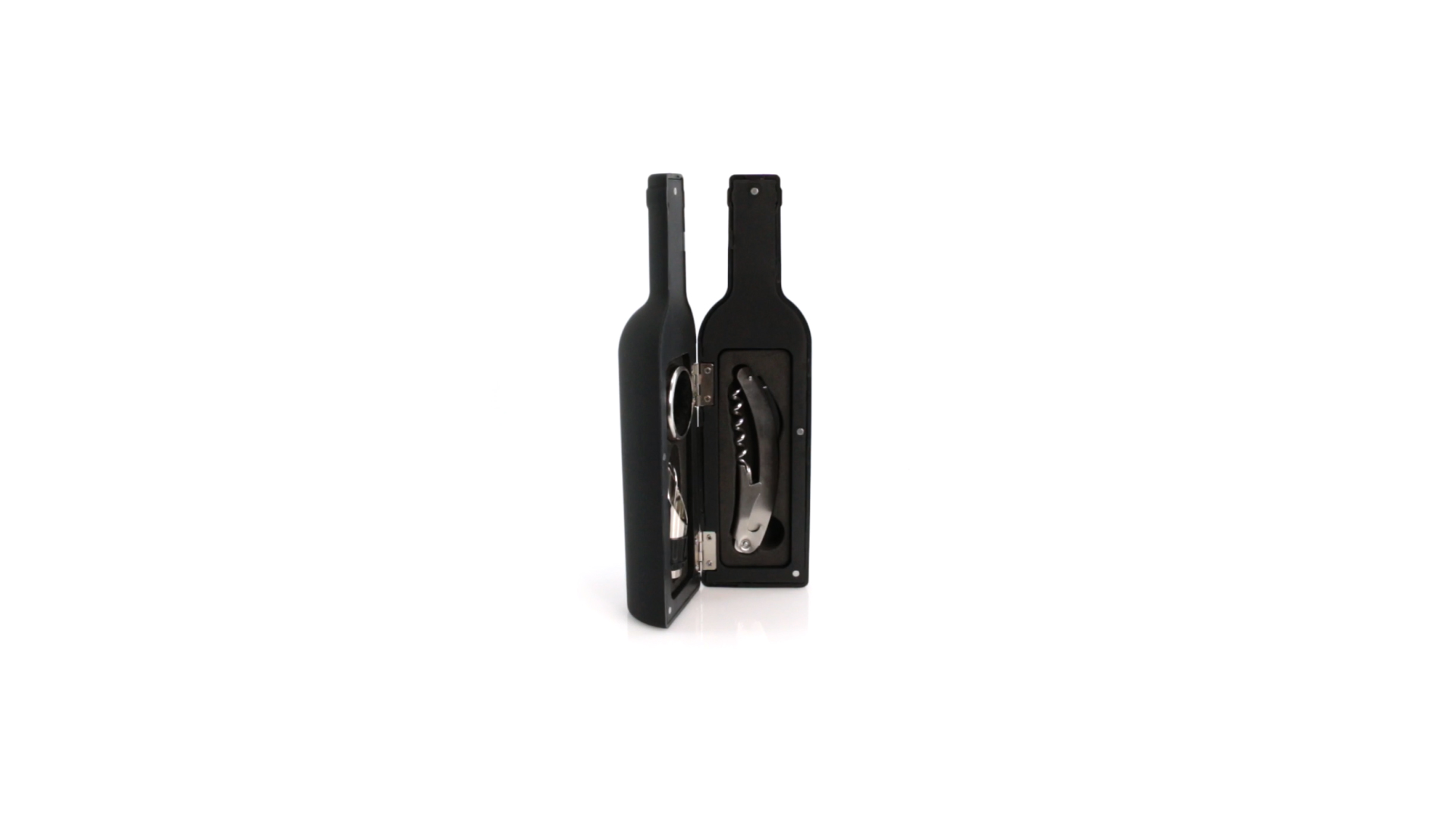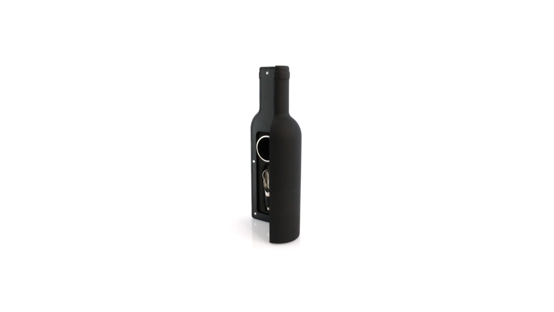 Originelles flaschenförmiges Wein-Set mit angenehm weicher Oberfläche, Magnetverschluss und Accessoires aus Edelstahl. Enthält Korkenzieher mit Kapselschneider und Flaschenöffner sowie Dosierkappe und Tropfring. Präsentiert in einer individuellen Box, ausgekleidet mit weichem Schaumstoff.