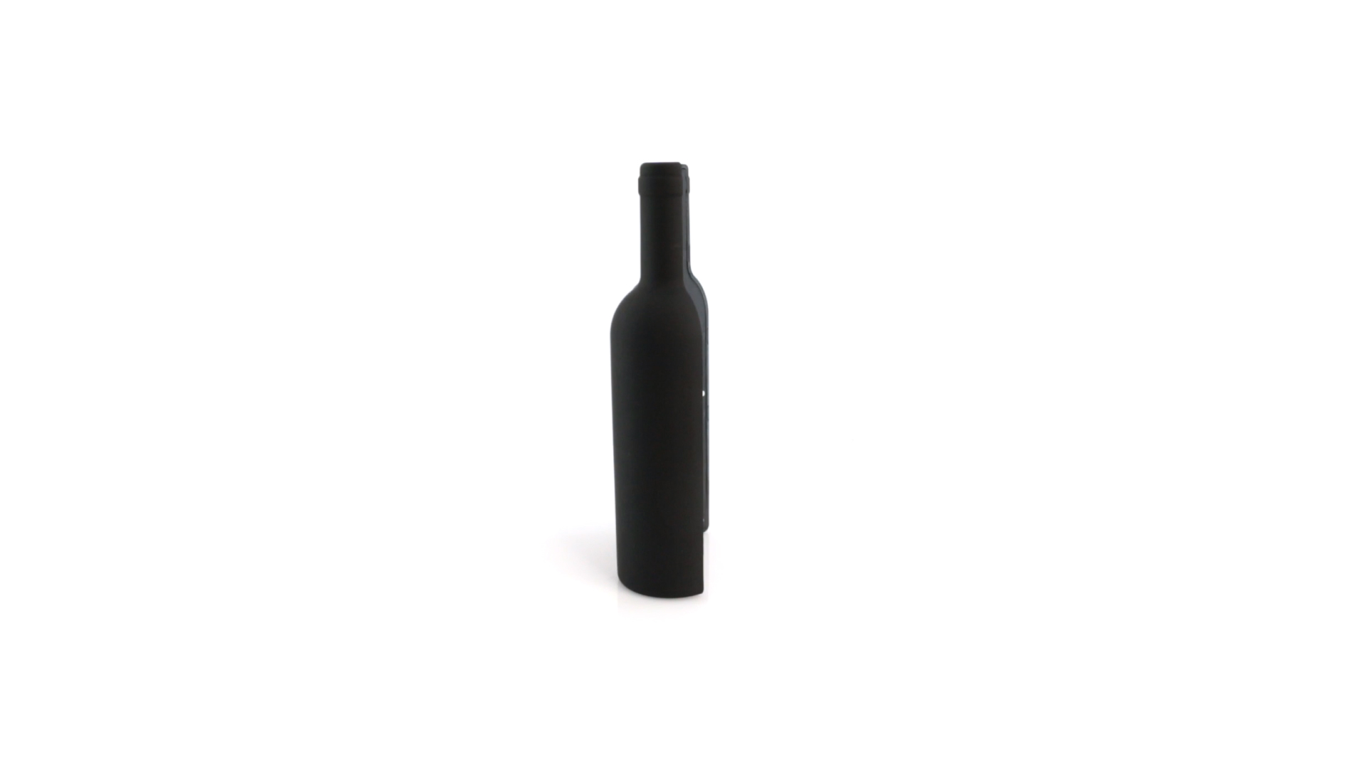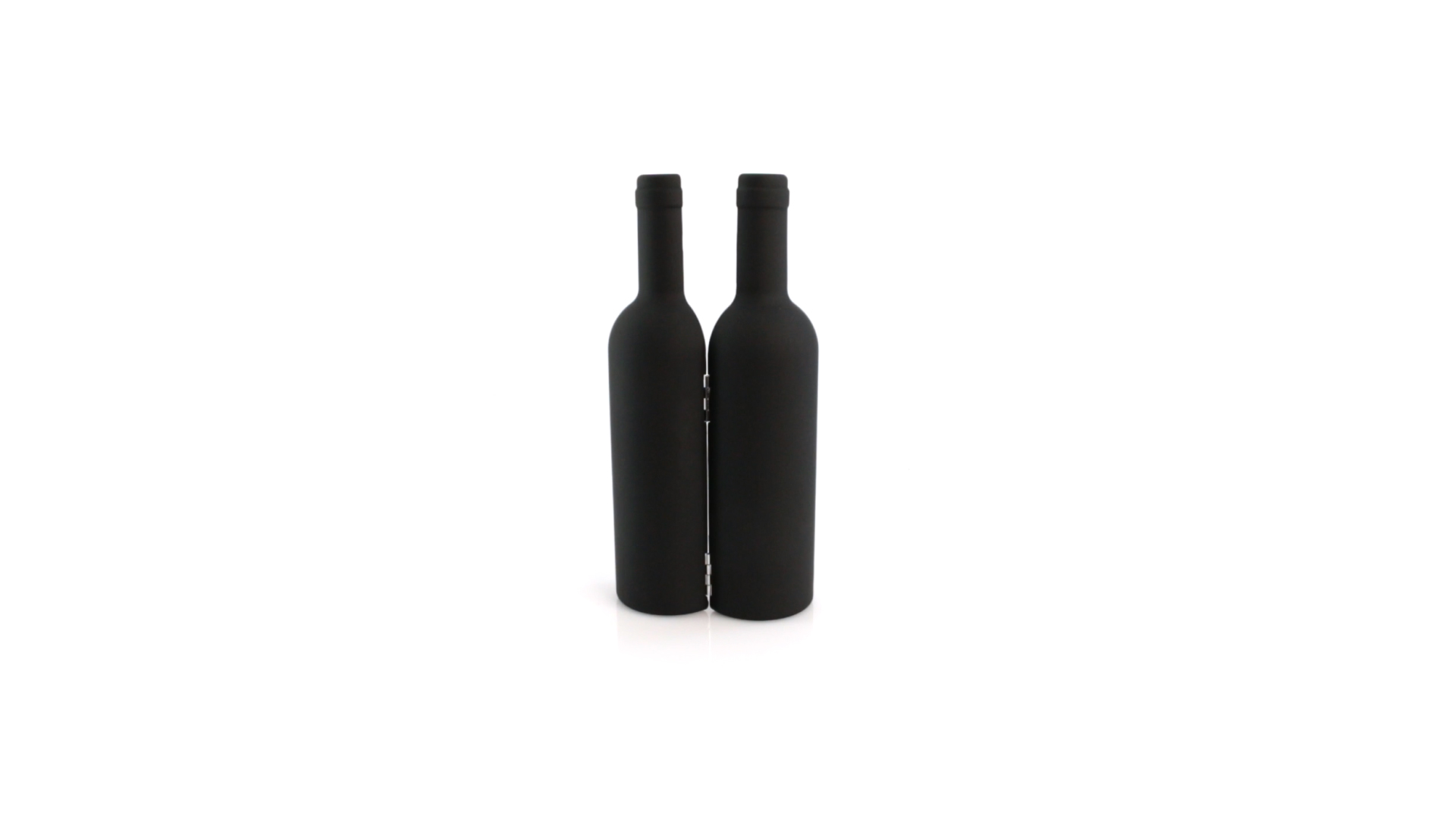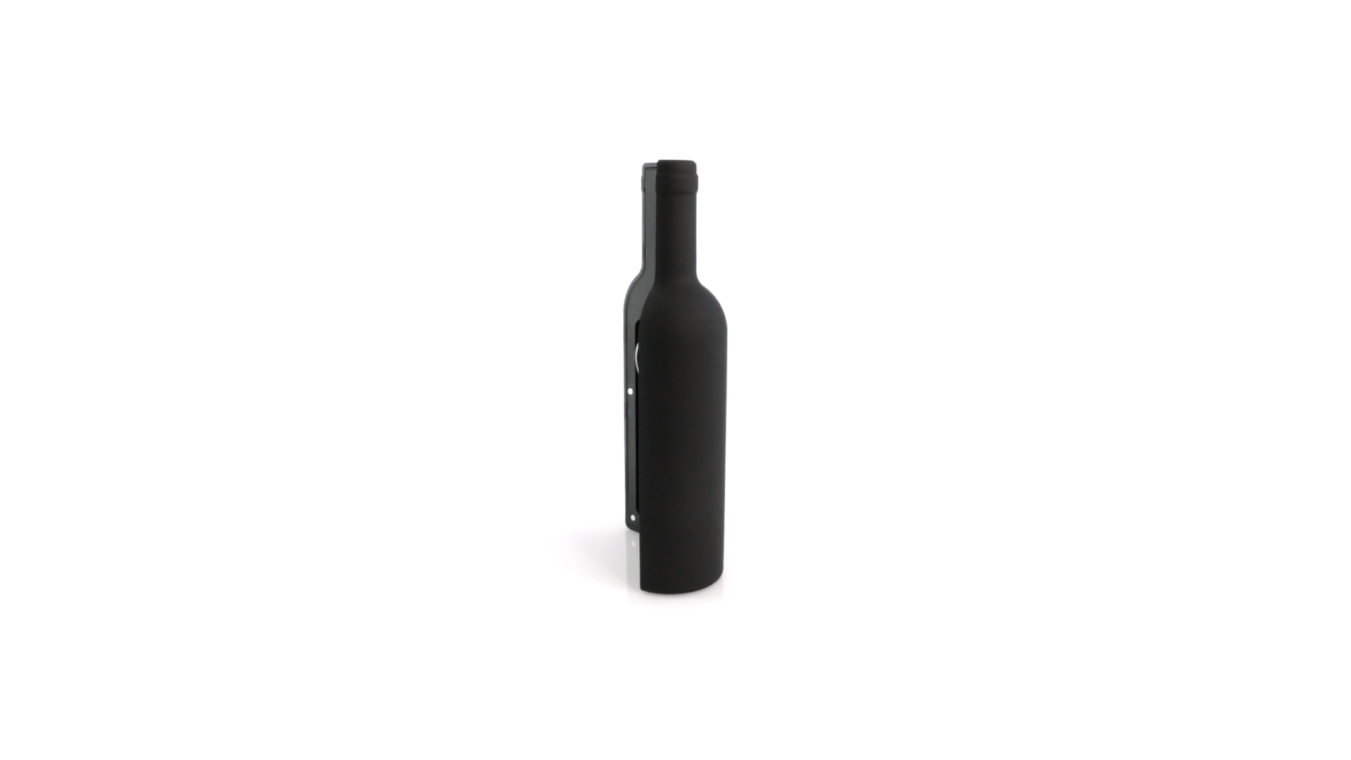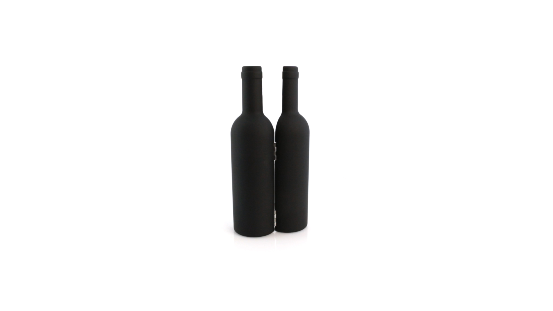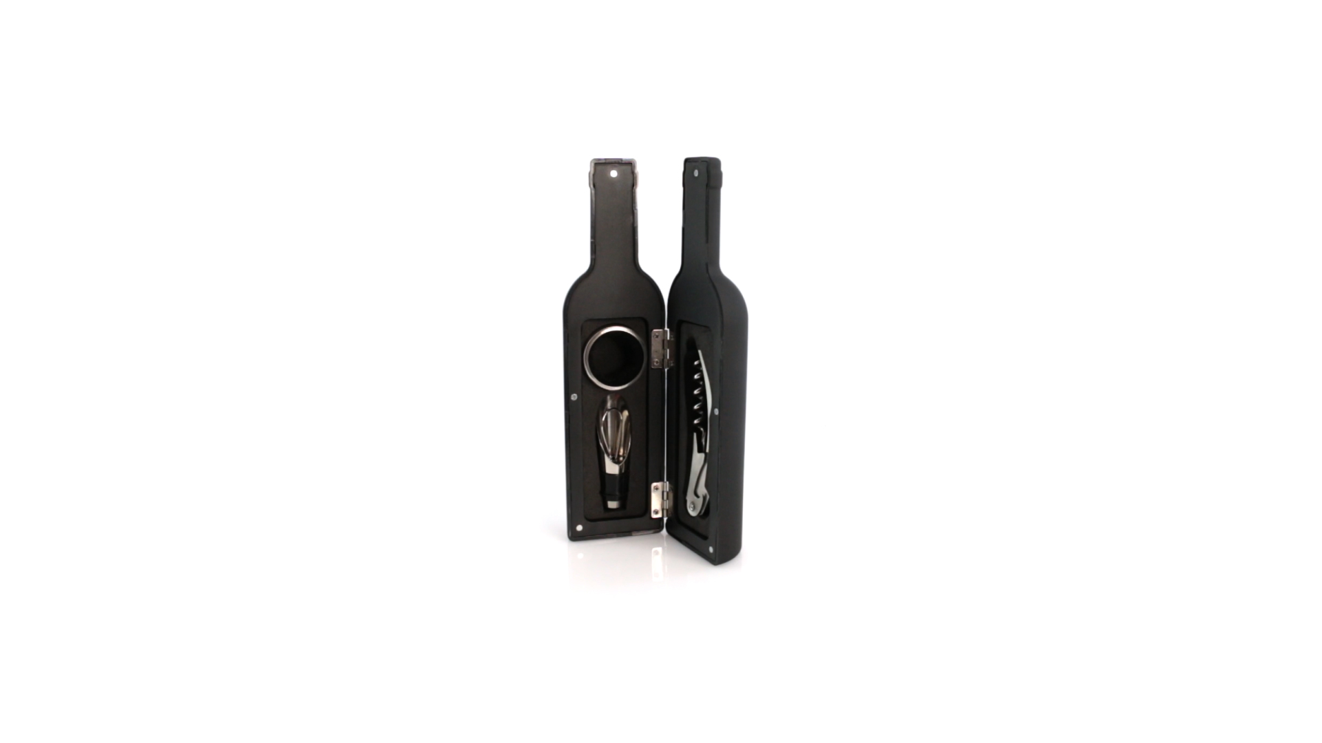 Originelles flaschenförmiges Wein-Set mit angenehm weicher Oberfläche, Magnetverschluss und Accessoires aus Edelstahl. Enthält Korkenzieher mit Kapselschneider und Flaschenöffner sowie Dosierkappe und Tropfring. Präsentiert in einer individuellen Box, ausgekleidet mit weichem Schaumstoff.