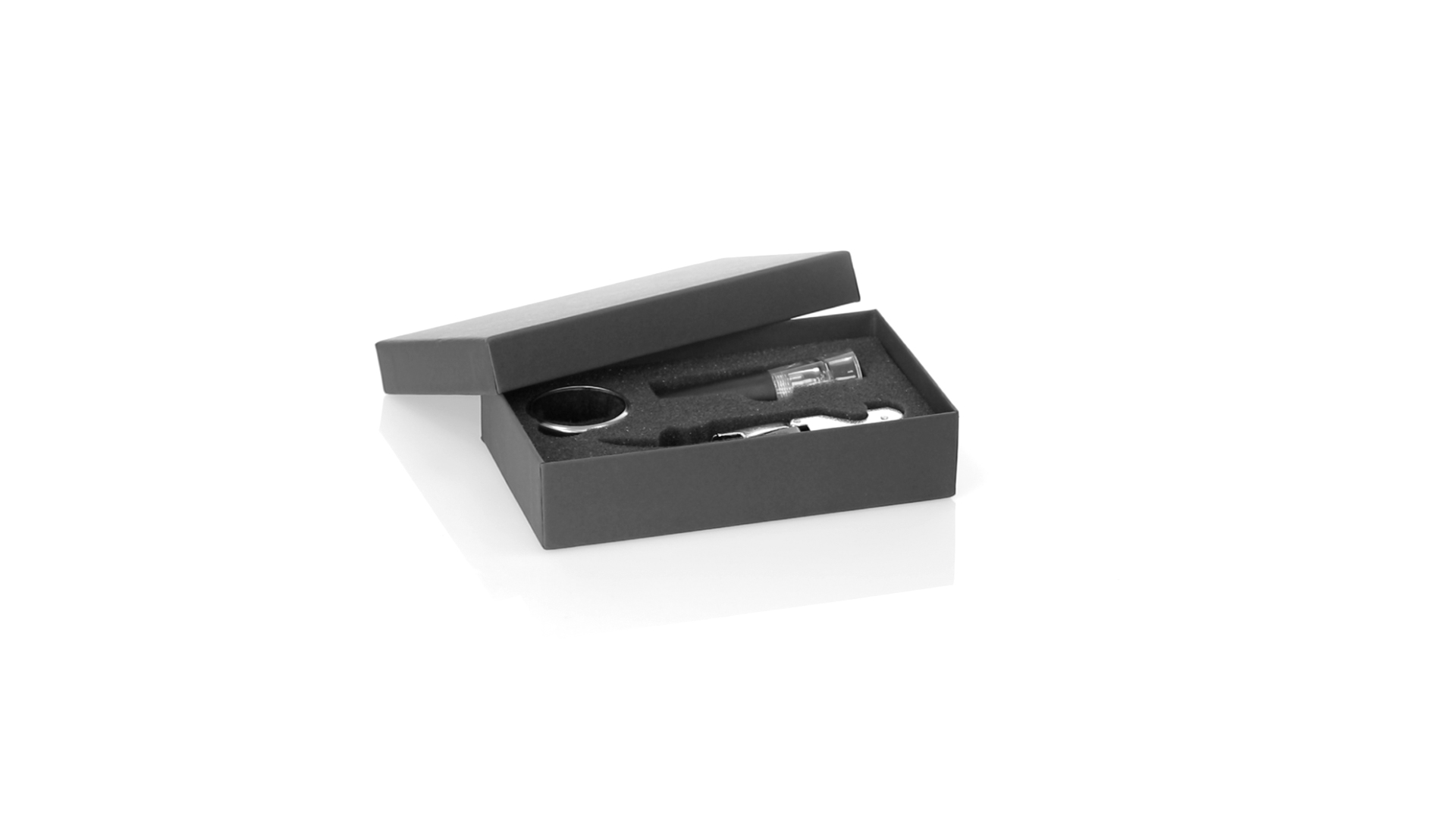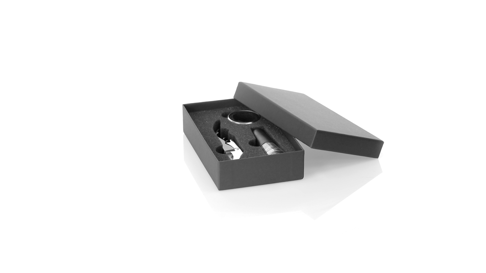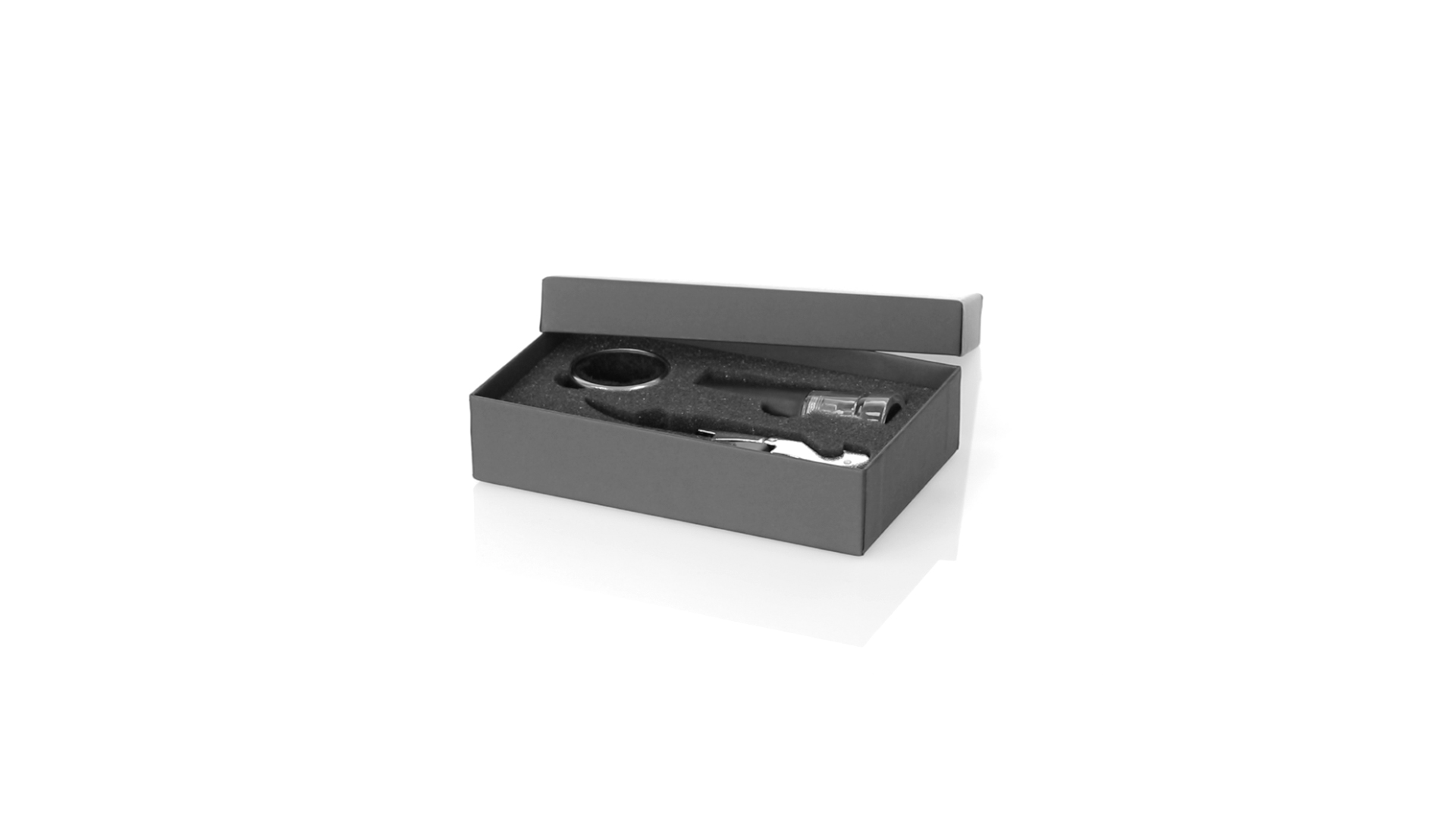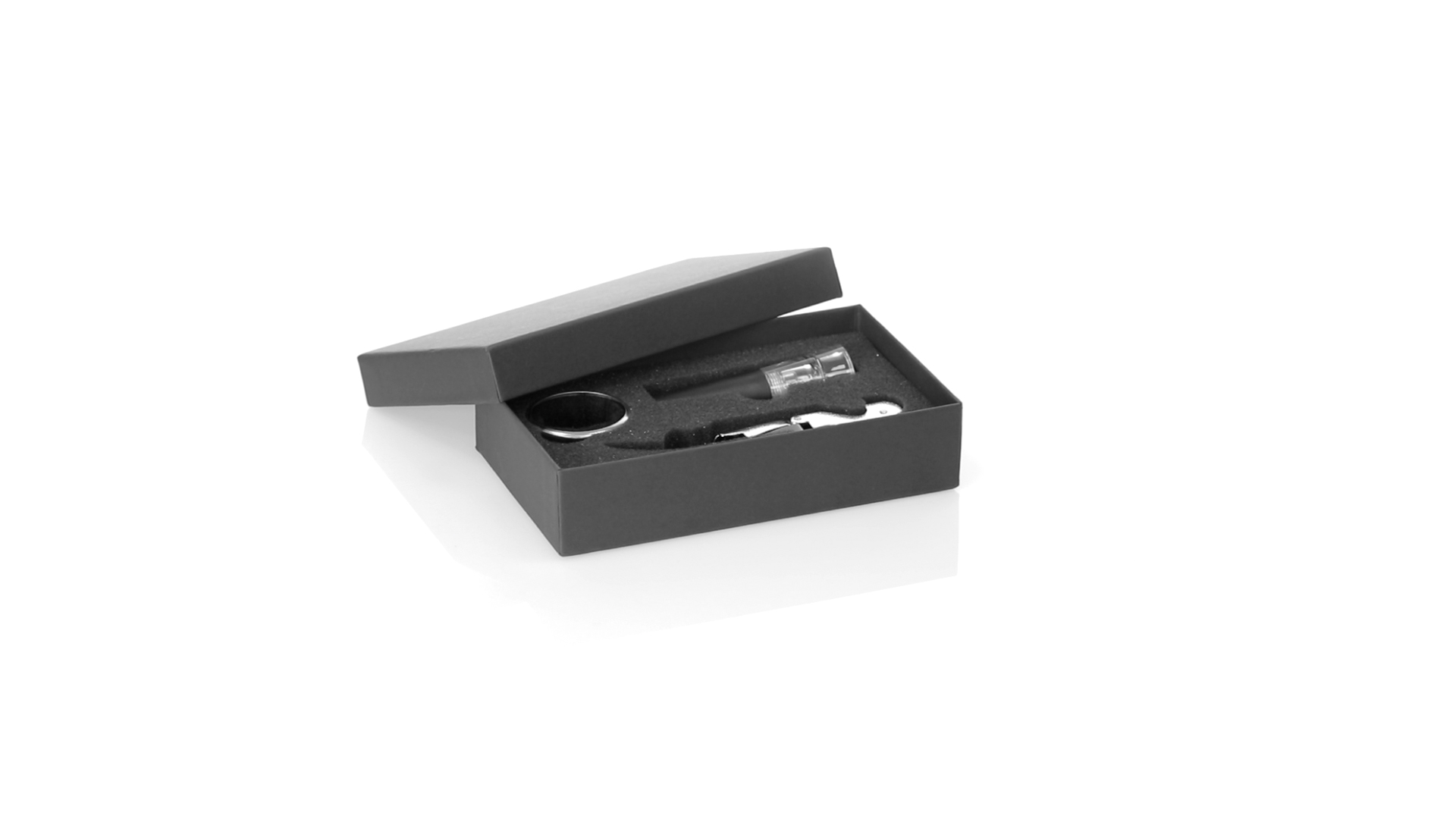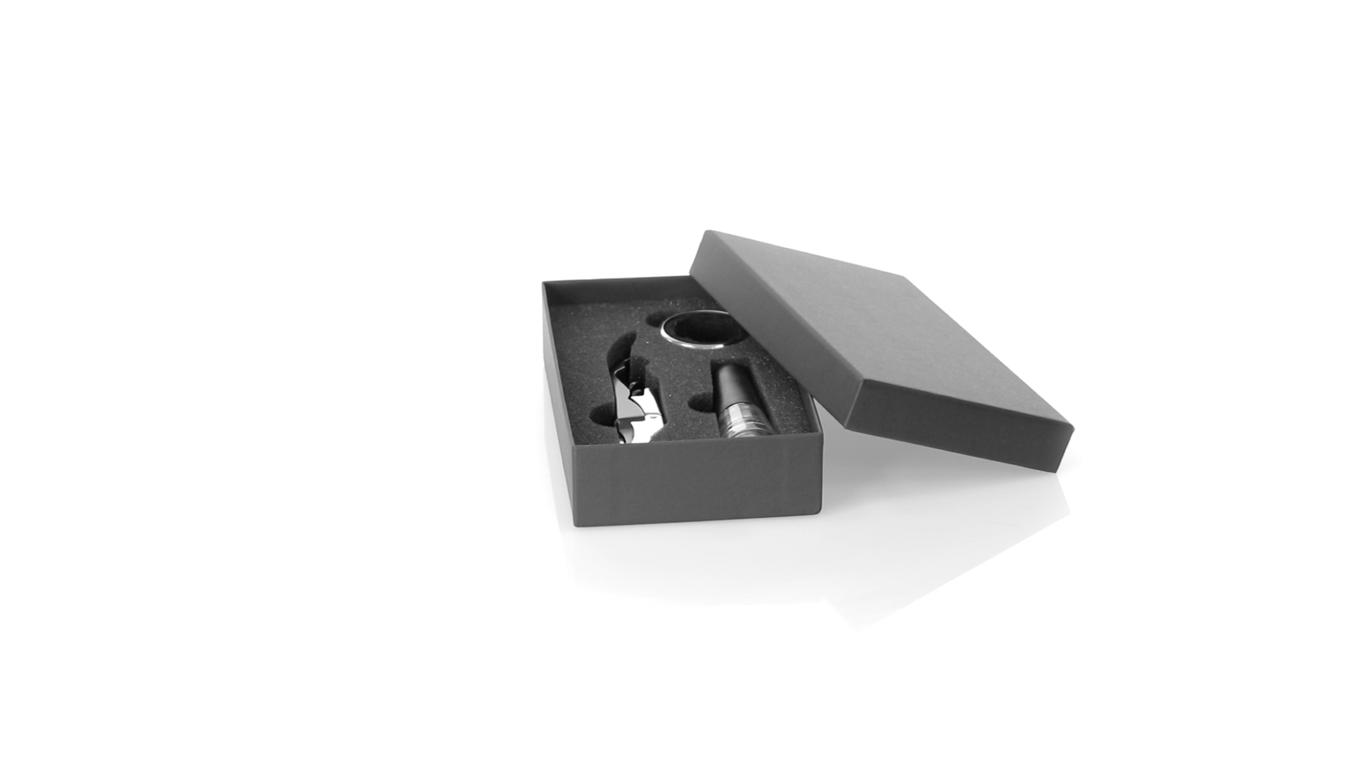 Ultimatives Weinset in schlichtem Schwarz, präsentiert in einem individuellen Etui mit gestanztem Schaumstoffeinsatz und weisser Schutzhülle. Inklusive Tropfverschluss, Korkenzieher aus Edelstahl und Vakuumpumpdeckel.