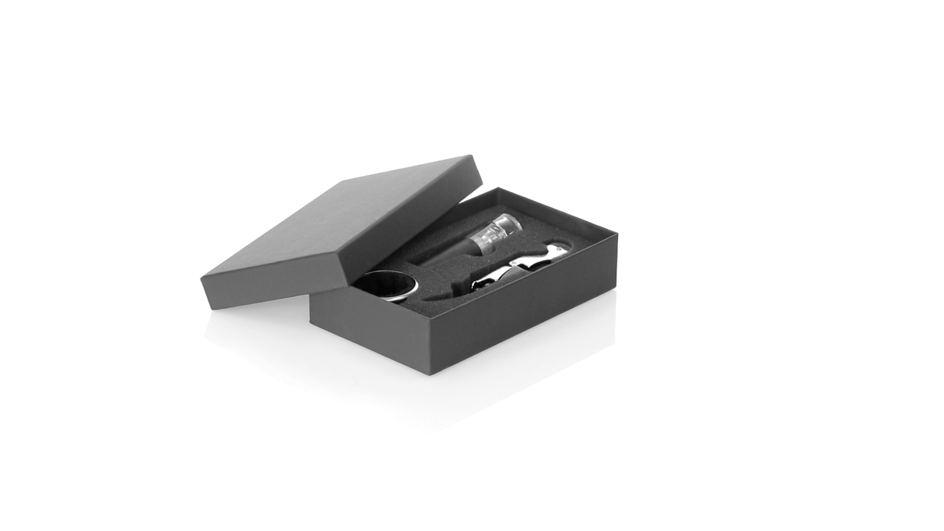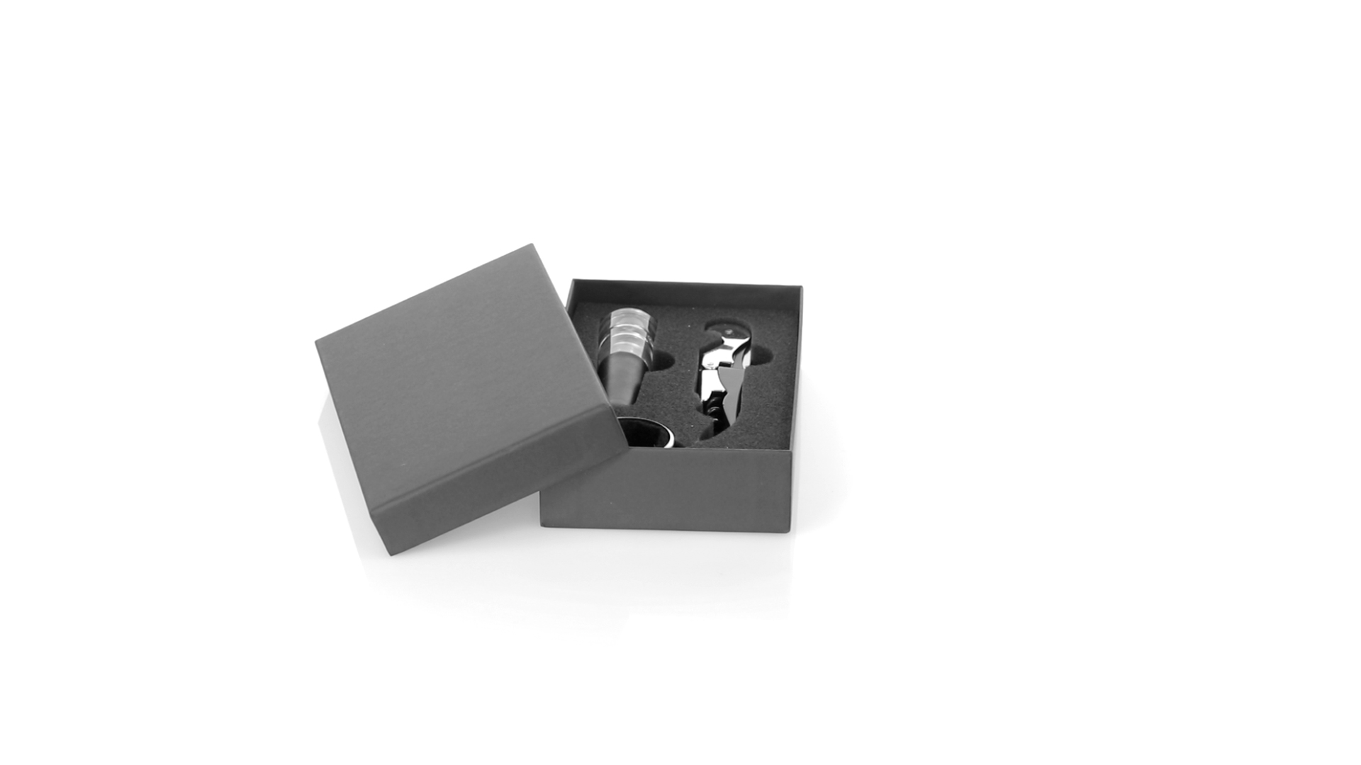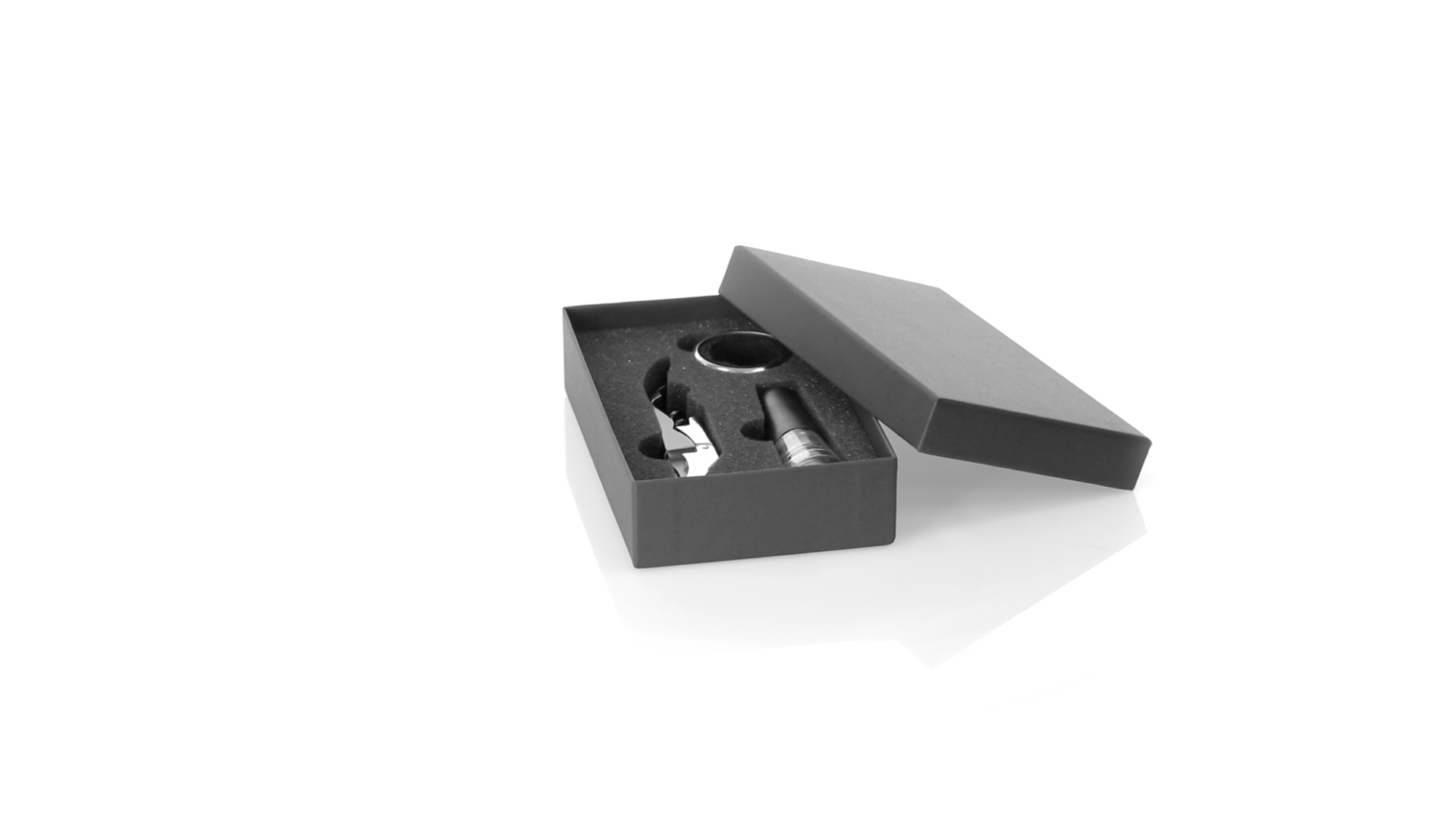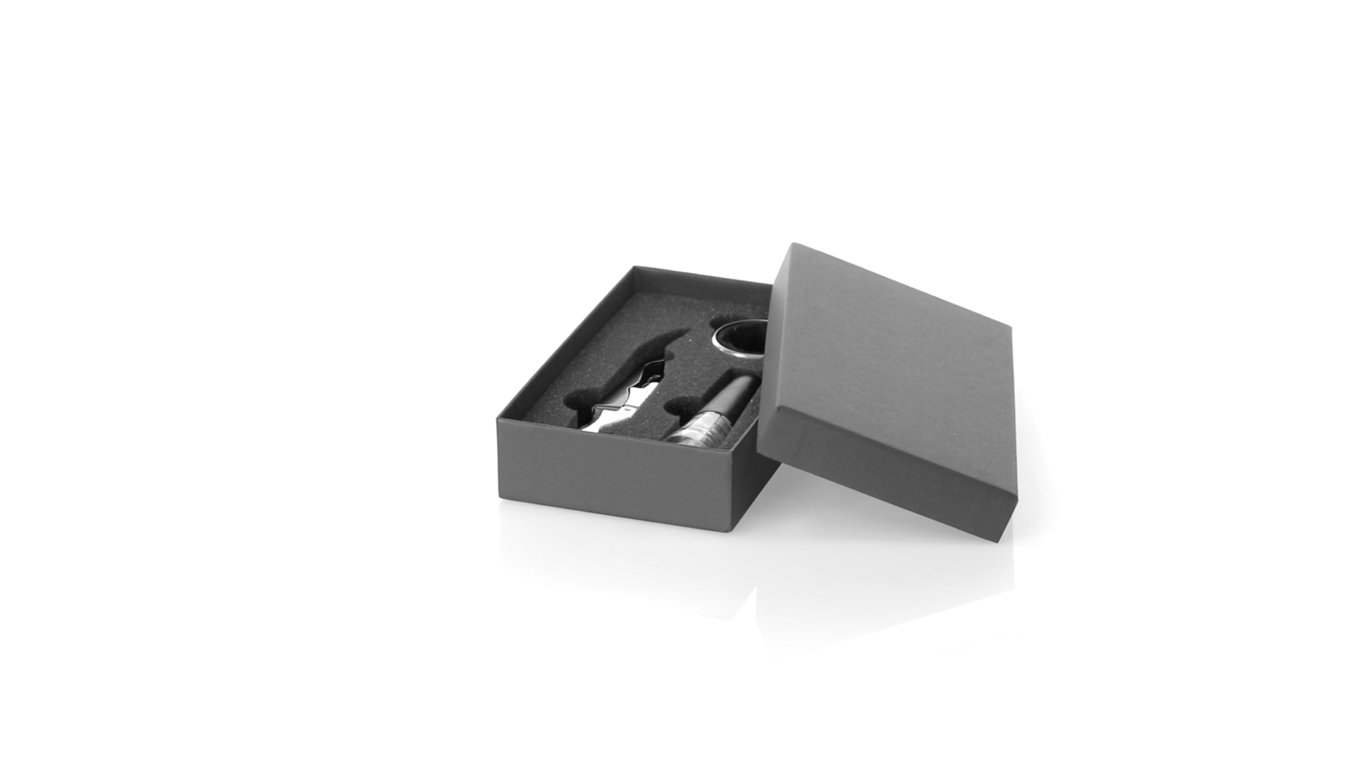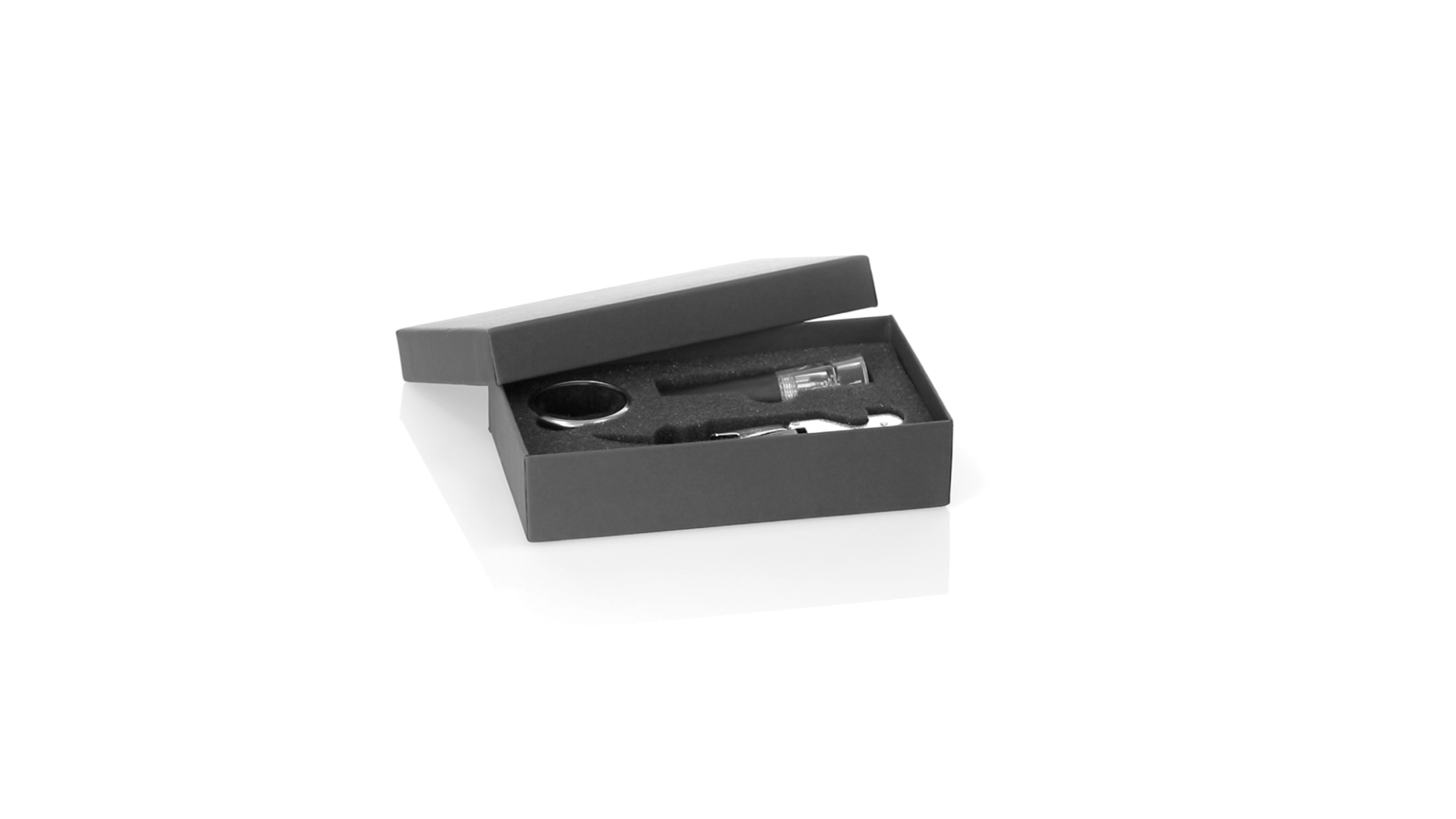 Ultimatives Weinset in schlichtem Schwarz, präsentiert in einem individuellen Etui mit gestanztem Schaumstoffeinsatz und weisser Schutzhülle. Inklusive Tropfverschluss, Korkenzieher aus Edelstahl und Vakuumpumpdeckel.