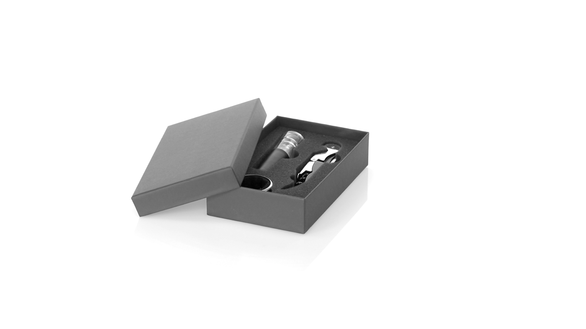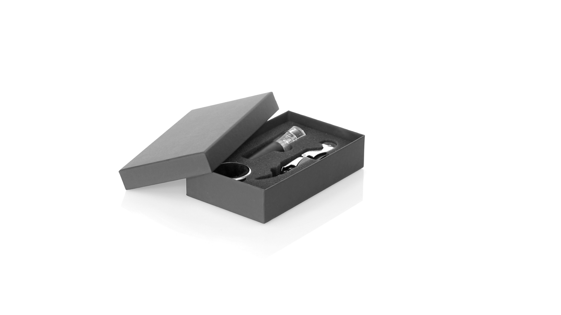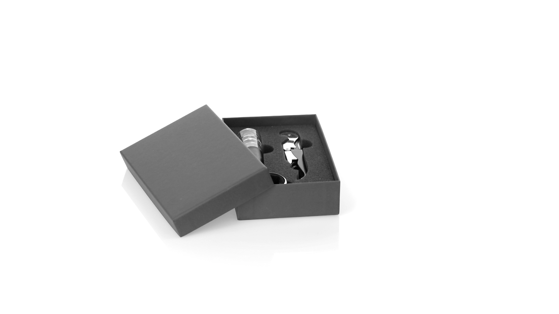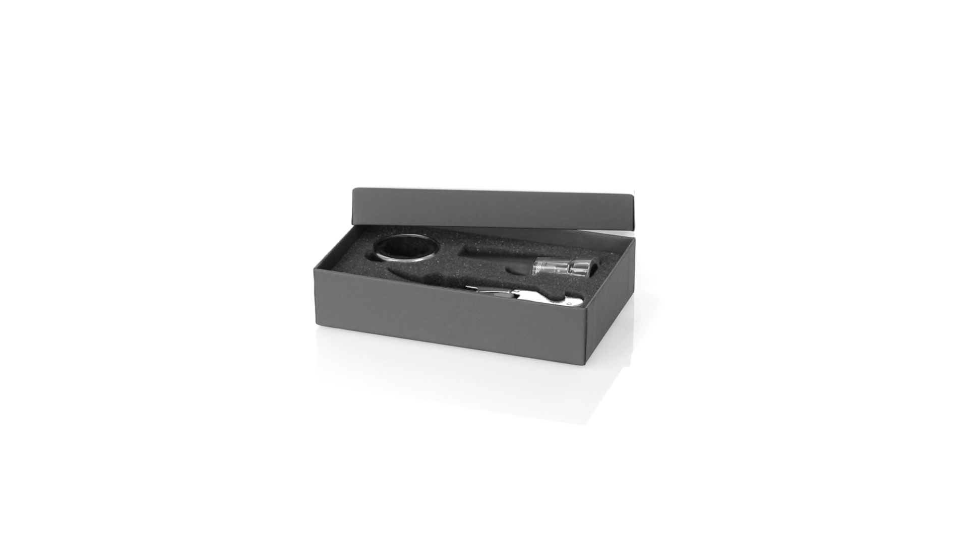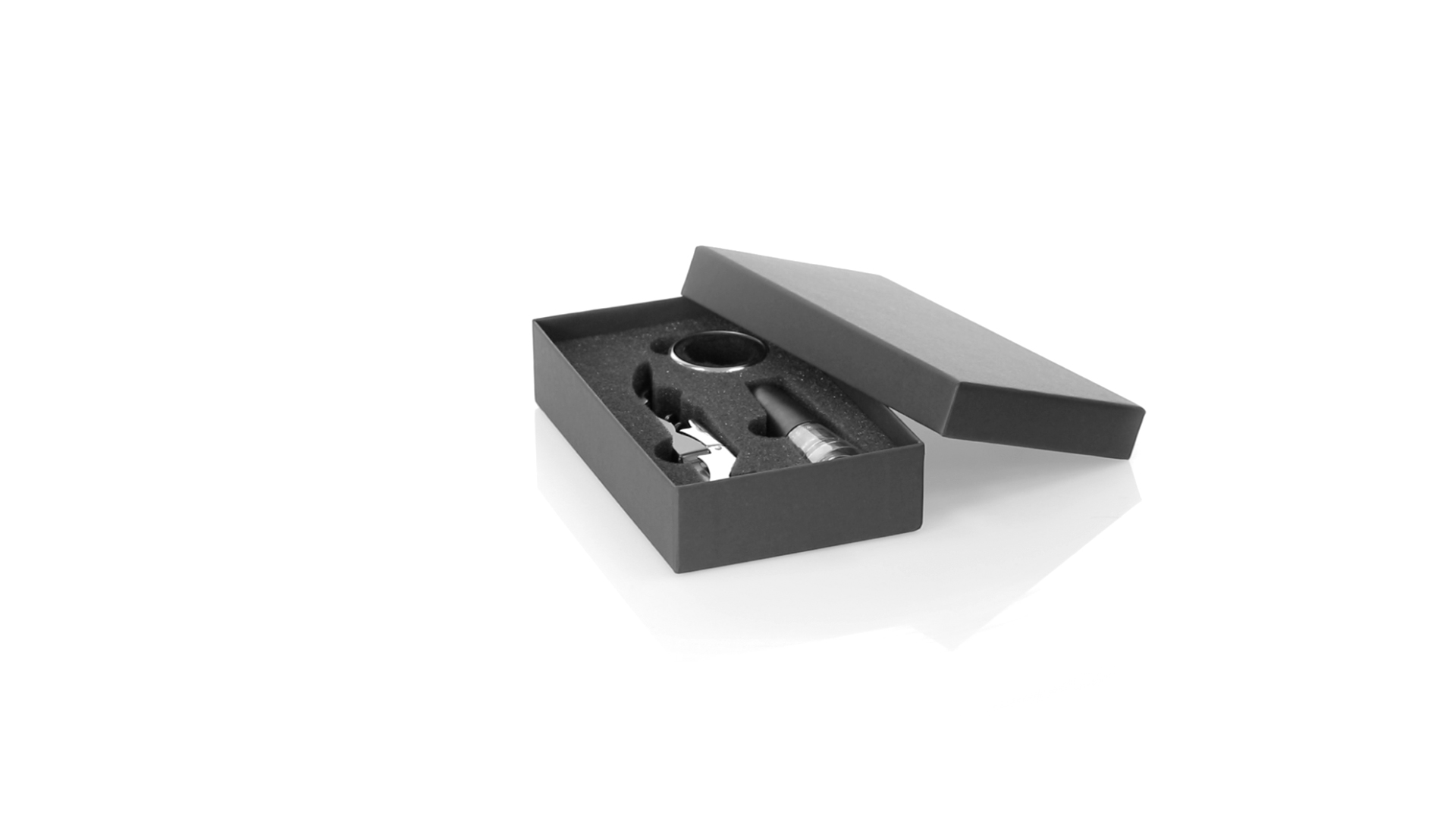Ultimatives Weinset in schlichtem Schwarz, präsentiert in einem individuellen Etui mit gestanztem Schaumstoffeinsatz und weisser Schutzhülle. Inklusive Tropfverschluss, Korkenzieher aus Edelstahl und Vakuumpumpdeckel.