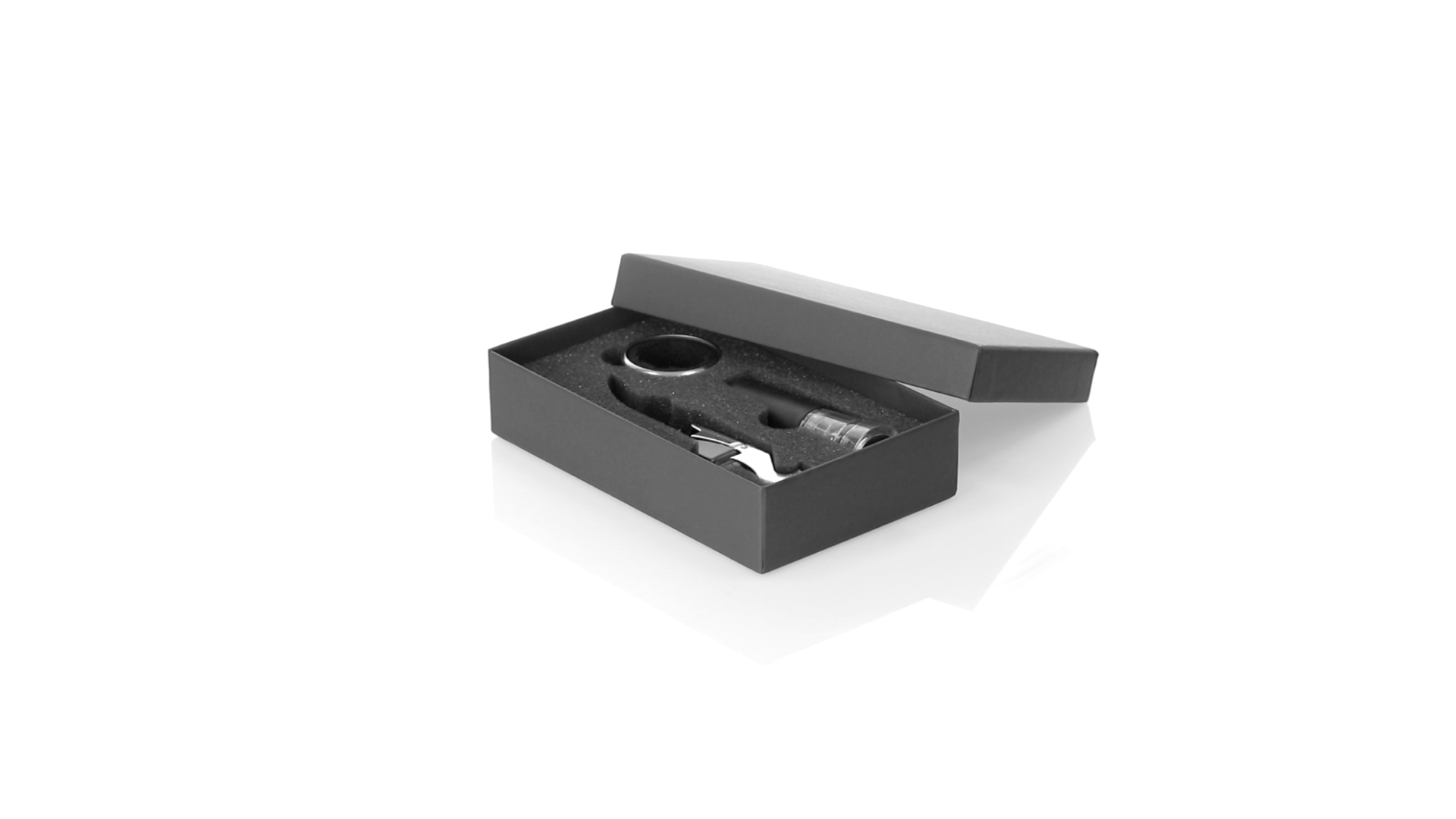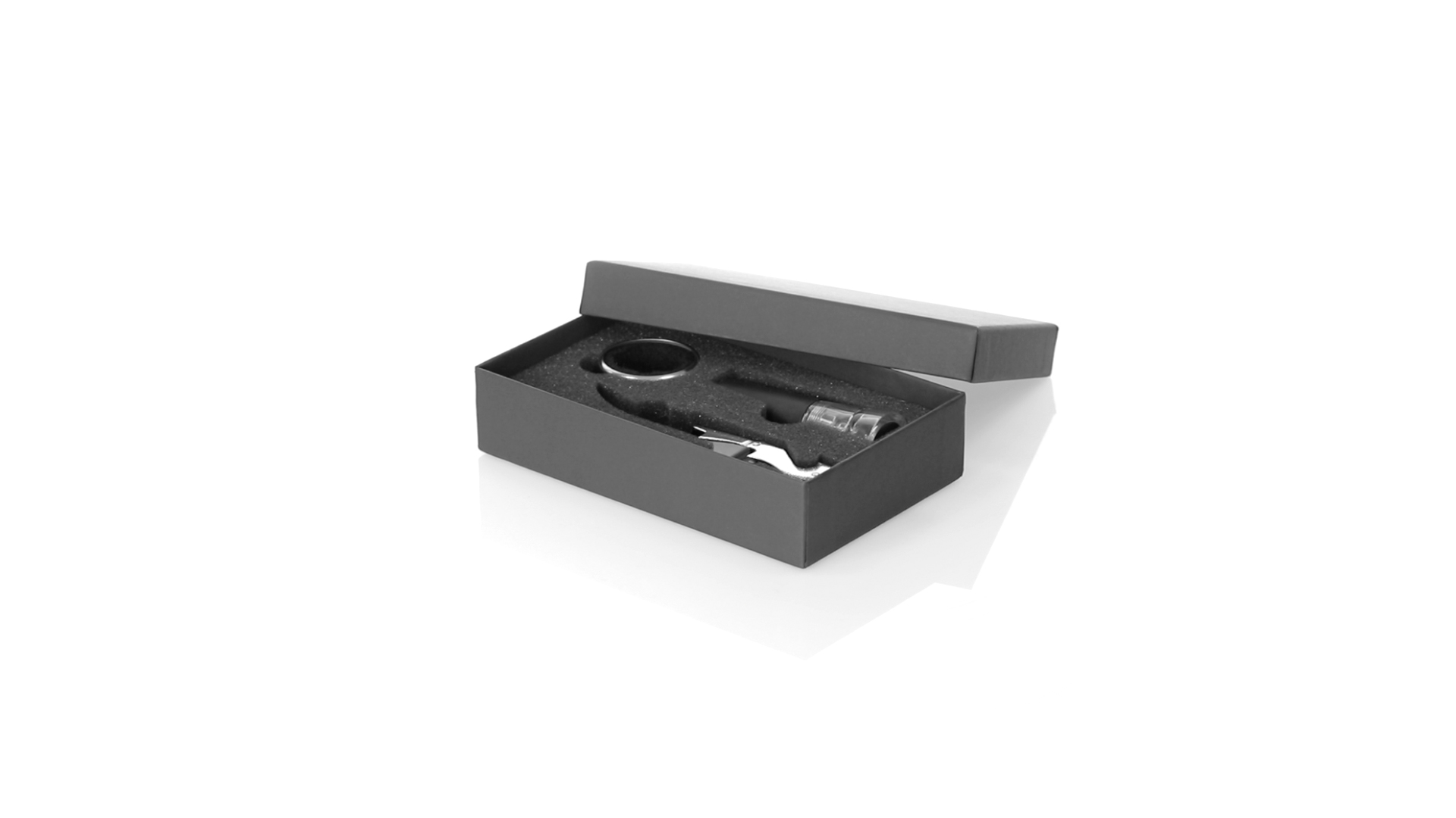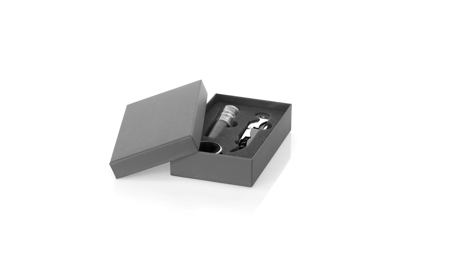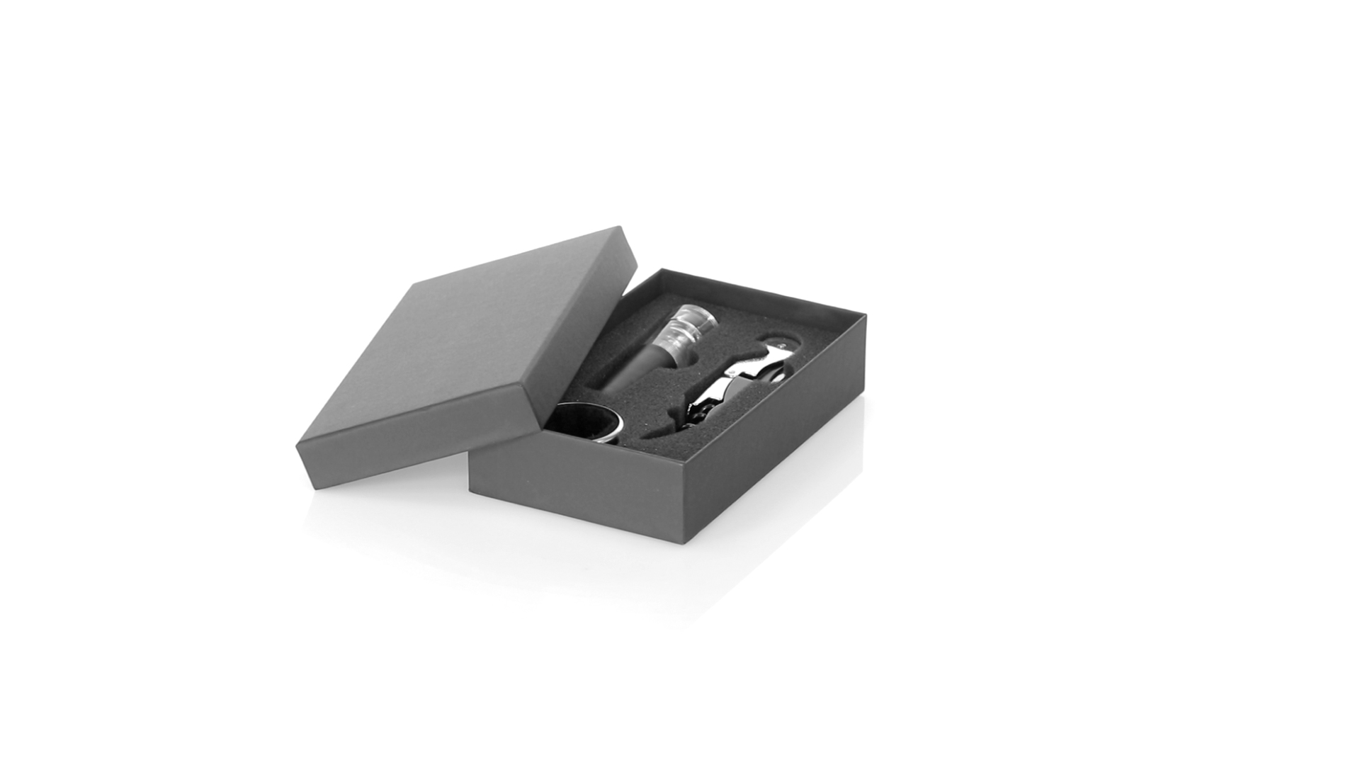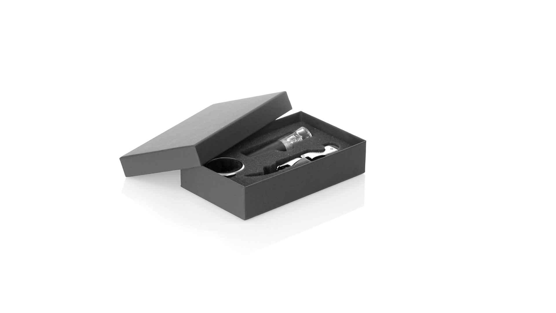Ultimatives Weinset in schlichtem Schwarz, präsentiert in einem individuellen Etui mit gestanztem Schaumstoffeinsatz und weisser Schutzhülle. Inklusive Tropfverschluss, Korkenzieher aus Edelstahl und Vakuumpumpdeckel.