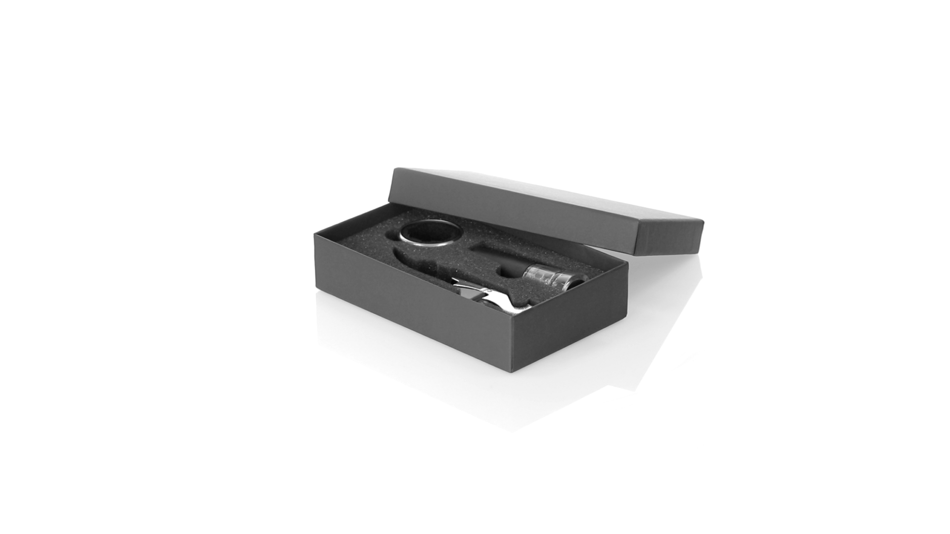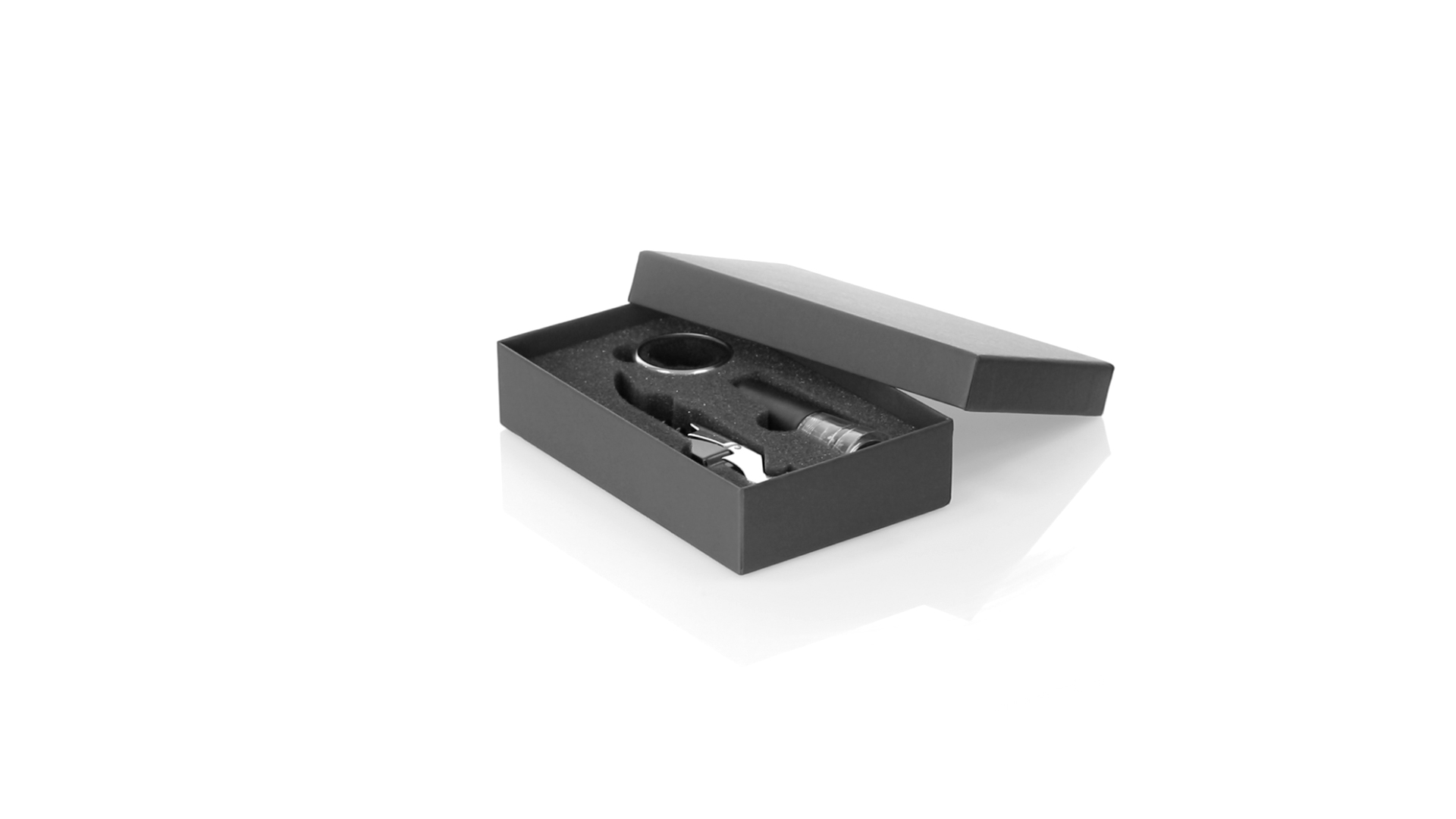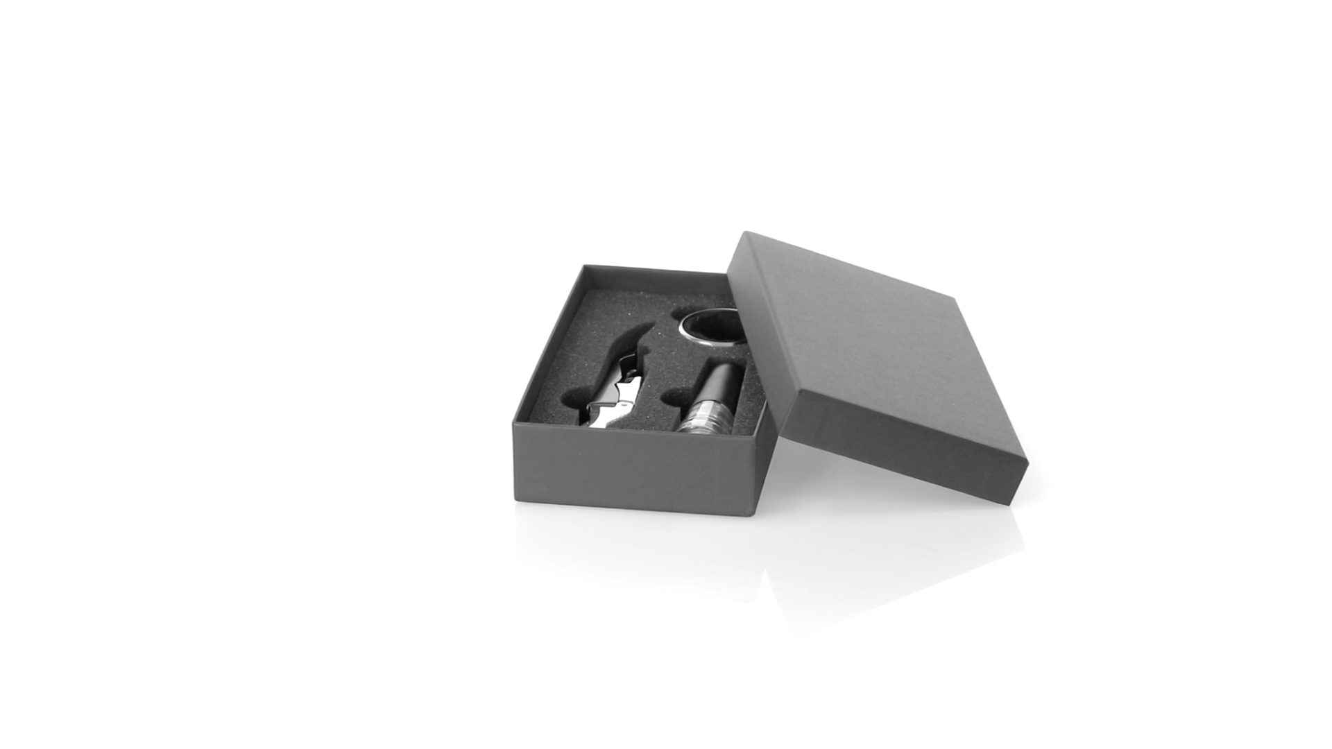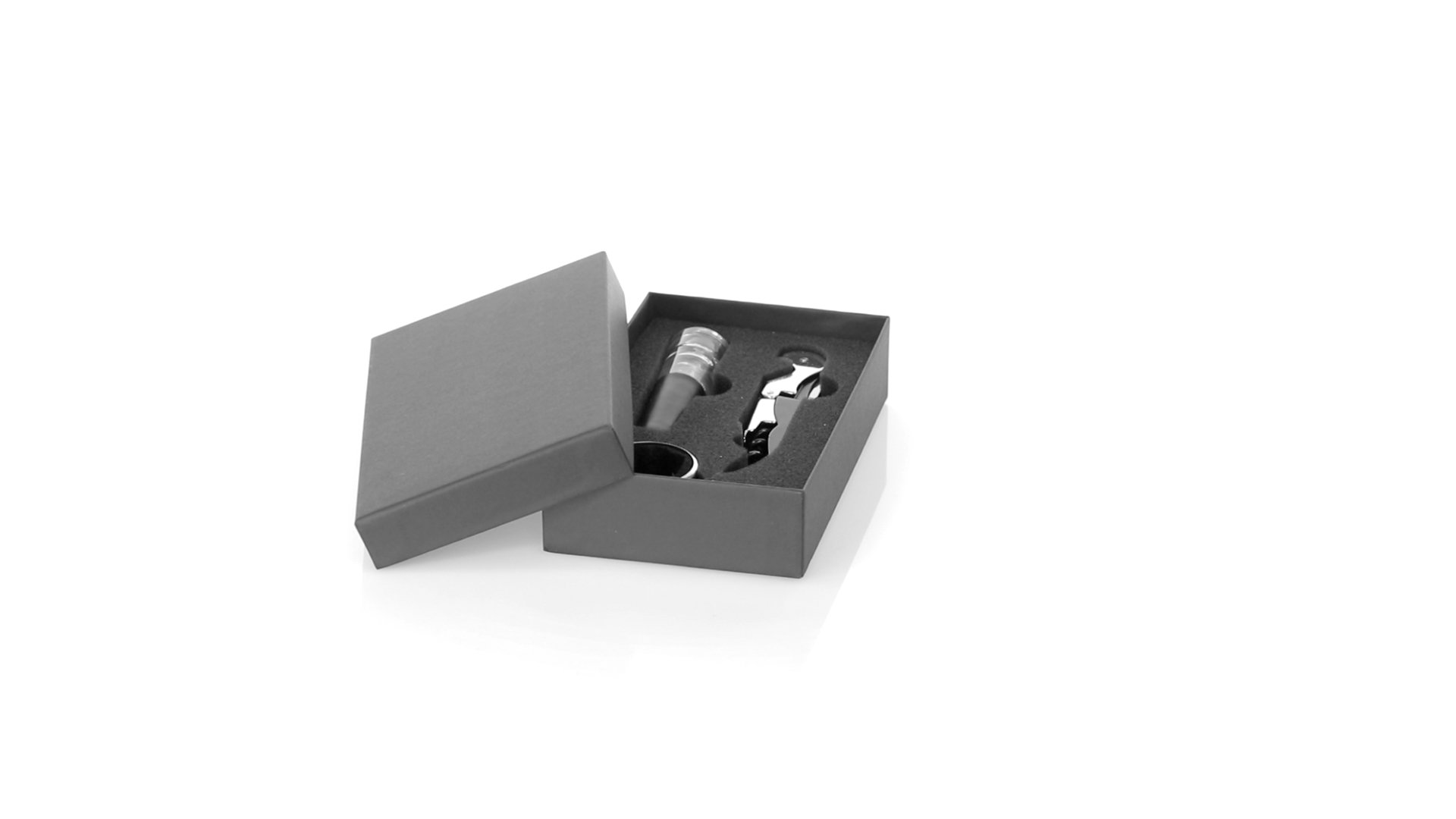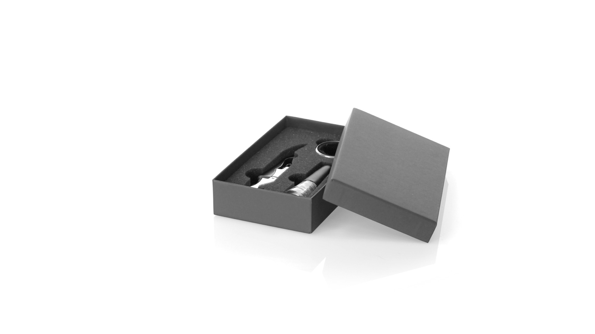 Ultimatives Weinset in schlichtem Schwarz, präsentiert in einem individuellen Etui mit gestanztem Schaumstoffeinsatz und weisser Schutzhülle. Inklusive Tropfverschluss, Korkenzieher aus Edelstahl und Vakuumpumpdeckel.