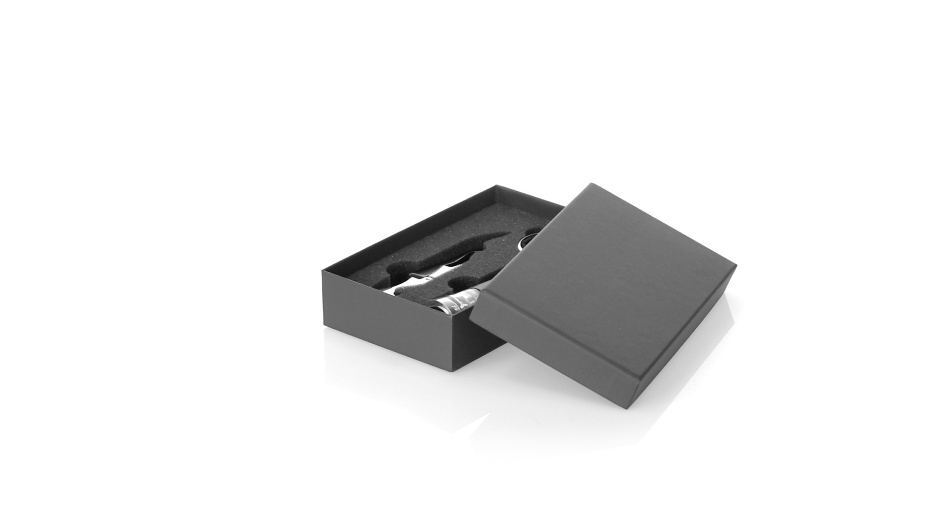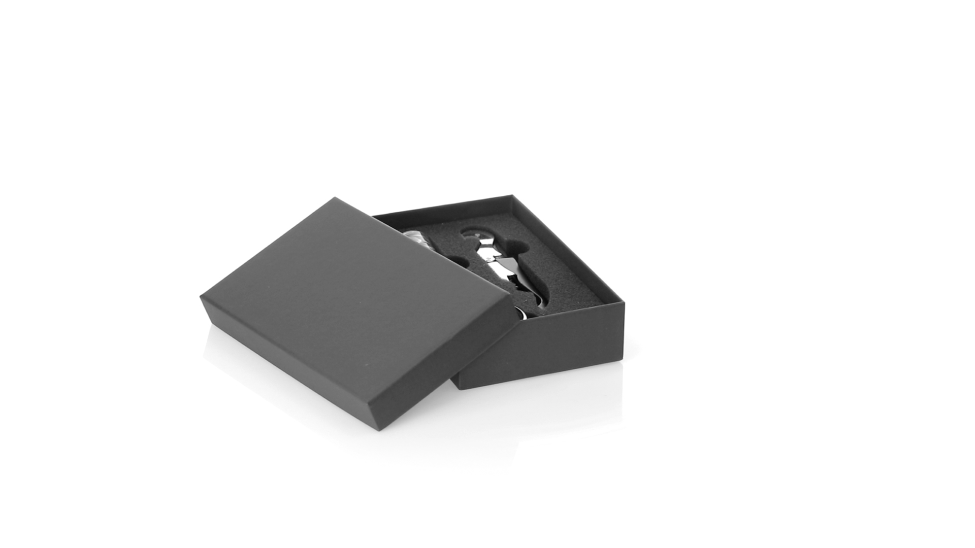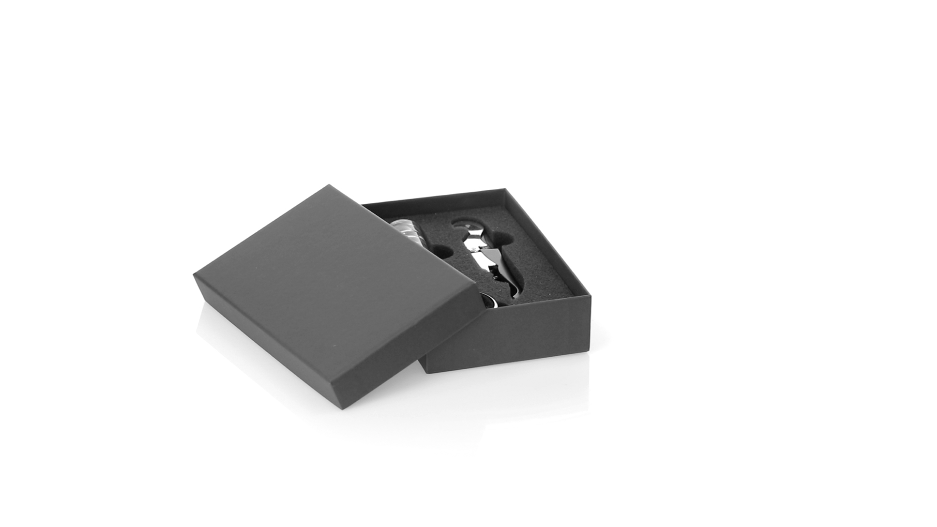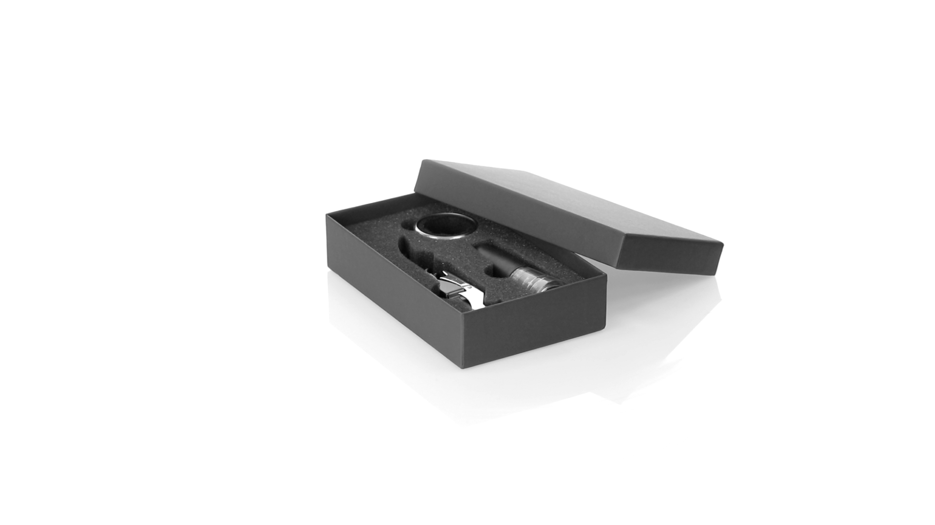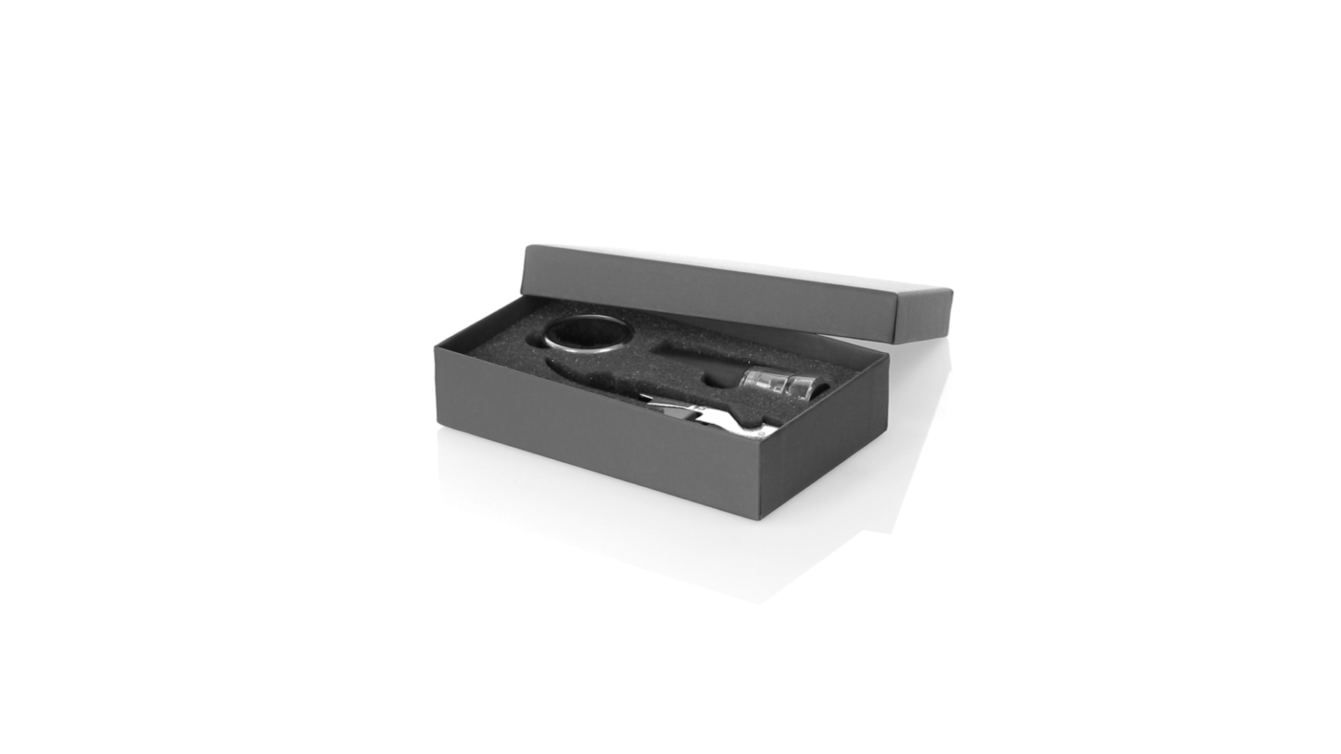 Ultimatives Weinset in schlichtem Schwarz, präsentiert in einem individuellen Etui mit gestanztem Schaumstoffeinsatz und weisser Schutzhülle. Inklusive Tropfverschluss, Korkenzieher aus Edelstahl und Vakuumpumpdeckel.