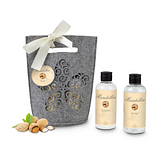 Das Wellness-Geschenkset Mandellini ist ein kleines, aber feines Präsent, das perfekt für besondere Momente ist. In einer dekorativen Filztasche mit eleganter Ausstanzung findest du je 100 ml Duschgel und Bodylotion, die mit dem sanften Duft von Mandelmilch deine Sinne verwöhnen.