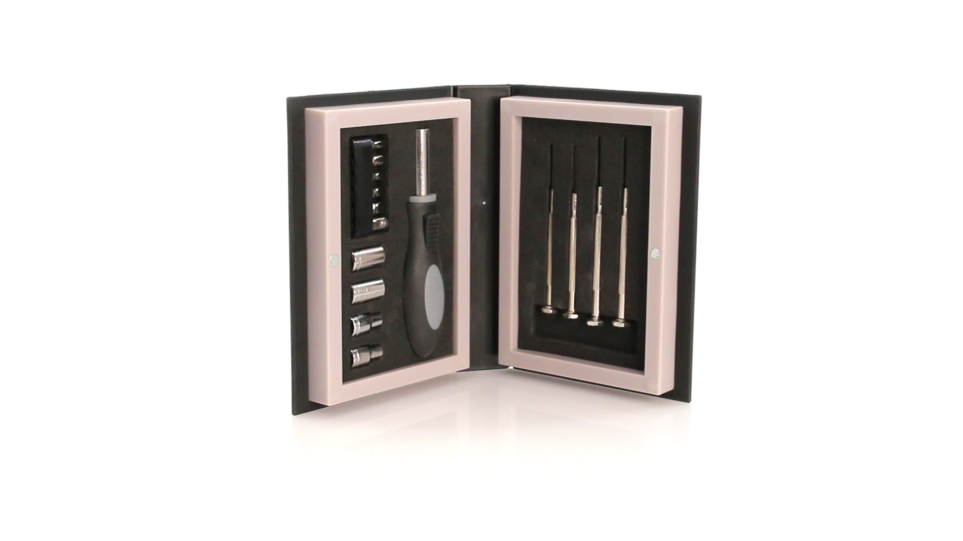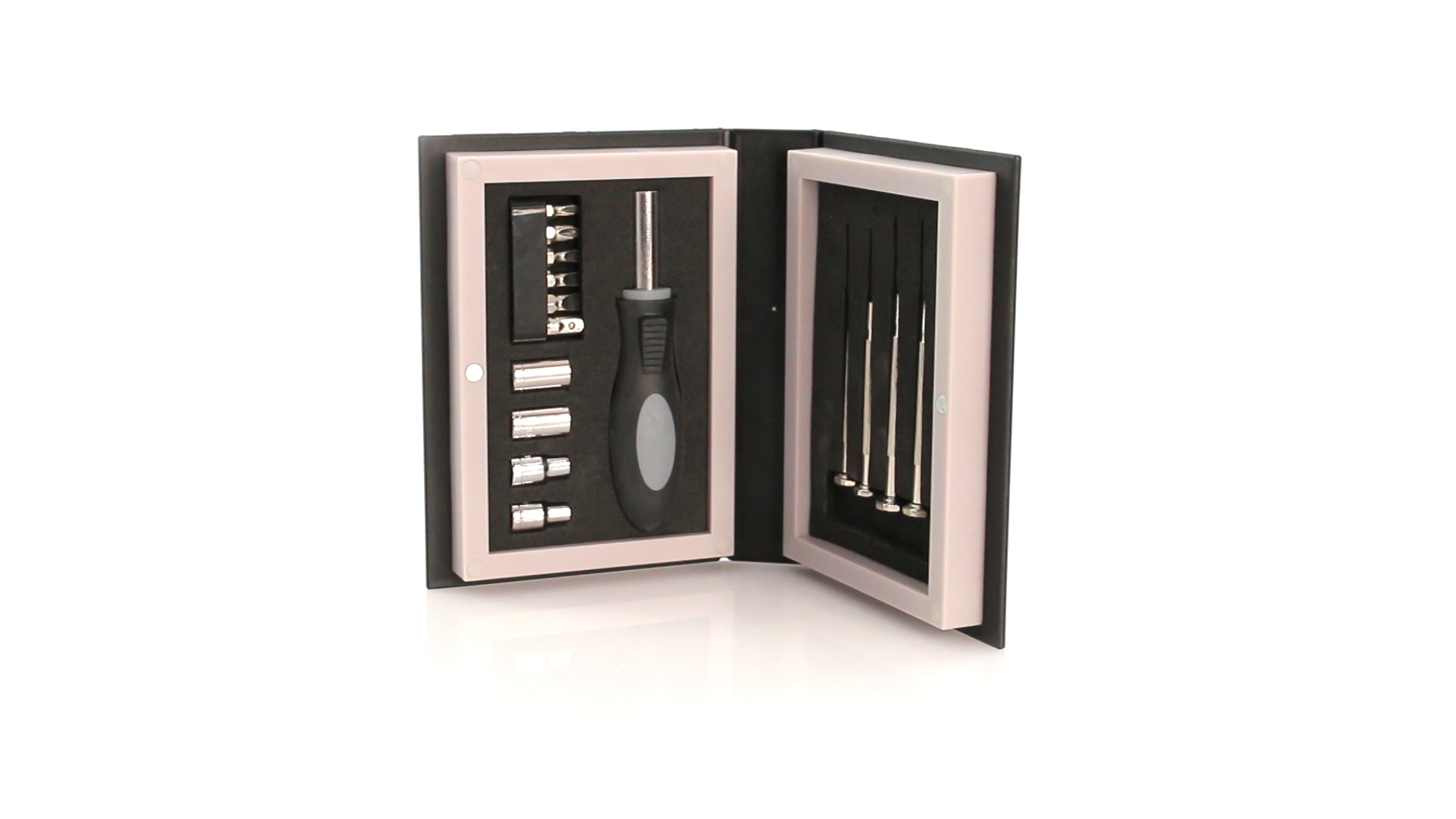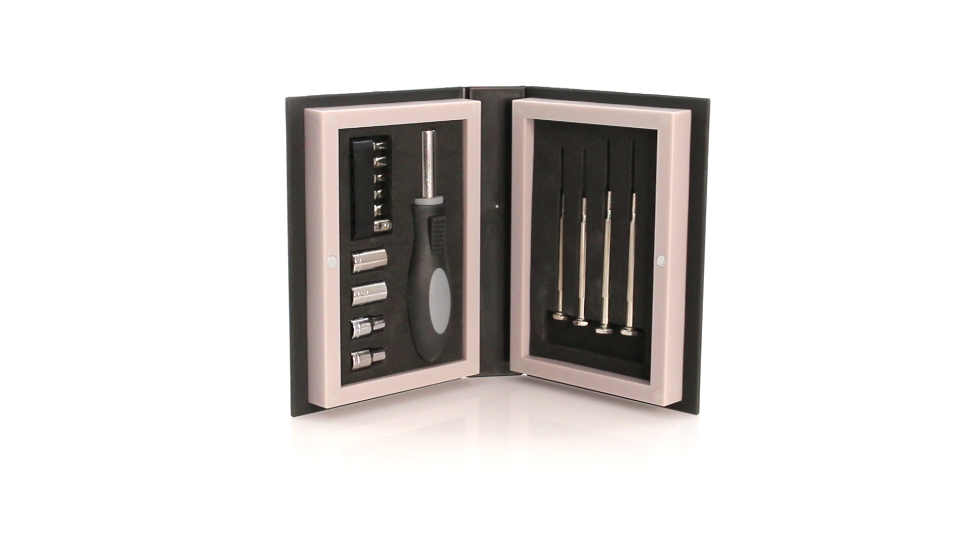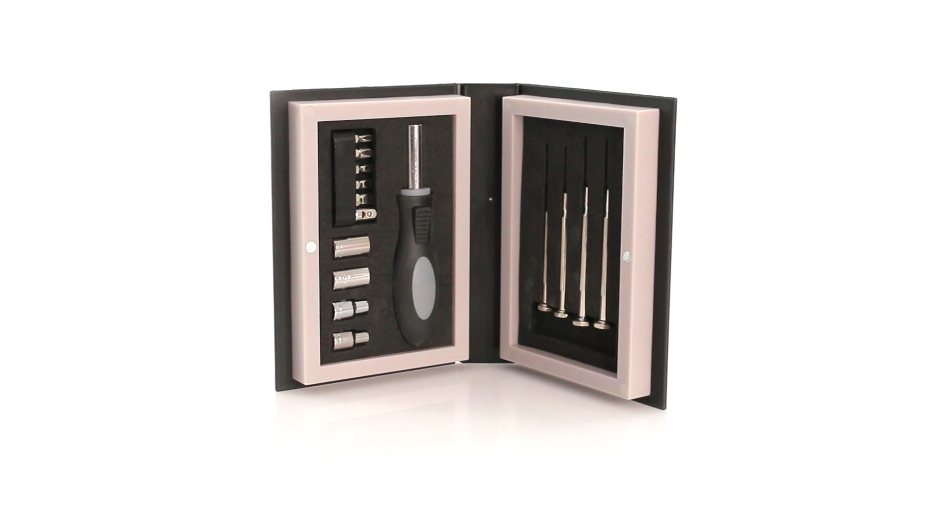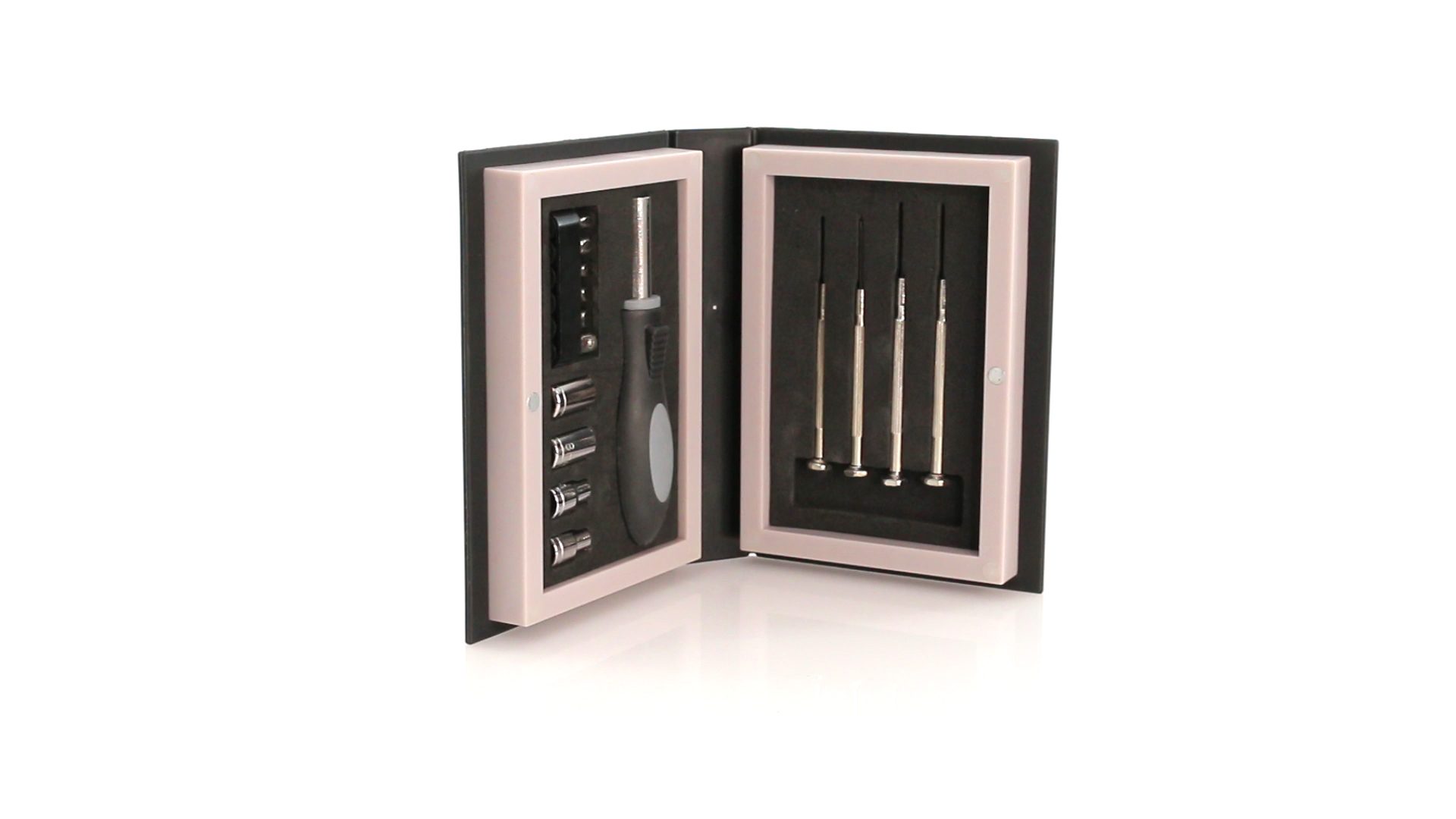 15-teiliges Werkzeugset in einem robusten Case in Buch-Form. Enthält einen Satz Präzisionsschraubendreher sowie Befestigungswerkzeug, Schlitz- und Kreuzschraubendreher und Schraubenschlüsselköpfe.