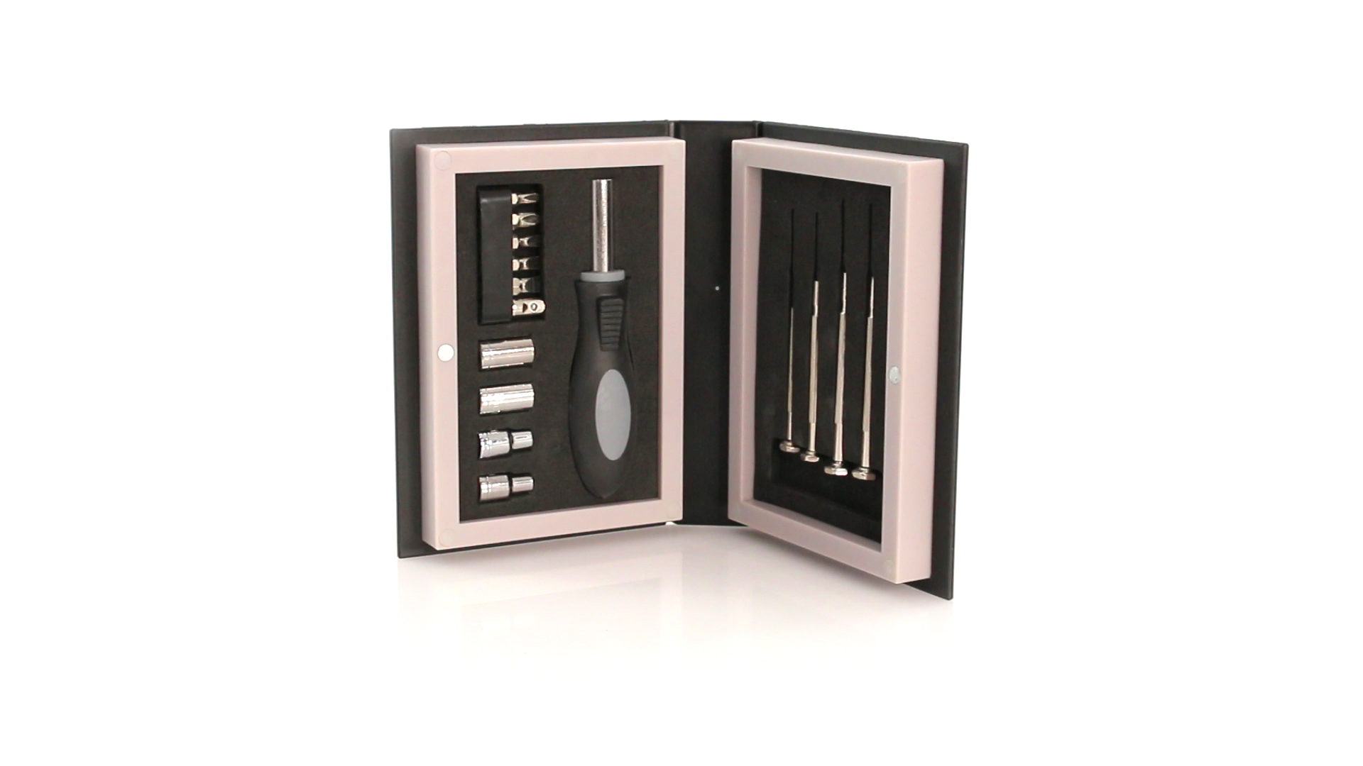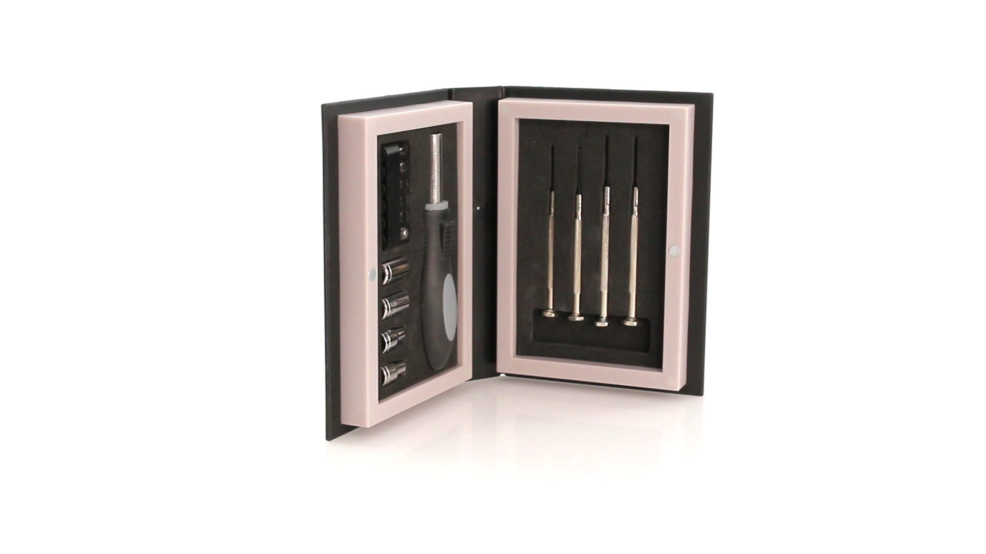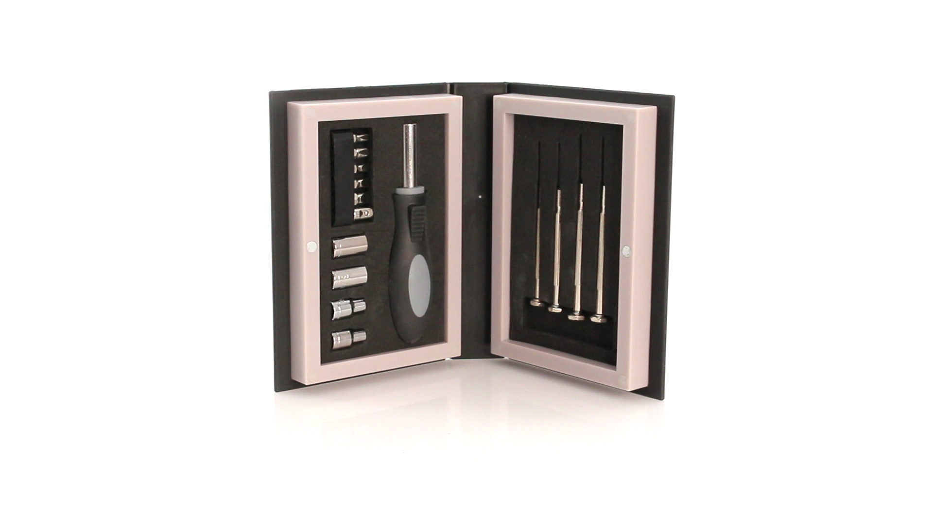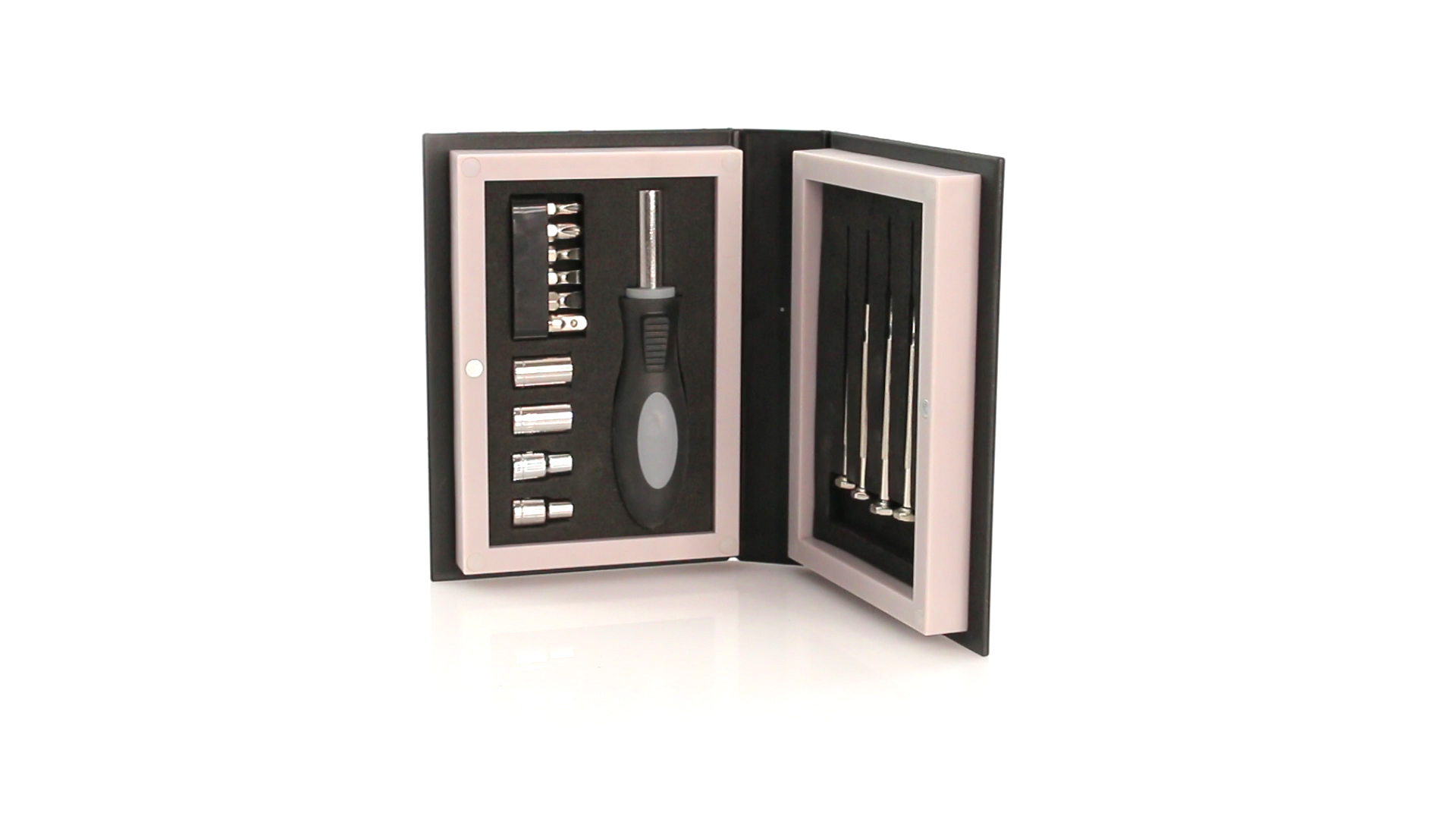 15-teiliges Werkzeugset in einem robusten Case in Buch-Form. Enthält einen Satz Präzisionsschraubendreher sowie Befestigungswerkzeug, Schlitz- und Kreuzschraubendreher und Schraubenschlüsselköpfe.