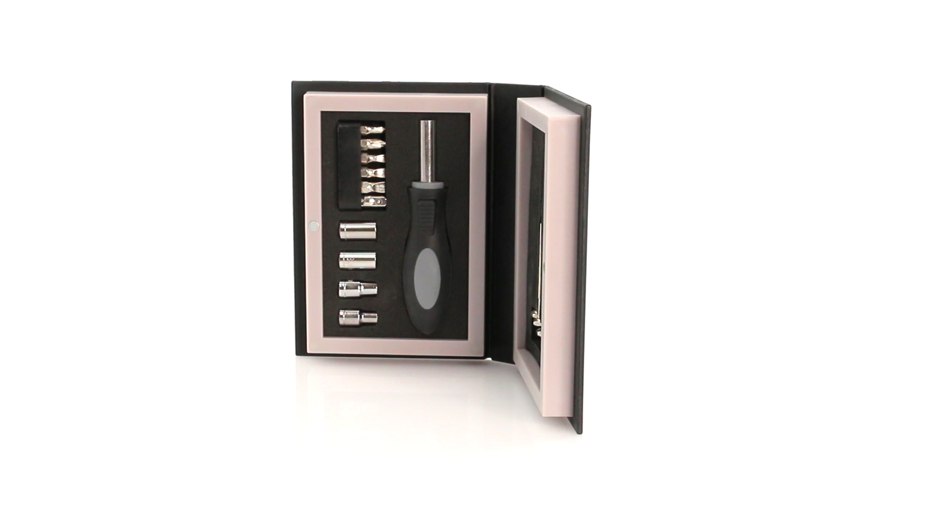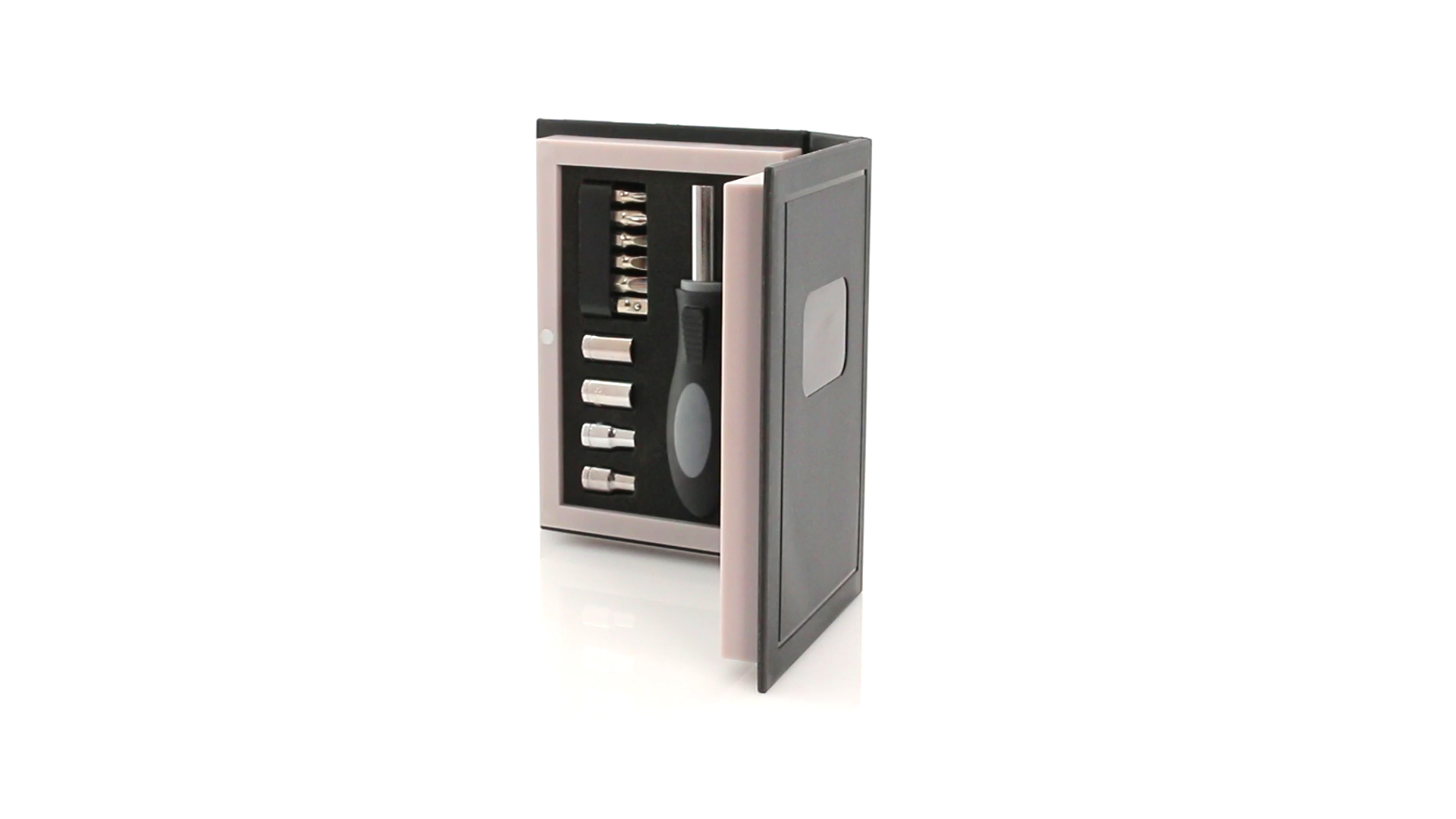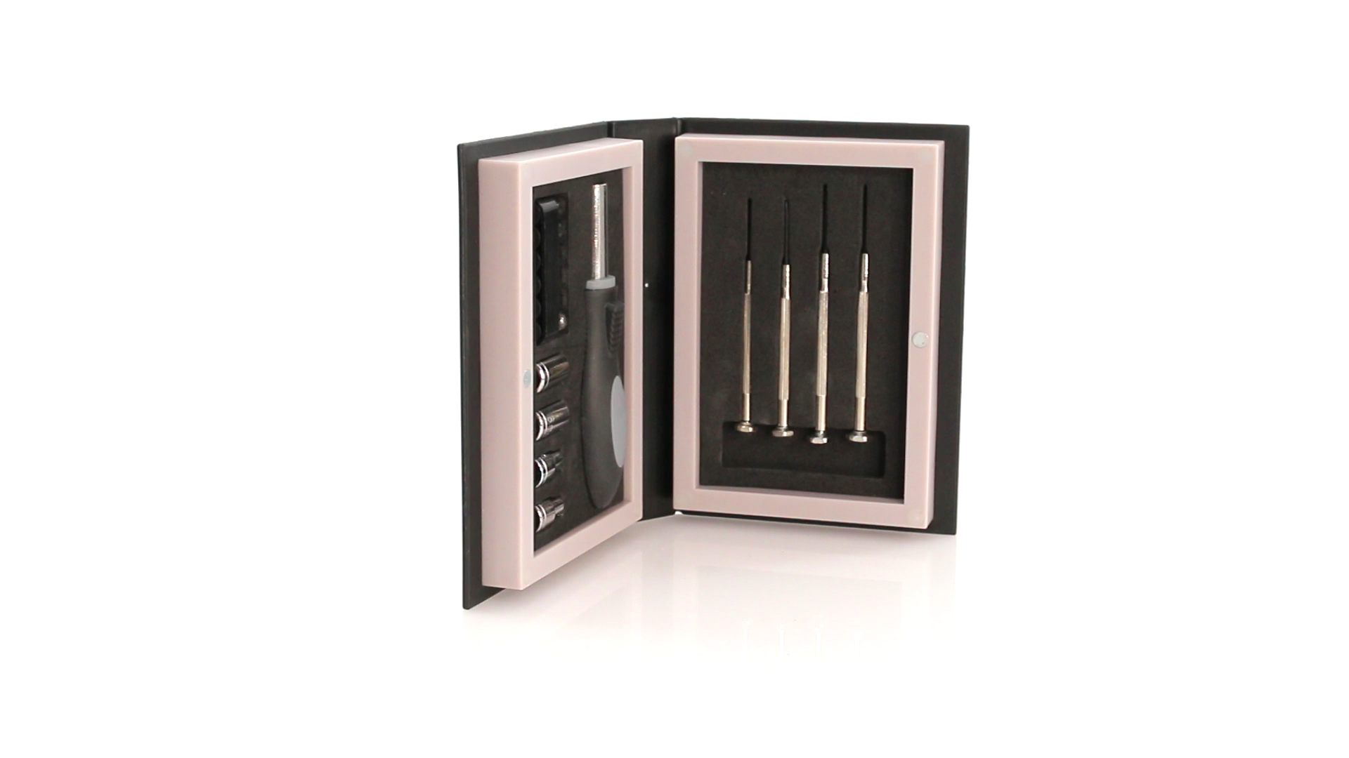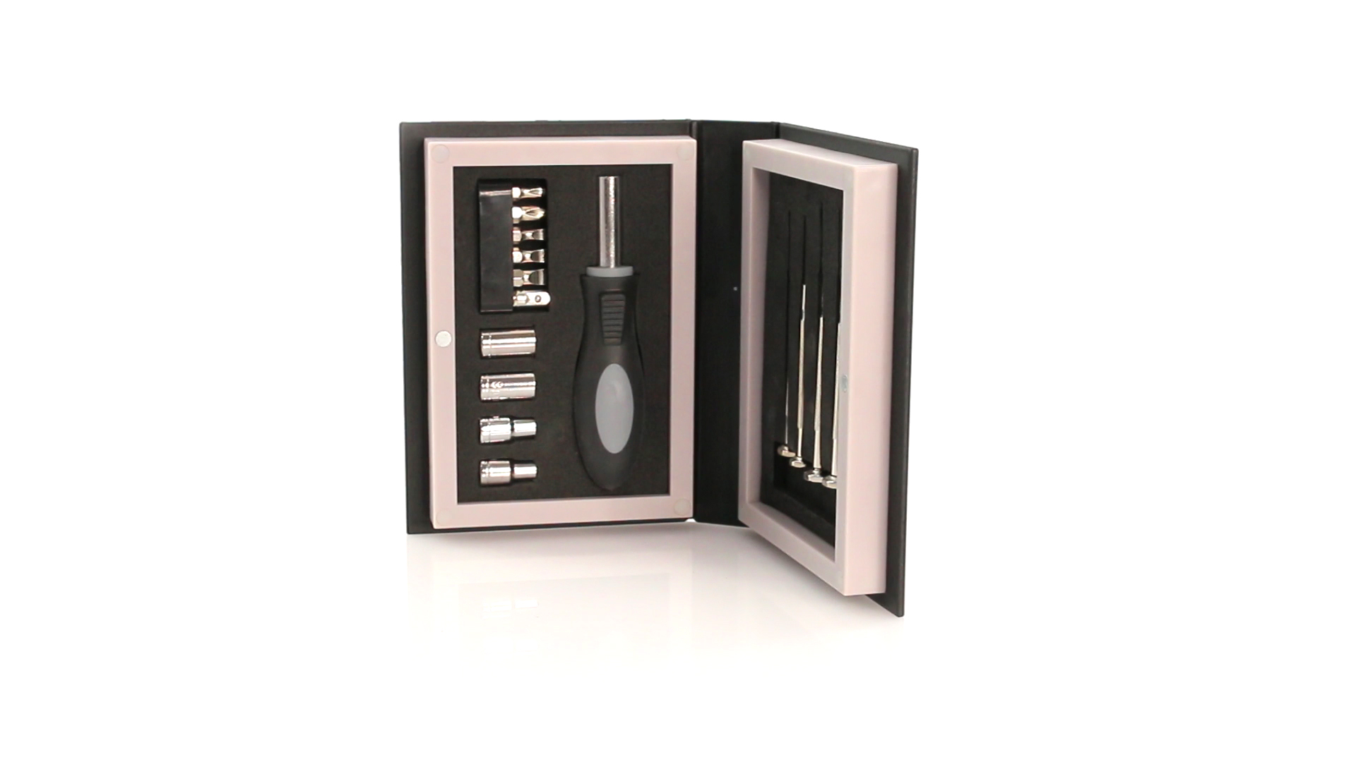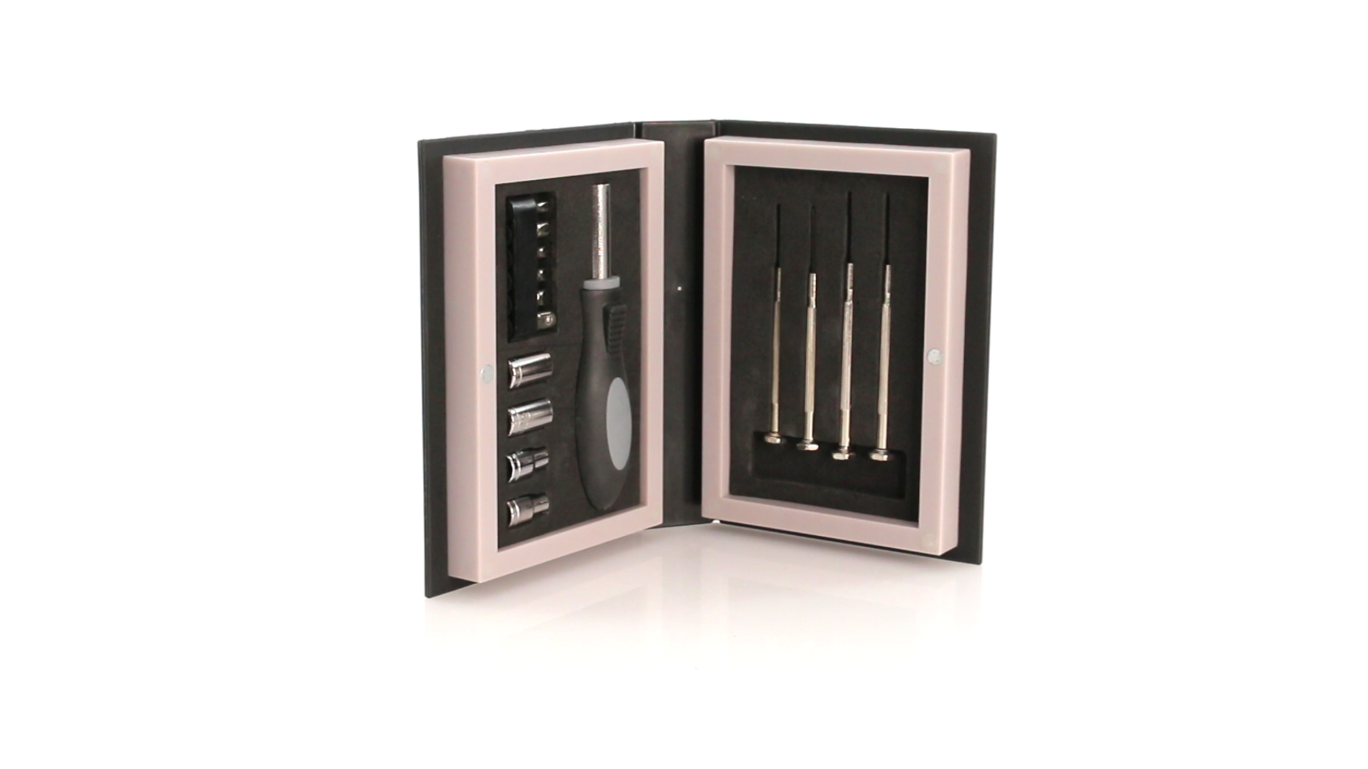 15-teiliges Werkzeugset in einem robusten Case in Buch-Form. Enthält einen Satz Präzisionsschraubendreher sowie Befestigungswerkzeug, Schlitz- und Kreuzschraubendreher und Schraubenschlüsselköpfe.