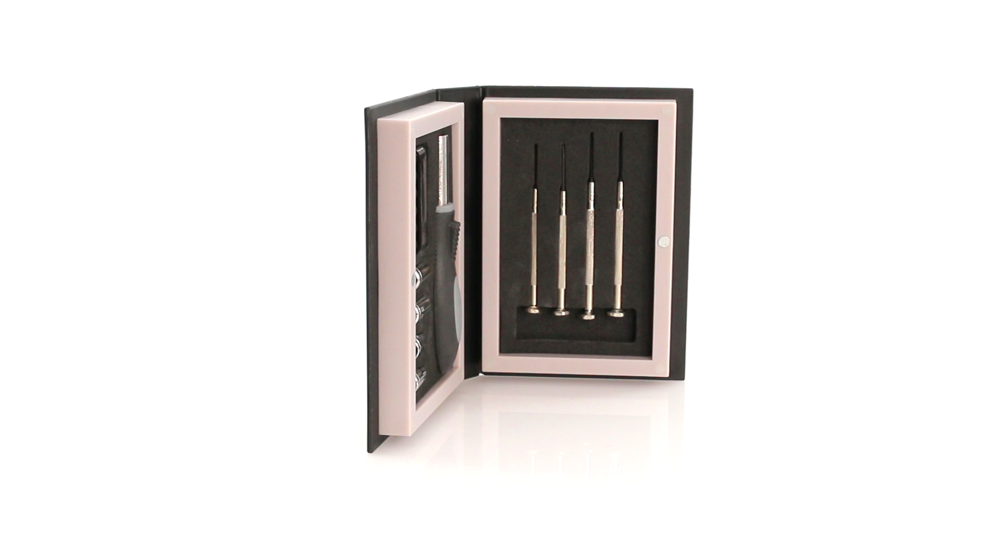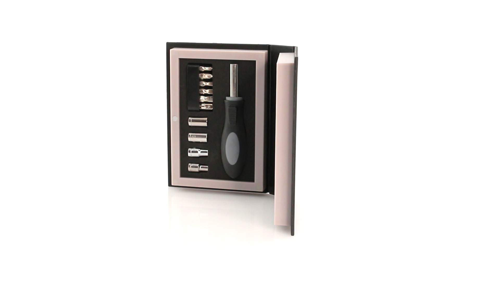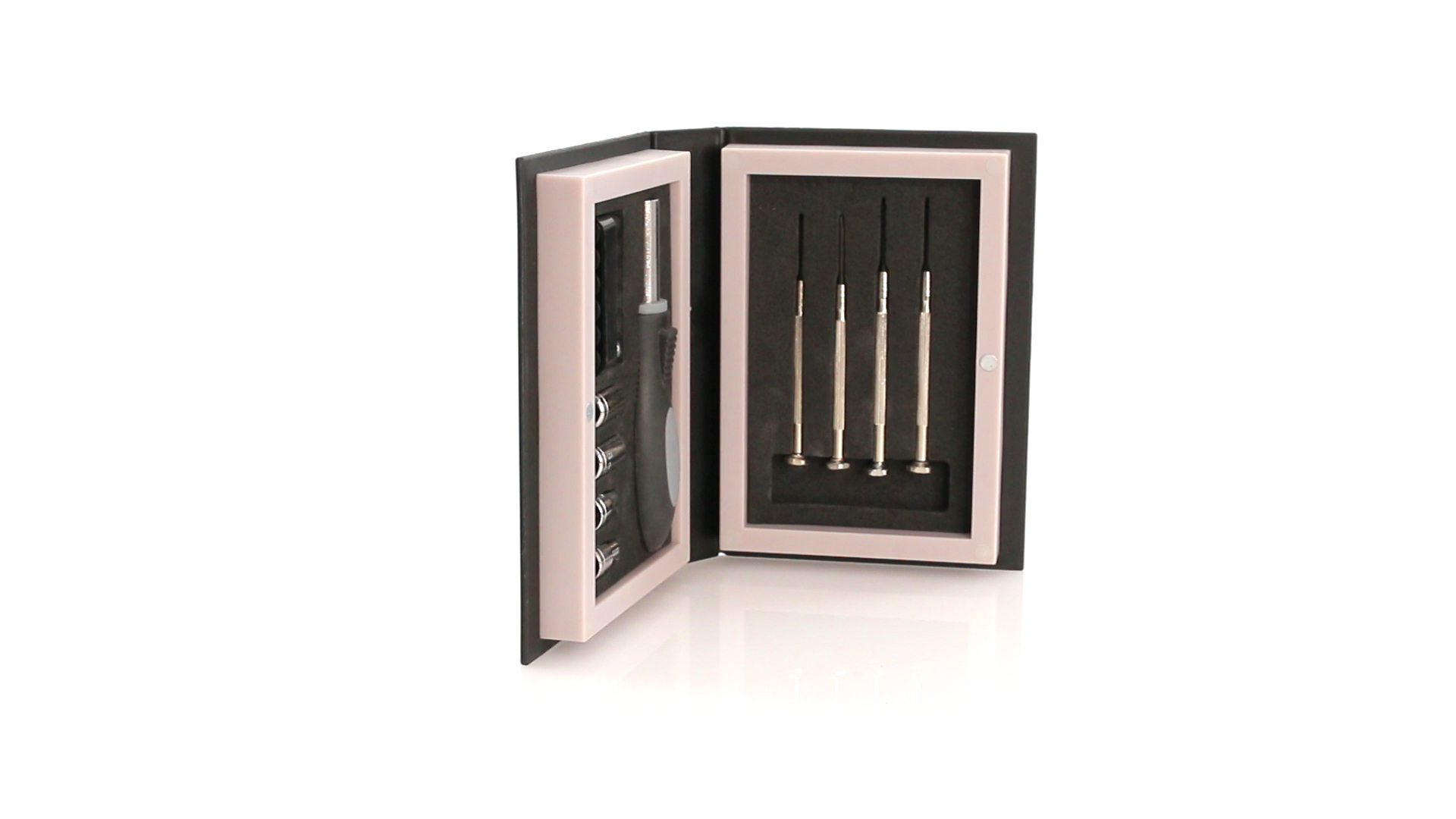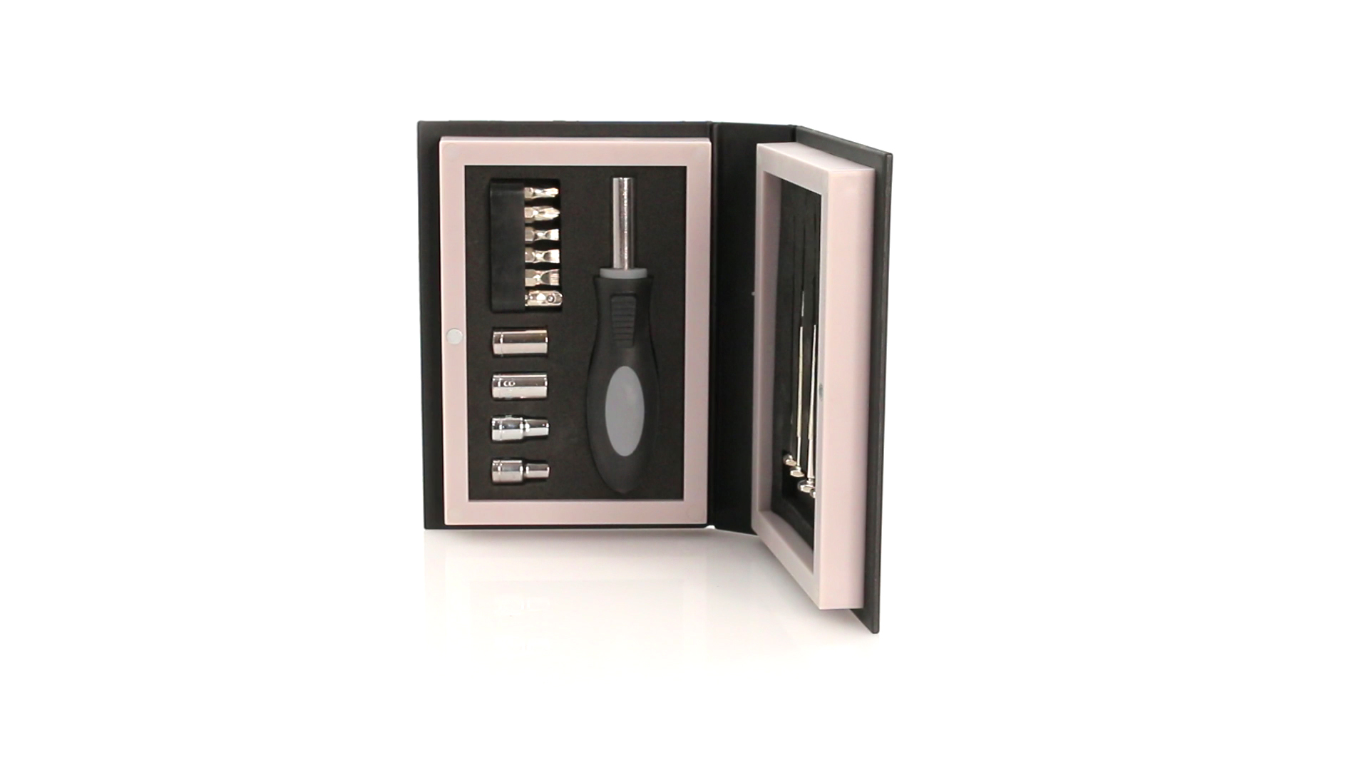 15-teiliges Werkzeugset in einem robusten Case in Buch-Form. Enthält einen Satz Präzisionsschraubendreher sowie Befestigungswerkzeug, Schlitz- und Kreuzschraubendreher und Schraubenschlüsselköpfe.