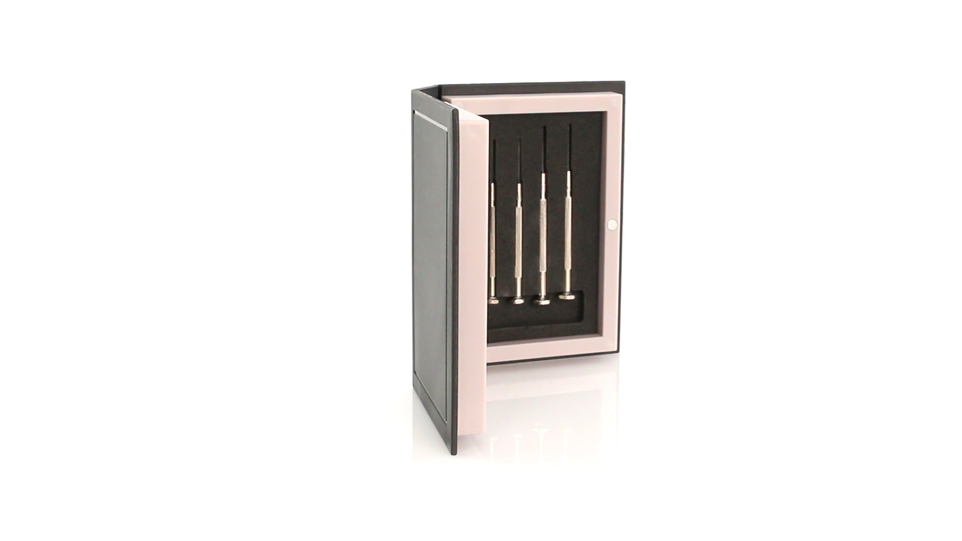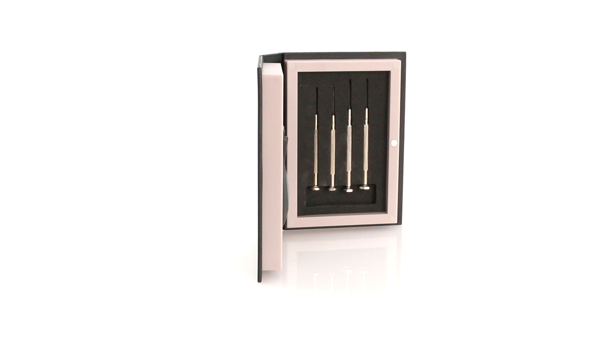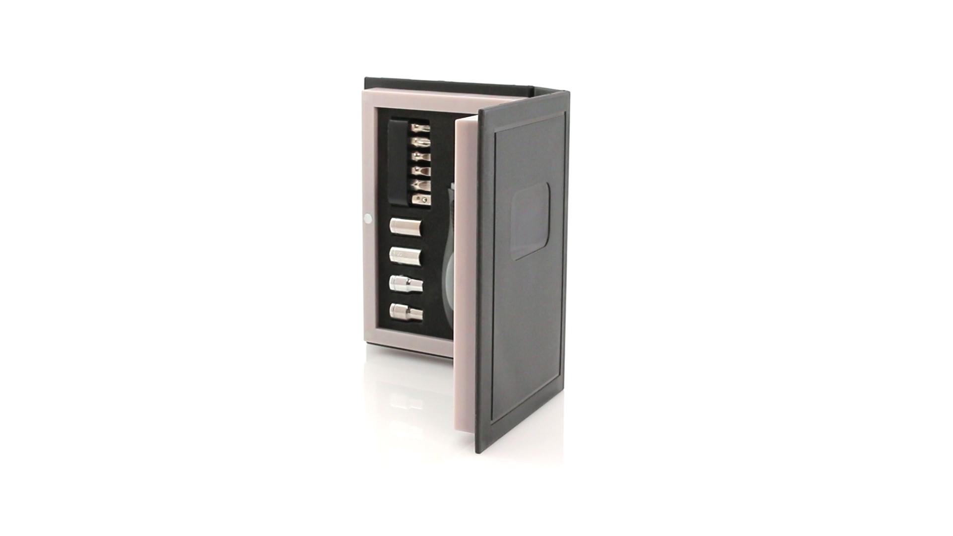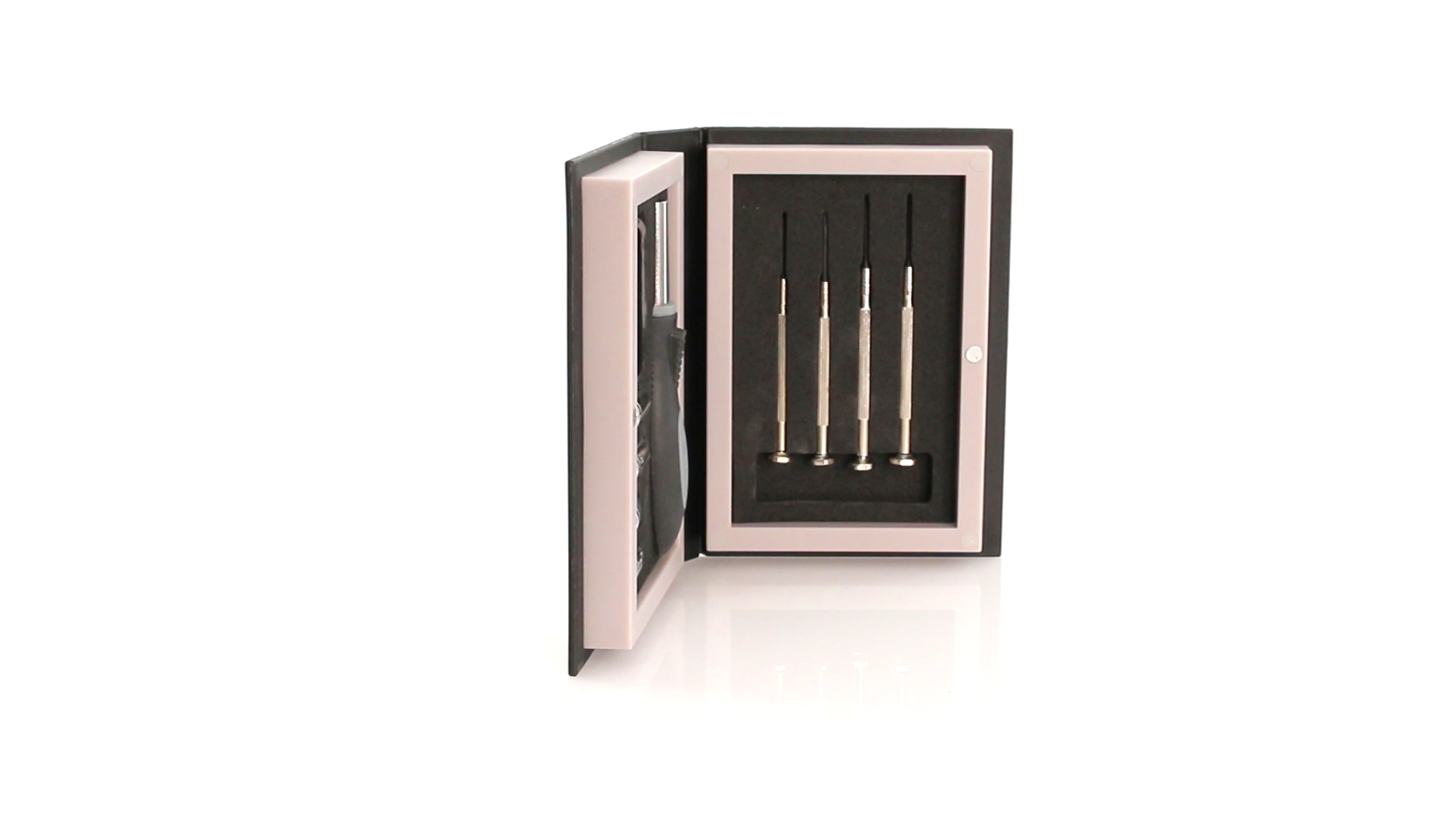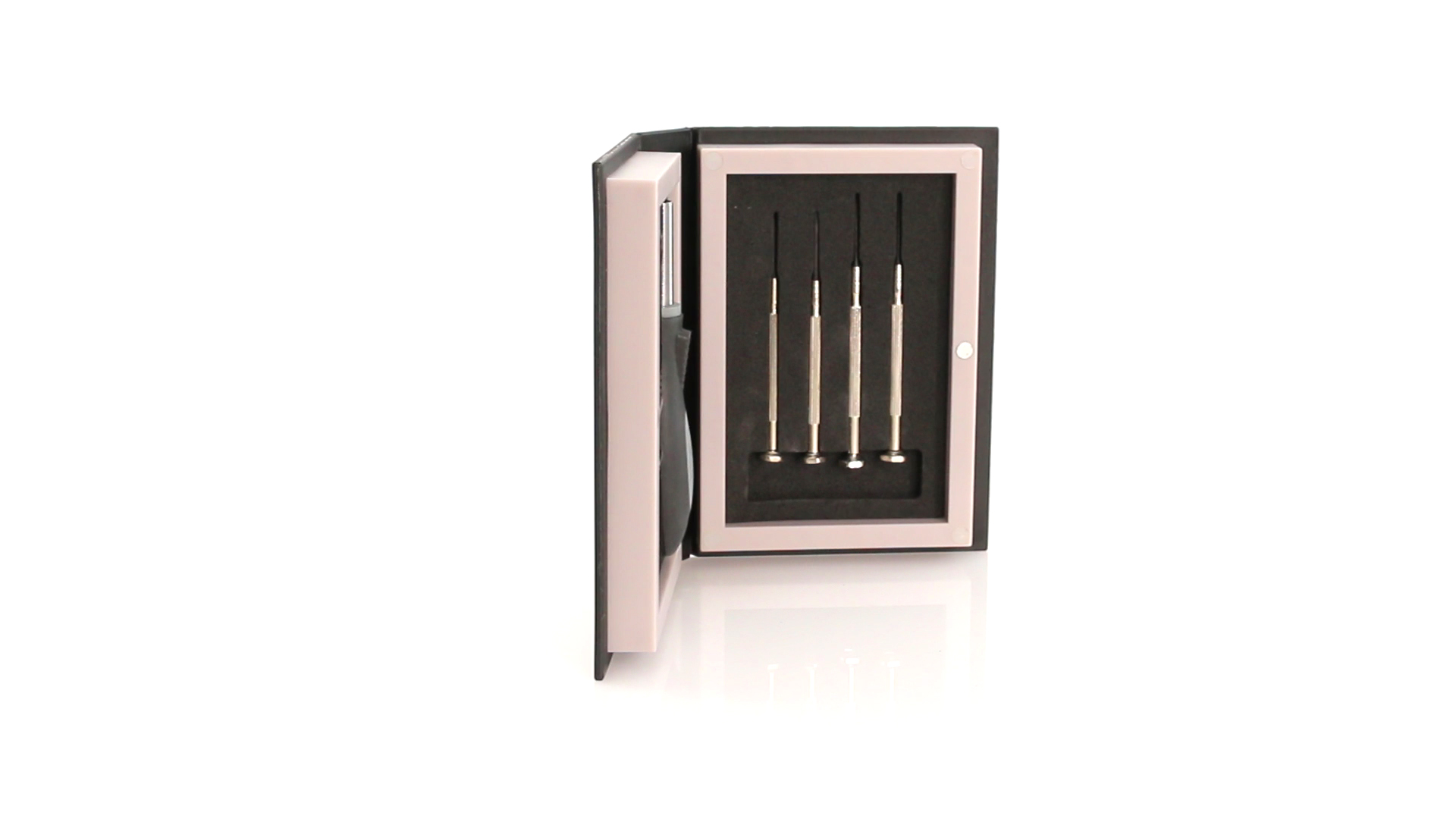 15-teiliges Werkzeugset in einem robusten Case in Buch-Form. Enthält einen Satz Präzisionsschraubendreher sowie Befestigungswerkzeug, Schlitz- und Kreuzschraubendreher und Schraubenschlüsselköpfe.