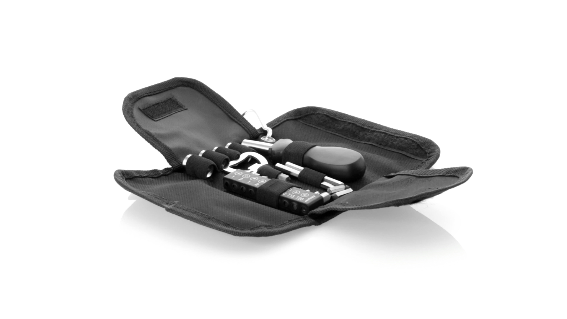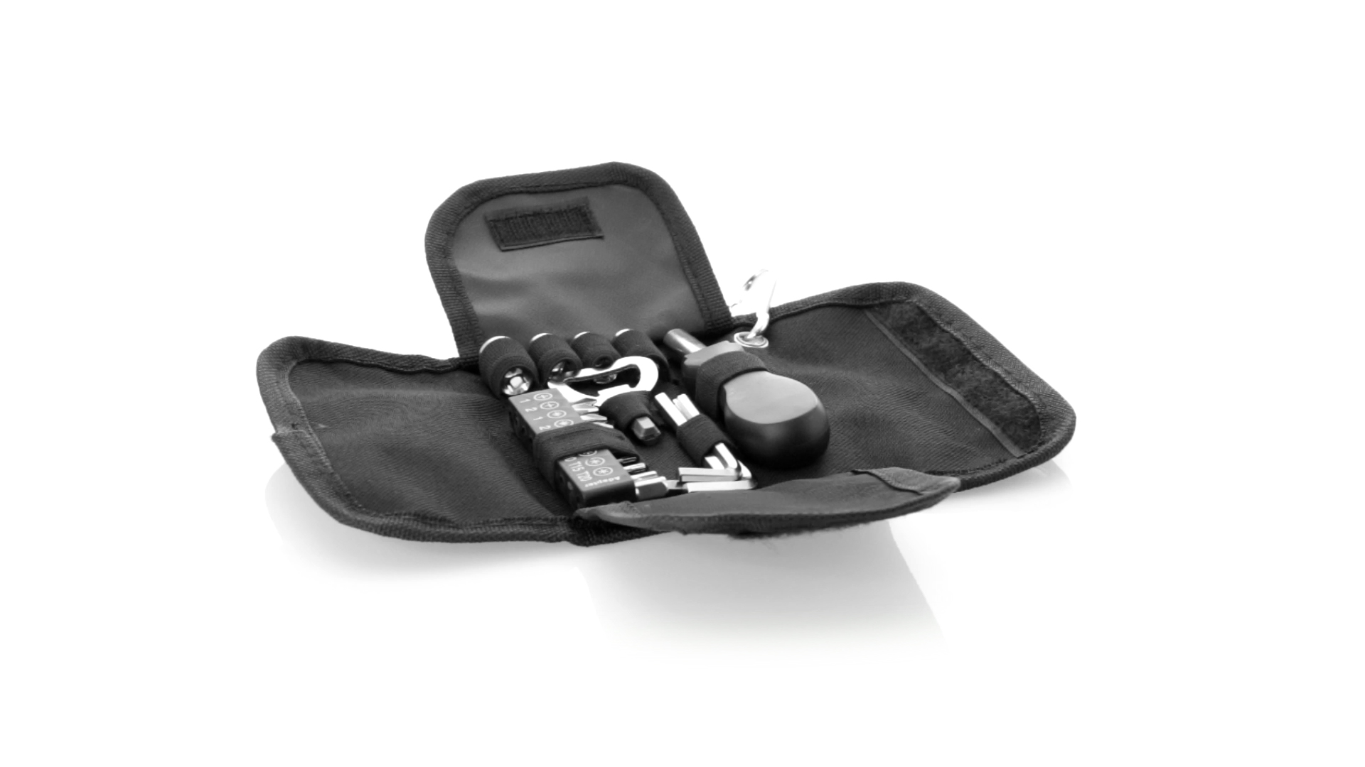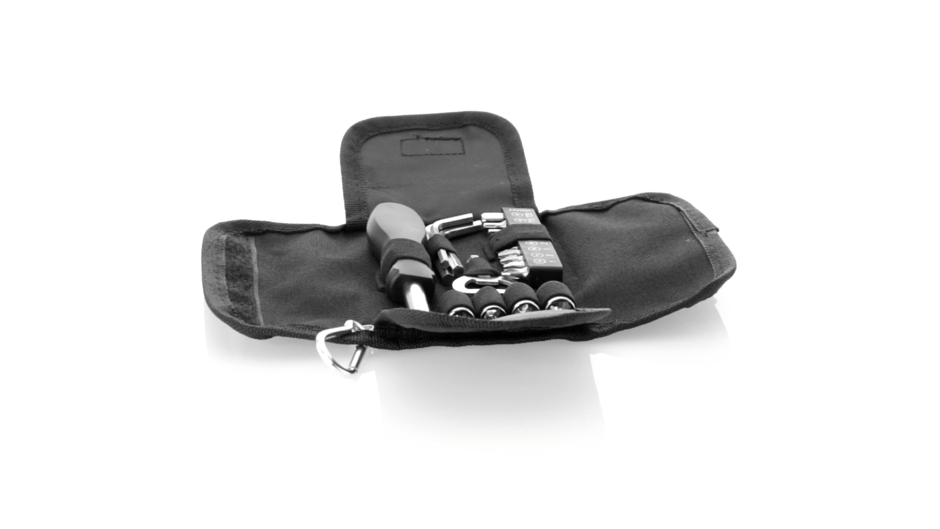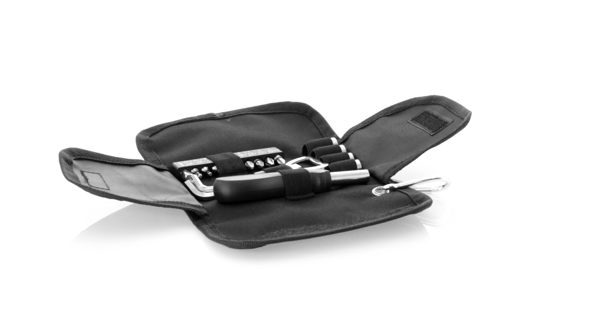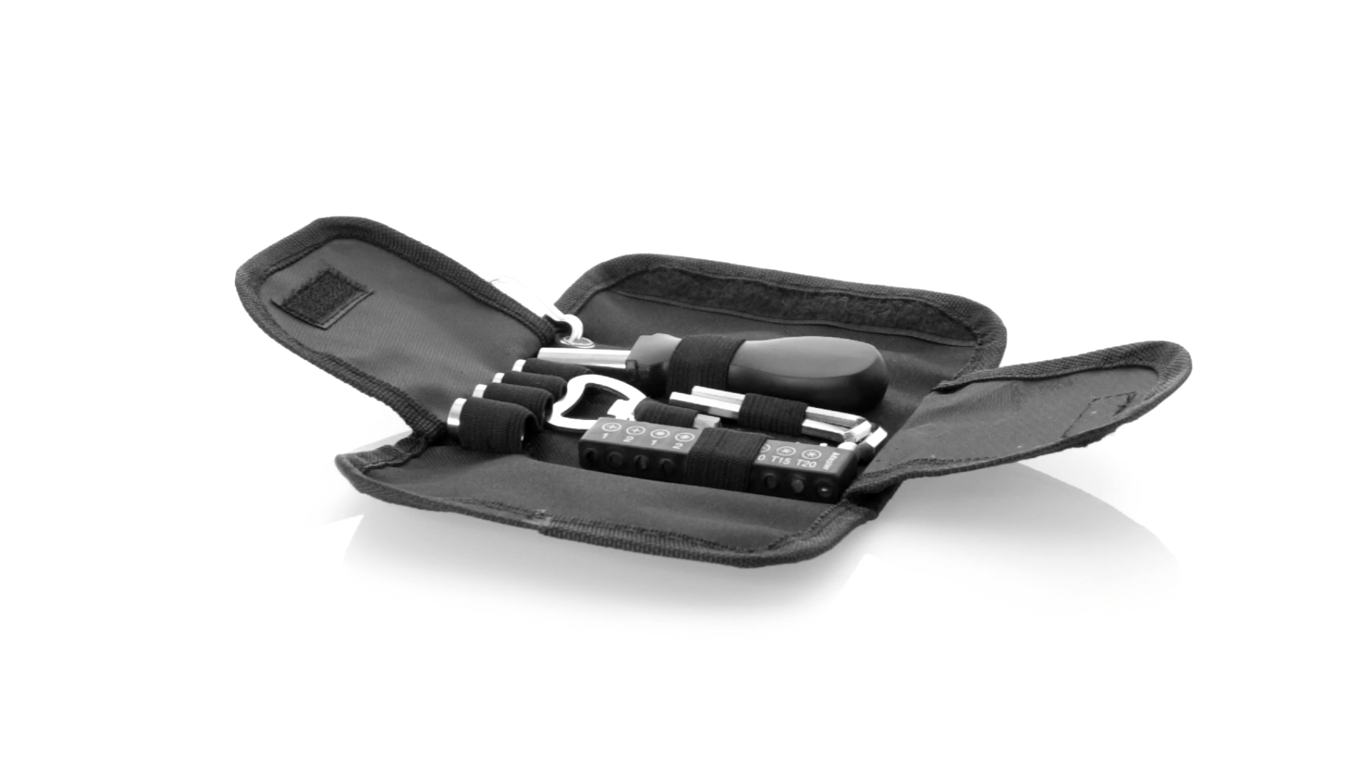 19-teiliges Werkzeugset in robustem Polyester-Etui mit Reissverschluss und Metallkarabiner. Enthält Befestigungswerkzeug, Schraubendreherköpfe (Schlitz, Kreuz und Torx), Schraubenschlüssel, verschiedene Inbusschlüssel und Öffner.