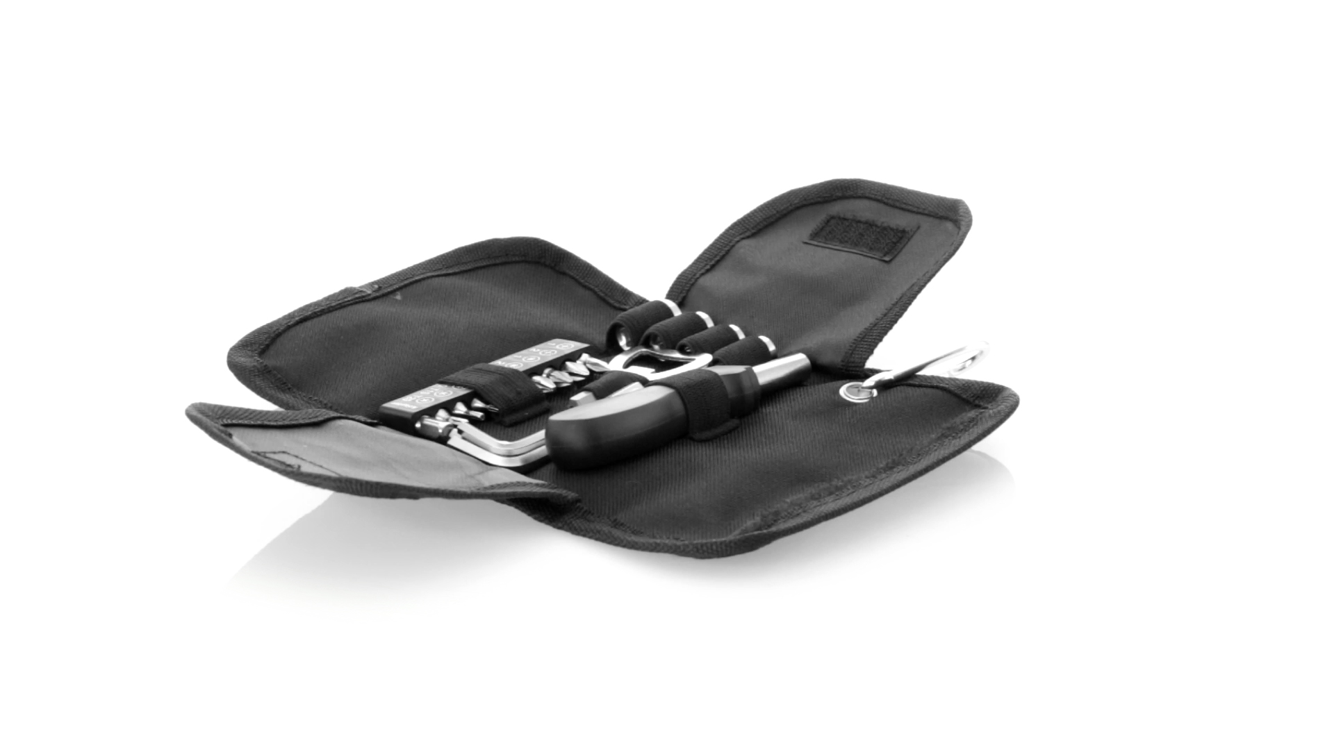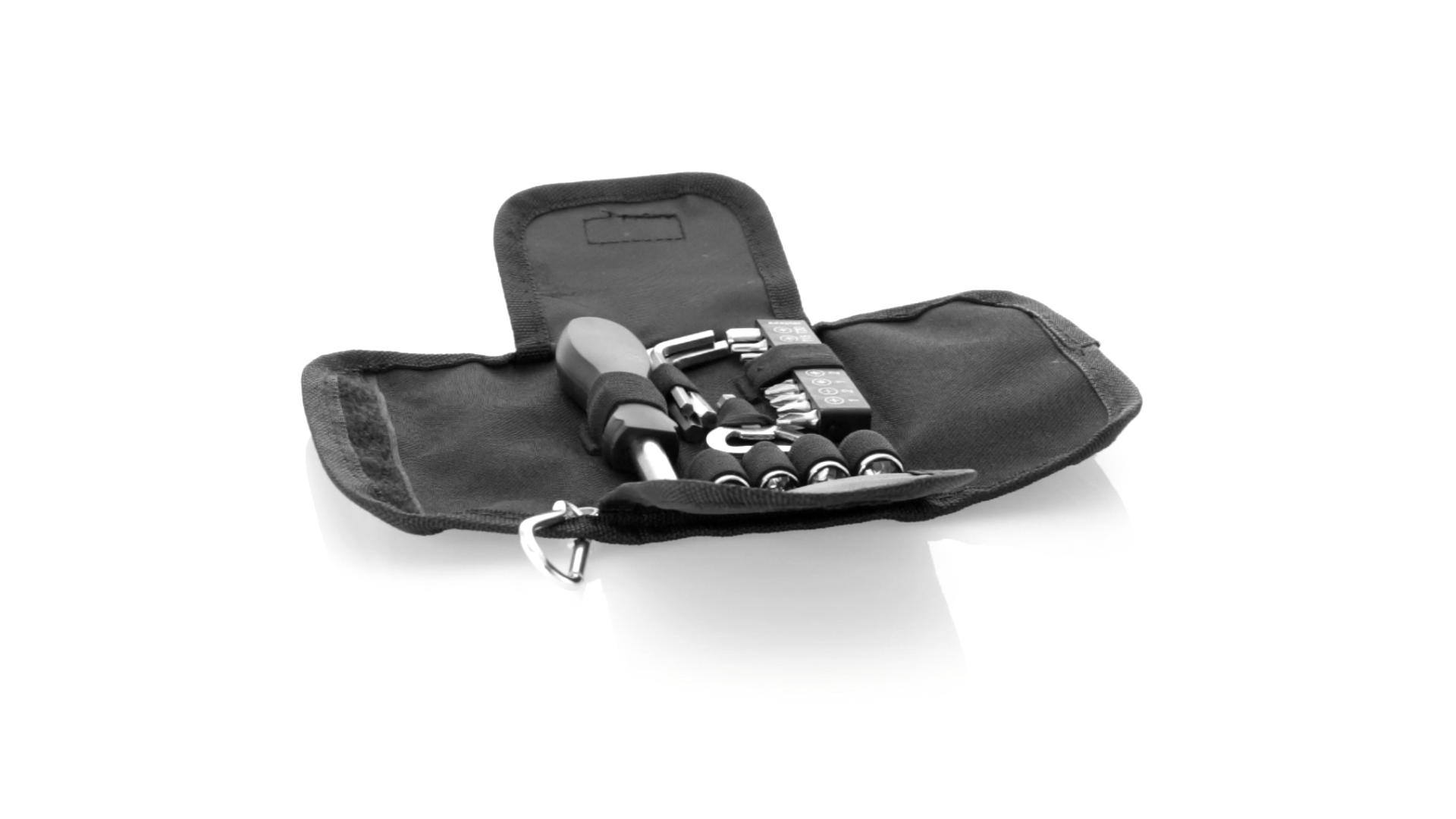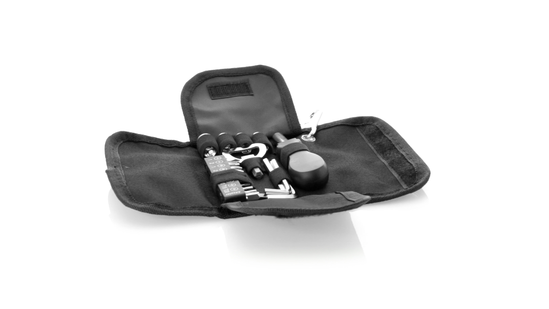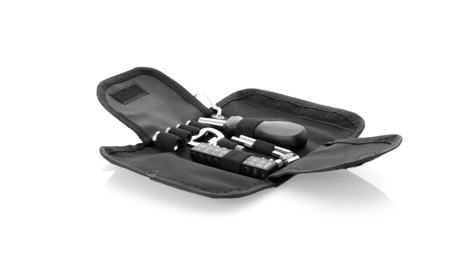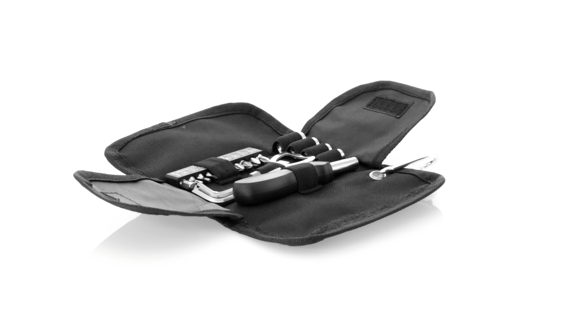 19-teiliges Werkzeugset in robustem Polyester-Etui mit Reissverschluss und Metallkarabiner. Enthält Befestigungswerkzeug, Schraubendreherköpfe (Schlitz, Kreuz und Torx), Schraubenschlüssel, verschiedene Inbusschlüssel und Öffner.