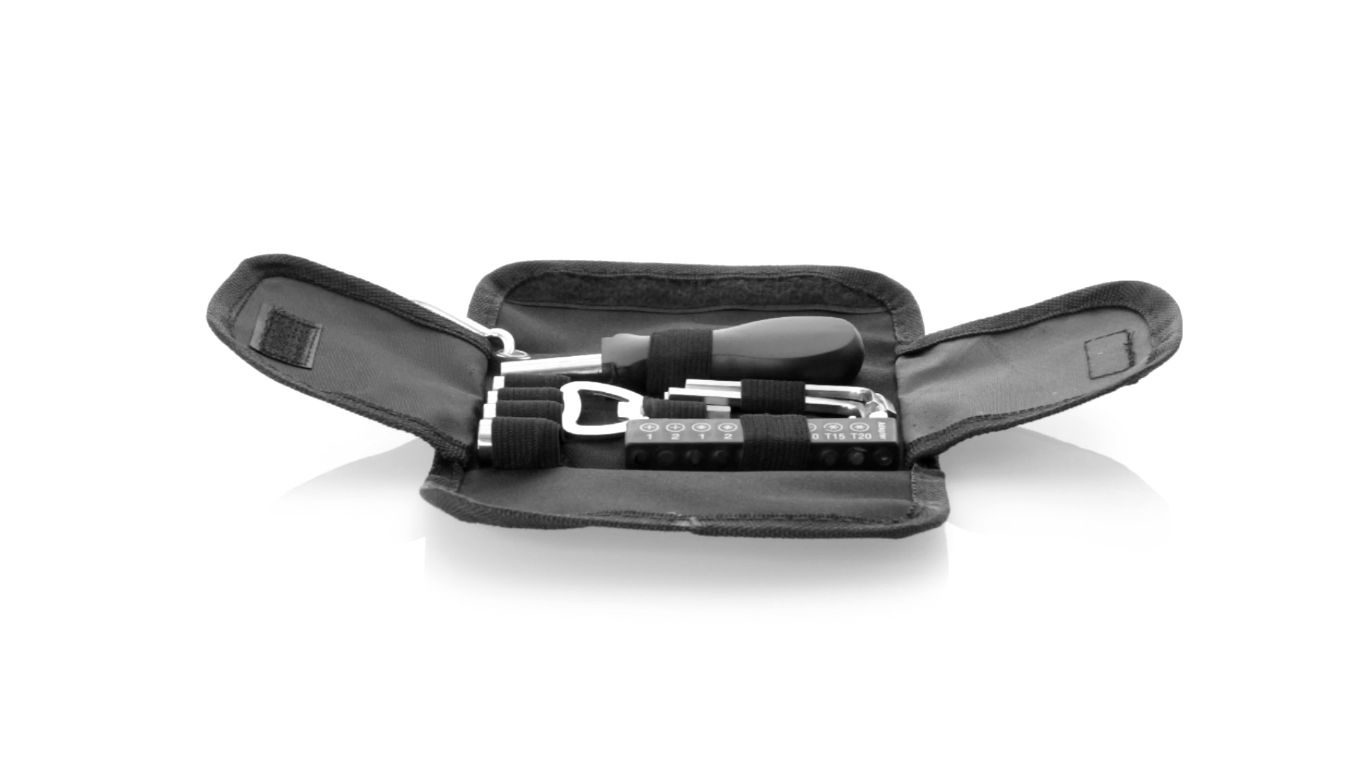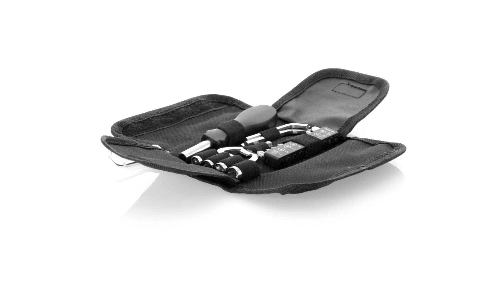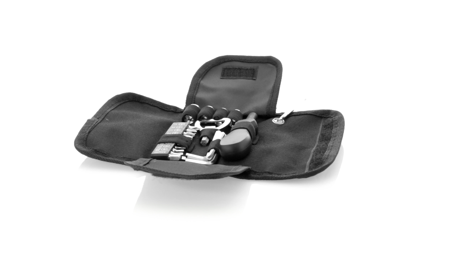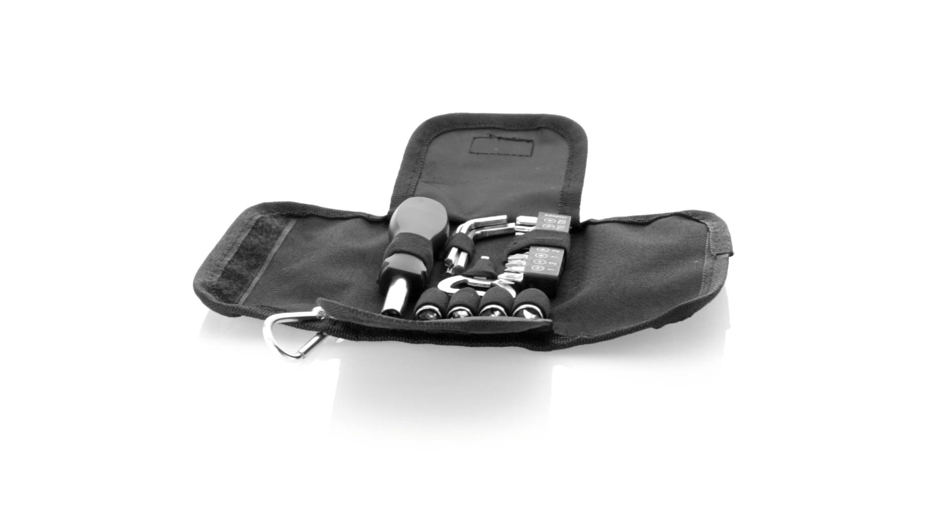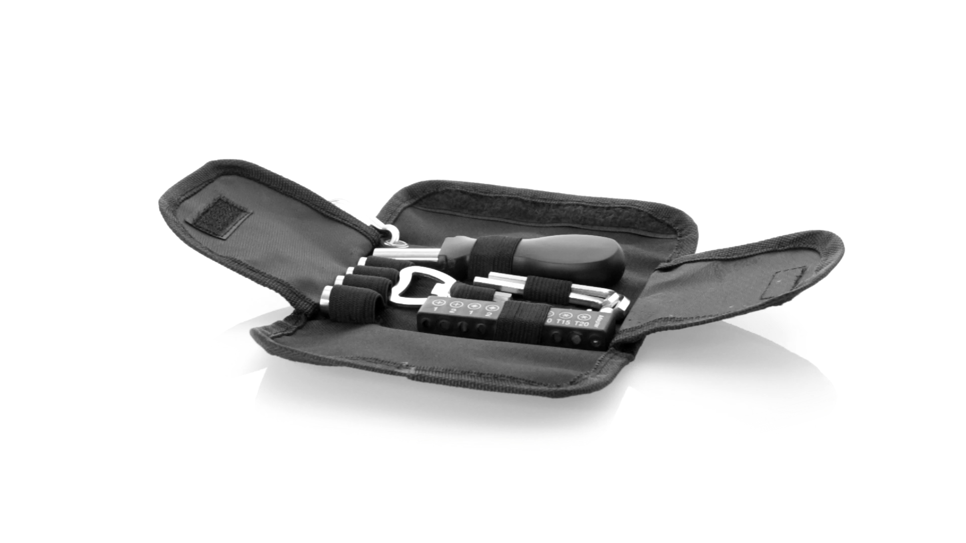 19-teiliges Werkzeugset in robustem Polyester-Etui mit Reissverschluss und Metallkarabiner. Enthält Befestigungswerkzeug, Schraubendreherköpfe (Schlitz, Kreuz und Torx), Schraubenschlüssel, verschiedene Inbusschlüssel und Öffner.