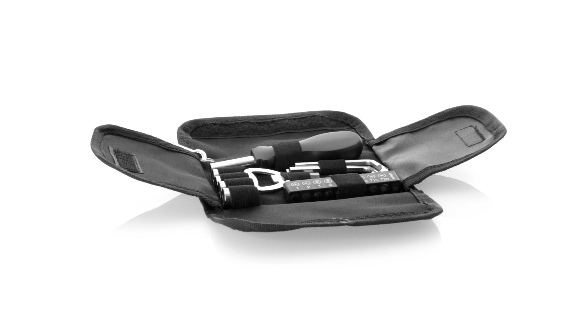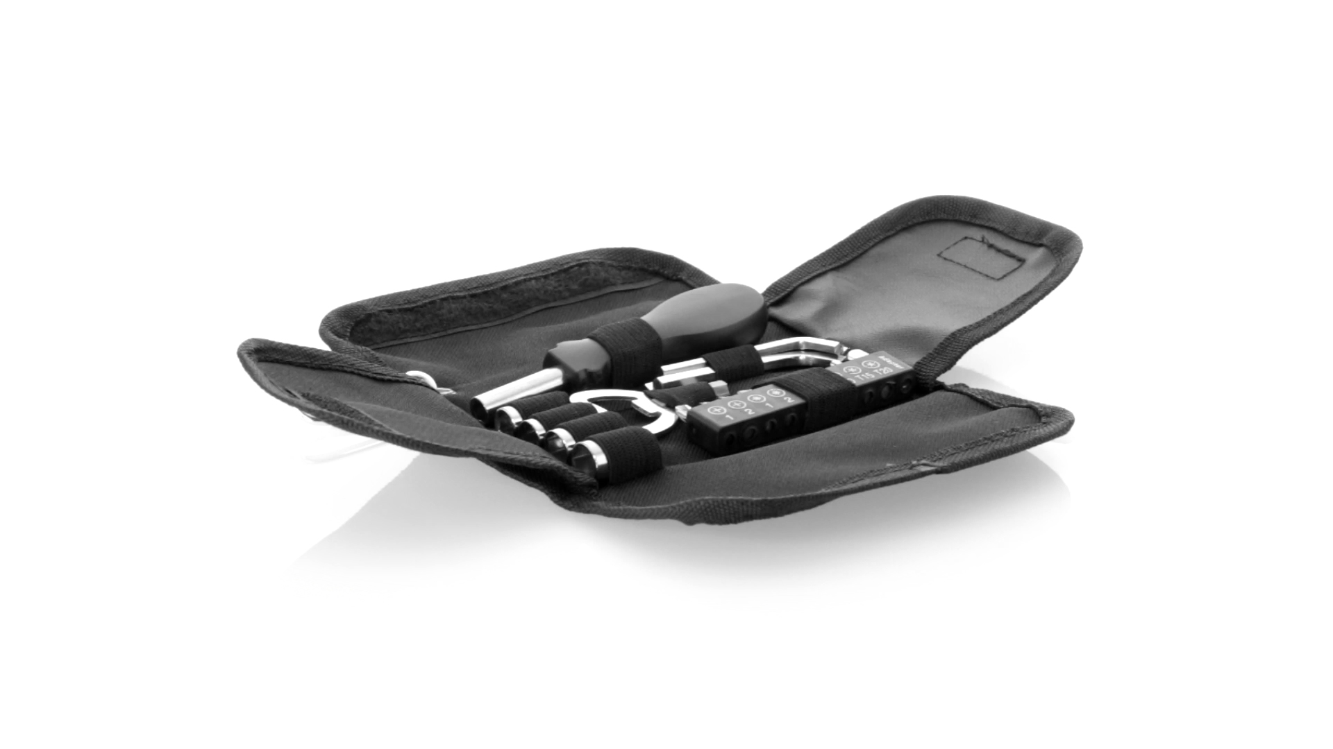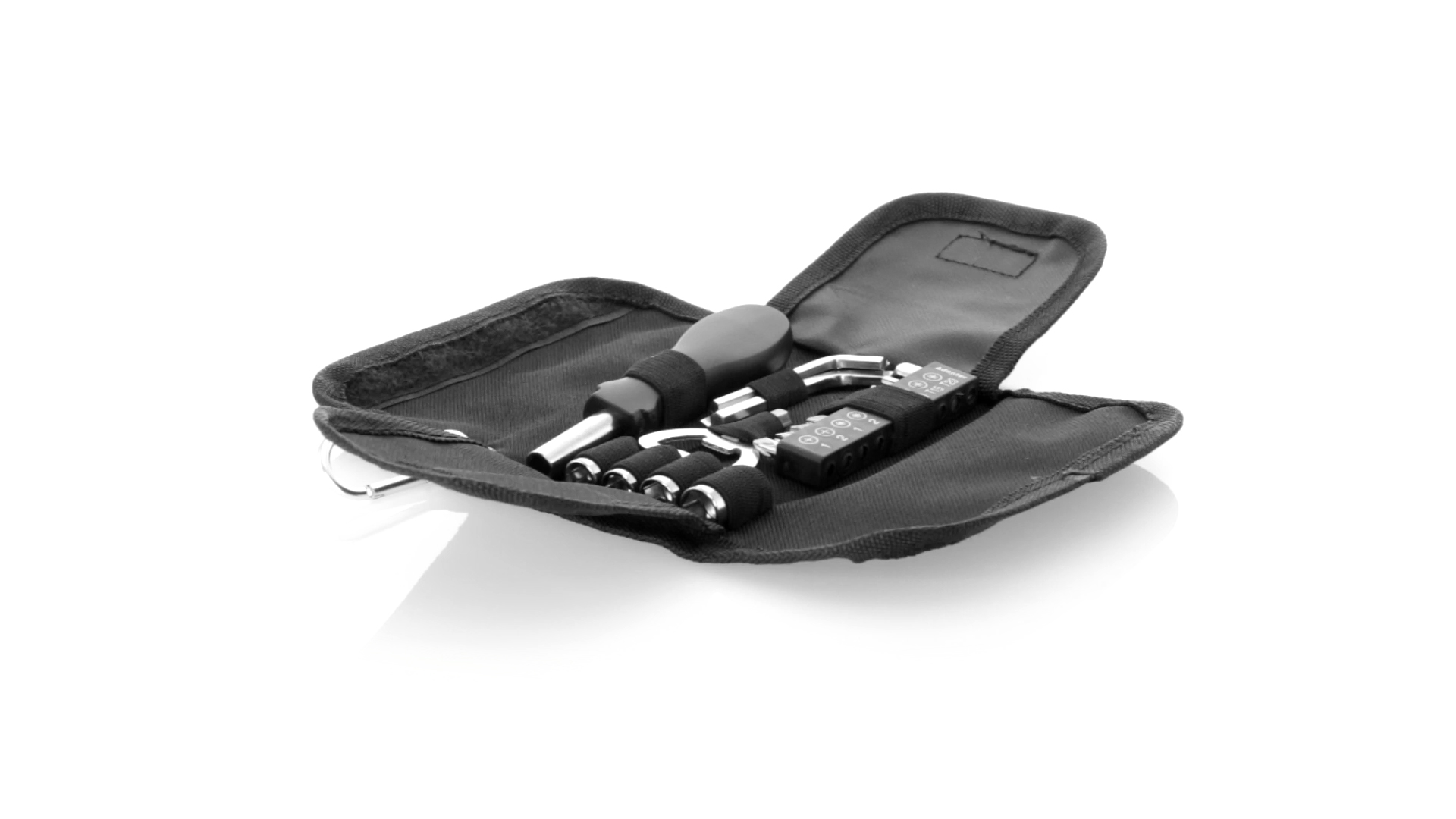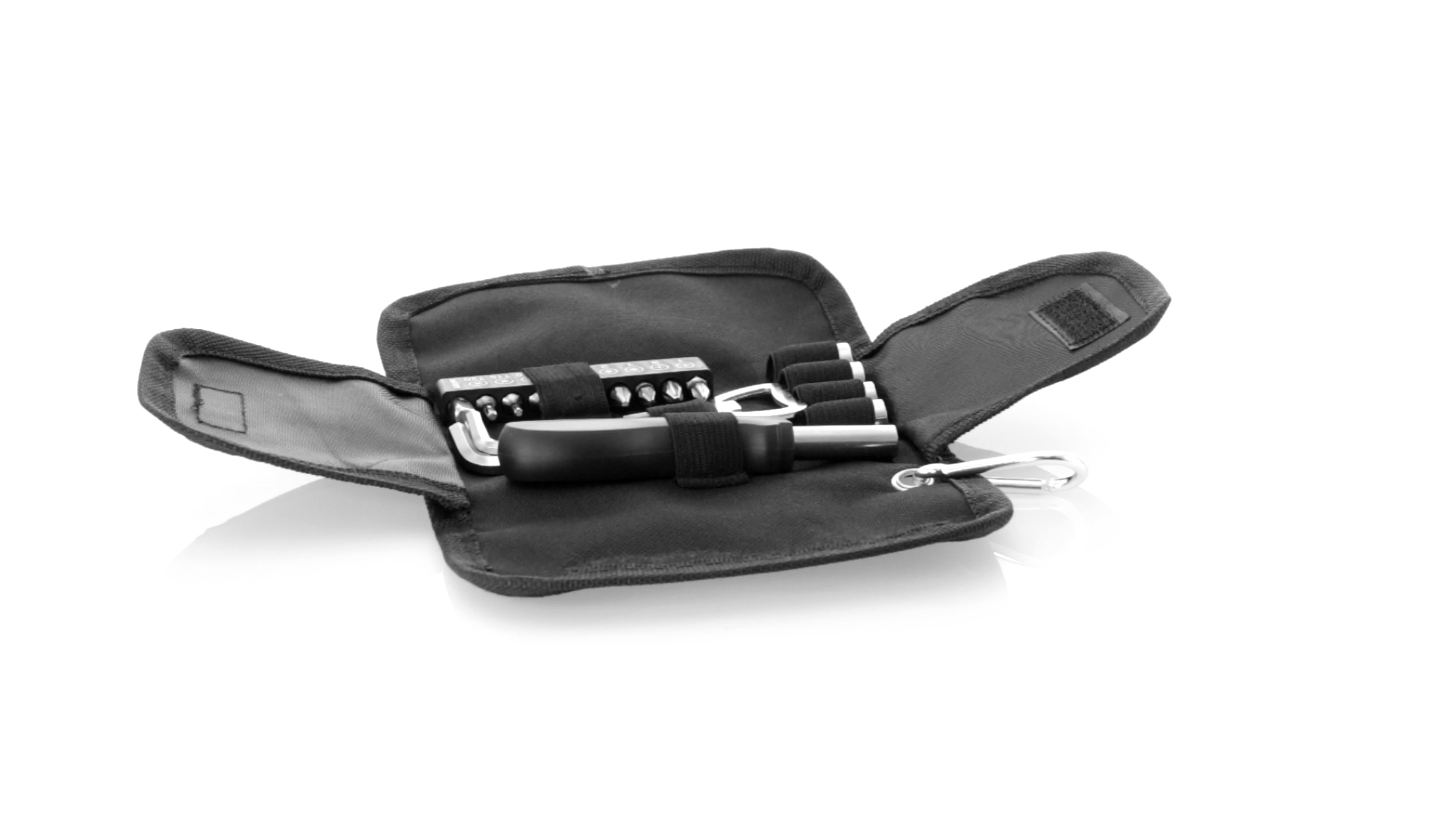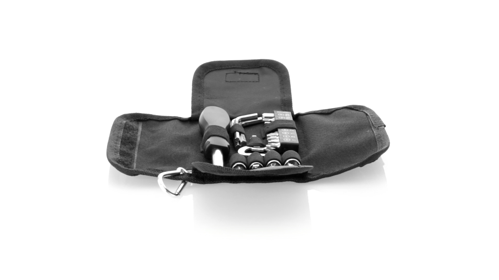19-teiliges Werkzeugset in robustem Polyester-Etui mit Reissverschluss und Metallkarabiner. Enthält Befestigungswerkzeug, Schraubendreherköpfe (Schlitz, Kreuz und Torx), Schraubenschlüssel, verschiedene Inbusschlüssel und Öffner.