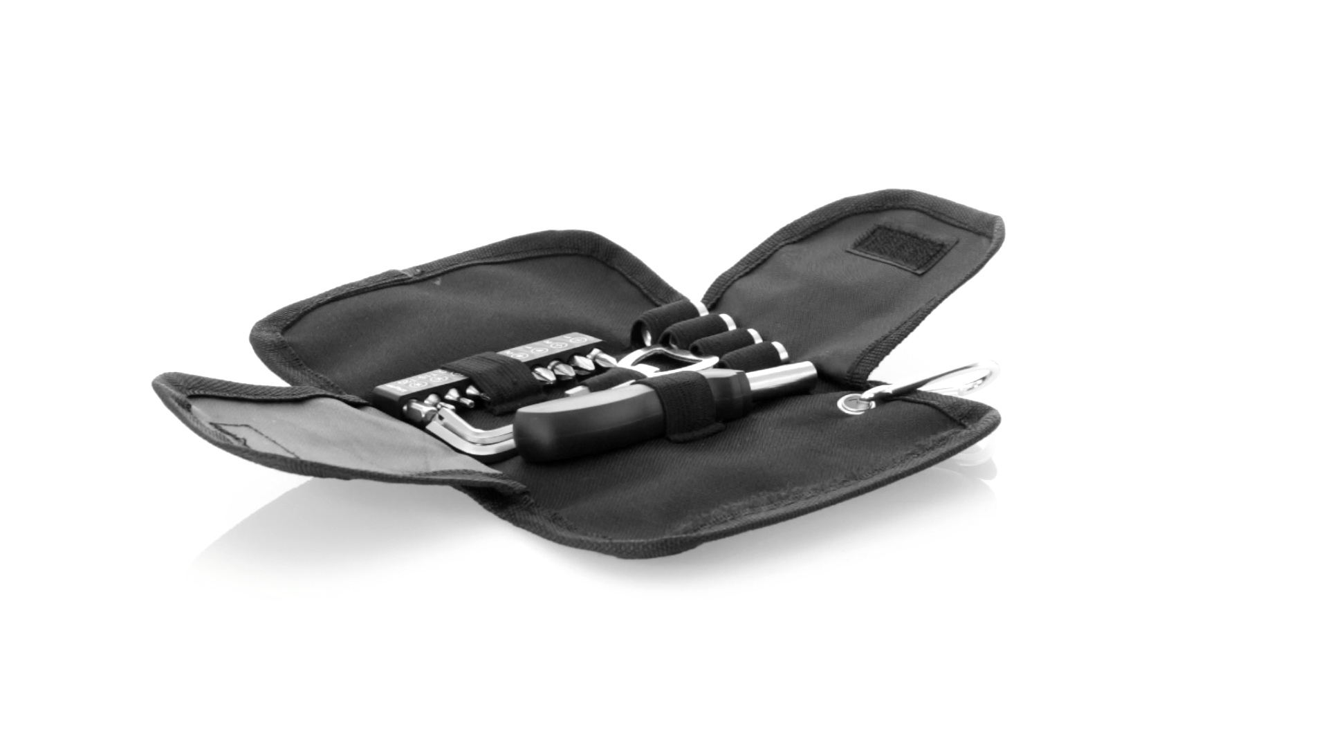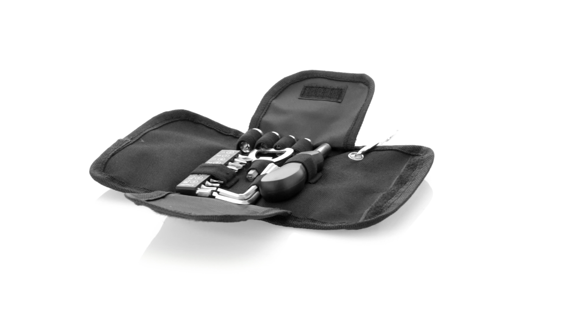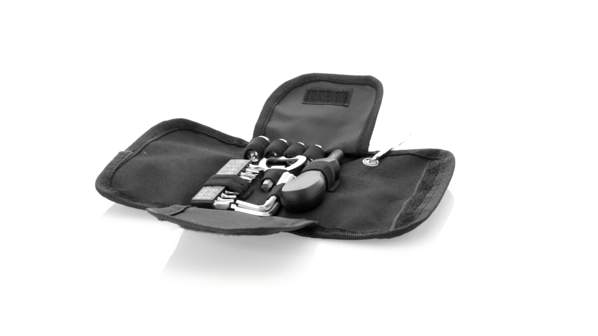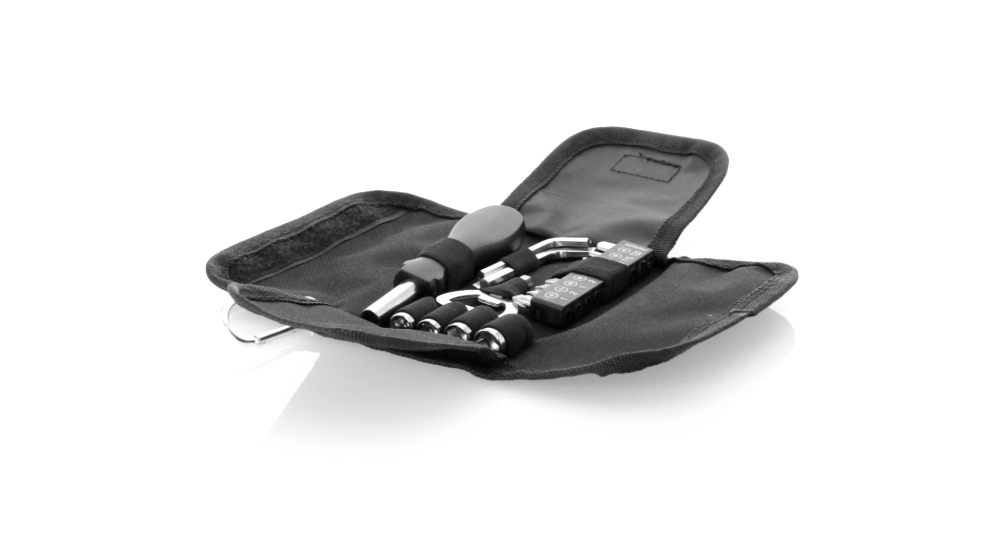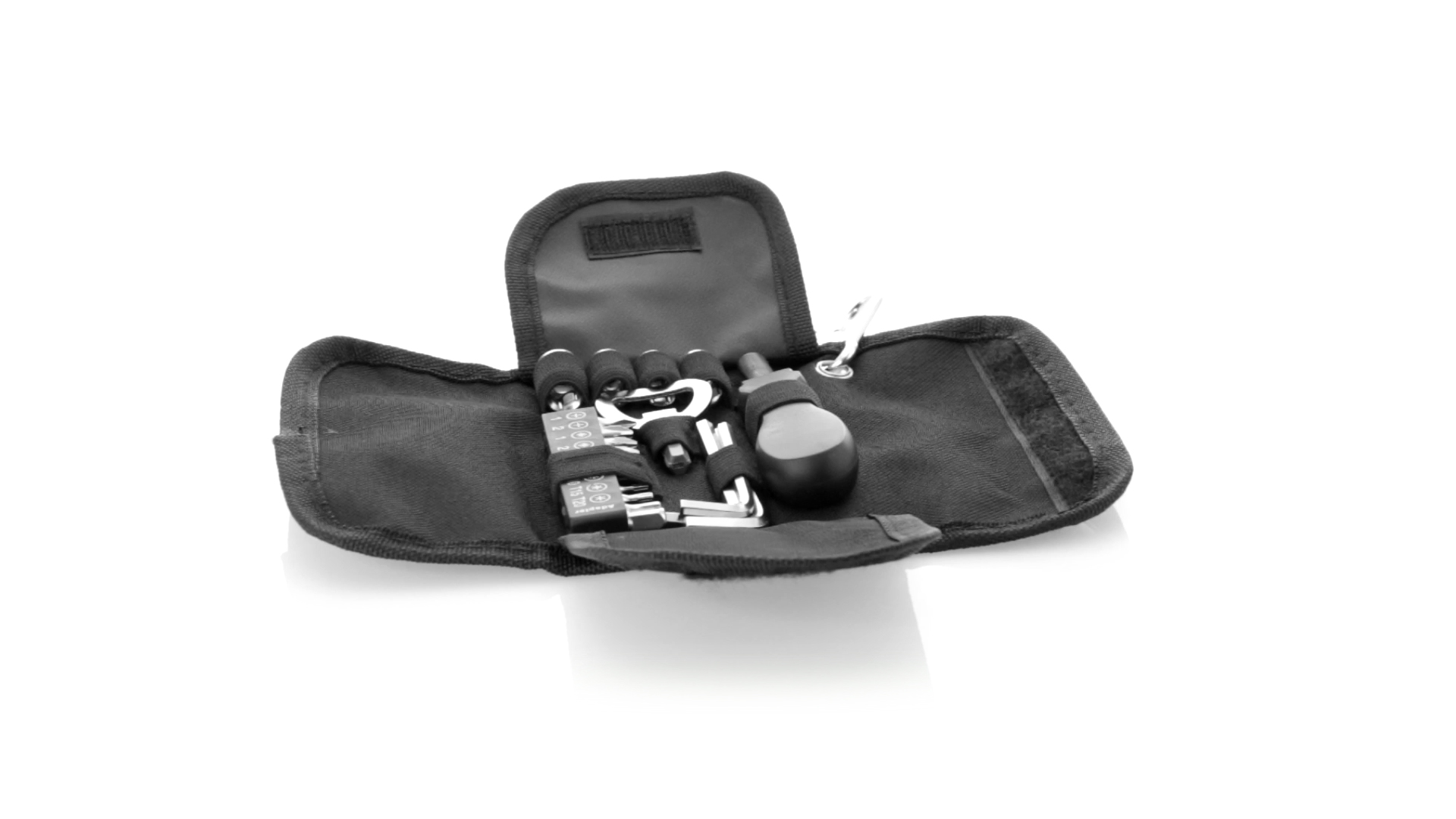 19-teiliges Werkzeugset in robustem Polyester-Etui mit Reissverschluss und Metallkarabiner. Enthält Befestigungswerkzeug, Schraubendreherköpfe (Schlitz, Kreuz und Torx), Schraubenschlüssel, verschiedene Inbusschlüssel und Öffner.