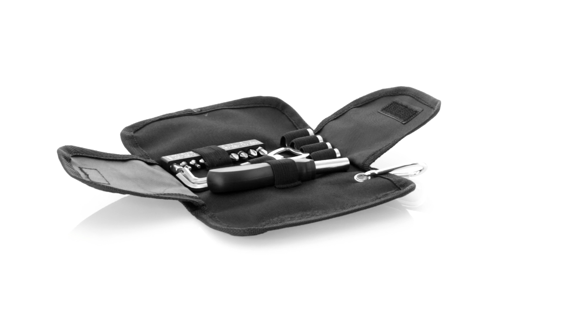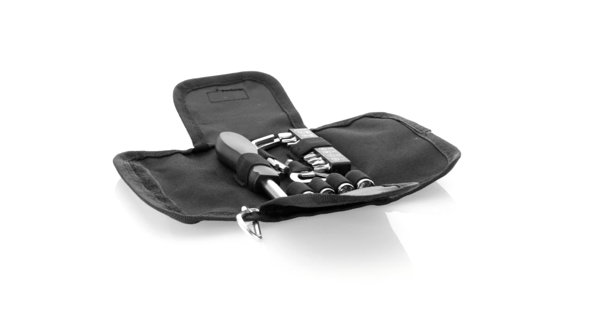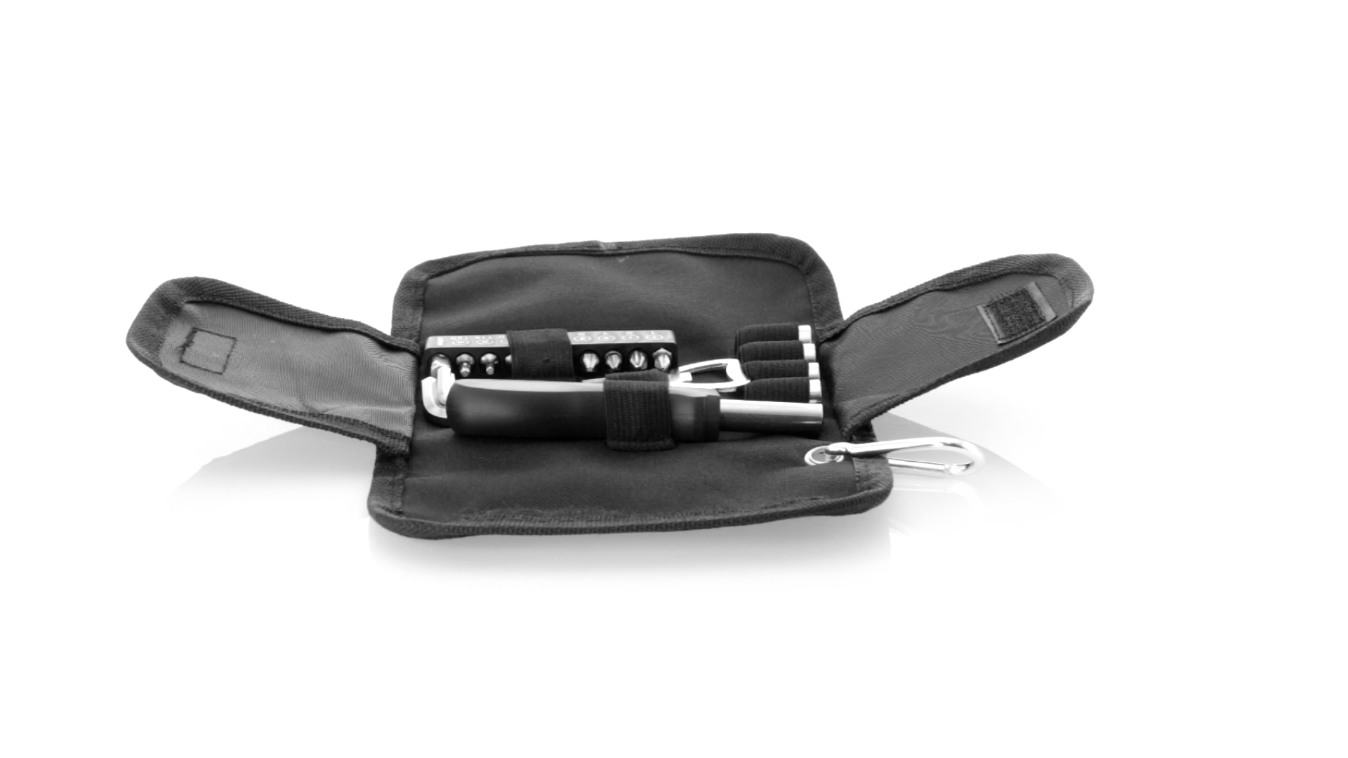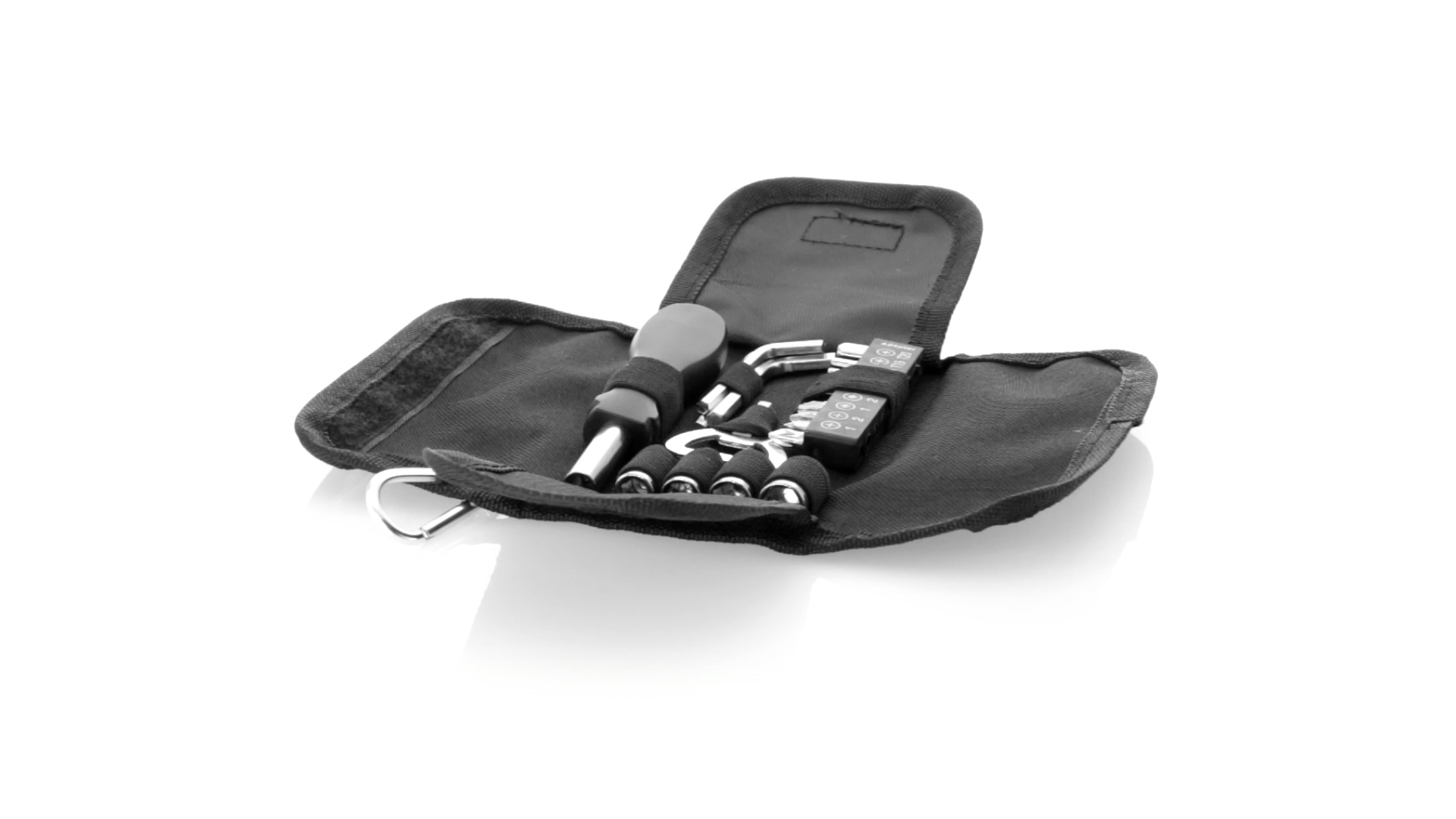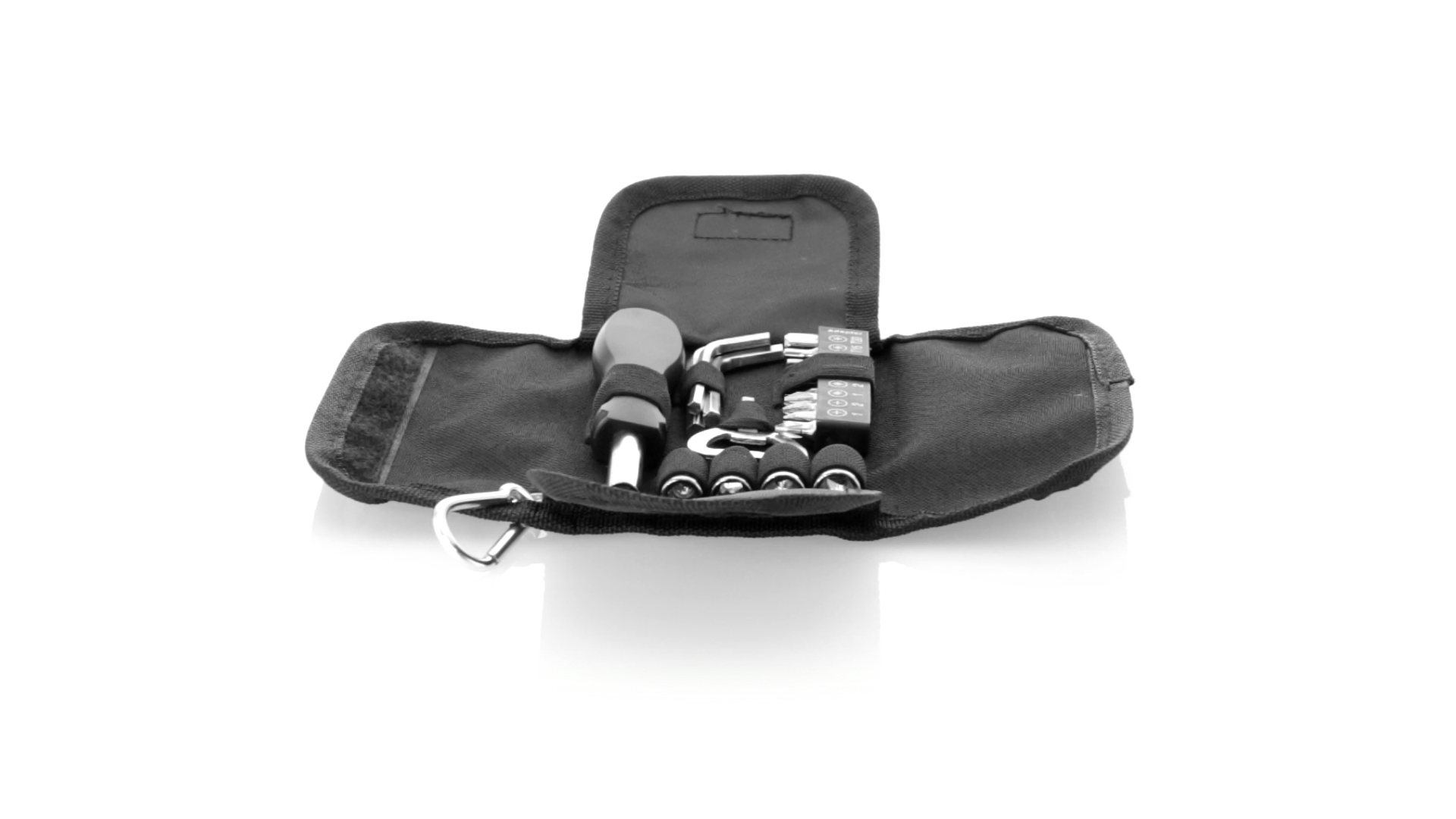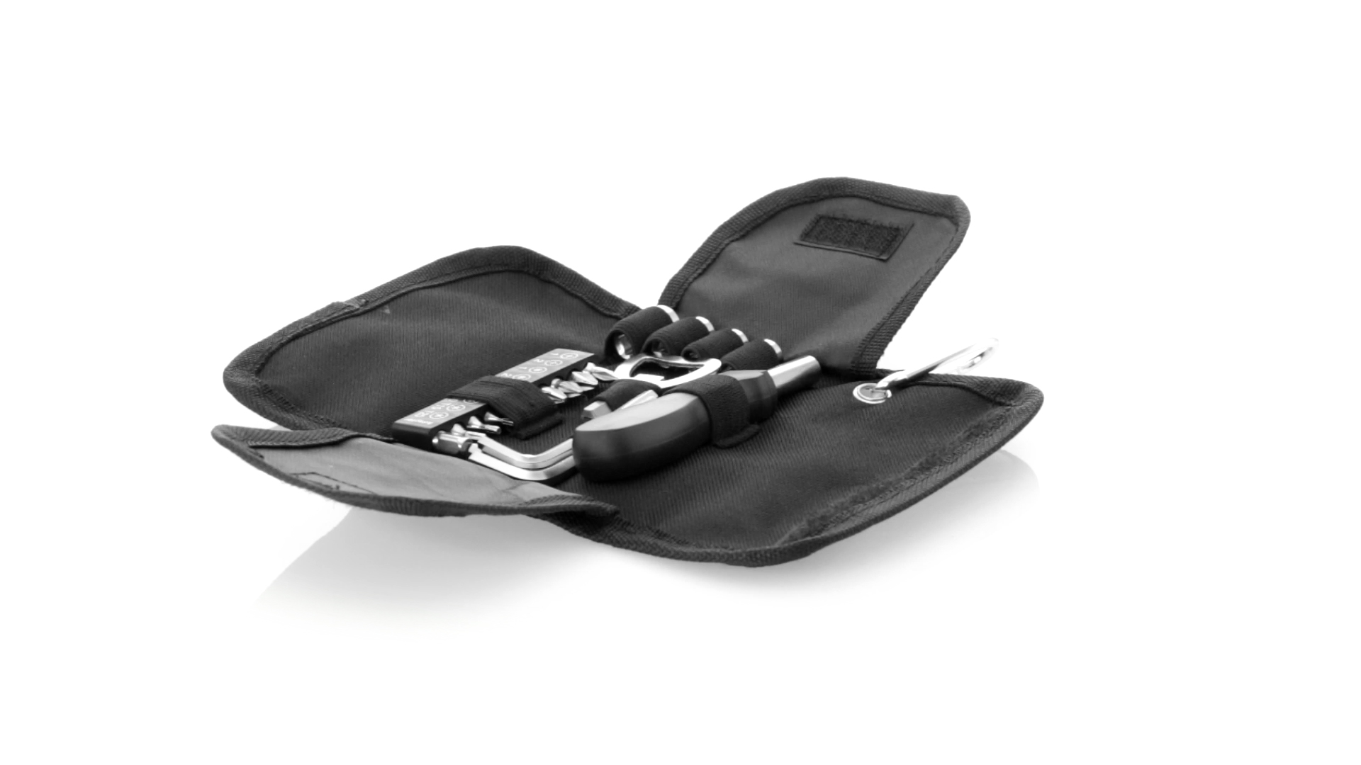 19-teiliges Werkzeugset in robustem Polyester-Etui mit Reissverschluss und Metallkarabiner. Enthält Befestigungswerkzeug, Schraubendreherköpfe (Schlitz, Kreuz und Torx), Schraubenschlüssel, verschiedene Inbusschlüssel und Öffner.
