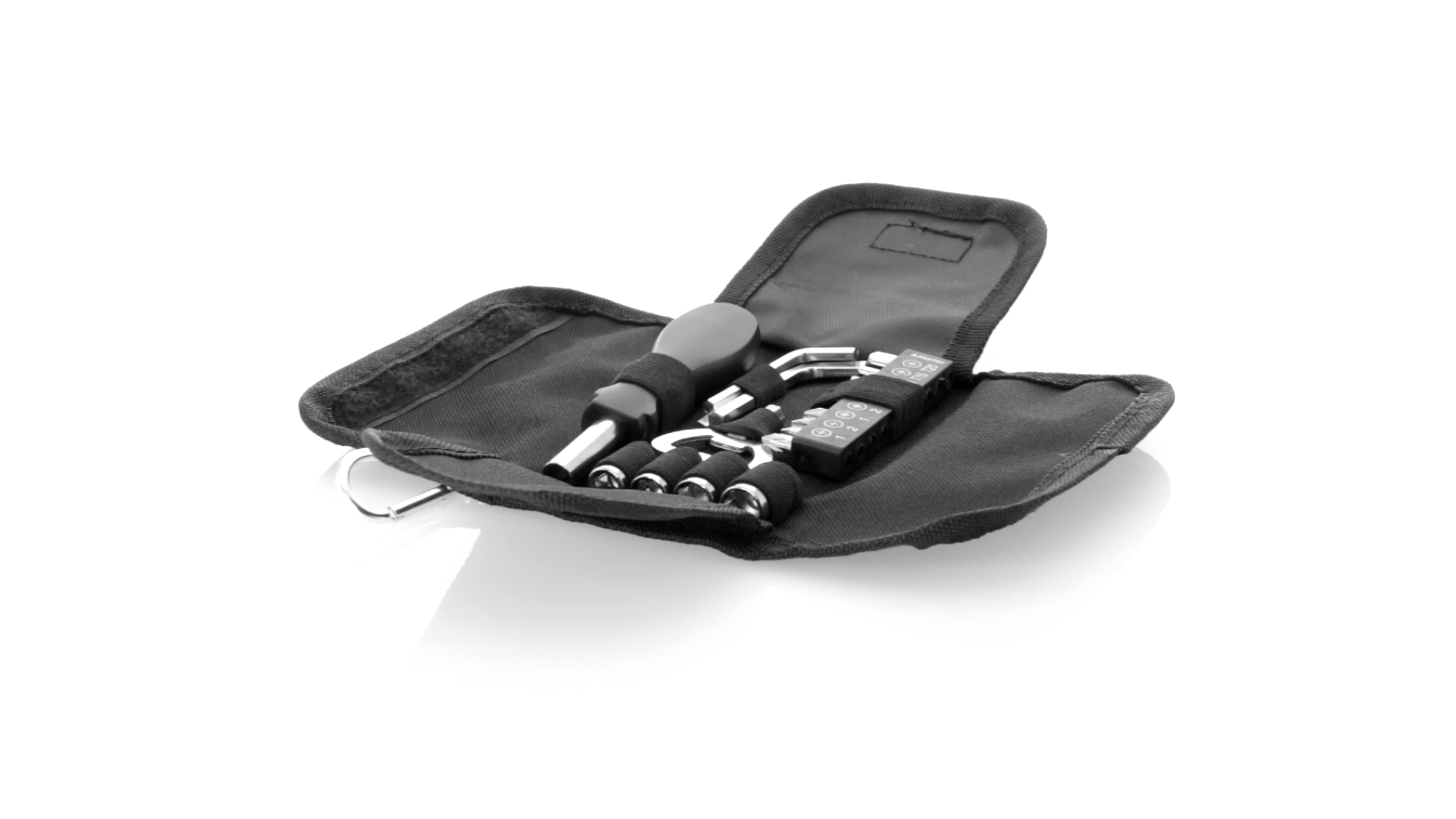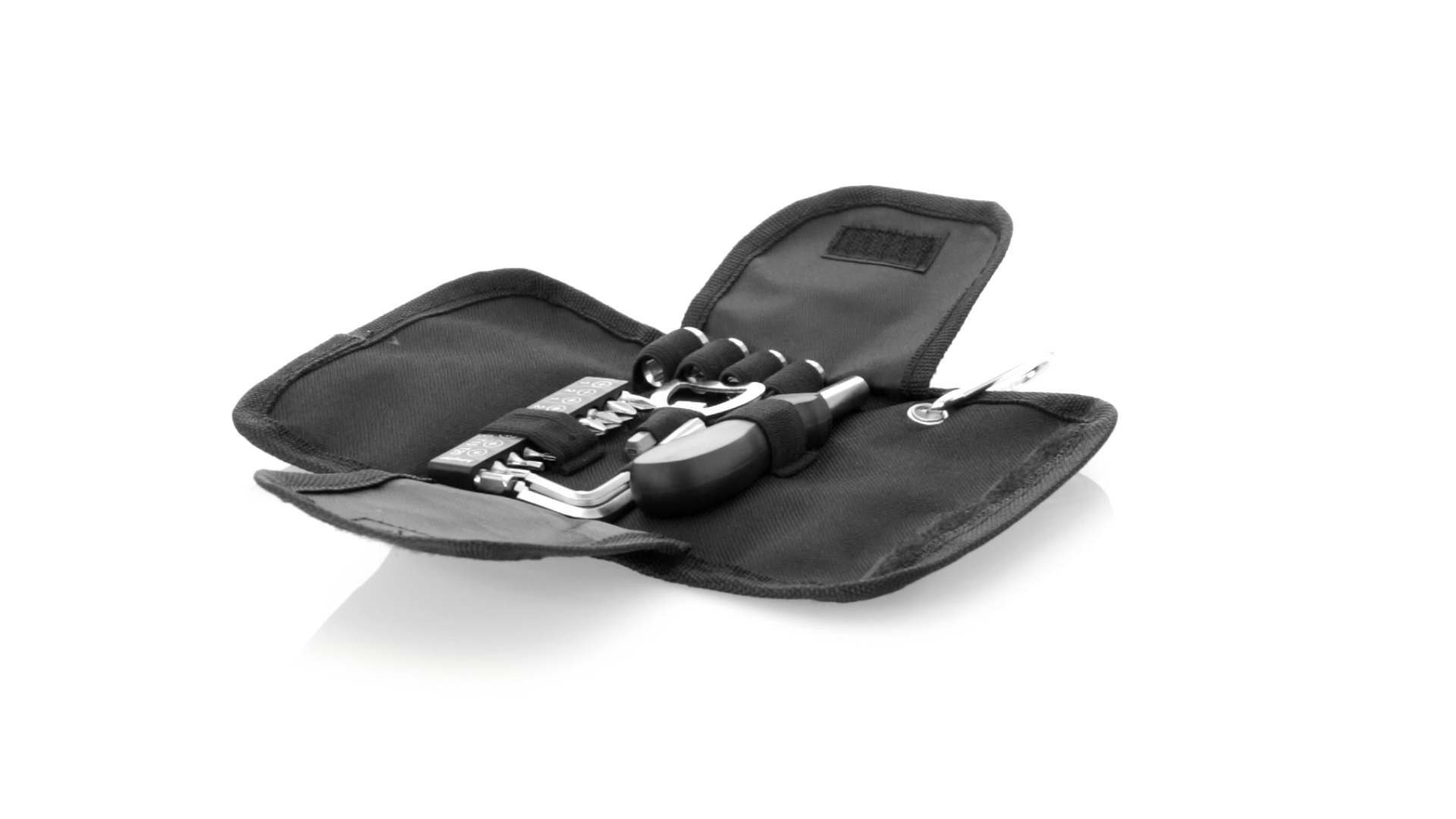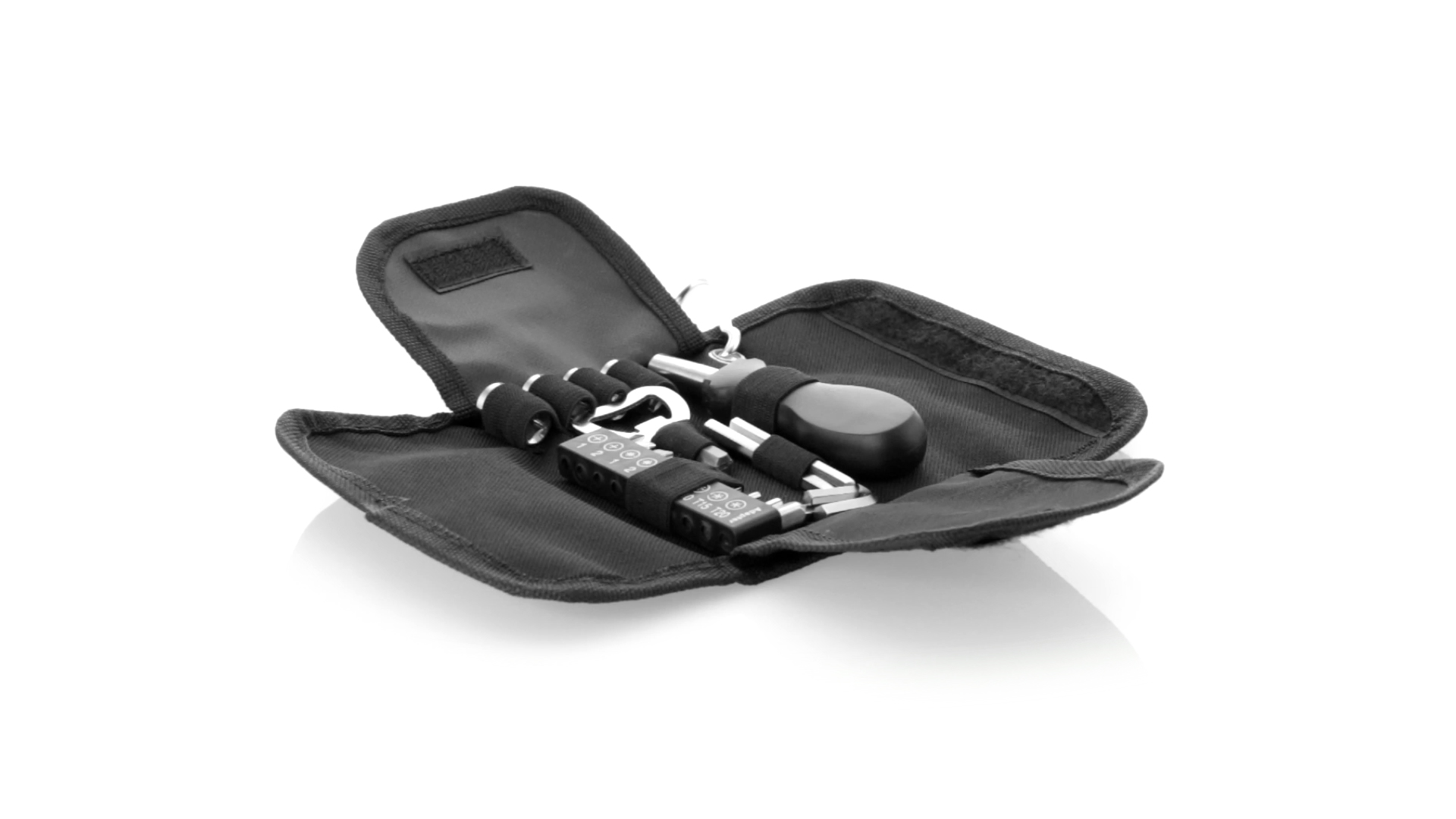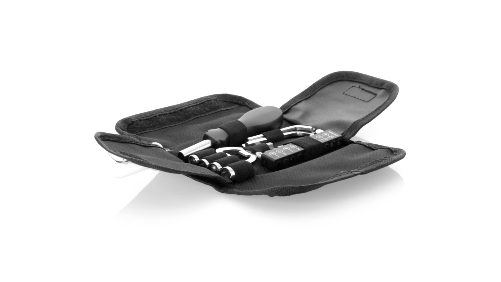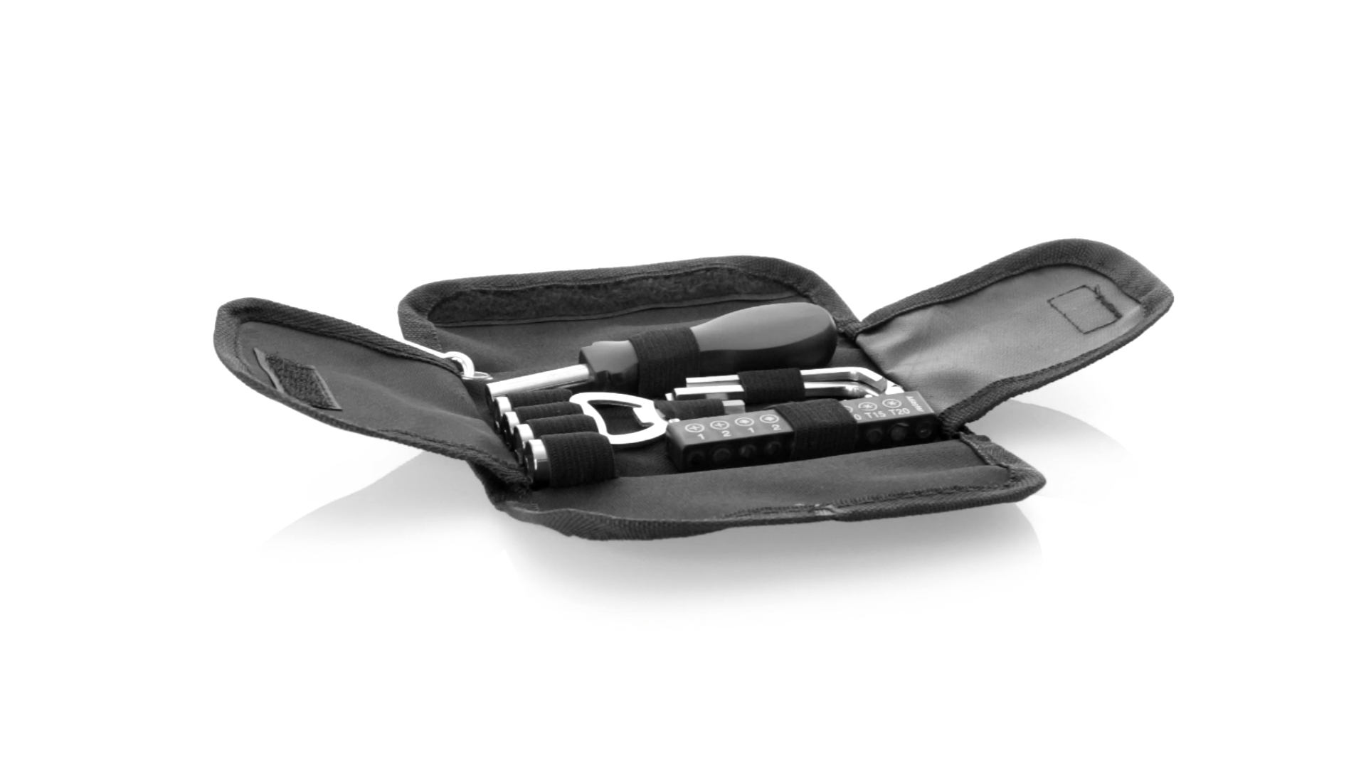 19-teiliges Werkzeugset in robustem Polyester-Etui mit Reissverschluss und Metallkarabiner. Enthält Befestigungswerkzeug, Schraubendreherköpfe (Schlitz, Kreuz und Torx), Schraubenschlüssel, verschiedene Inbusschlüssel und Öffner.