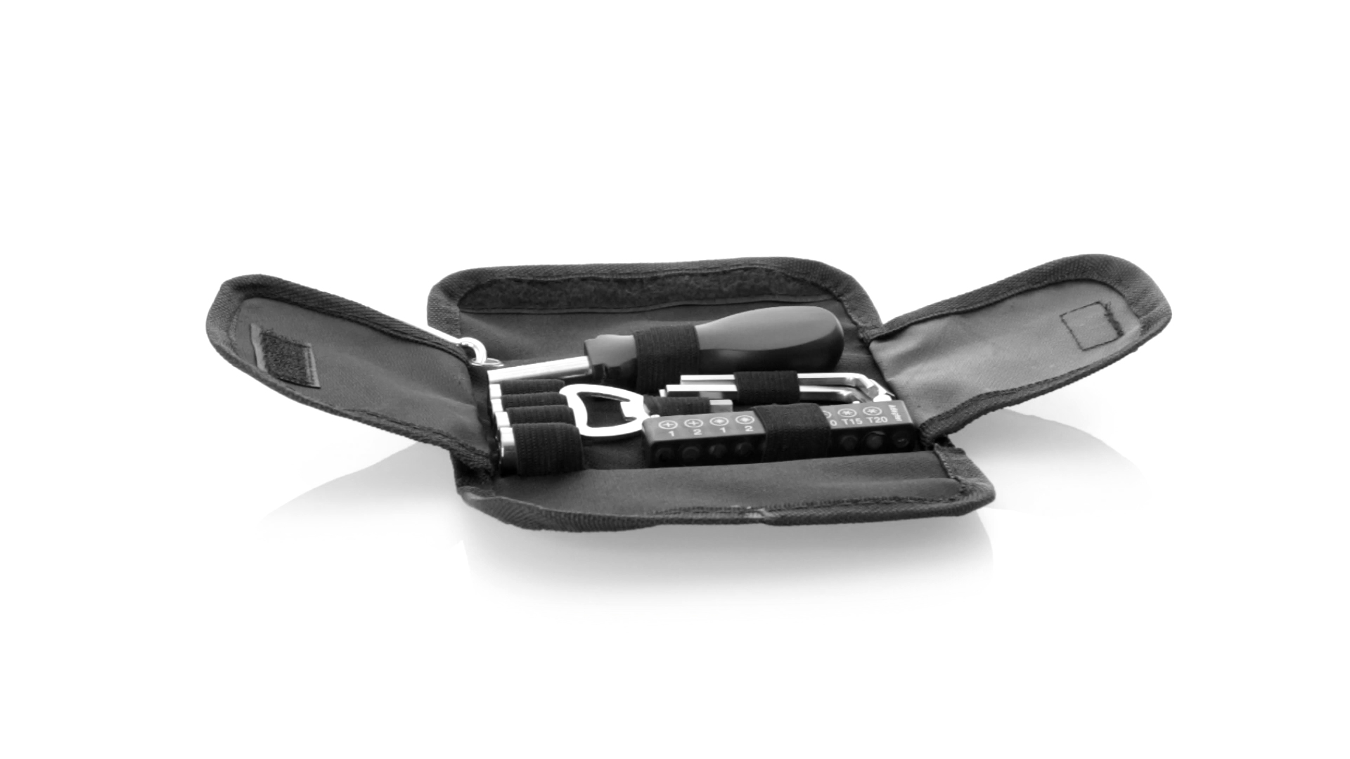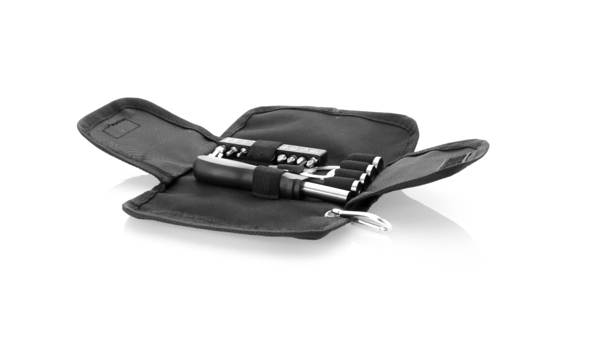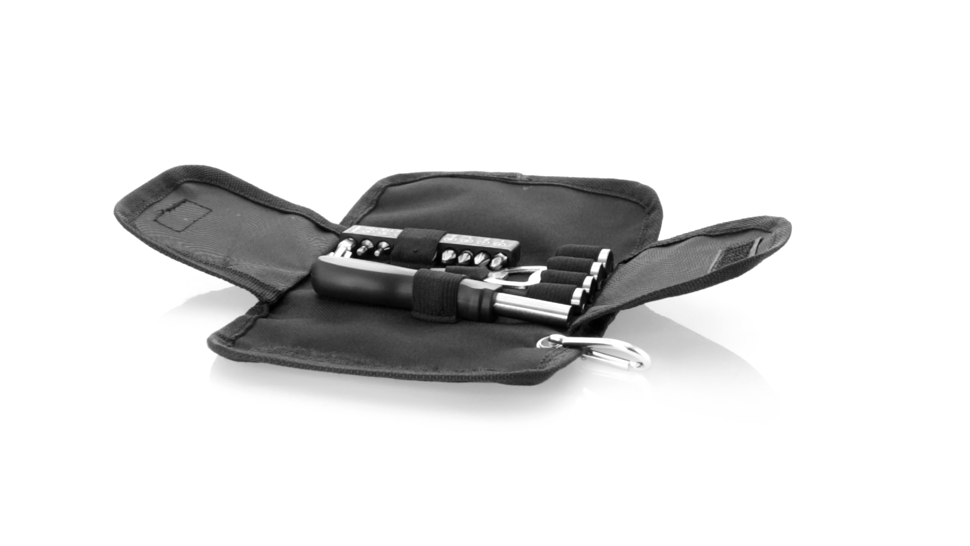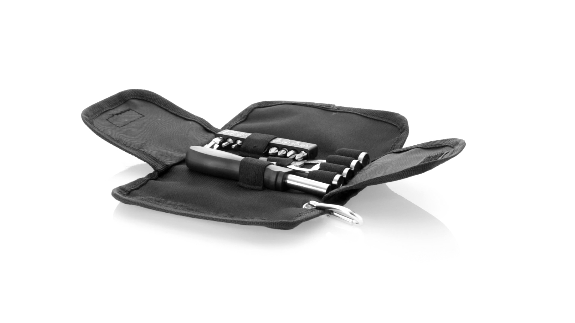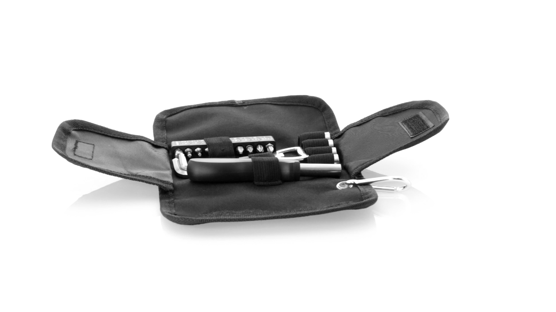 19-teiliges Werkzeugset in robustem Polyester-Etui mit Reissverschluss und Metallkarabiner. Enthält Befestigungswerkzeug, Schraubendreherköpfe (Schlitz, Kreuz und Torx), Schraubenschlüssel, verschiedene Inbusschlüssel und Öffner.
