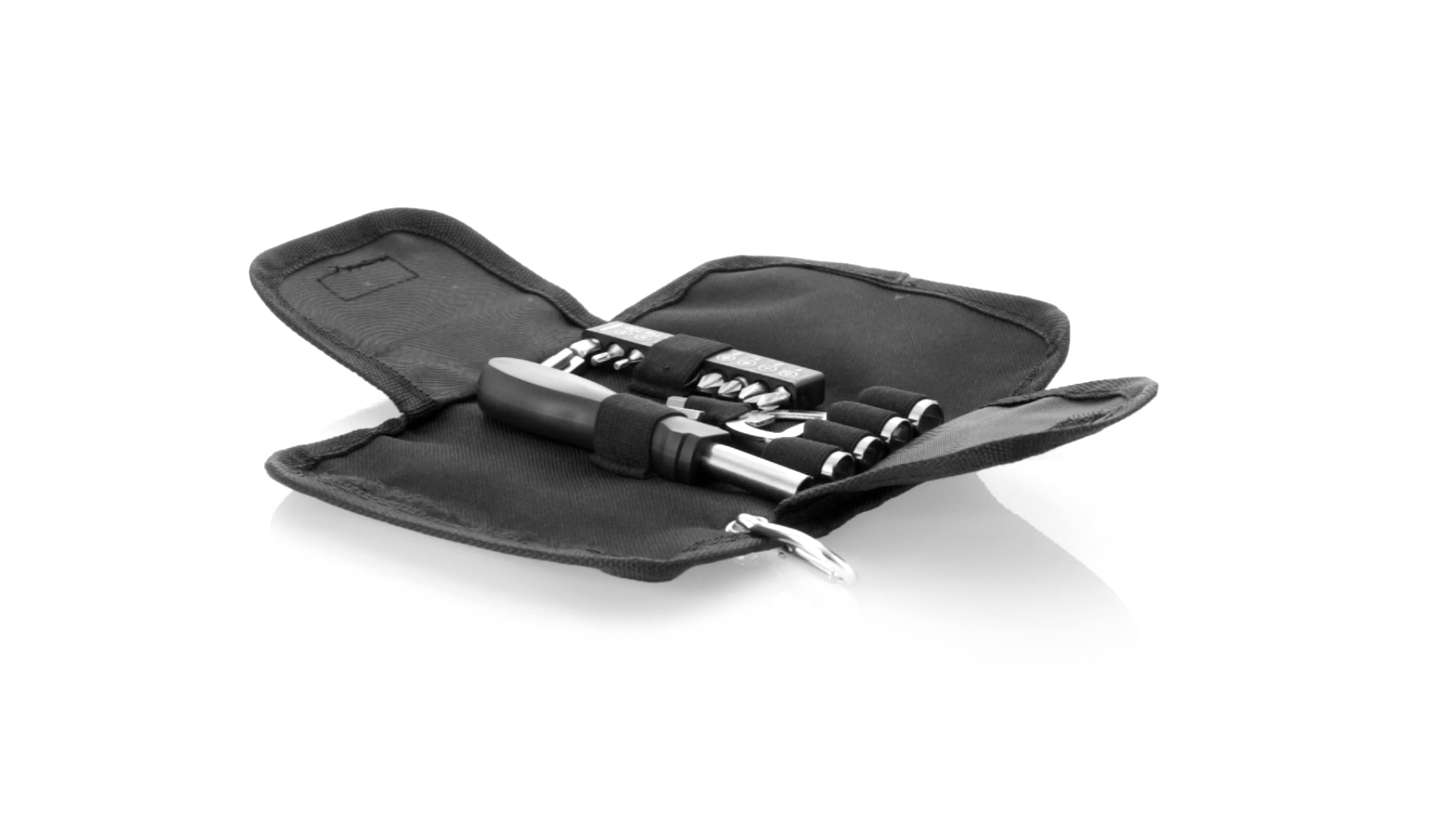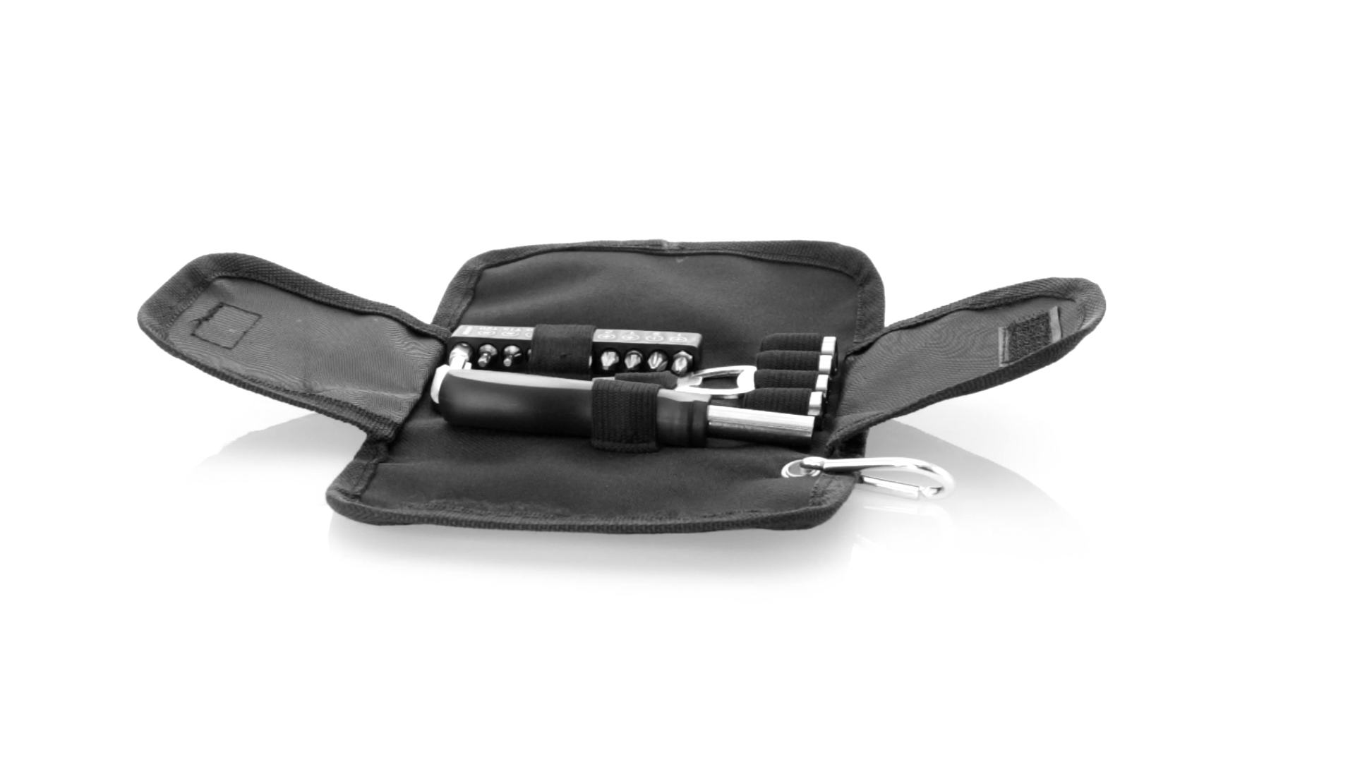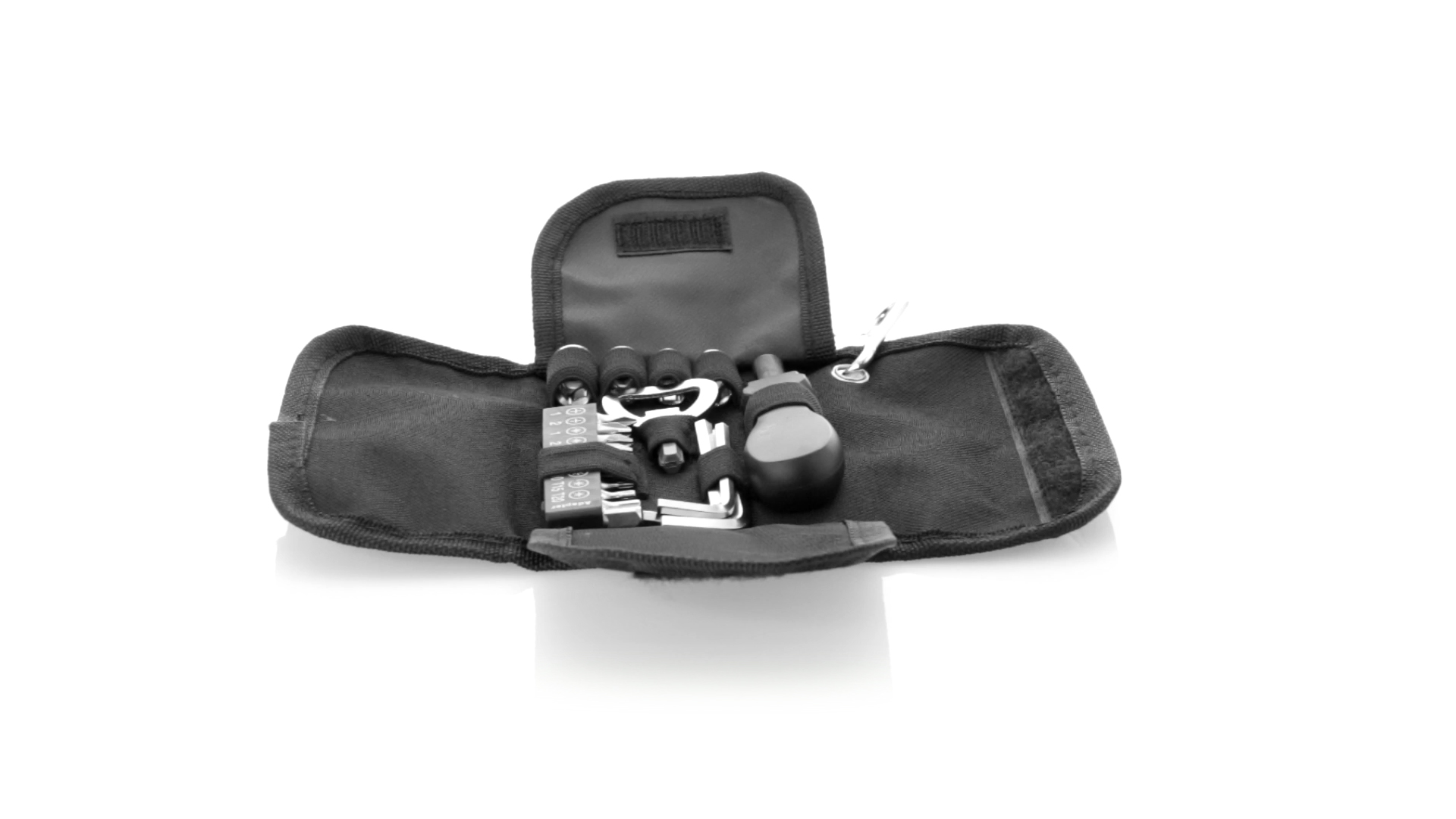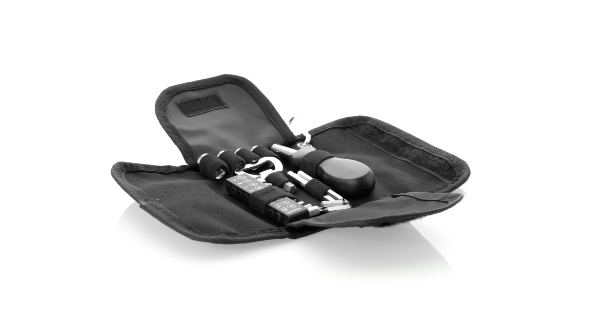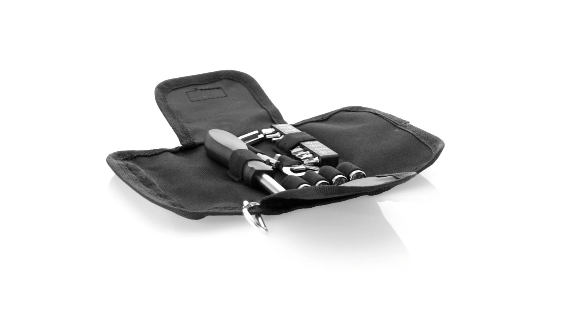 19-teiliges Werkzeugset in robustem Polyester-Etui mit Reissverschluss und Metallkarabiner. Enthält Befestigungswerkzeug, Schraubendreherköpfe (Schlitz, Kreuz und Torx), Schraubenschlüssel, verschiedene Inbusschlüssel und Öffner.