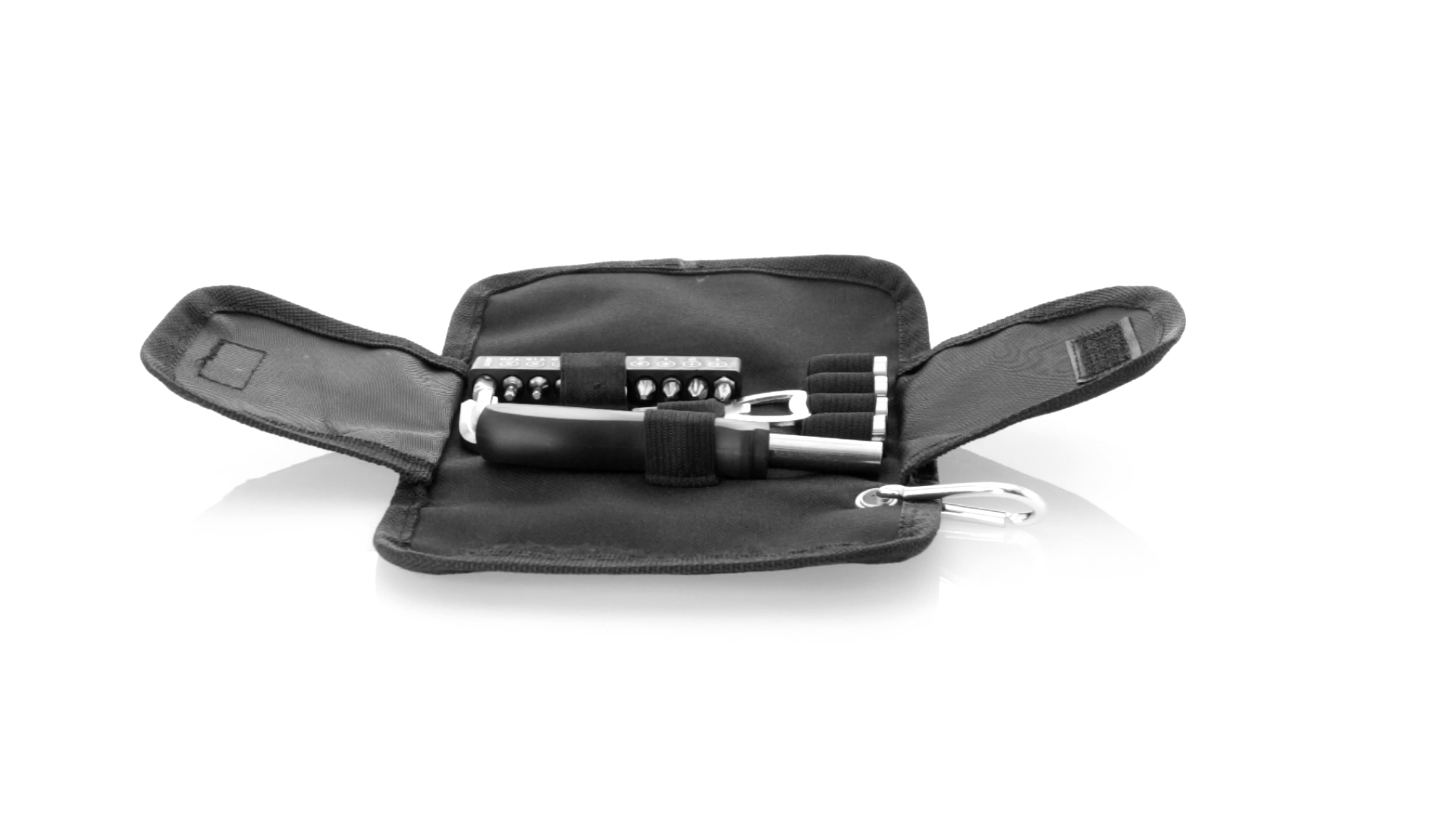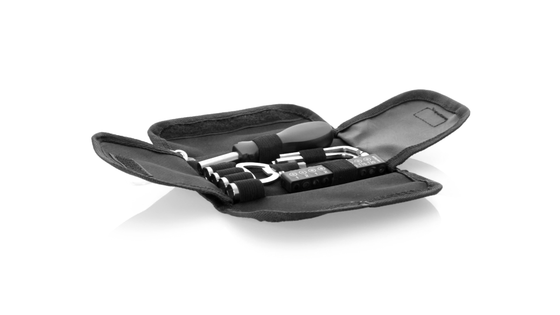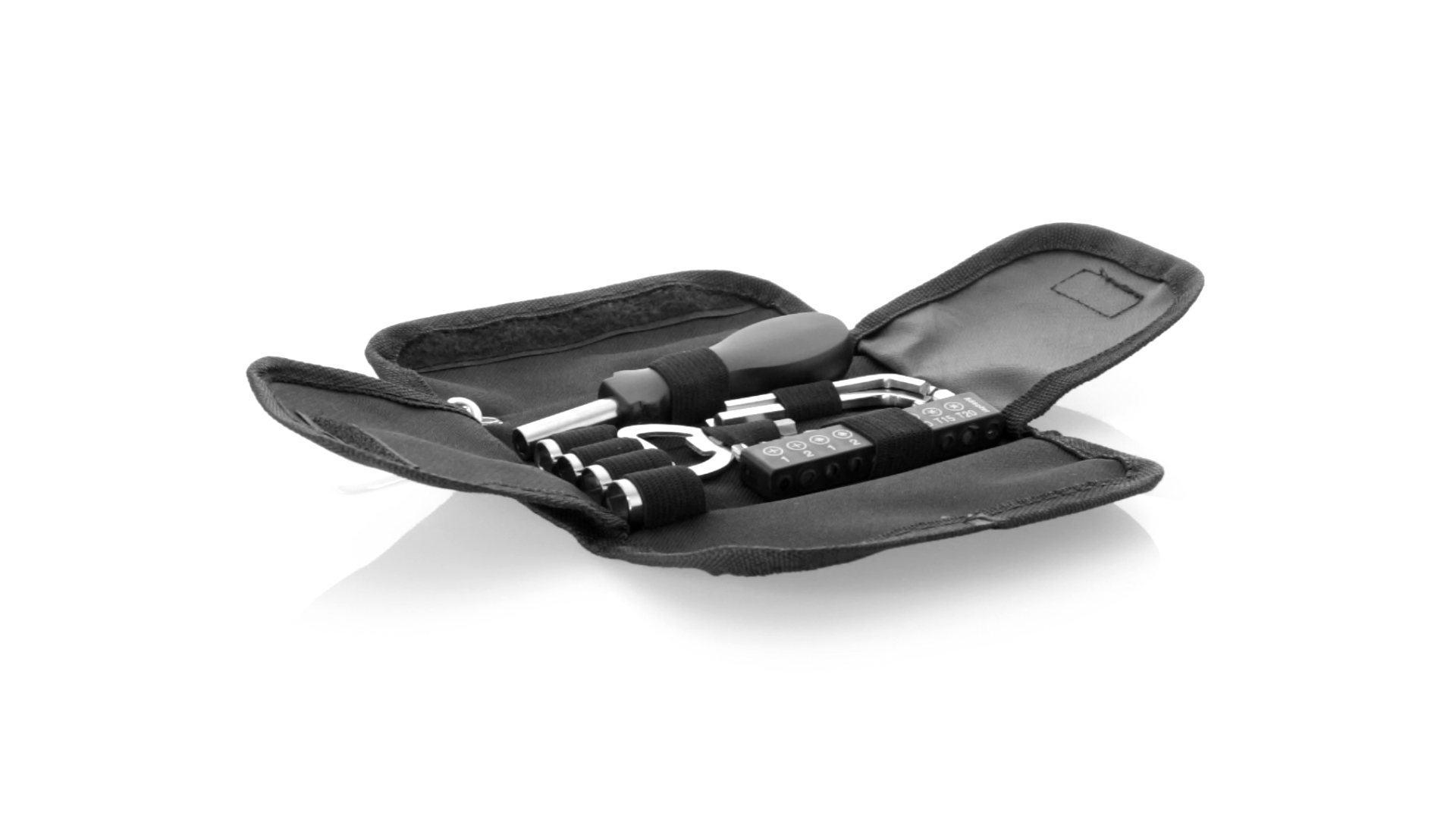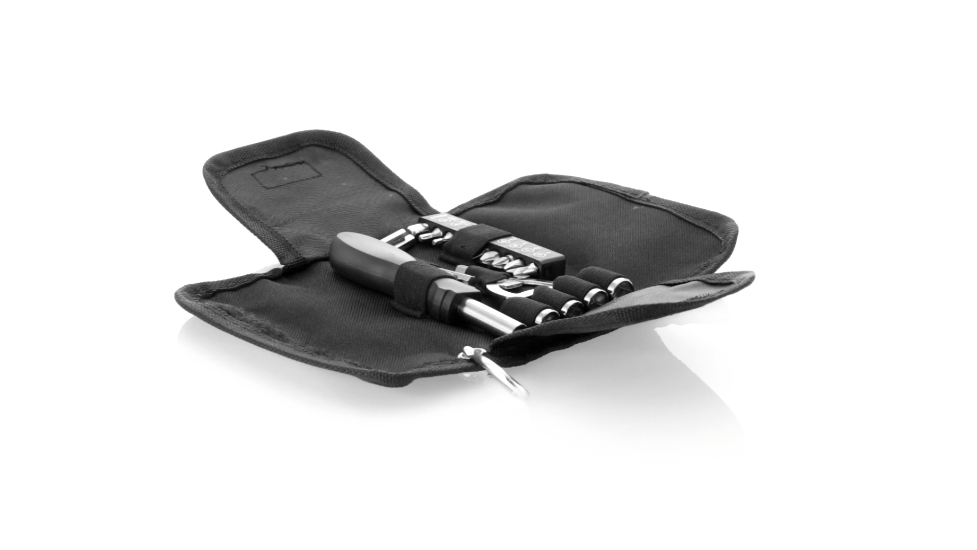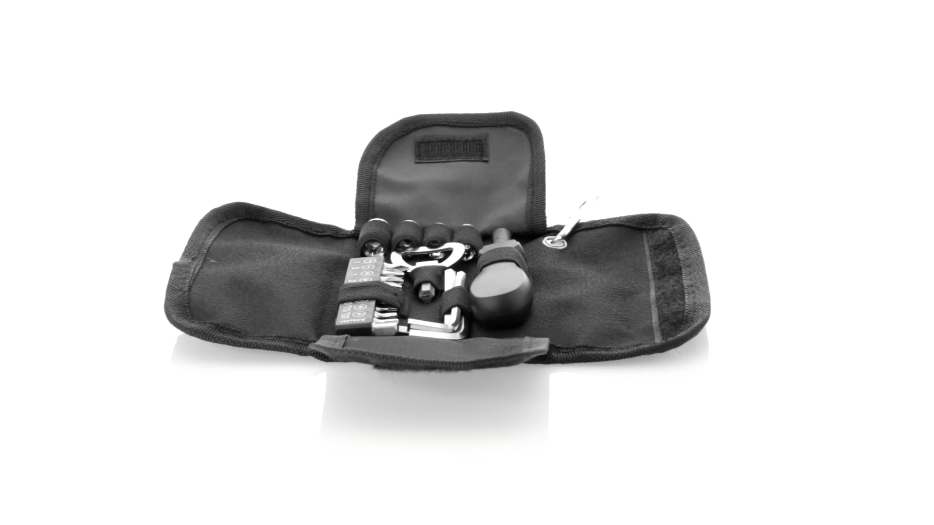 19-teiliges Werkzeugset in robustem Polyester-Etui mit Reissverschluss und Metallkarabiner. Enthält Befestigungswerkzeug, Schraubendreherköpfe (Schlitz, Kreuz und Torx), Schraubenschlüssel, verschiedene Inbusschlüssel und Öffner.