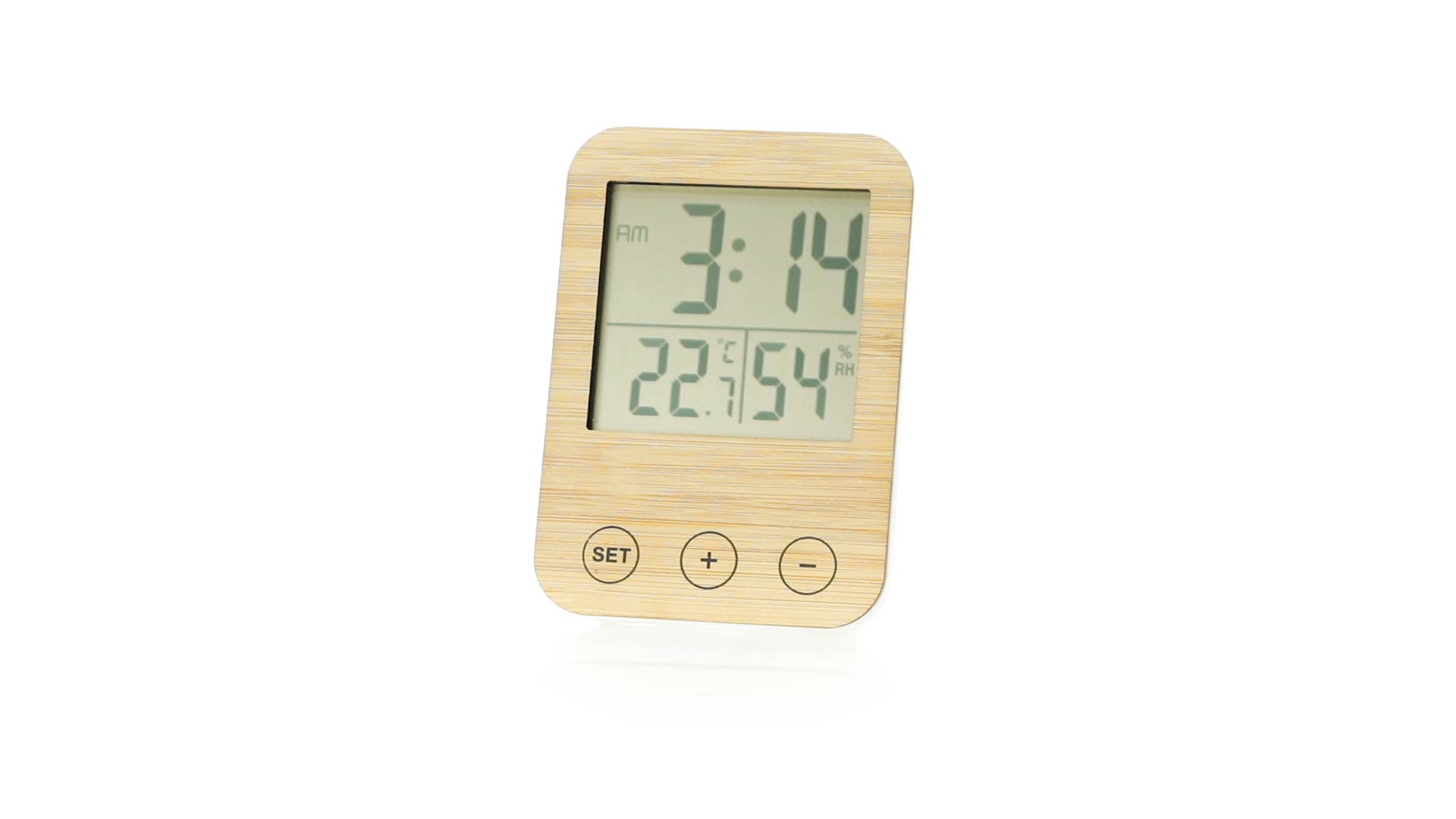 Temperaturanzeige aus der Naturlinie mit Frontplatte aus Bambus. Funktioniert als Hygrometer und Thermometer. Batteriebetrieben (2xAAA nicht enthalten), präsentiert in einer attraktiven, individuellen Öko-Design-Box.