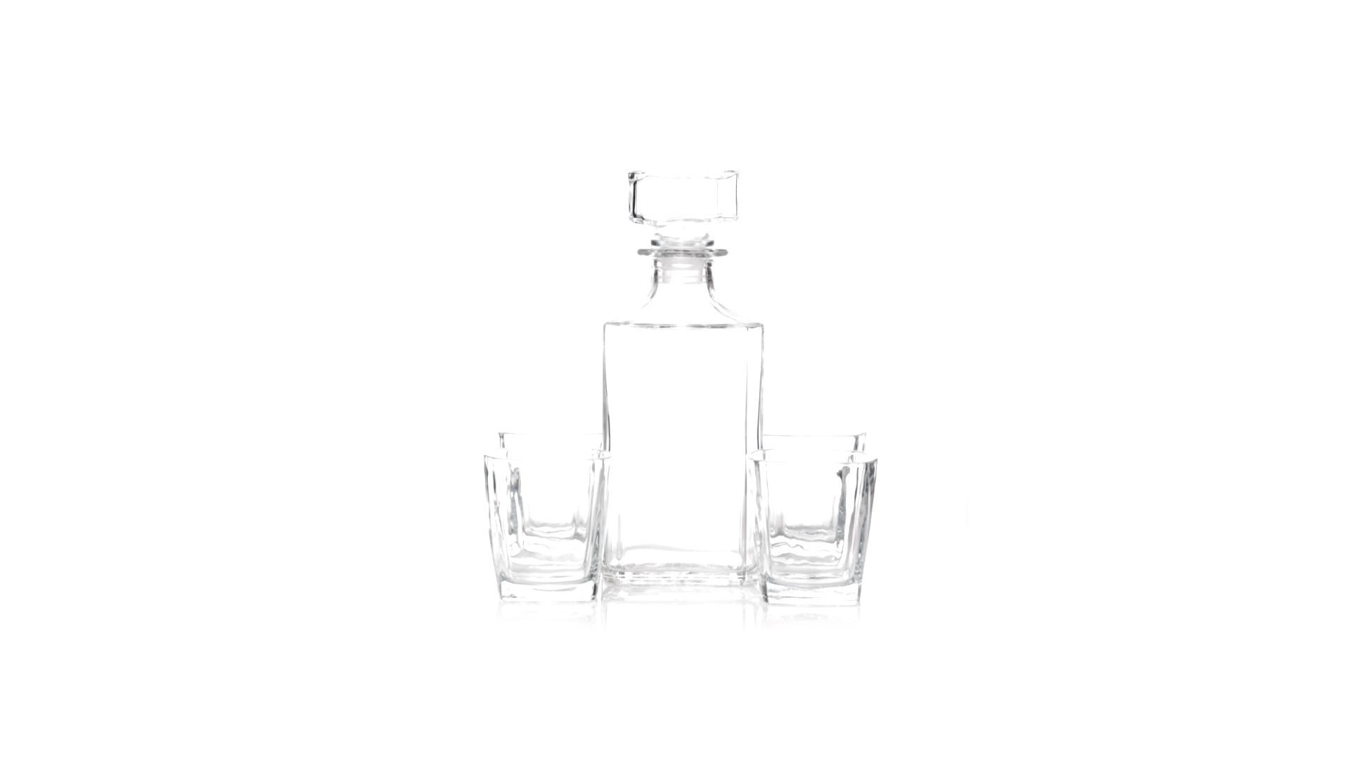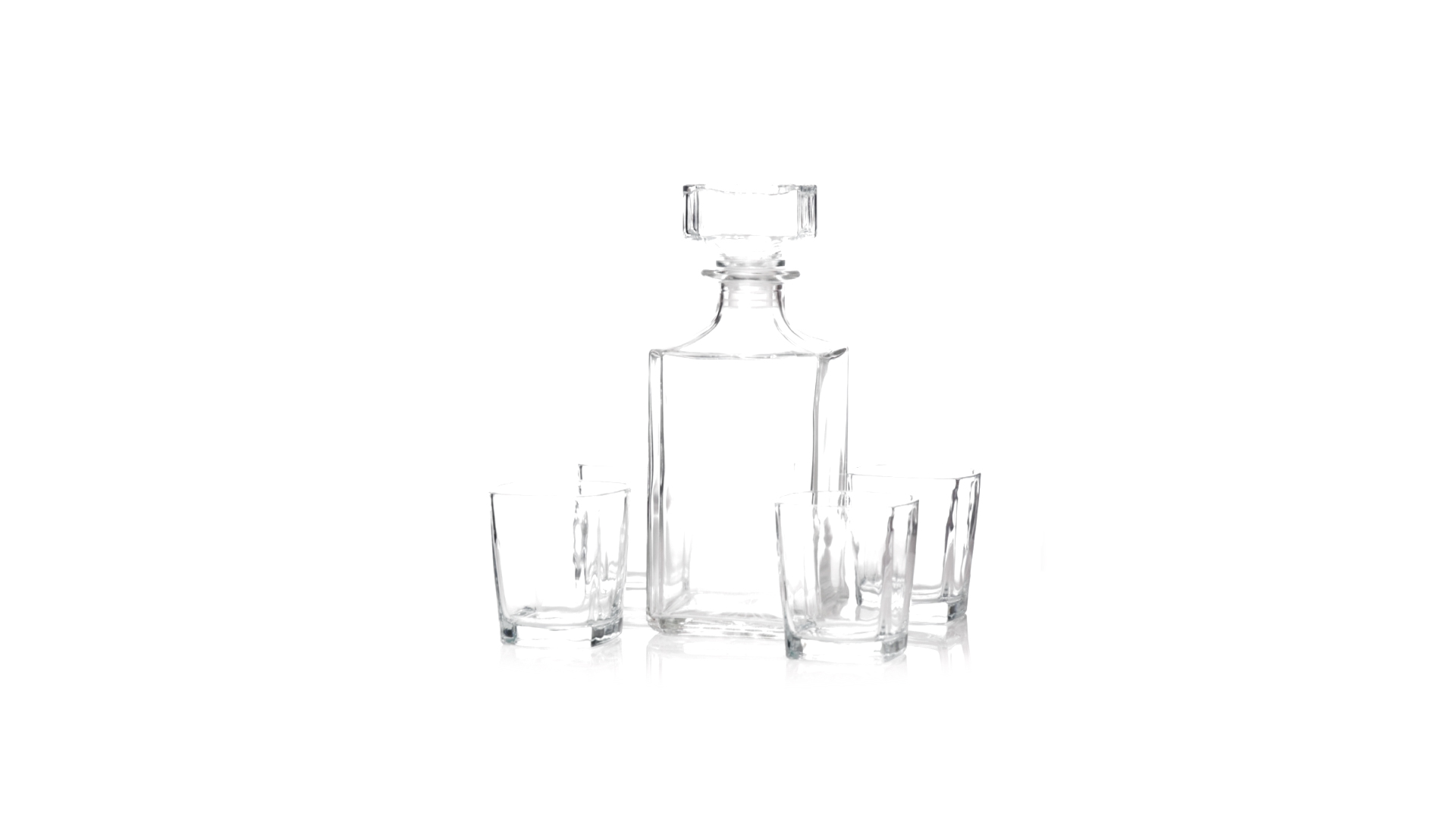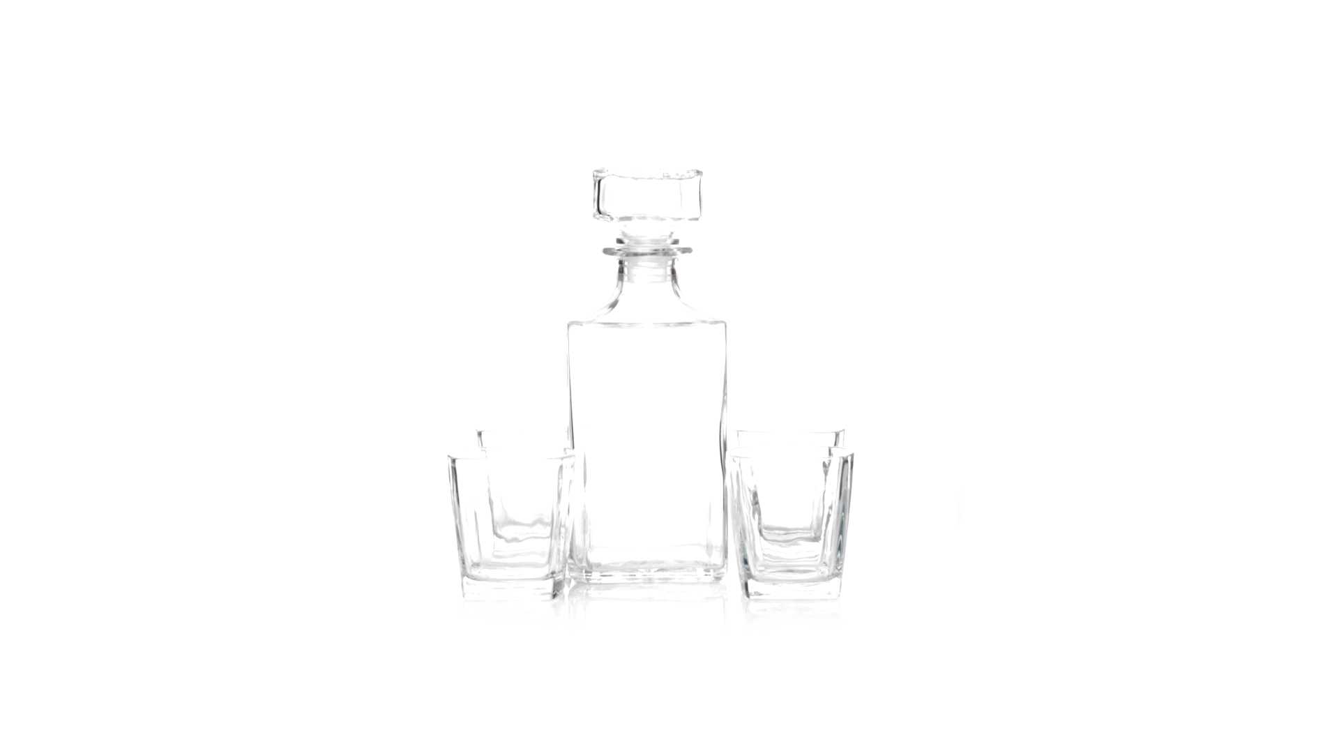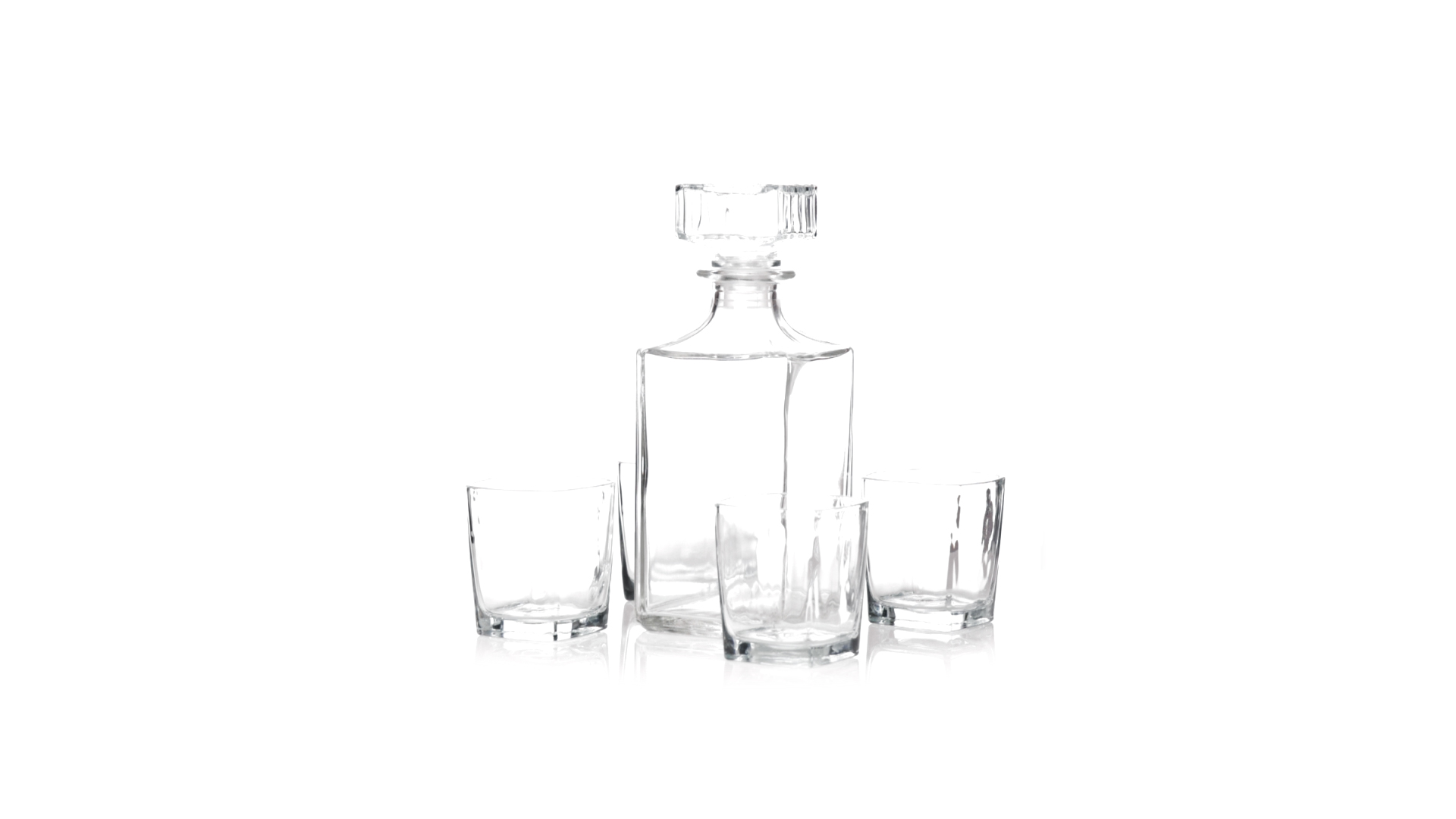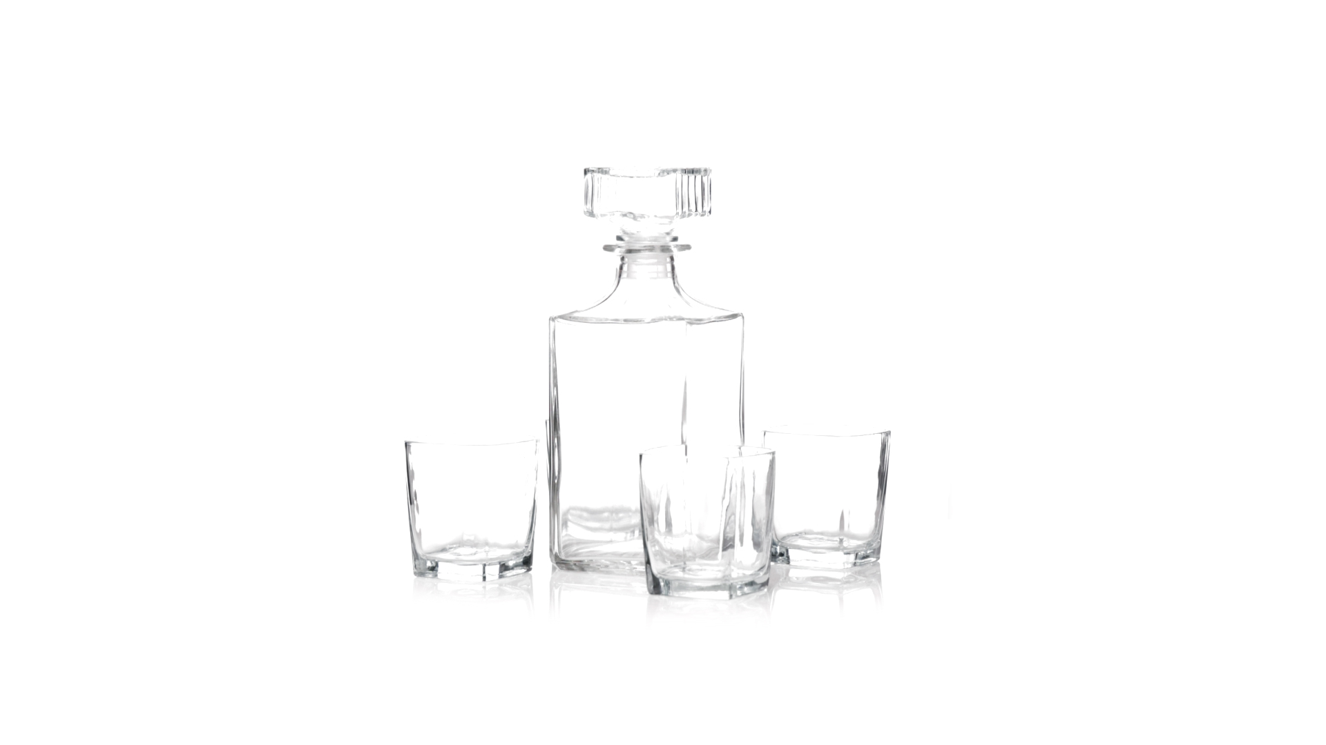 Whiskyset mit schlichtem Design und aus Glas. Enthält 4 Gläser von 200 ml und 1 l Dekanter, mit Glasstopfen. Präsentiert in einer individuellen Kraft-Design-Box.