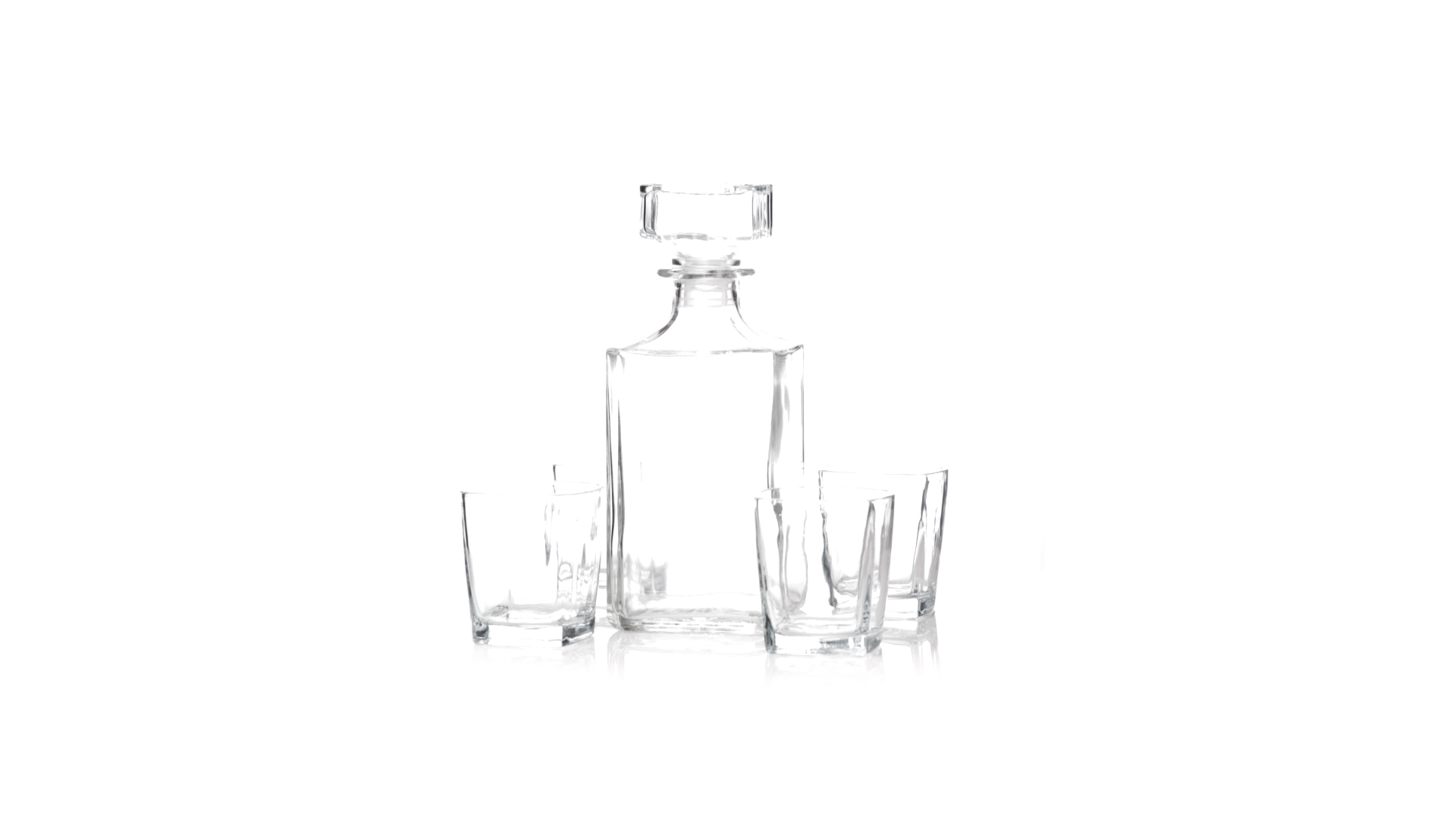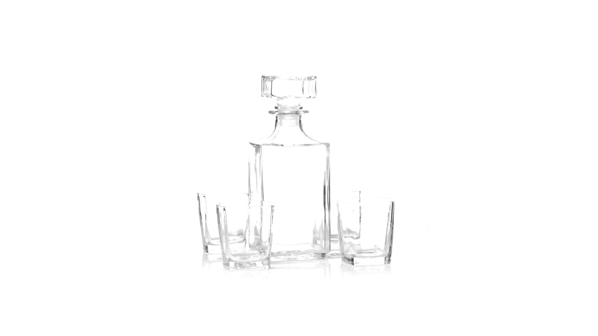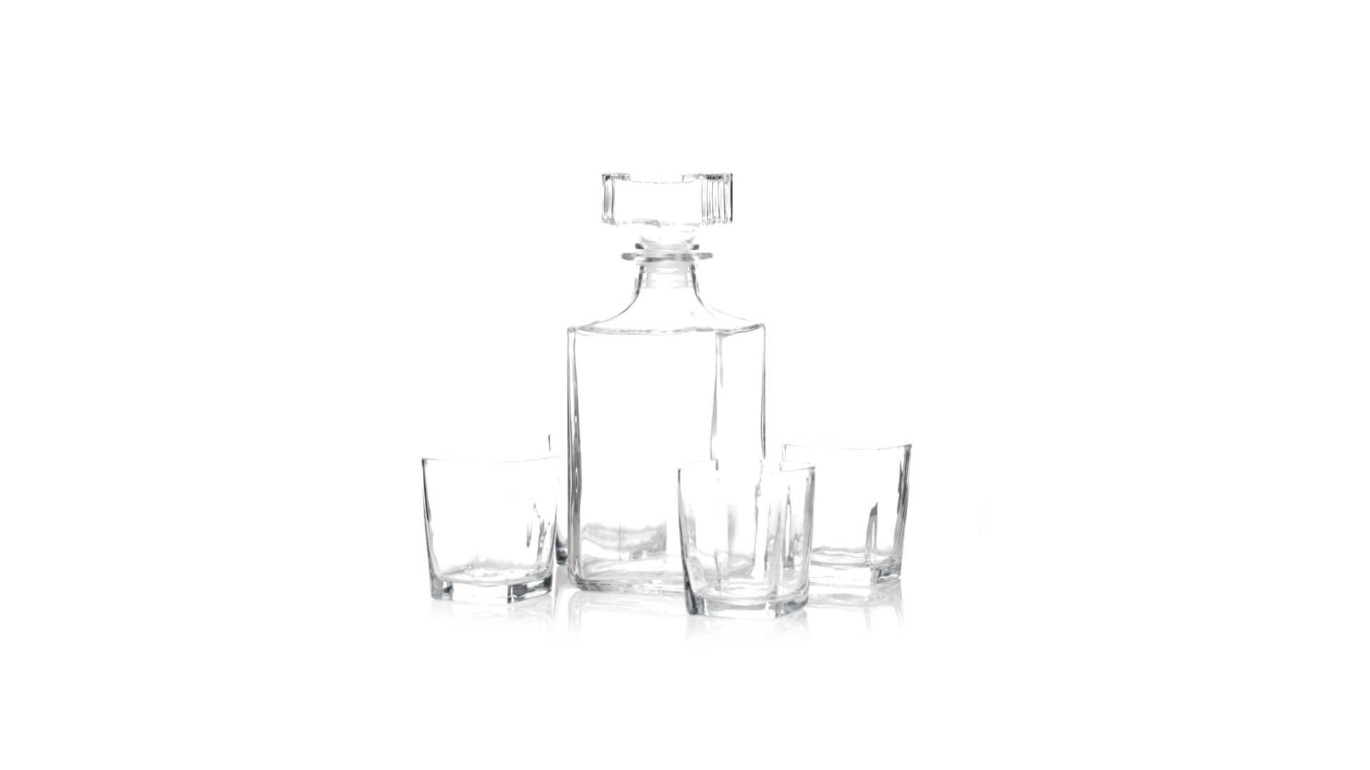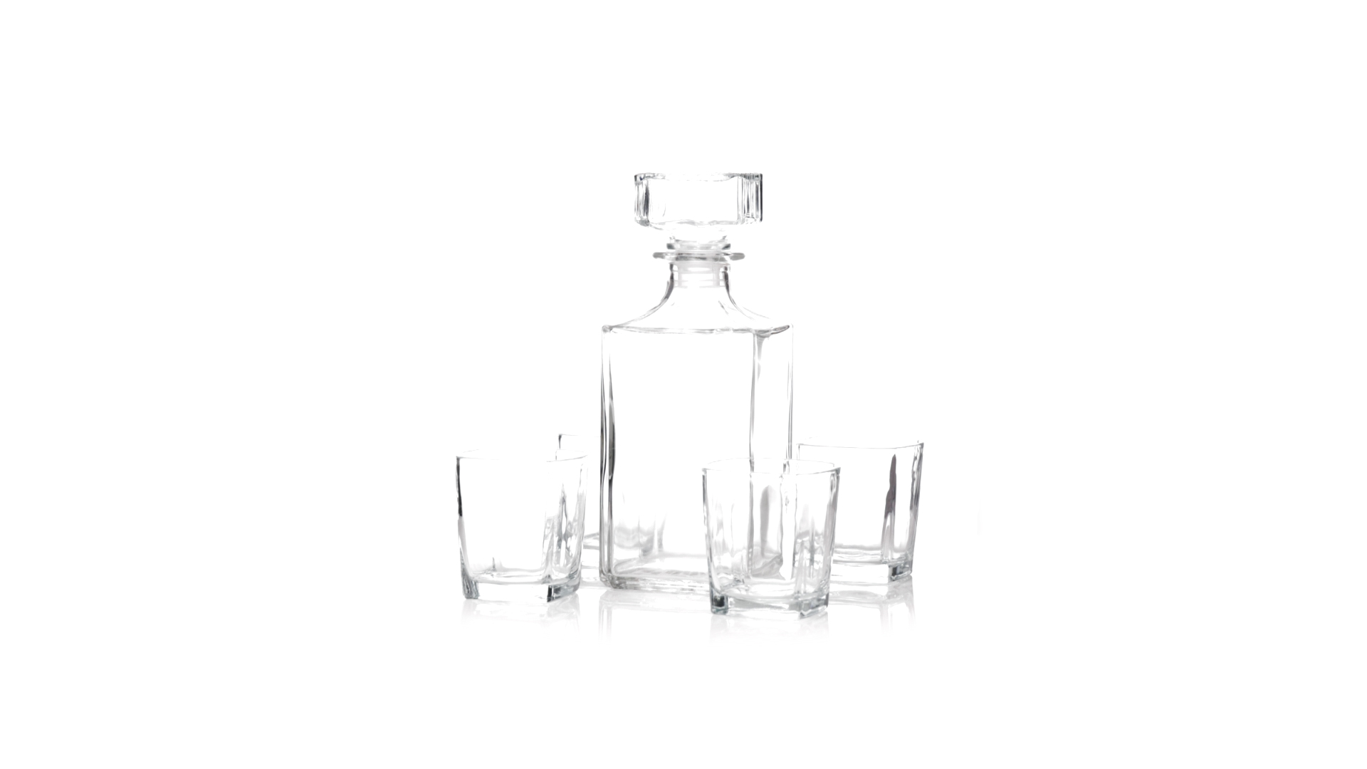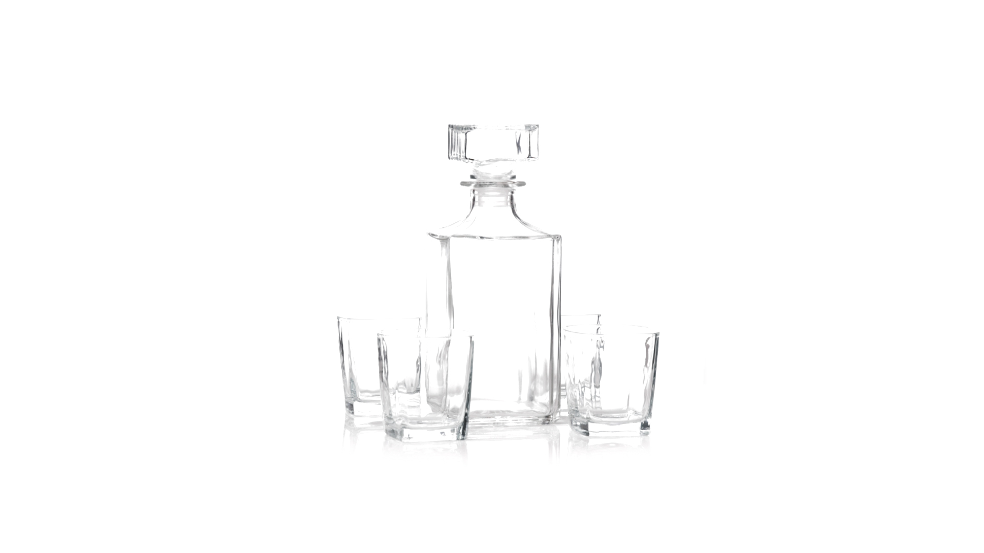 Whiskyset mit schlichtem Design und aus Glas. Enthält 4 Gläser von 200 ml und 1 l Dekanter, mit Glasstopfen. Präsentiert in einer individuellen Kraft-Design-Box.