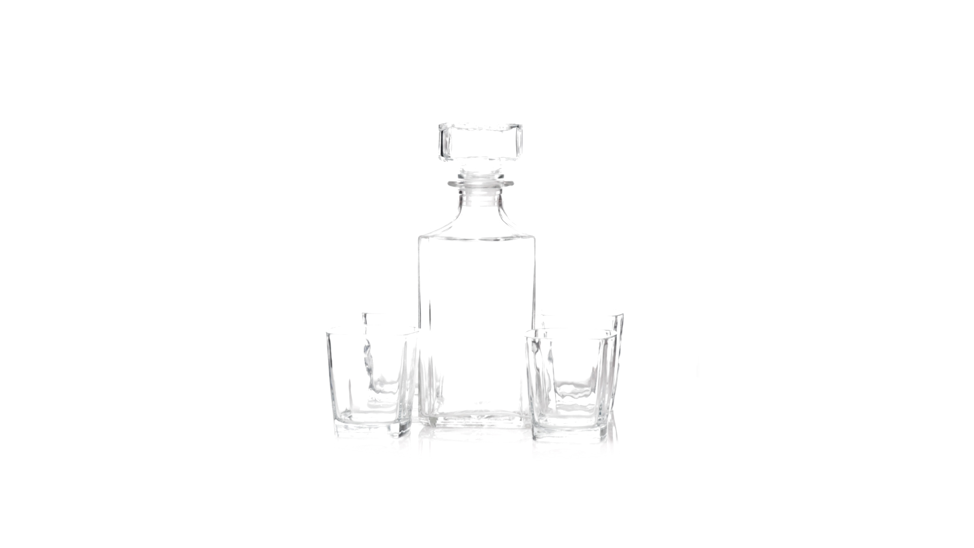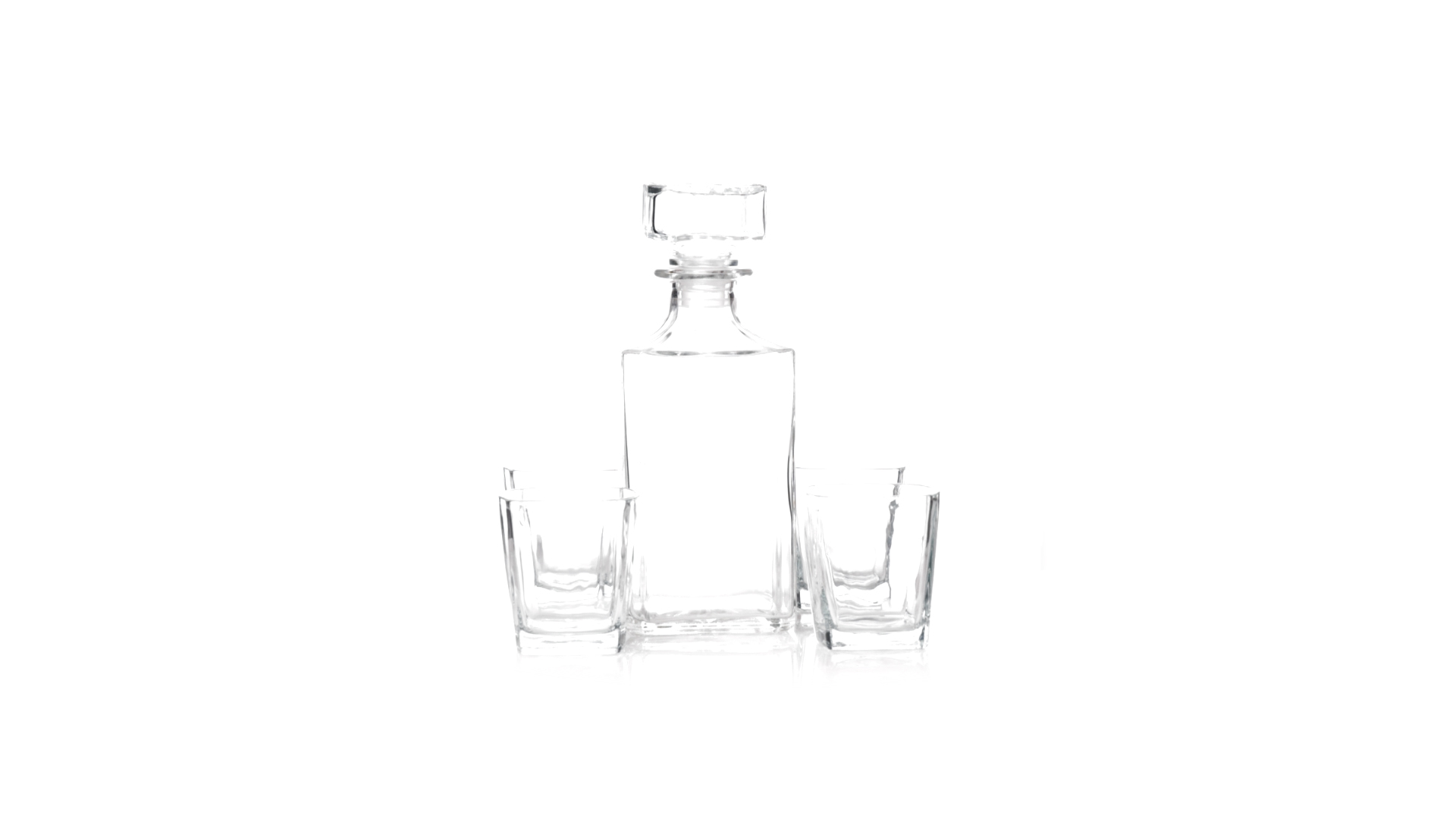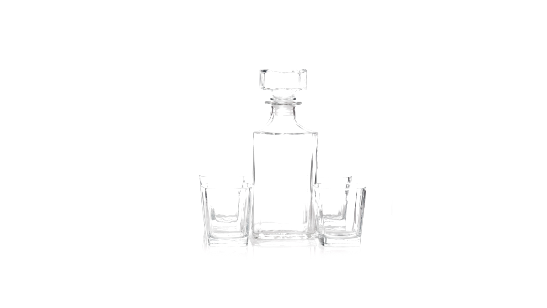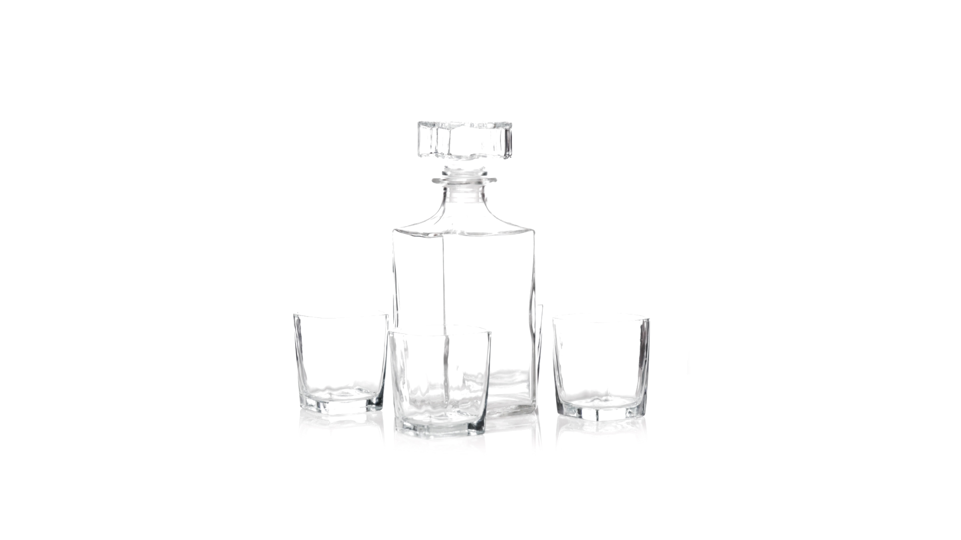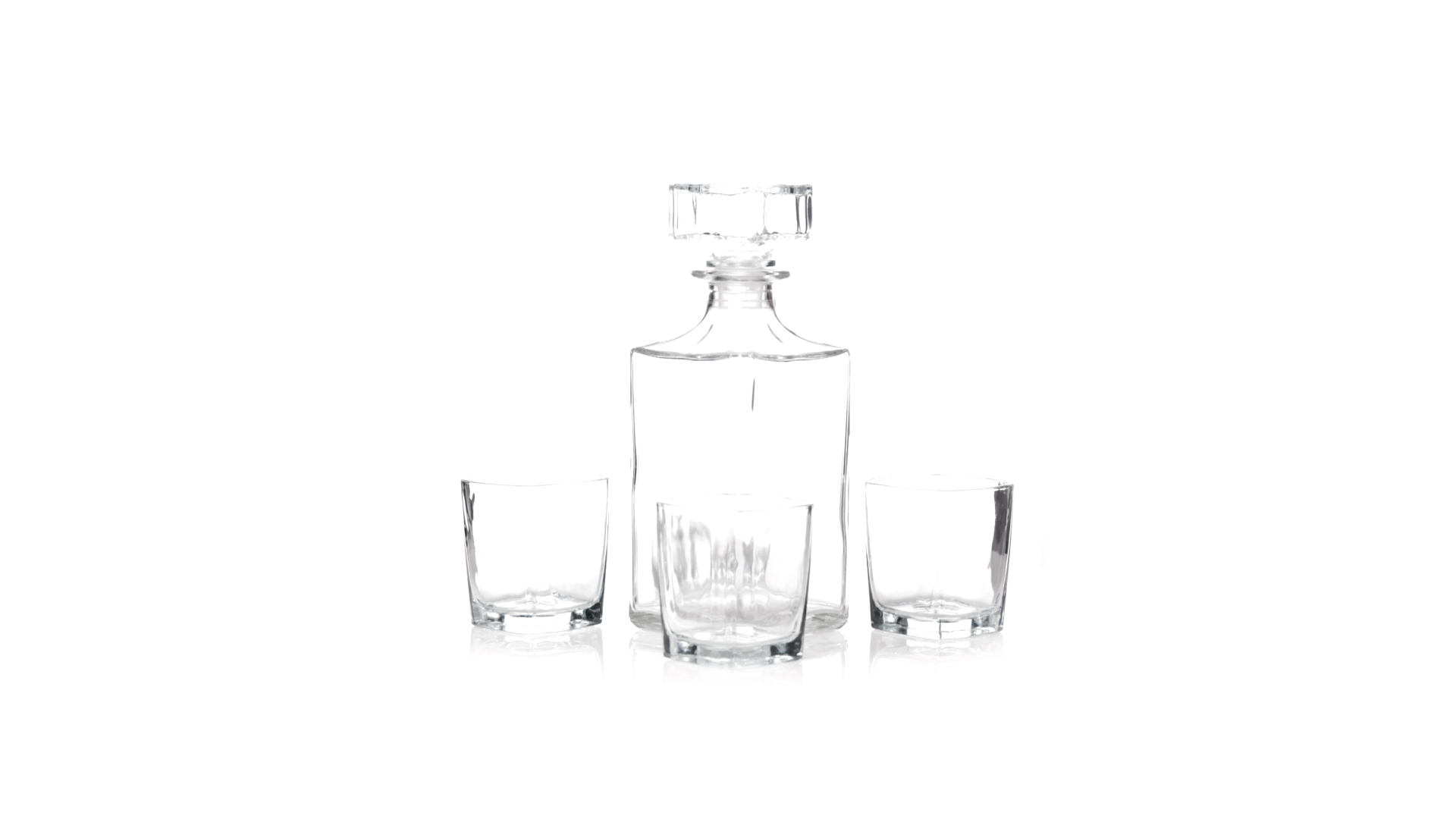 Whiskyset mit schlichtem Design und aus Glas. Enthält 4 Gläser von 200 ml und 1 l Dekanter, mit Glasstopfen. Präsentiert in einer individuellen Kraft-Design-Box.
