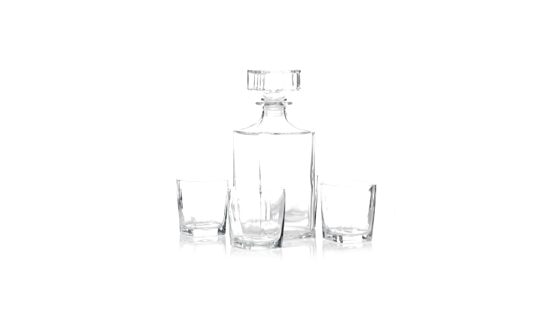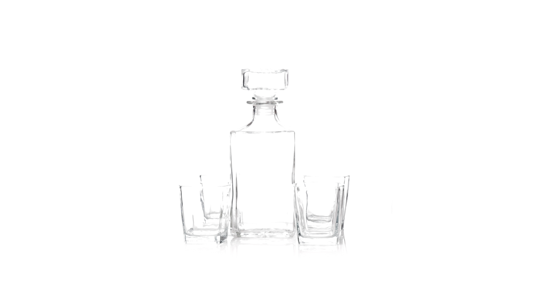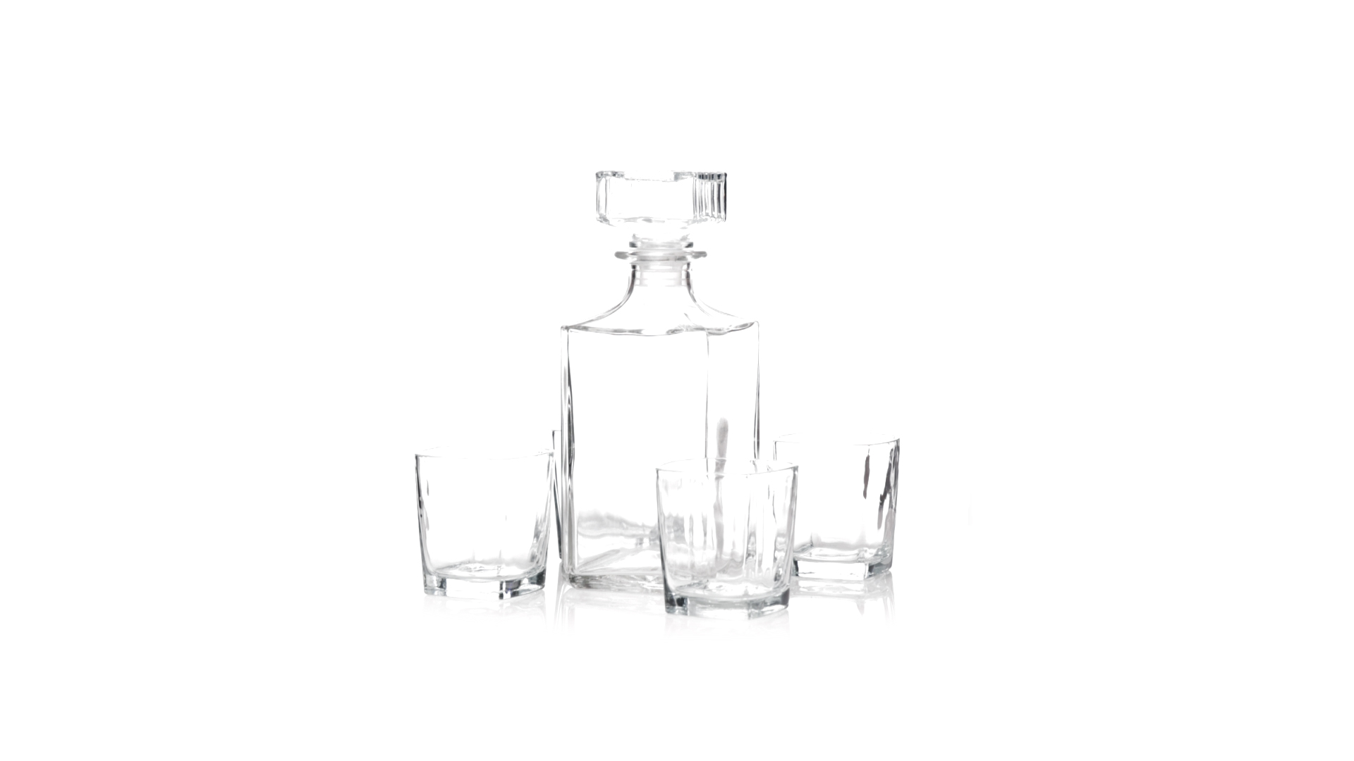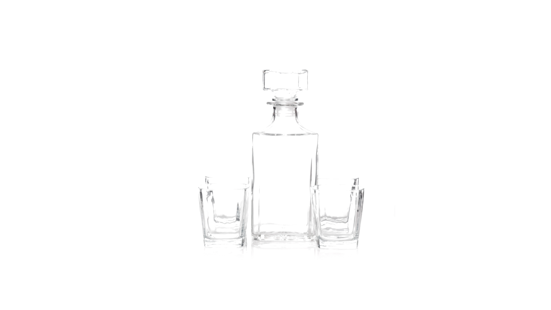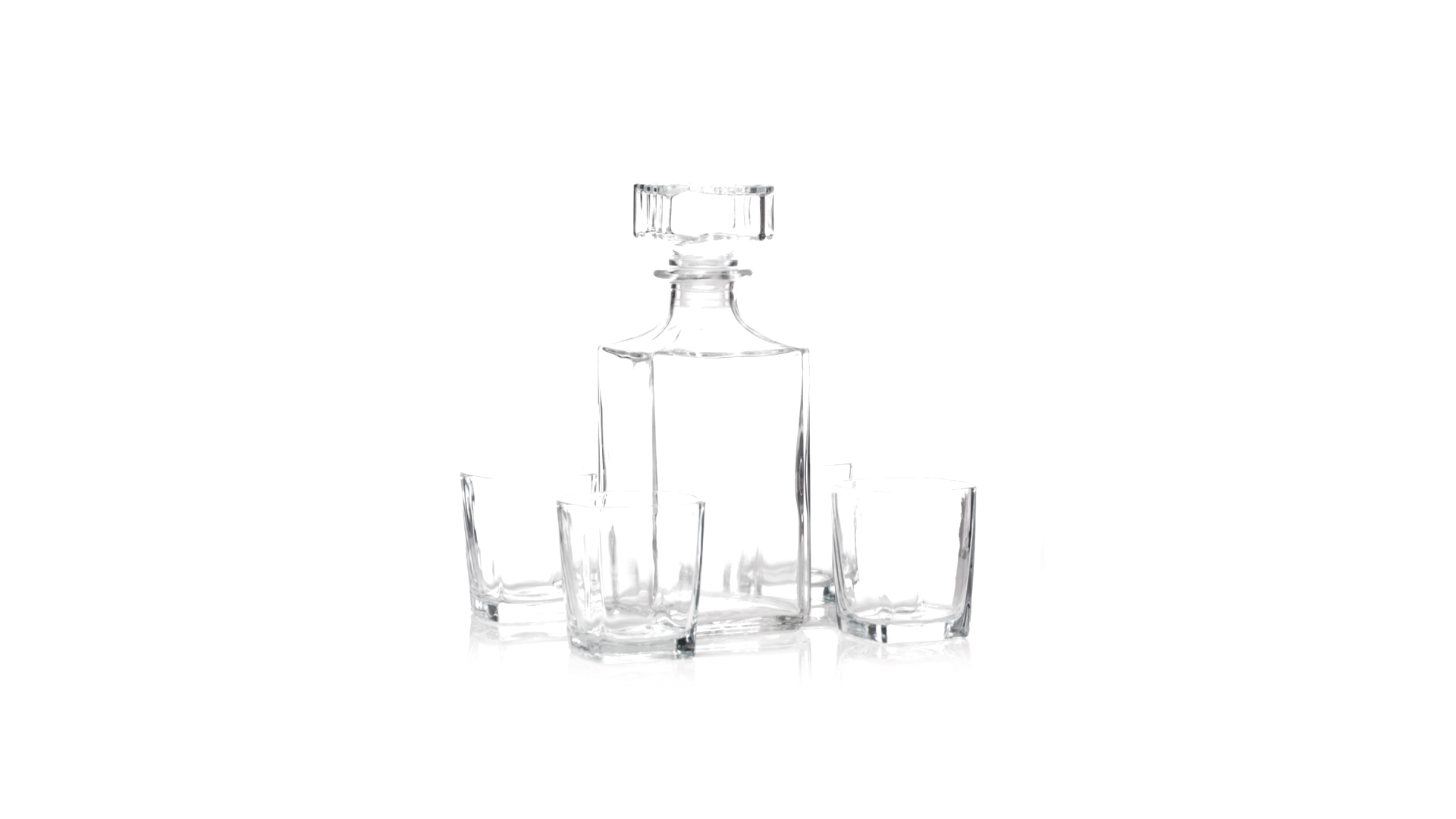 Whiskyset mit schlichtem Design und aus Glas. Enthält 4 Gläser von 200 ml und 1 l Dekanter, mit Glasstopfen. Präsentiert in einer individuellen Kraft-Design-Box.
