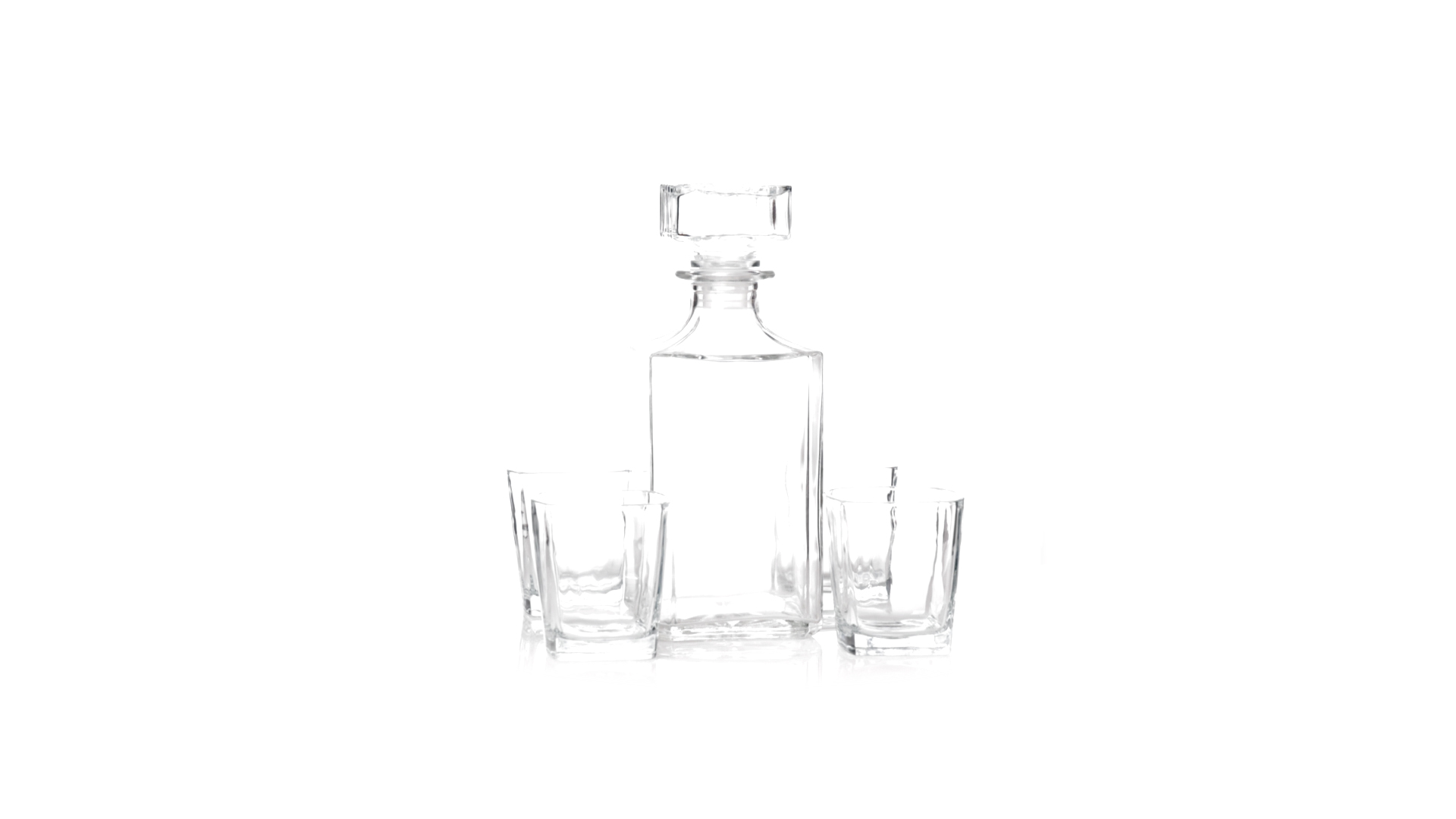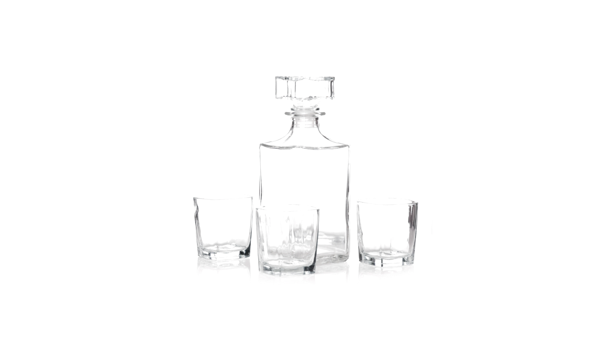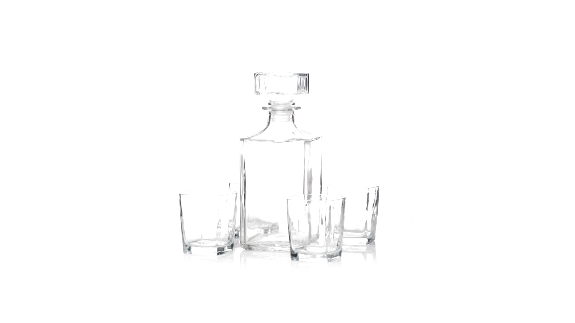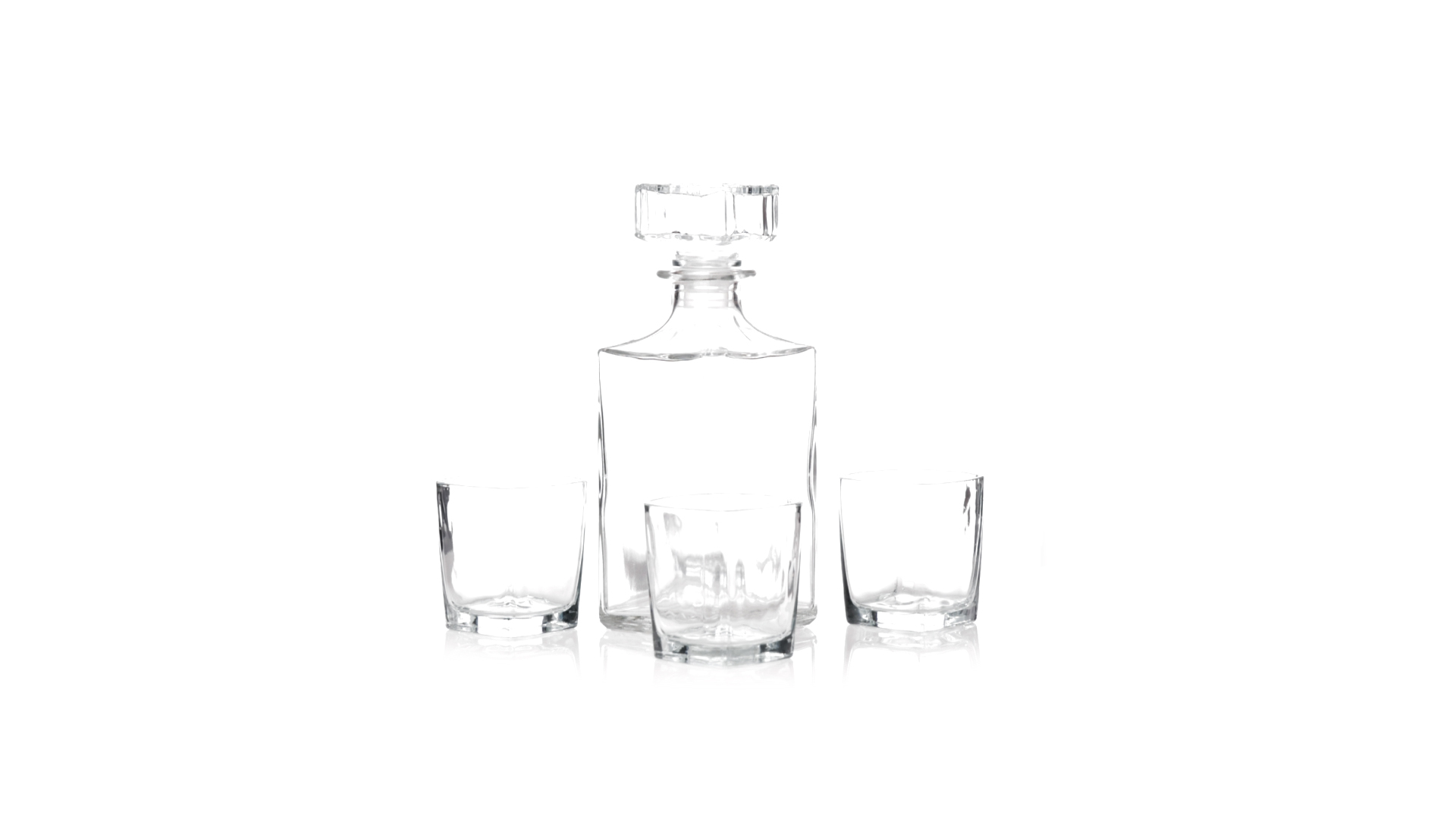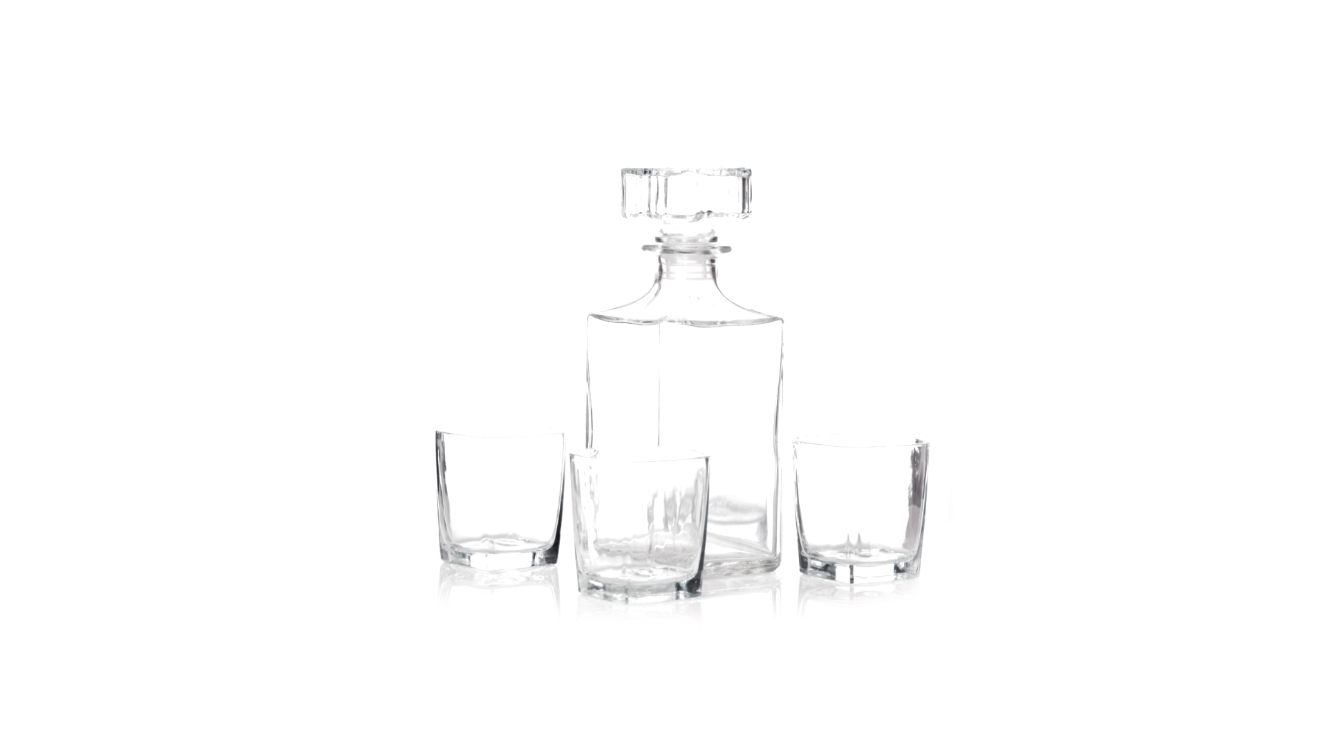 Whiskyset mit schlichtem Design und aus Glas. Enthält 4 Gläser von 200 ml und 1 l Dekanter, mit Glasstopfen. Präsentiert in einer individuellen Kraft-Design-Box.