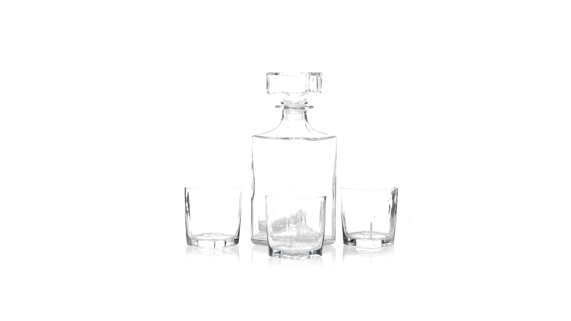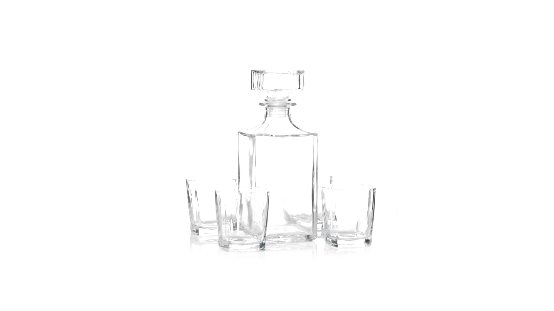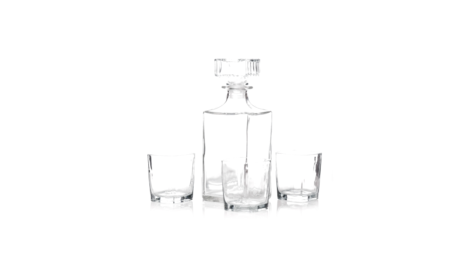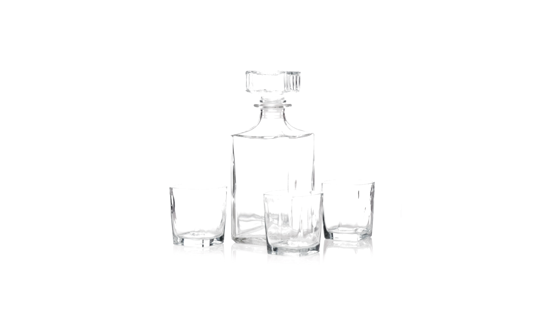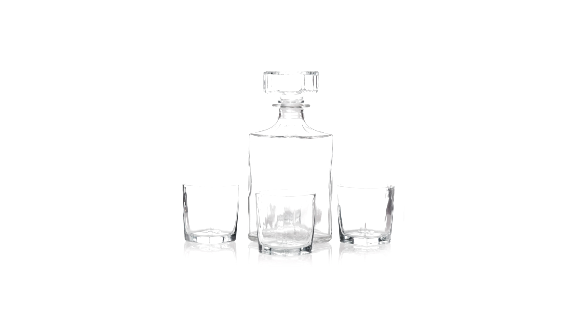 Whiskyset mit schlichtem Design und aus Glas. Enthält 4 Gläser von 200 ml und 1 l Dekanter, mit Glasstopfen. Präsentiert in einer individuellen Kraft-Design-Box.