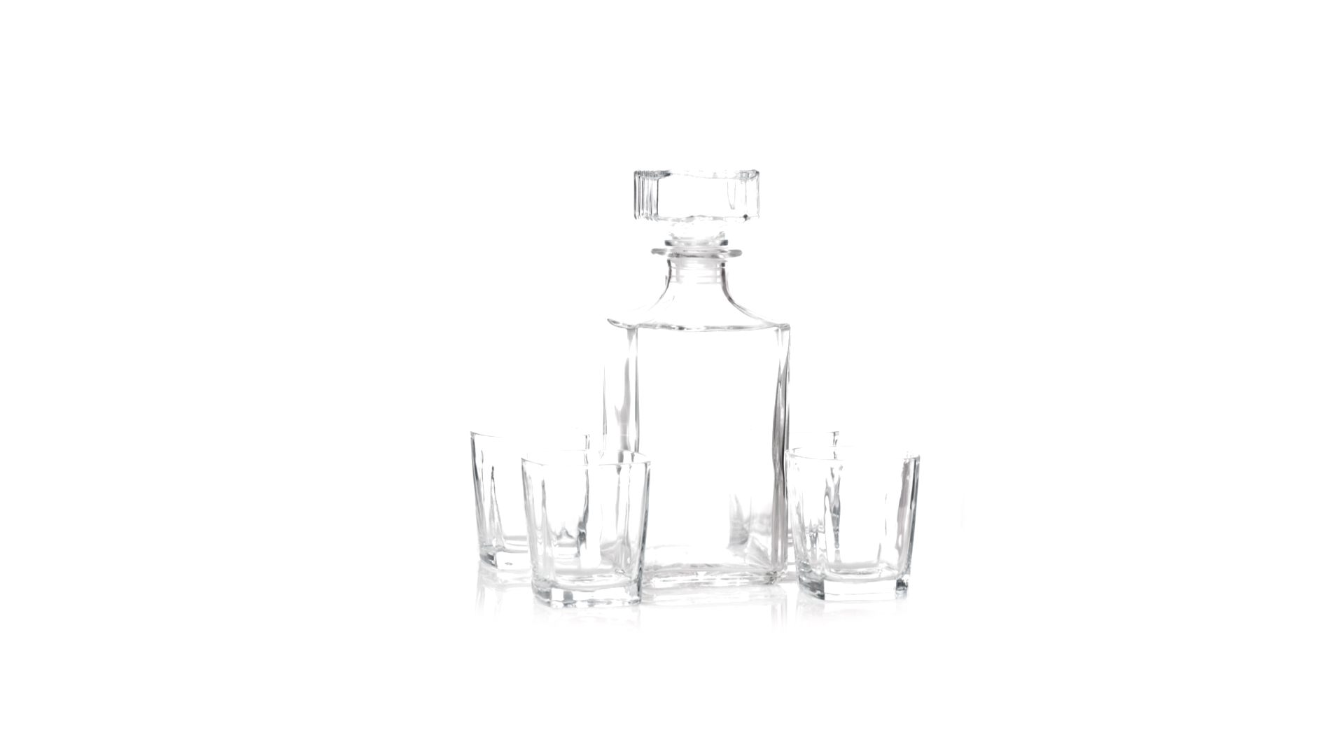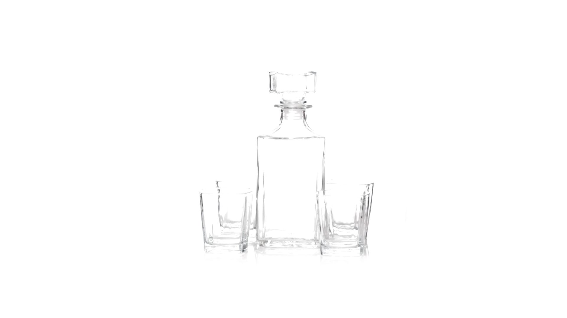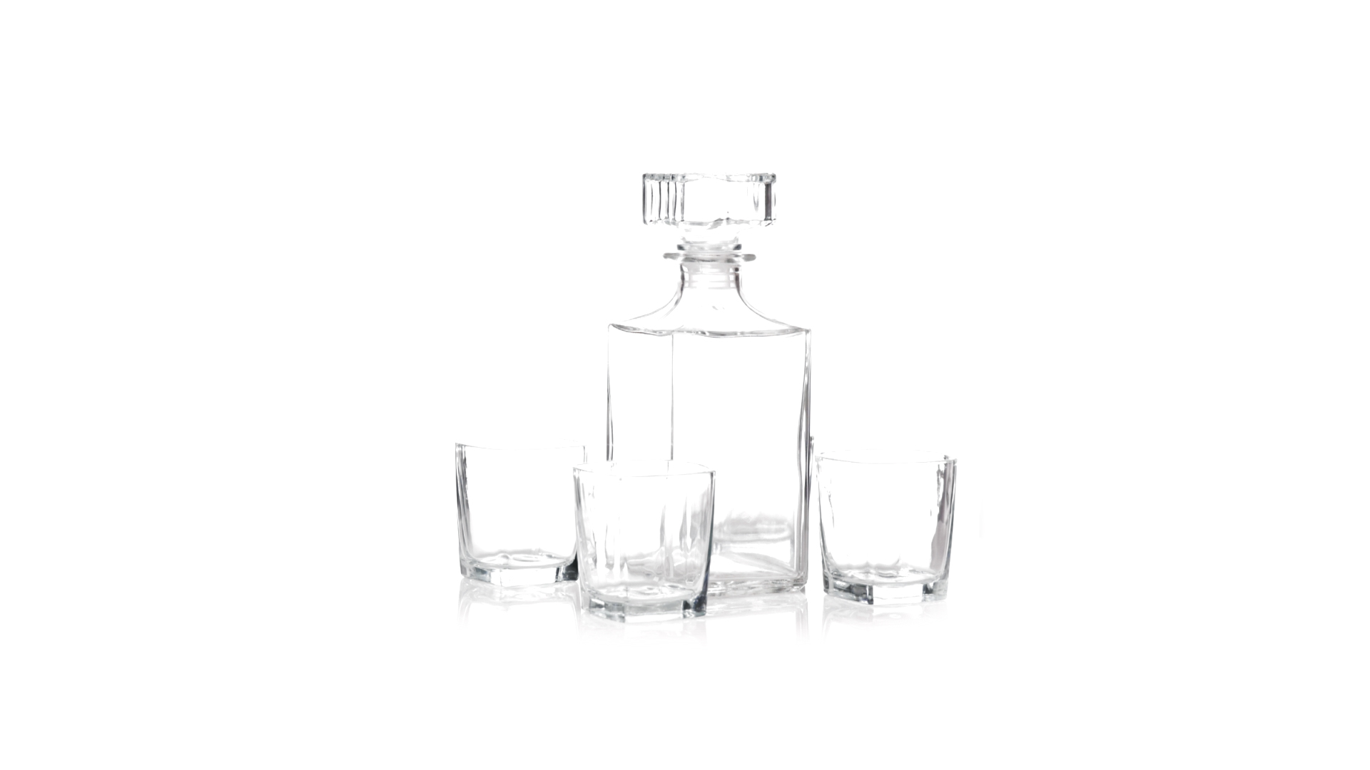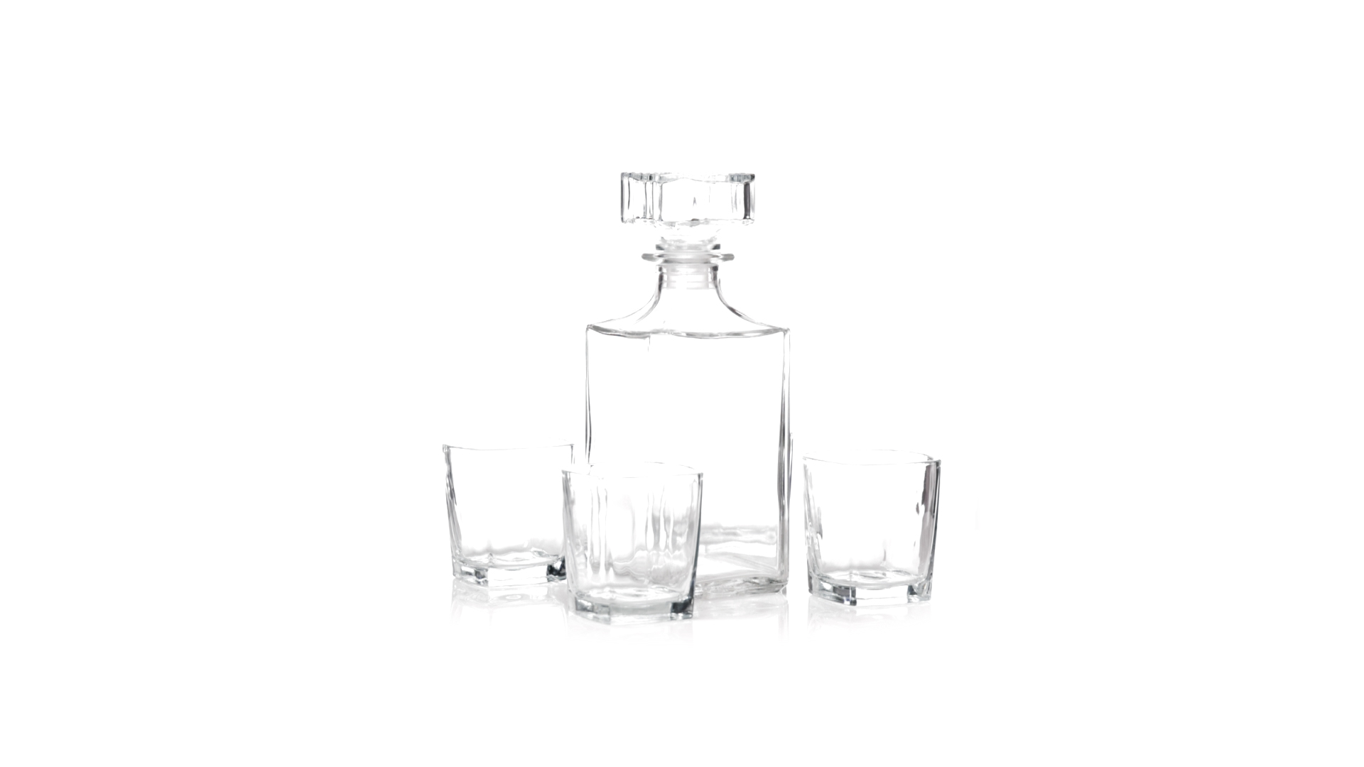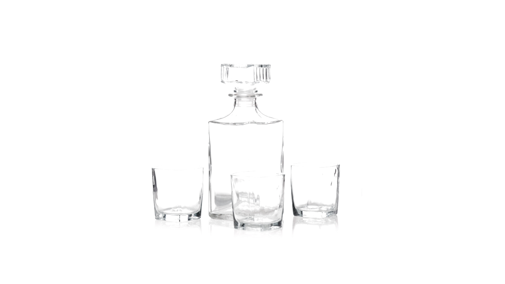 Whiskyset mit schlichtem Design und aus Glas. Enthält 4 Gläser von 200 ml und 1 l Dekanter, mit Glasstopfen. Präsentiert in einer individuellen Kraft-Design-Box.