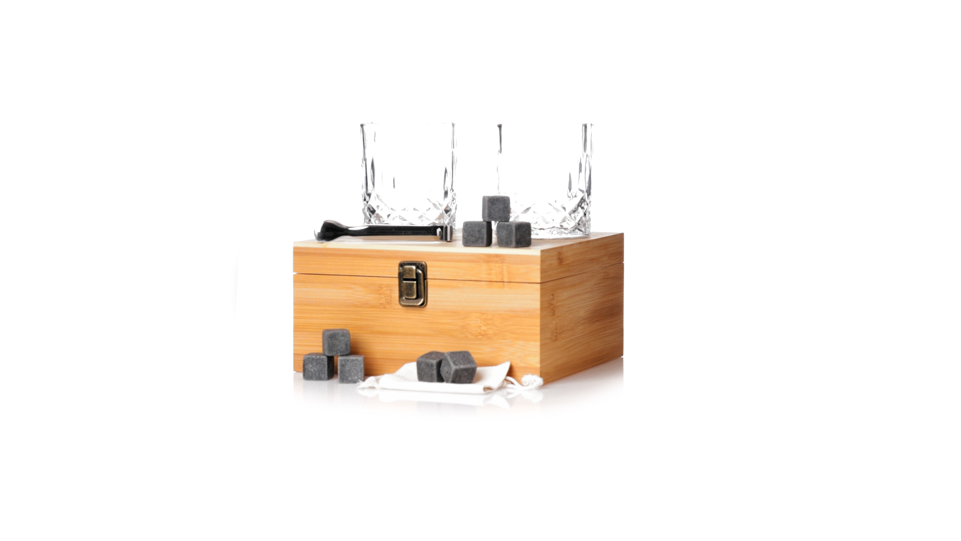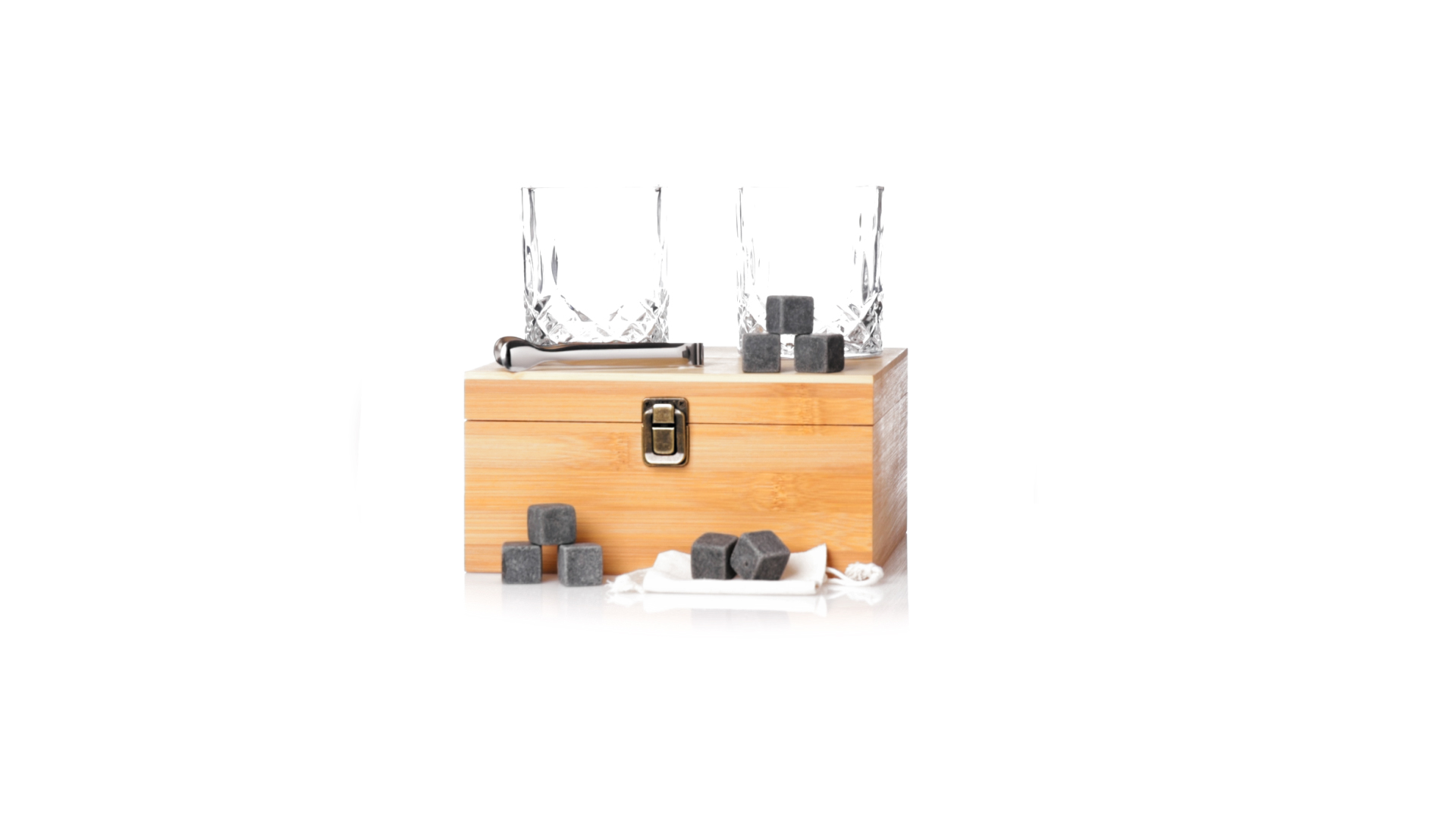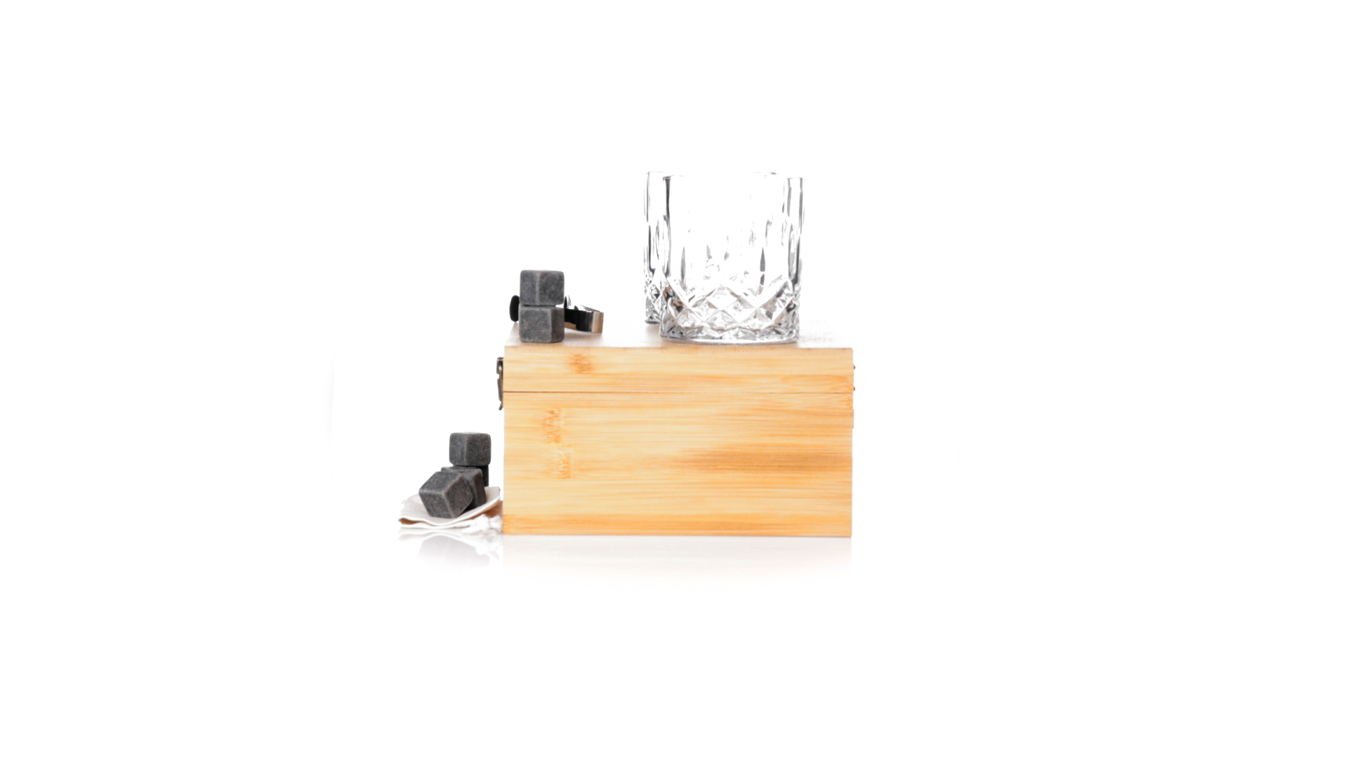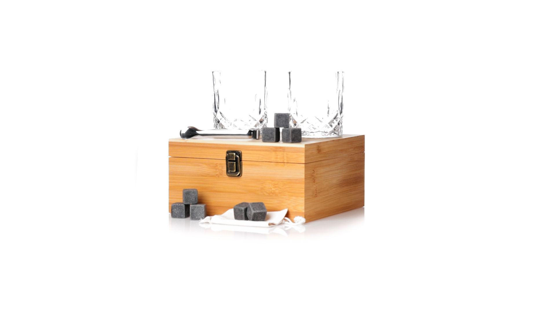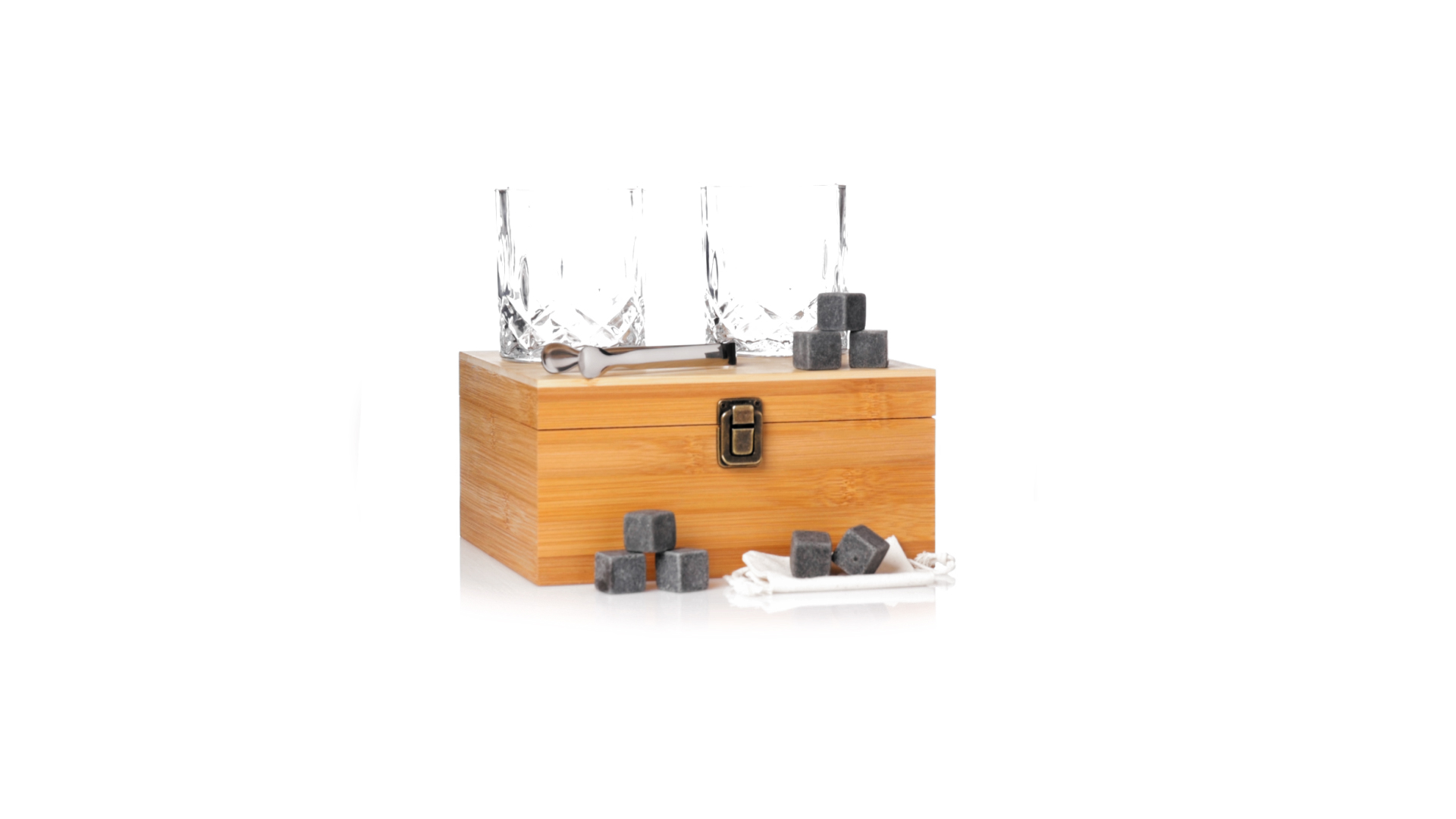 Whisky-Set im eleganten Bambus-Etui mit gestanzter Innenseite. Enthält 2 x 320ml Kristallgläser, Pinzette und 8 wiederverwendbare Natursteinwürfel, im Baumwollbeutel. Präsentiert in einer individuellen Kraftbox.Die wiederverwendbaren Eiswürfel bestehen aus natürlichem Speckstein, auch bekannt als Speckstein oder Speckstein, der das Getränk kalt hält, ohne seine Eigenschaften zu verändern, indem er seinen Inhalt nicht mit Wasser verdünnt, und seinen ursprünglichen Geschmack beibehält.
