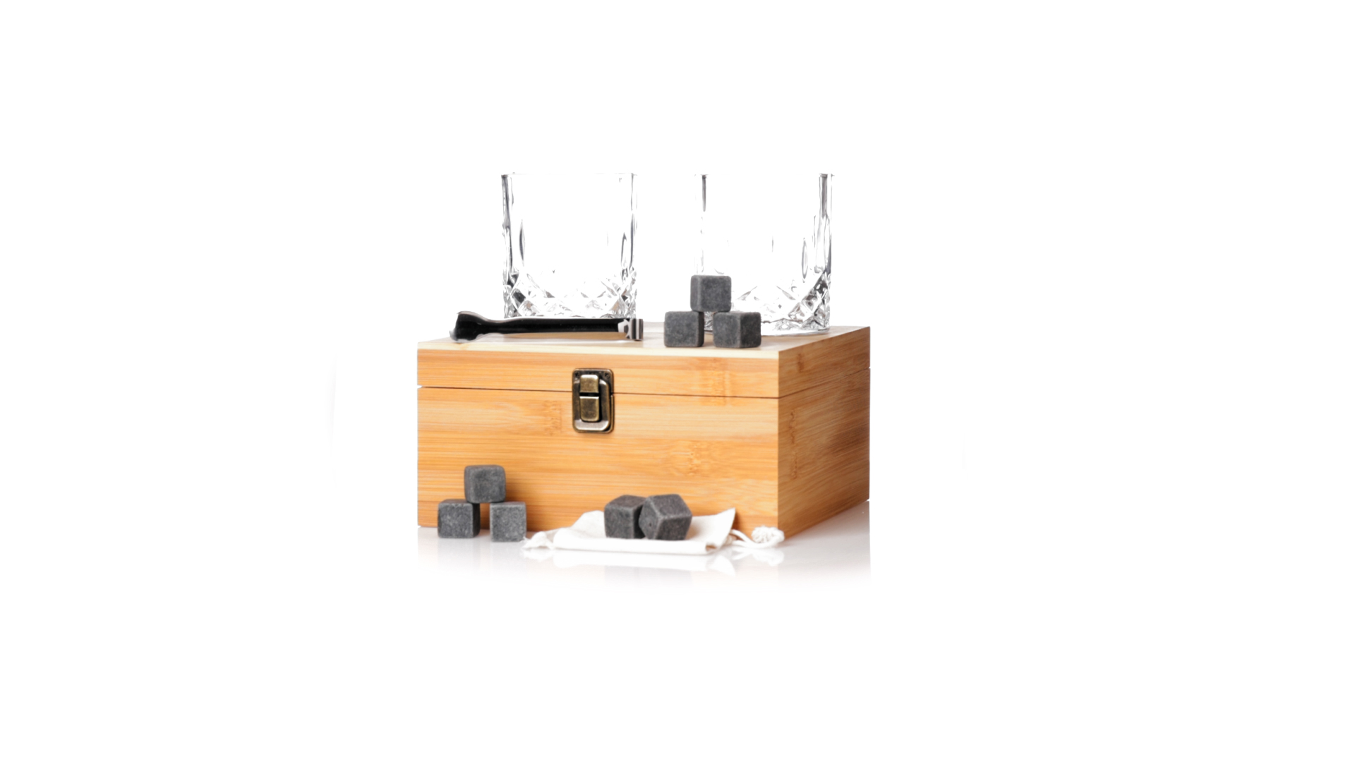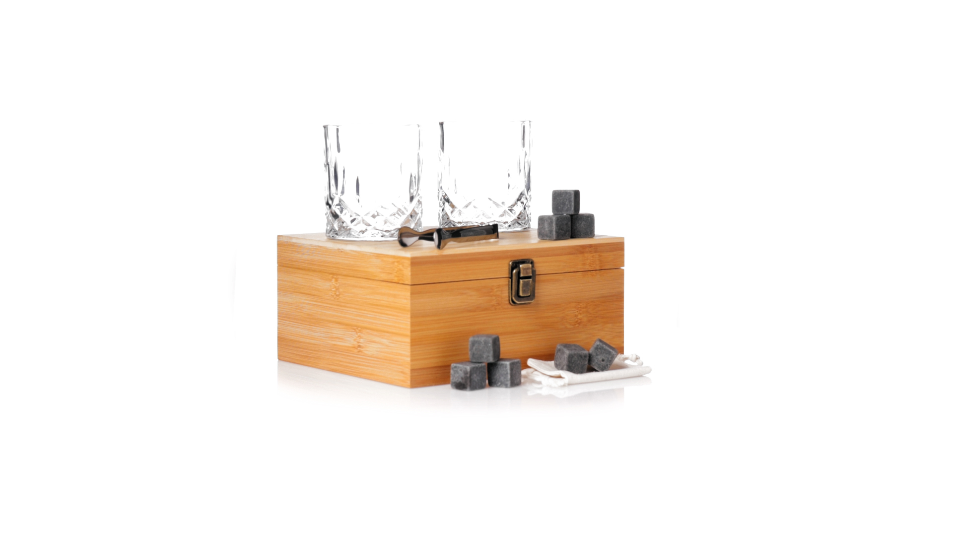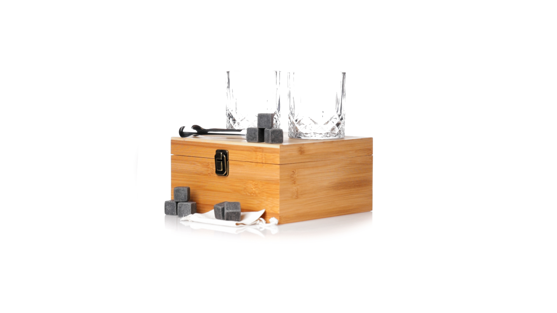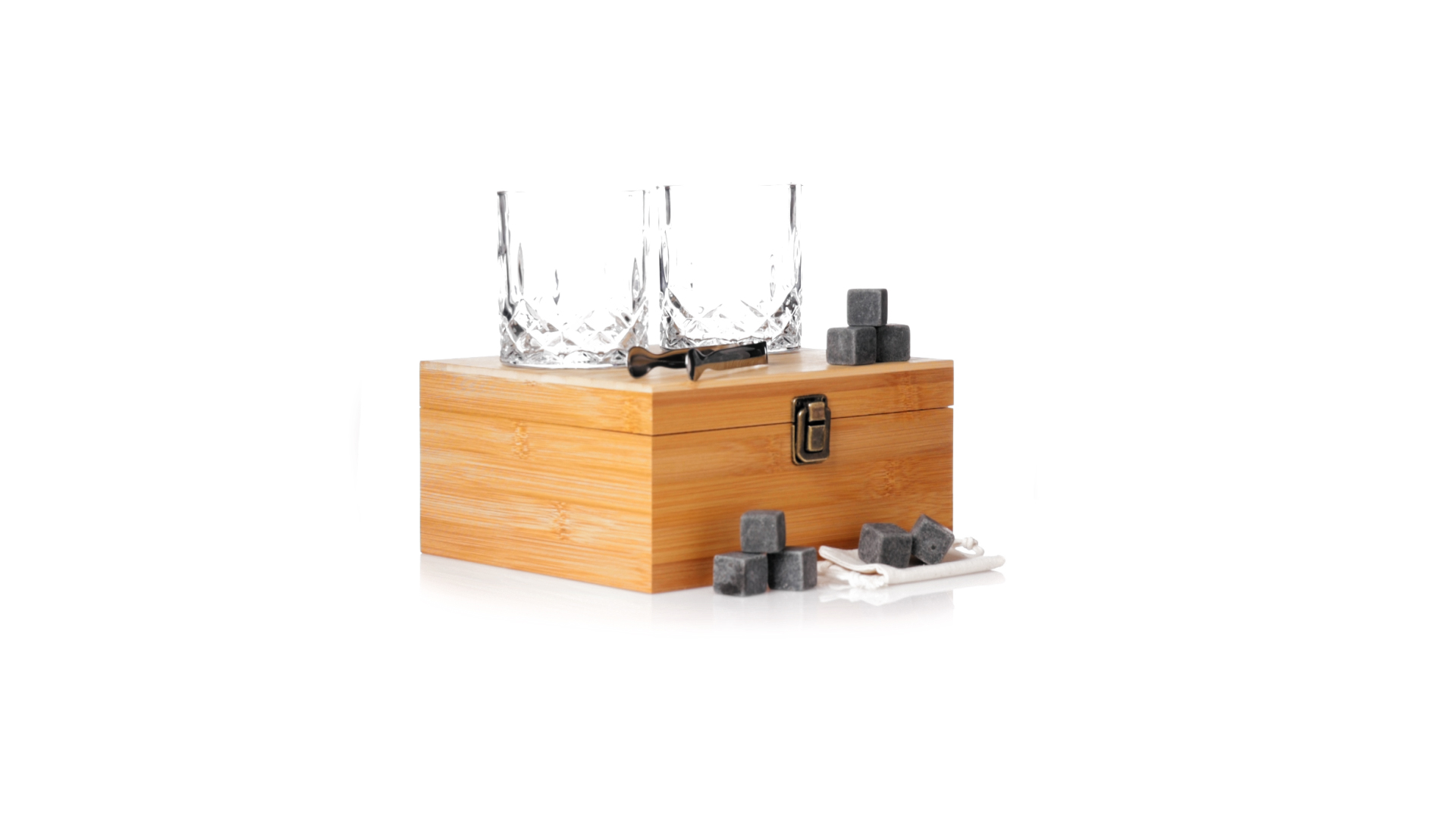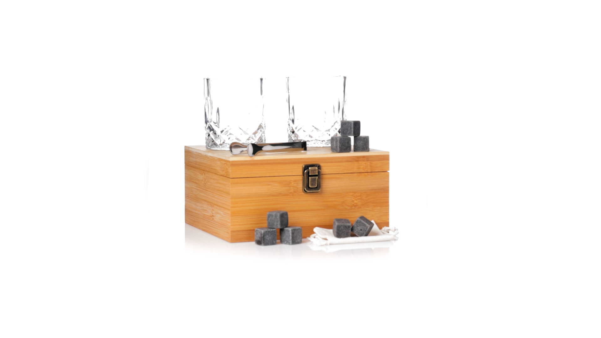 Whisky-Set im eleganten Bambus-Etui mit gestanzter Innenseite. Enthält 2 x 320ml Kristallgläser, Pinzette und 8 wiederverwendbare Natursteinwürfel, im Baumwollbeutel. Präsentiert in einer individuellen Kraftbox.Die wiederverwendbaren Eiswürfel bestehen aus natürlichem Speckstein, auch bekannt als Speckstein oder Speckstein, der das Getränk kalt hält, ohne seine Eigenschaften zu verändern, indem er seinen Inhalt nicht mit Wasser verdünnt, und seinen ursprünglichen Geschmack beibehält.