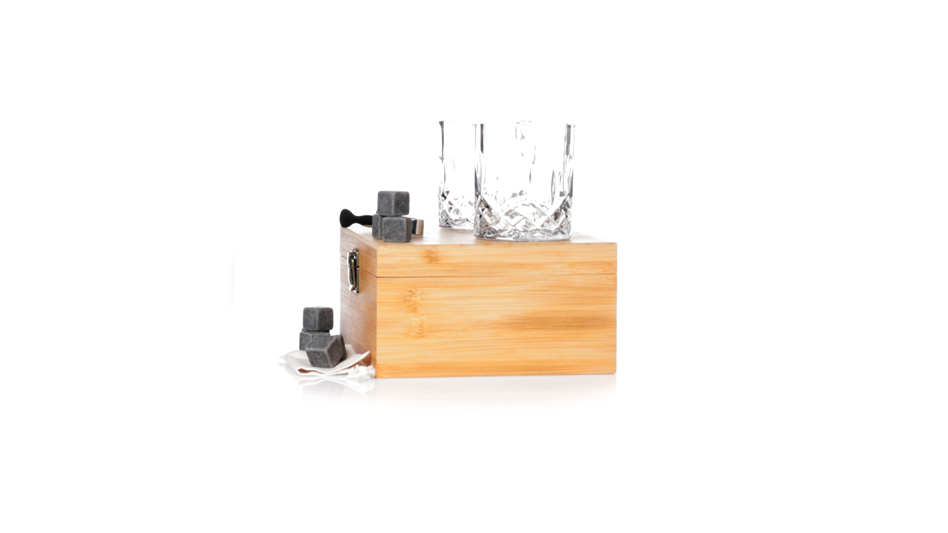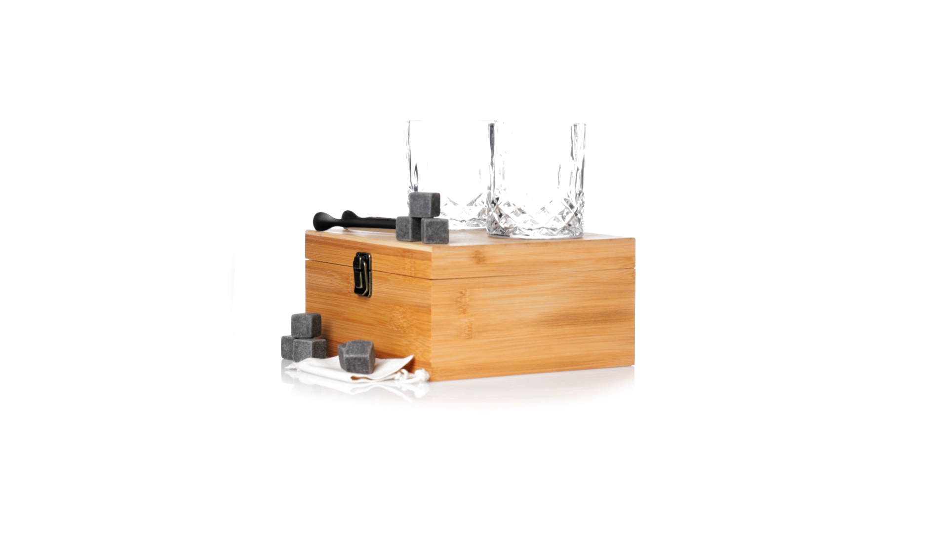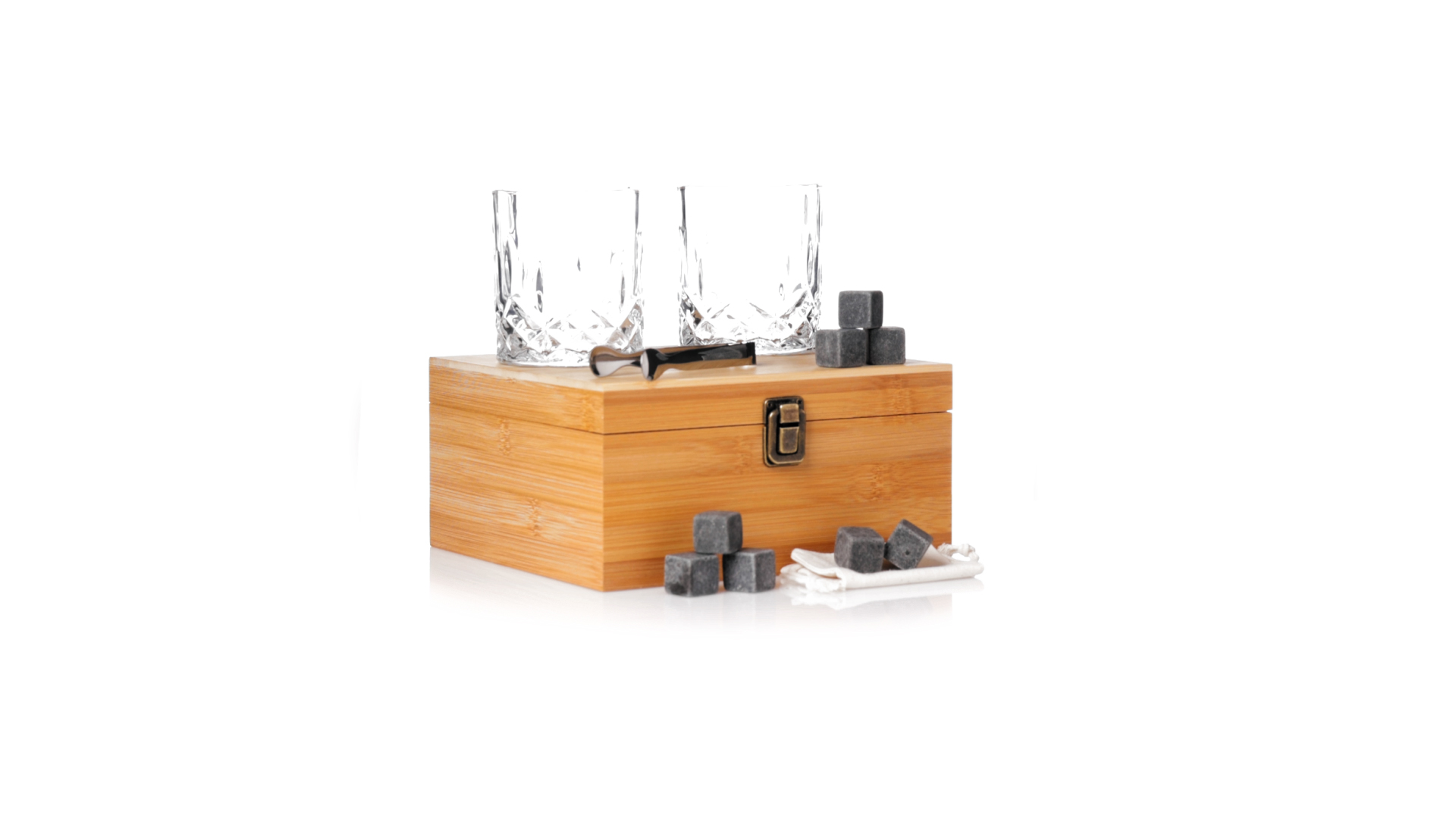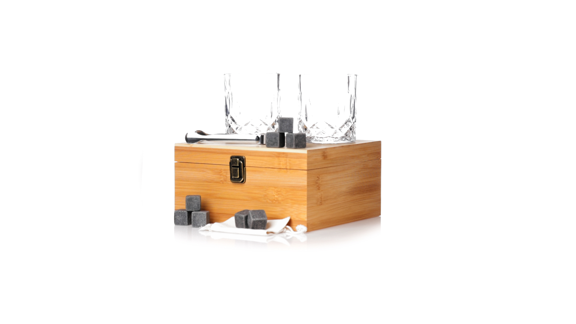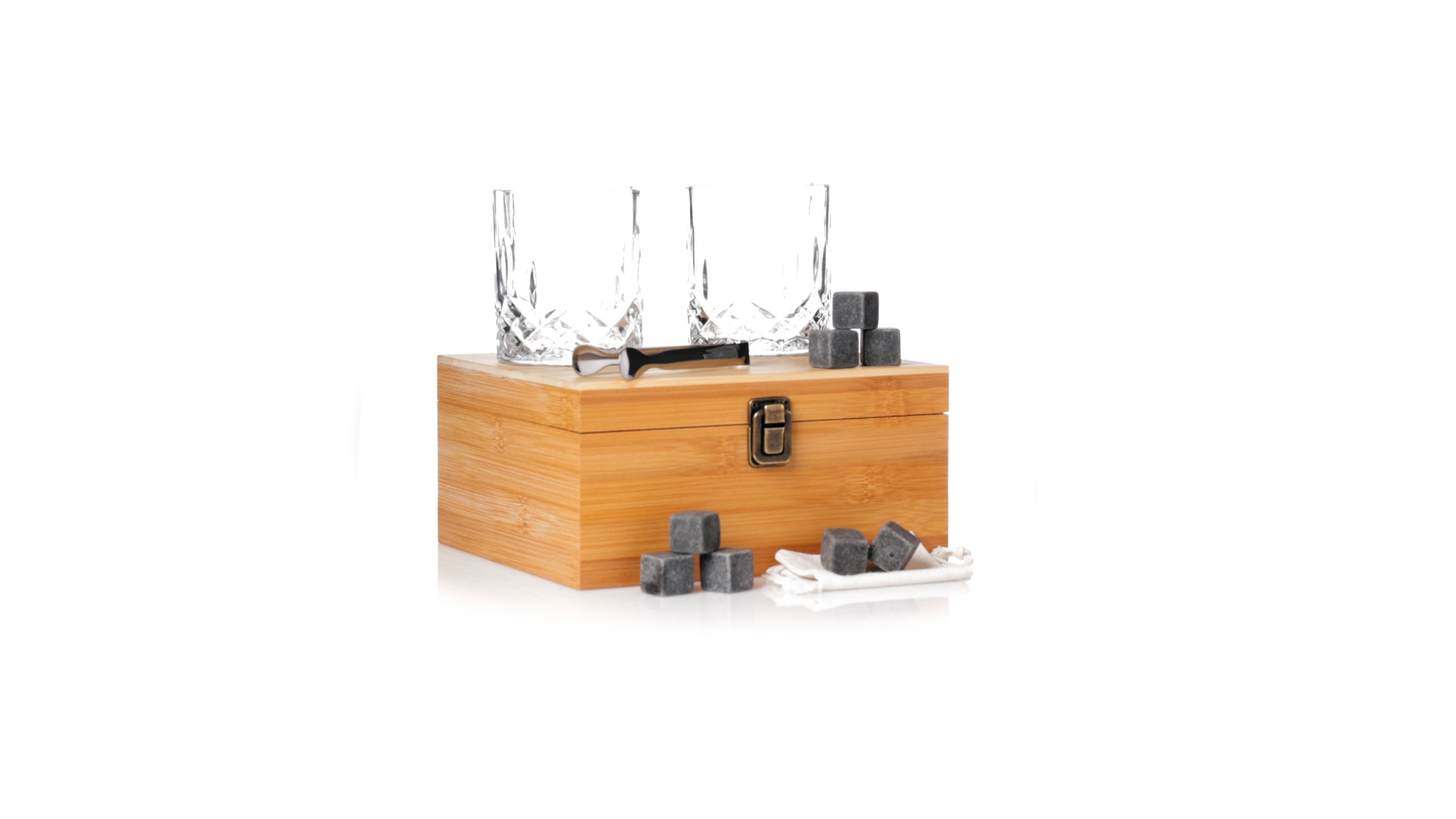 Whisky-Set im eleganten Bambus-Etui mit gestanzter Innenseite. Enthält 2 x 320ml Kristallgläser, Pinzette und 8 wiederverwendbare Natursteinwürfel, im Baumwollbeutel. Präsentiert in einer individuellen Kraftbox.Die wiederverwendbaren Eiswürfel bestehen aus natürlichem Speckstein, auch bekannt als Speckstein oder Speckstein, der das Getränk kalt hält, ohne seine Eigenschaften zu verändern, indem er seinen Inhalt nicht mit Wasser verdünnt, und seinen ursprünglichen Geschmack beibehält.