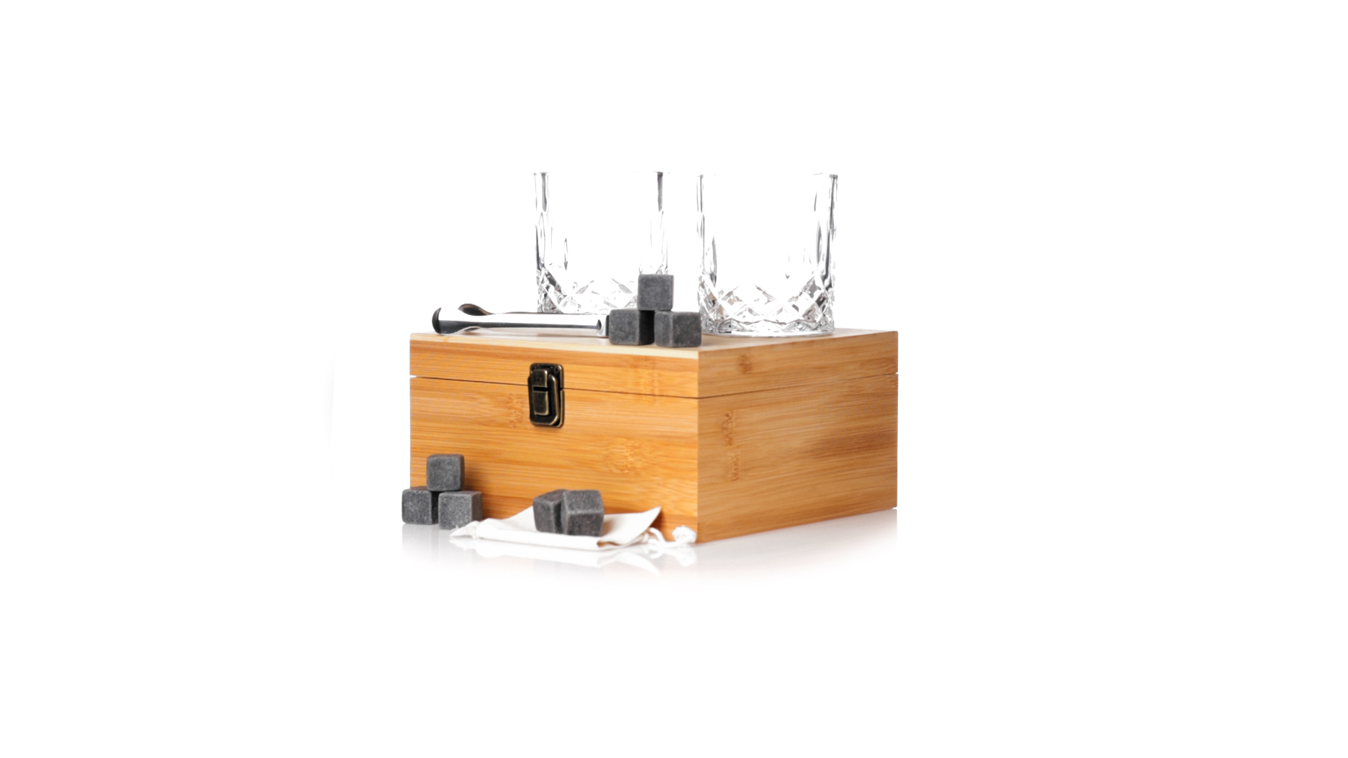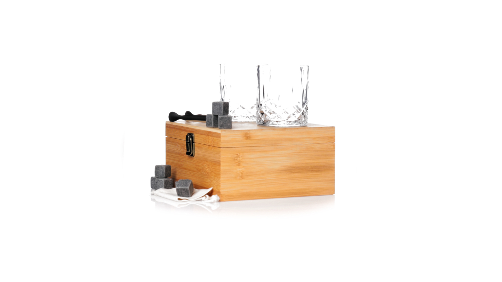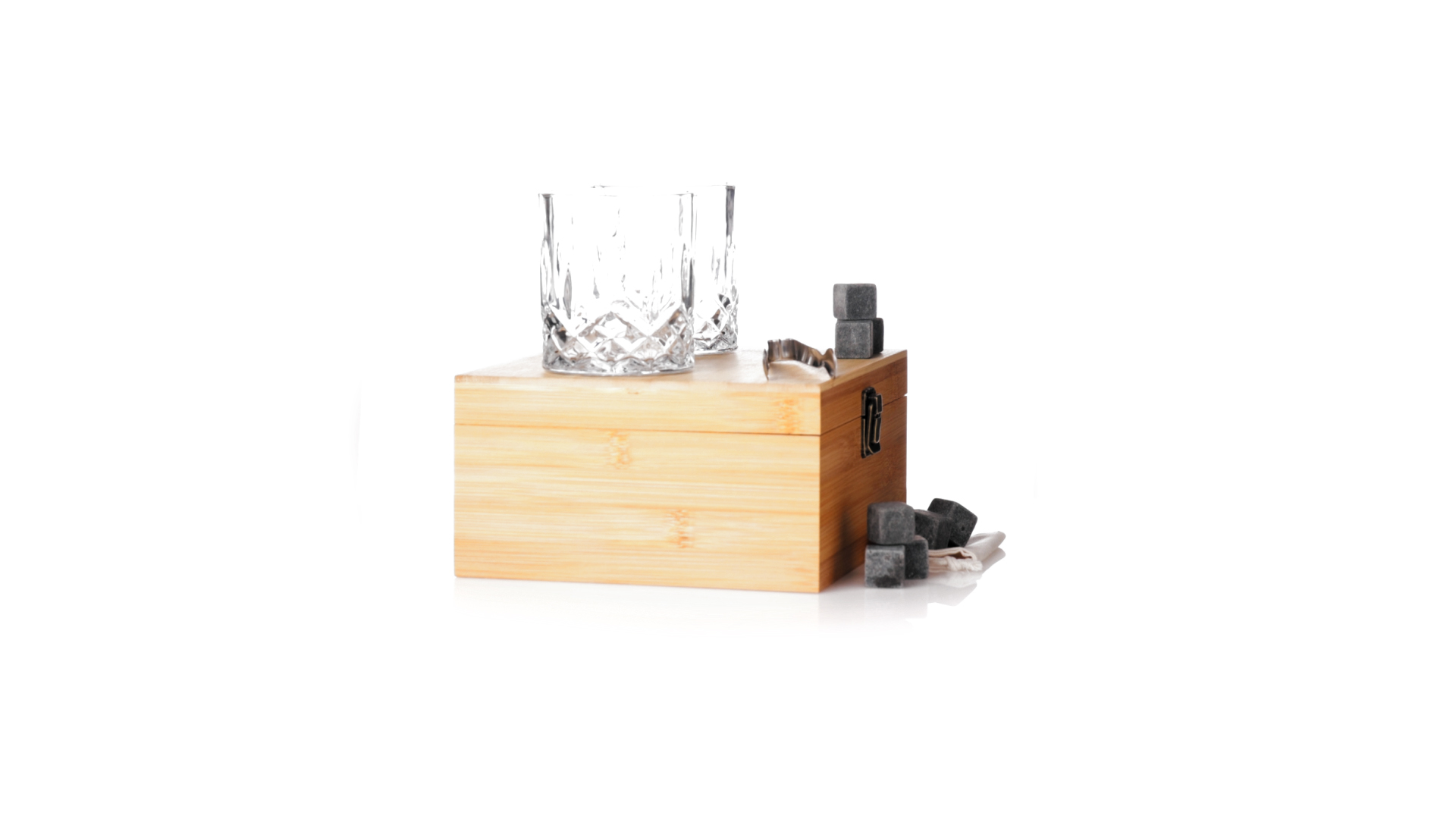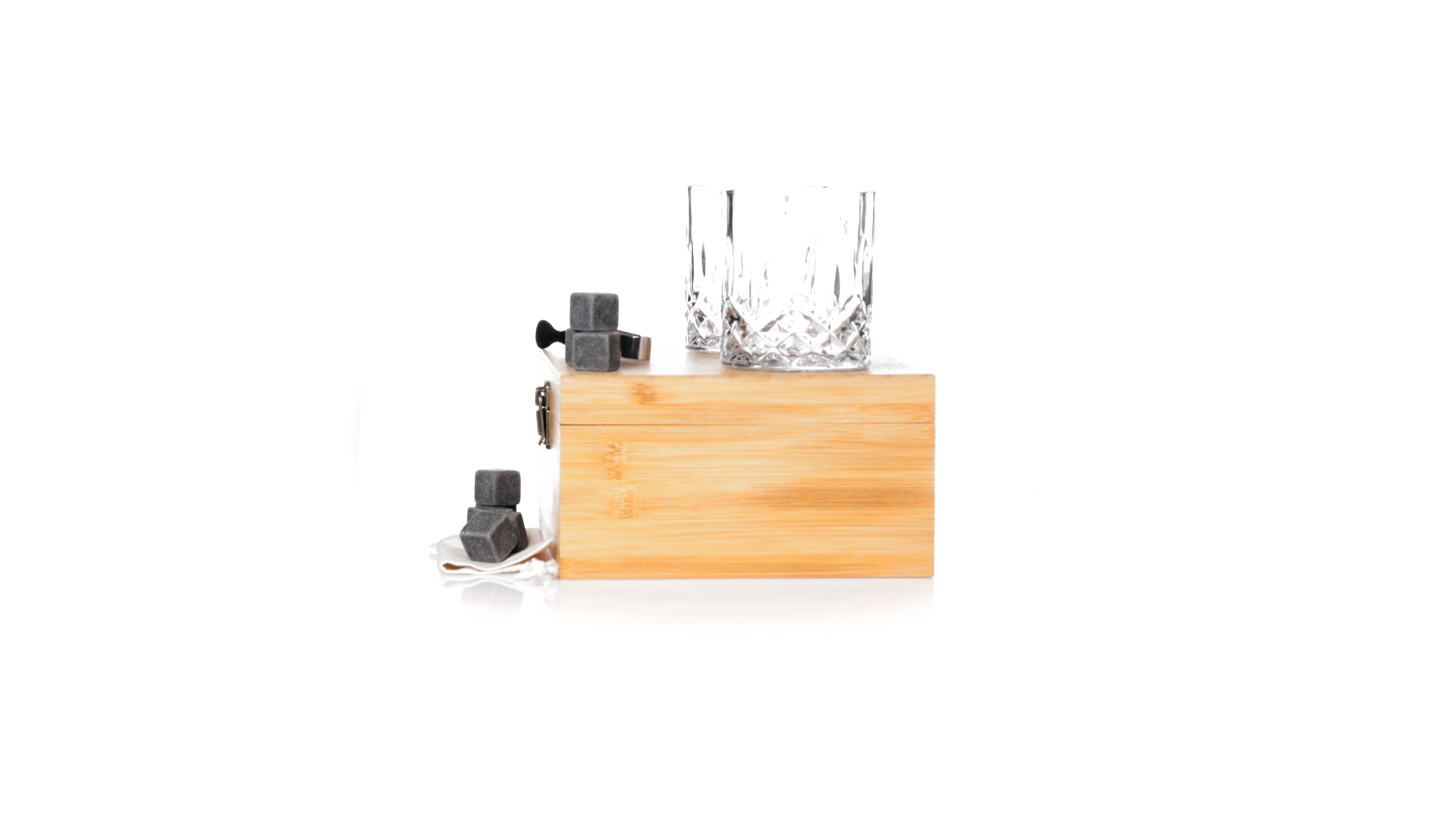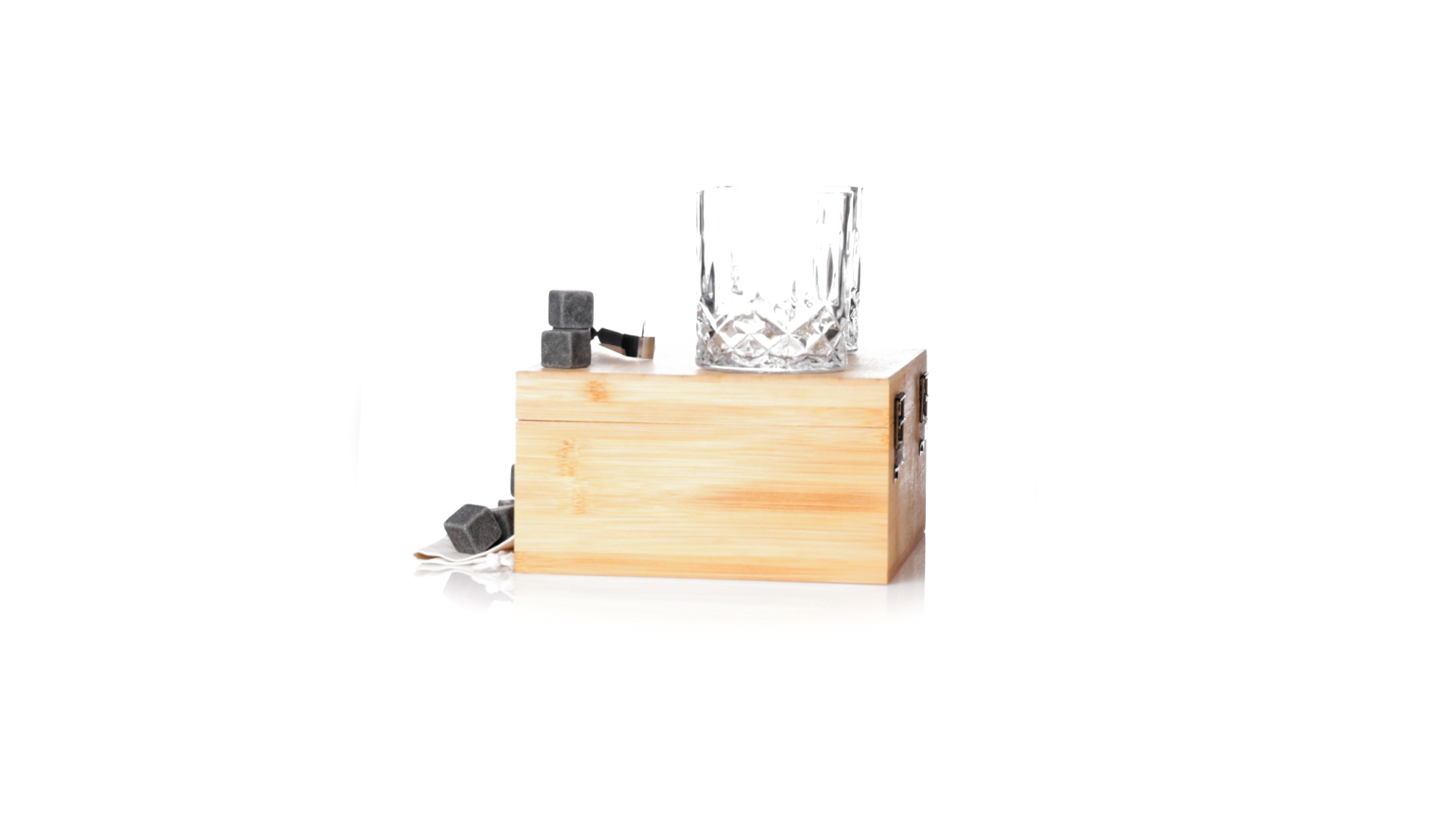 Whisky-Set im eleganten Bambus-Etui mit gestanzter Innenseite. Enthält 2 x 320ml Kristallgläser, Pinzette und 8 wiederverwendbare Natursteinwürfel, im Baumwollbeutel. Präsentiert in einer individuellen Kraftbox.Die wiederverwendbaren Eiswürfel bestehen aus natürlichem Speckstein, auch bekannt als Speckstein oder Speckstein, der das Getränk kalt hält, ohne seine Eigenschaften zu verändern, indem er seinen Inhalt nicht mit Wasser verdünnt, und seinen ursprünglichen Geschmack beibehält.