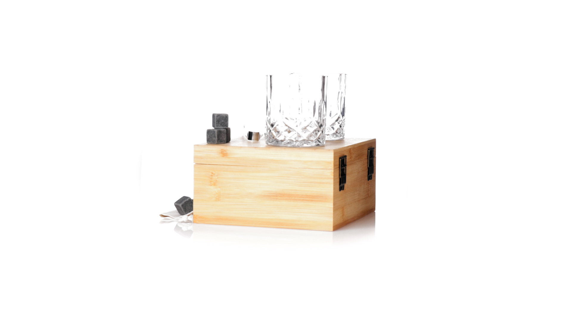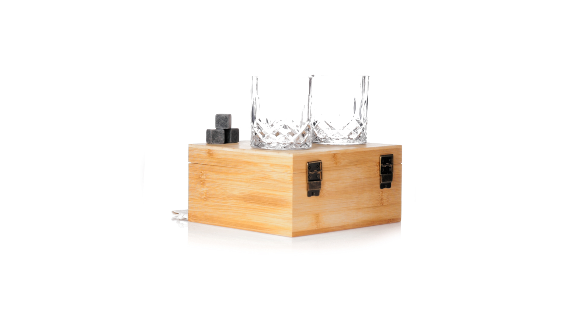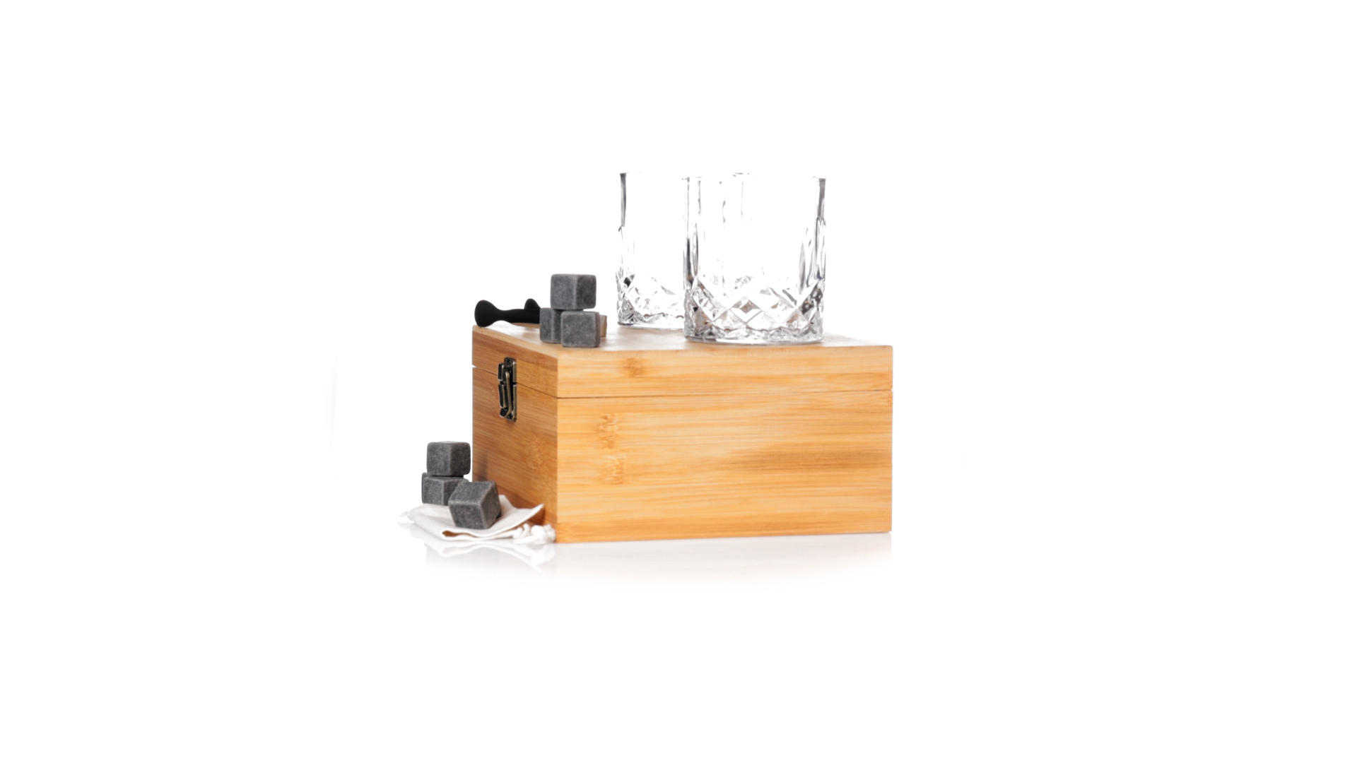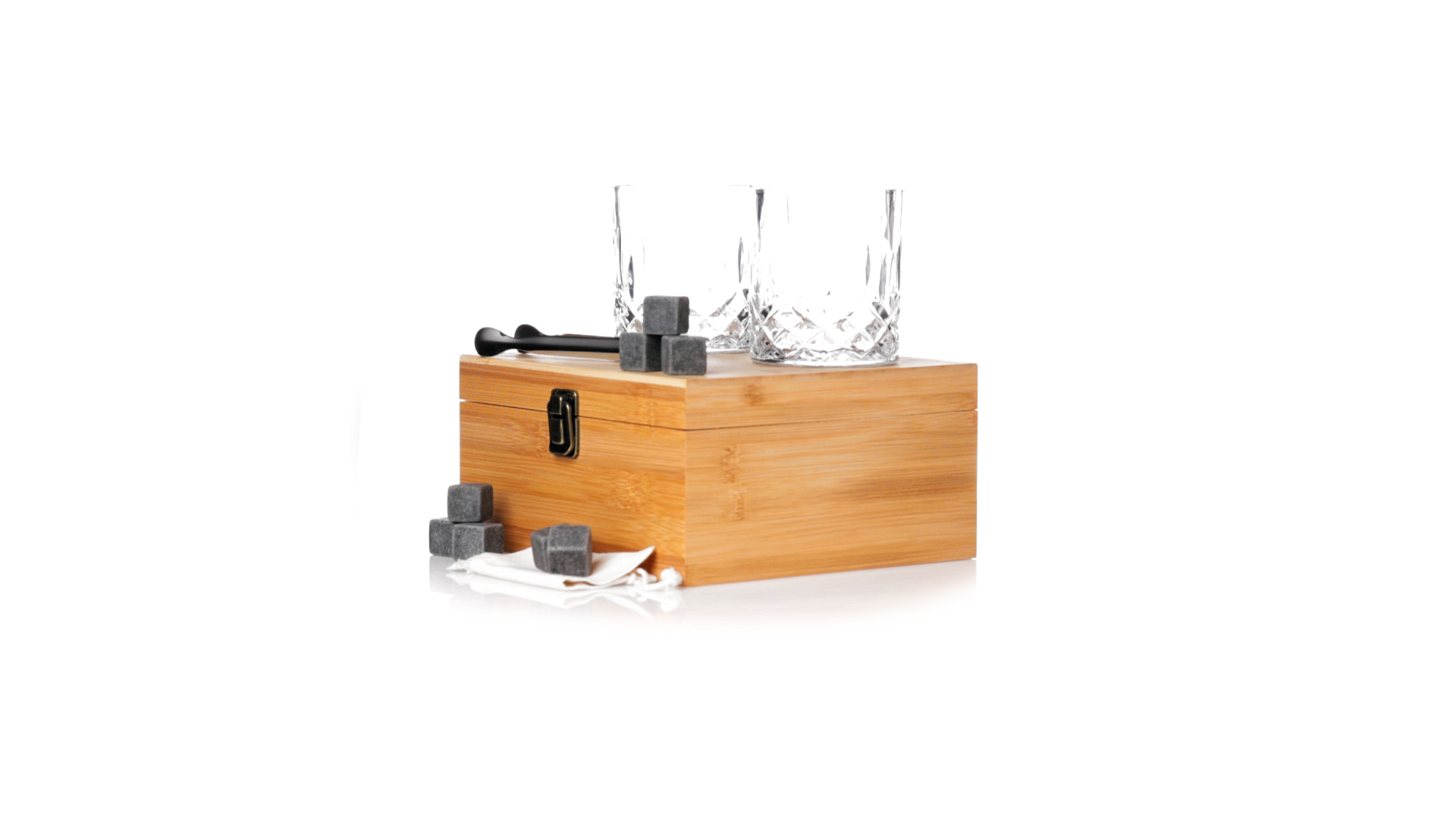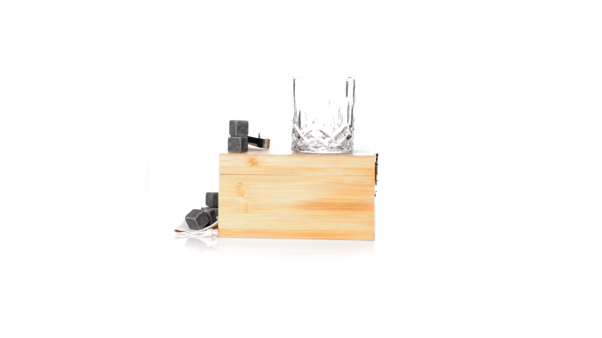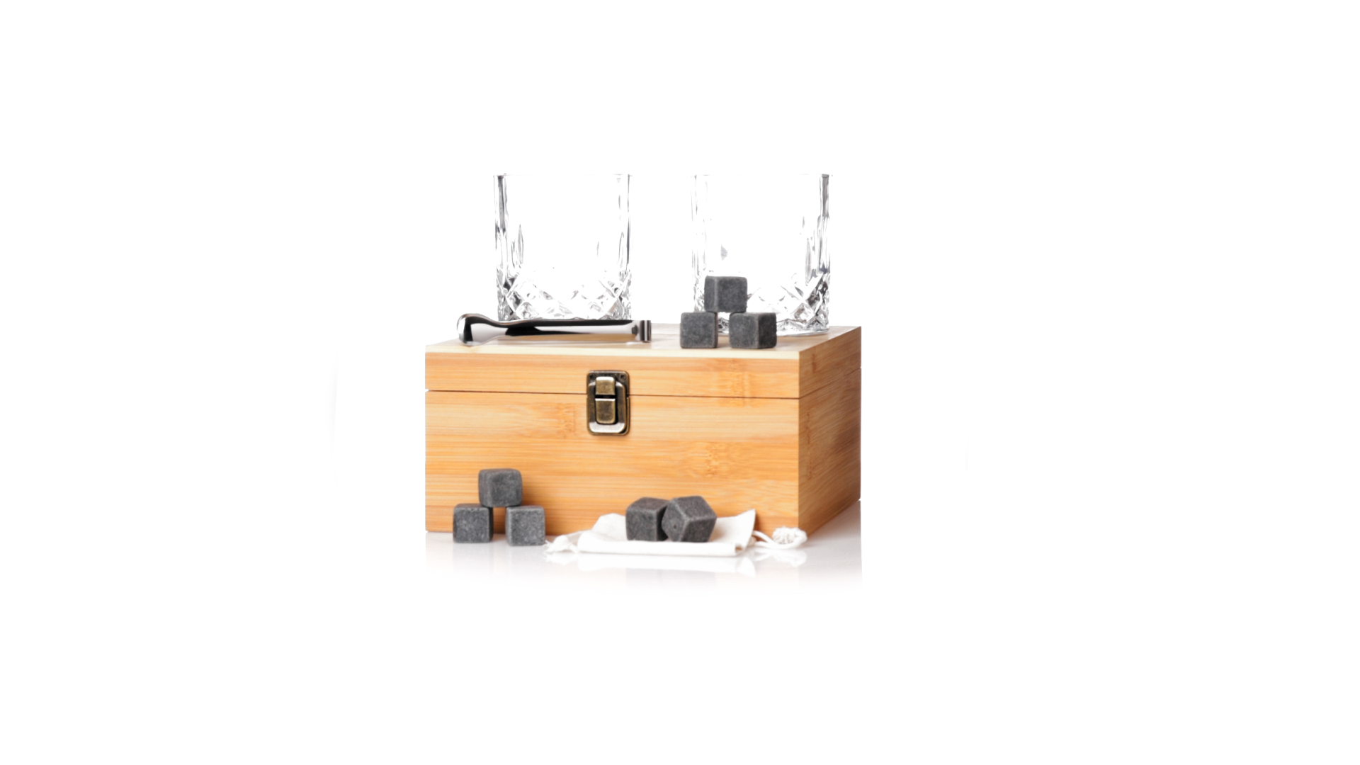 Whisky-Set im eleganten Bambus-Etui mit gestanzter Innenseite. Enthält 2 x 320ml Kristallgläser, Pinzette und 8 wiederverwendbare Natursteinwürfel, im Baumwollbeutel. Präsentiert in einer individuellen Kraftbox.Die wiederverwendbaren Eiswürfel bestehen aus natürlichem Speckstein, auch bekannt als Speckstein oder Speckstein, der das Getränk kalt hält, ohne seine Eigenschaften zu verändern, indem er seinen Inhalt nicht mit Wasser verdünnt, und seinen ursprünglichen Geschmack beibehält.
