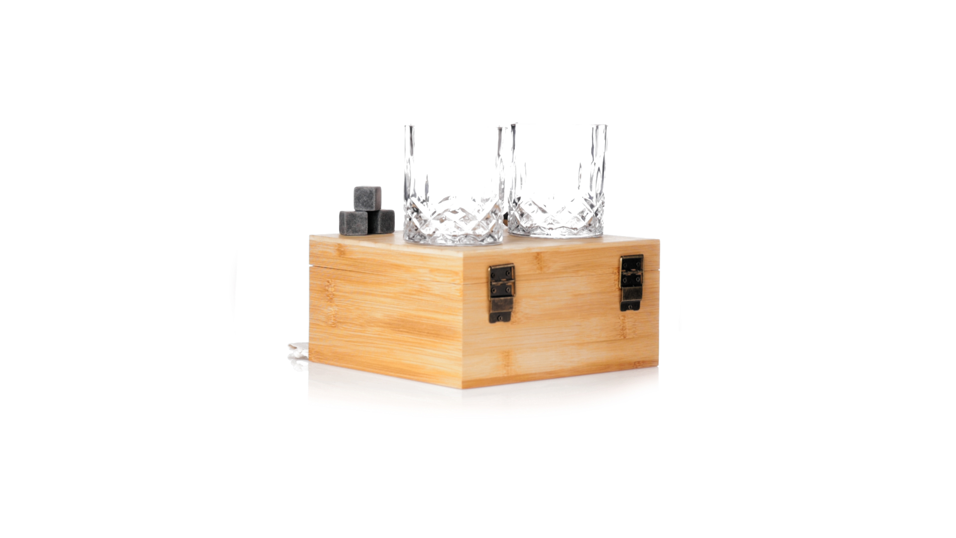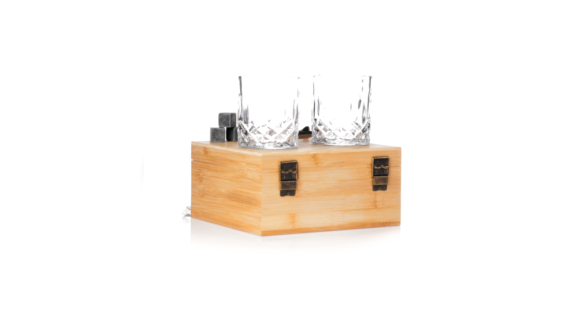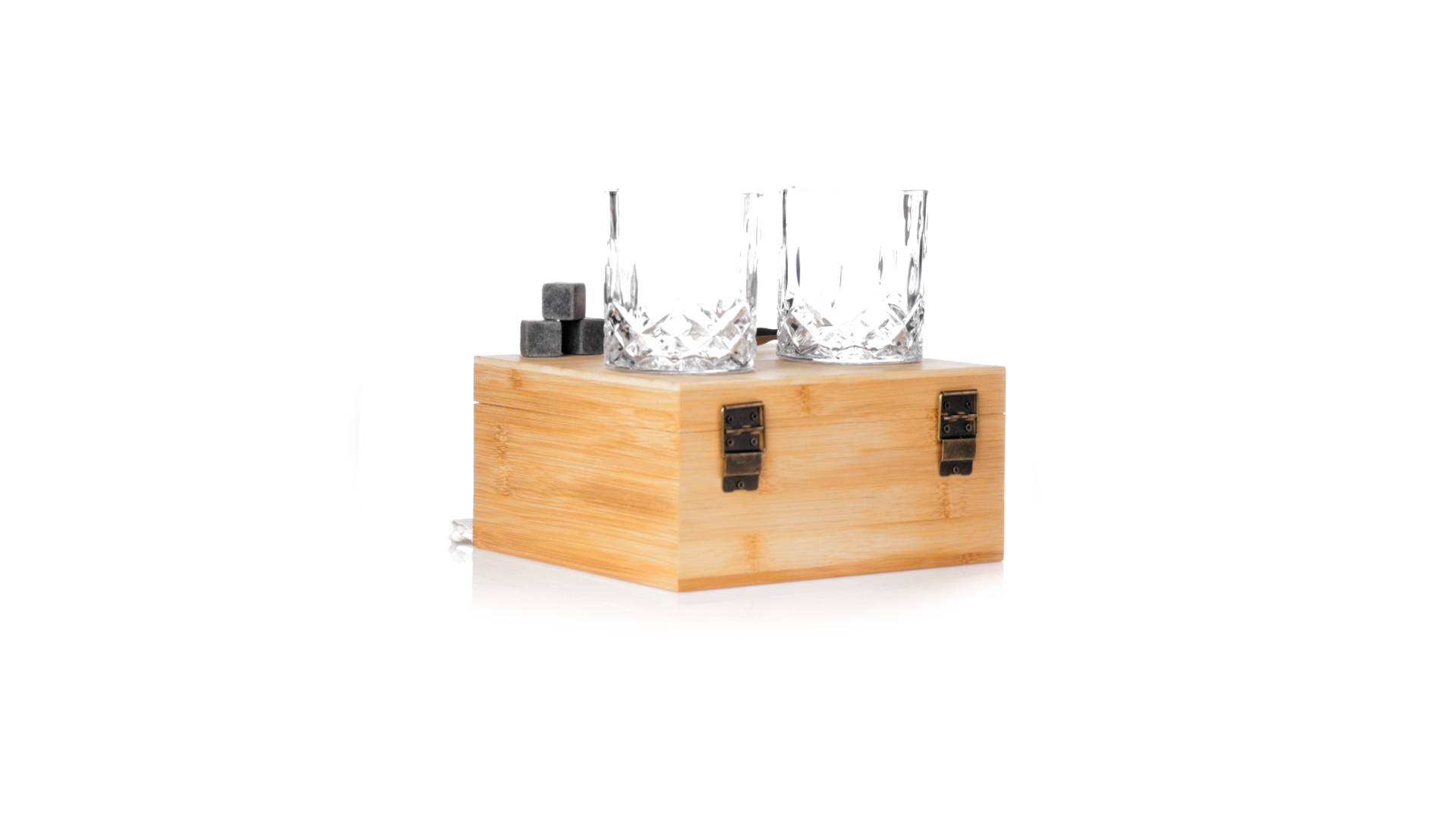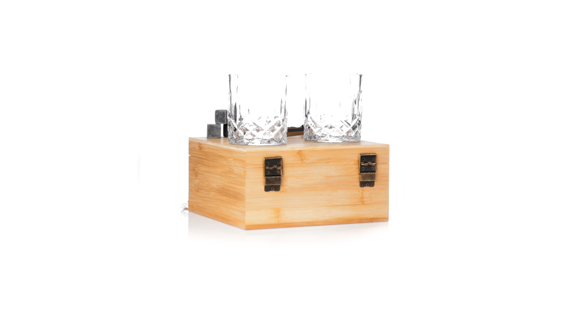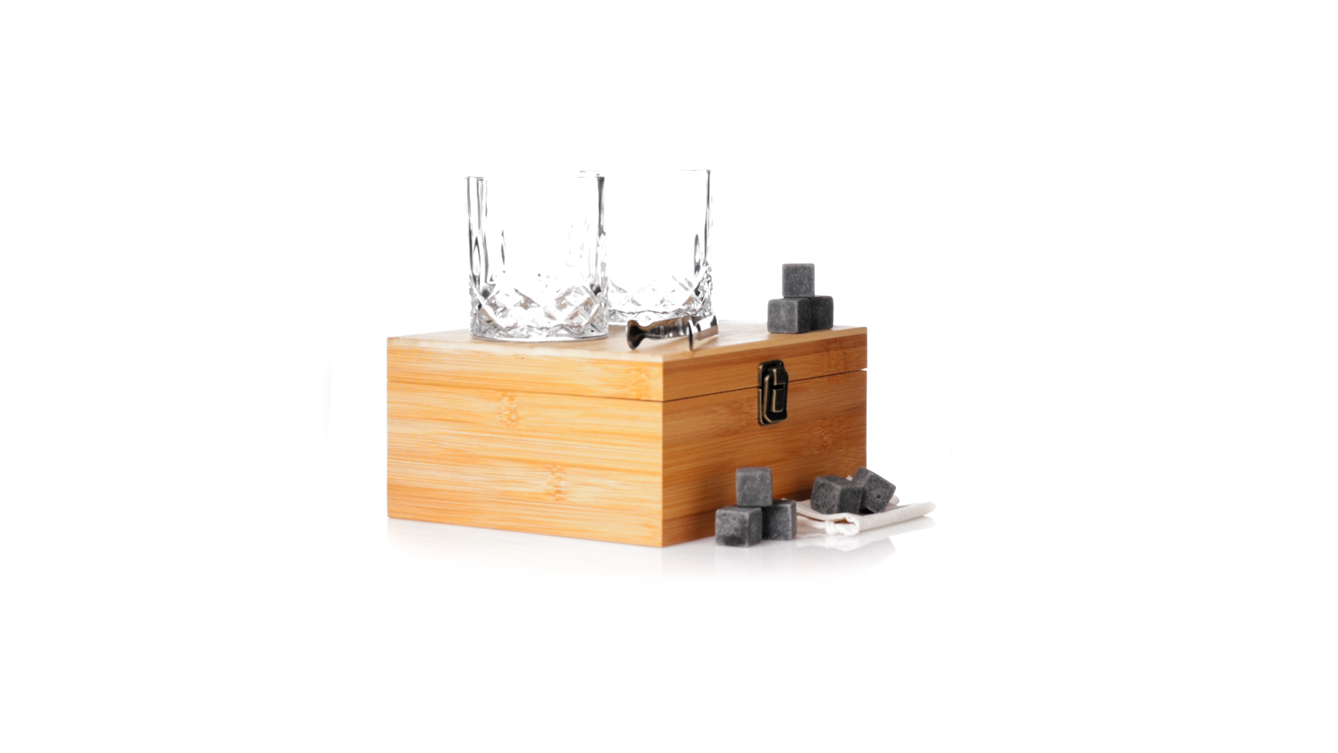 Whisky-Set im eleganten Bambus-Etui mit gestanzter Innenseite. Enthält 2 x 320ml Kristallgläser, Pinzette und 8 wiederverwendbare Natursteinwürfel, im Baumwollbeutel. Präsentiert in einer individuellen Kraftbox.Die wiederverwendbaren Eiswürfel bestehen aus natürlichem Speckstein, auch bekannt als Speckstein oder Speckstein, der das Getränk kalt hält, ohne seine Eigenschaften zu verändern, indem er seinen Inhalt nicht mit Wasser verdünnt, und seinen ursprünglichen Geschmack beibehält.