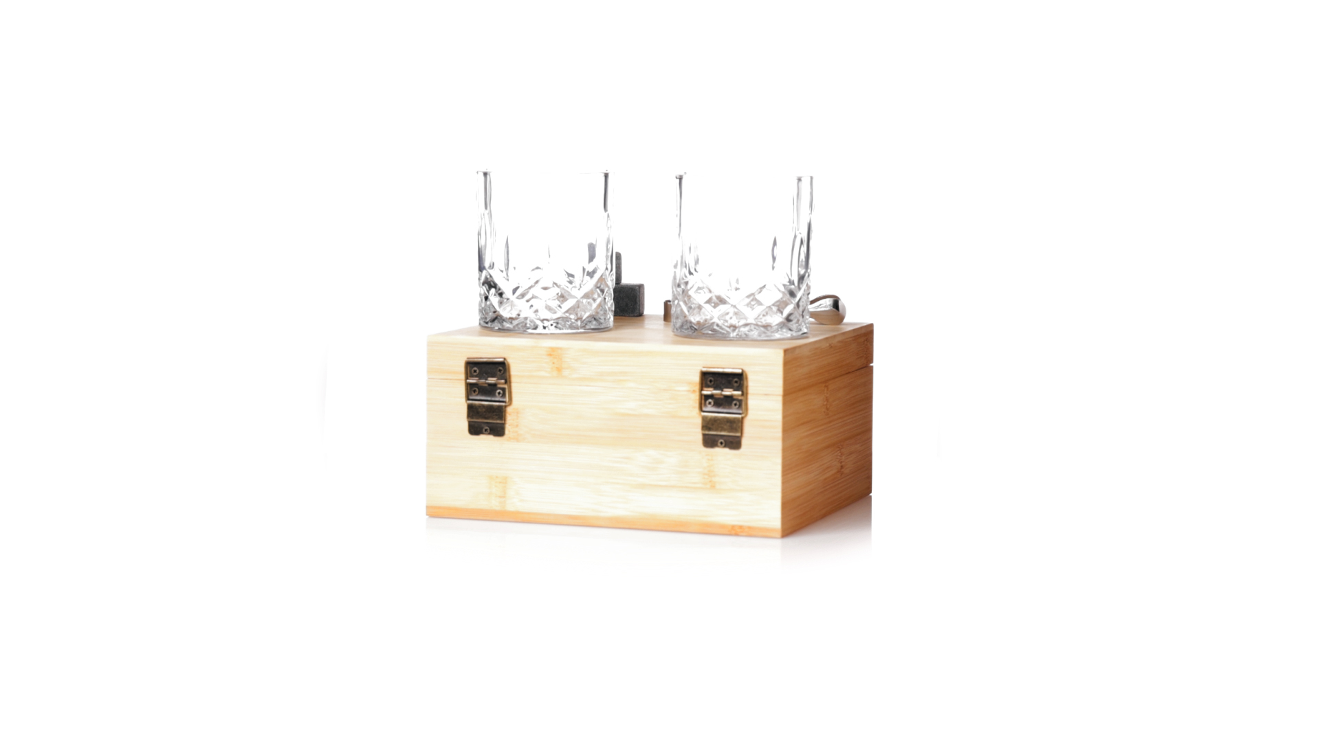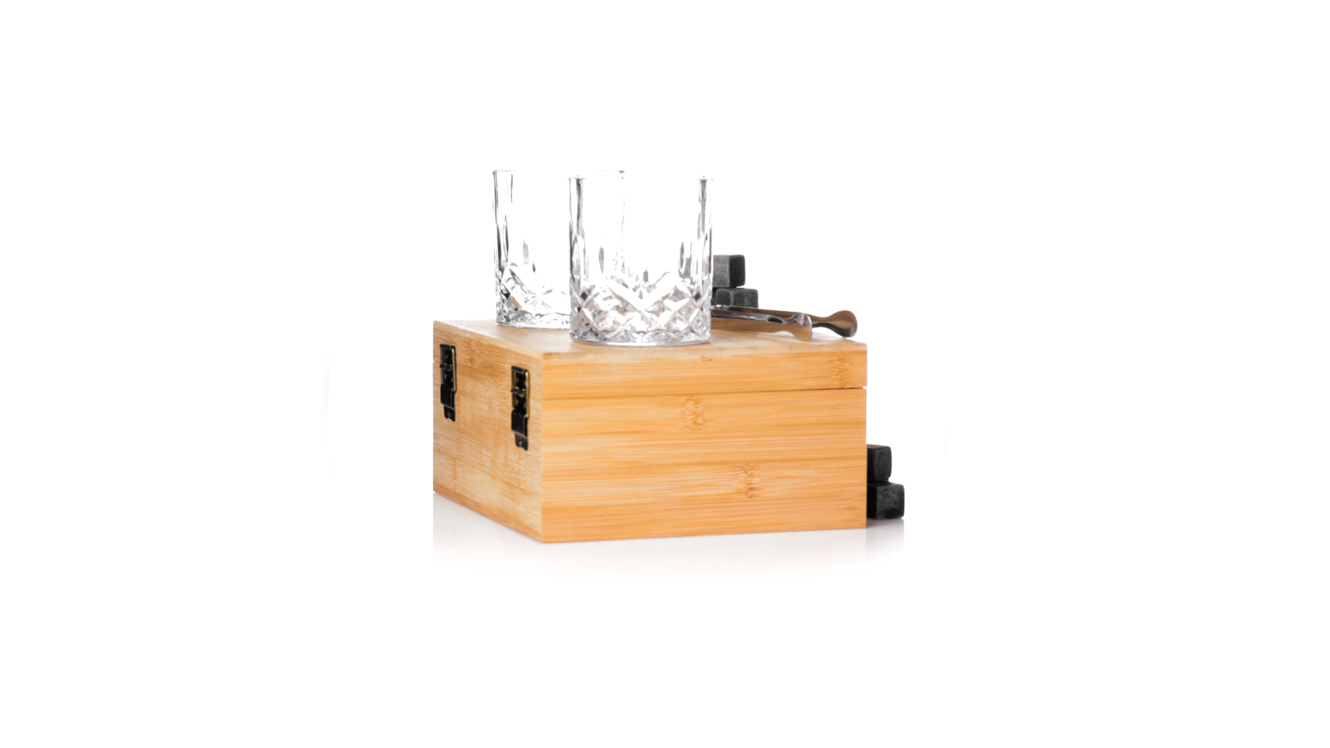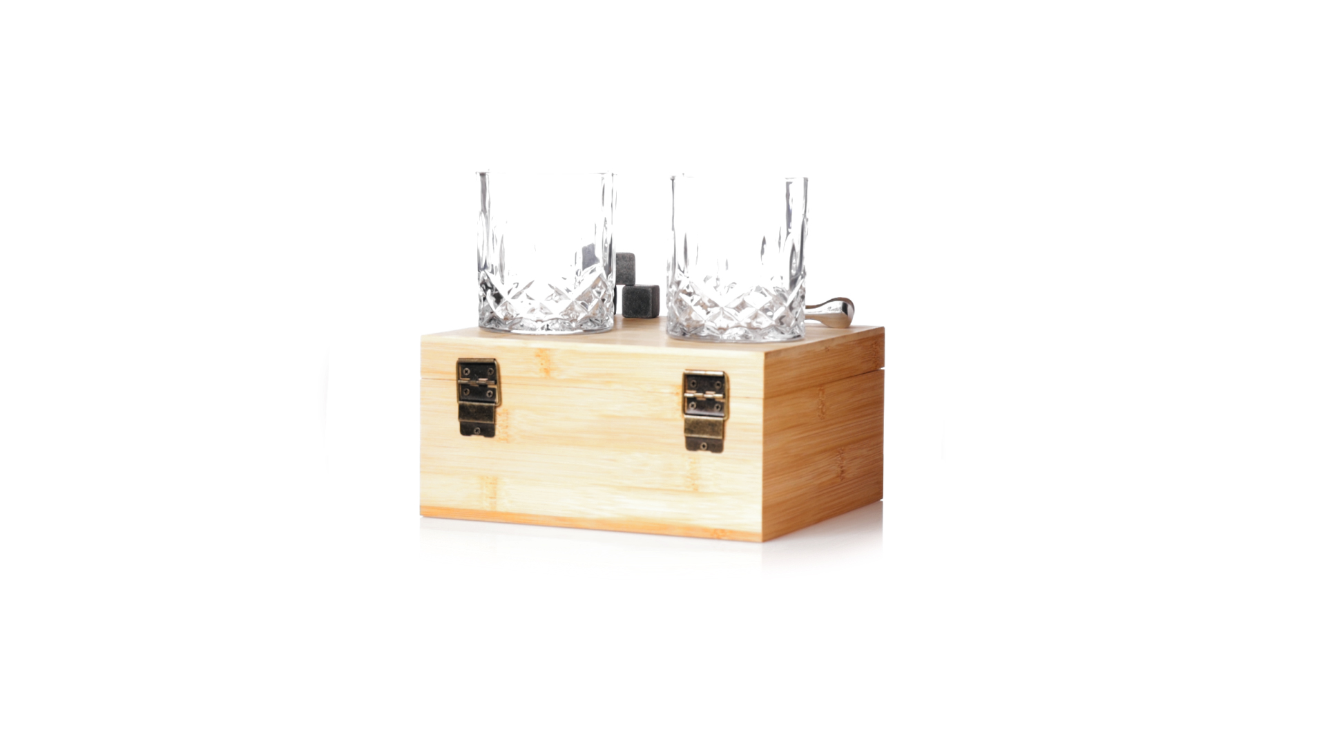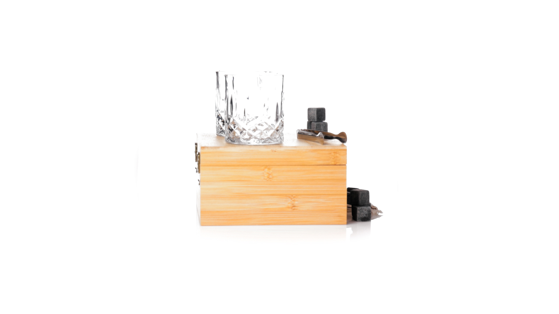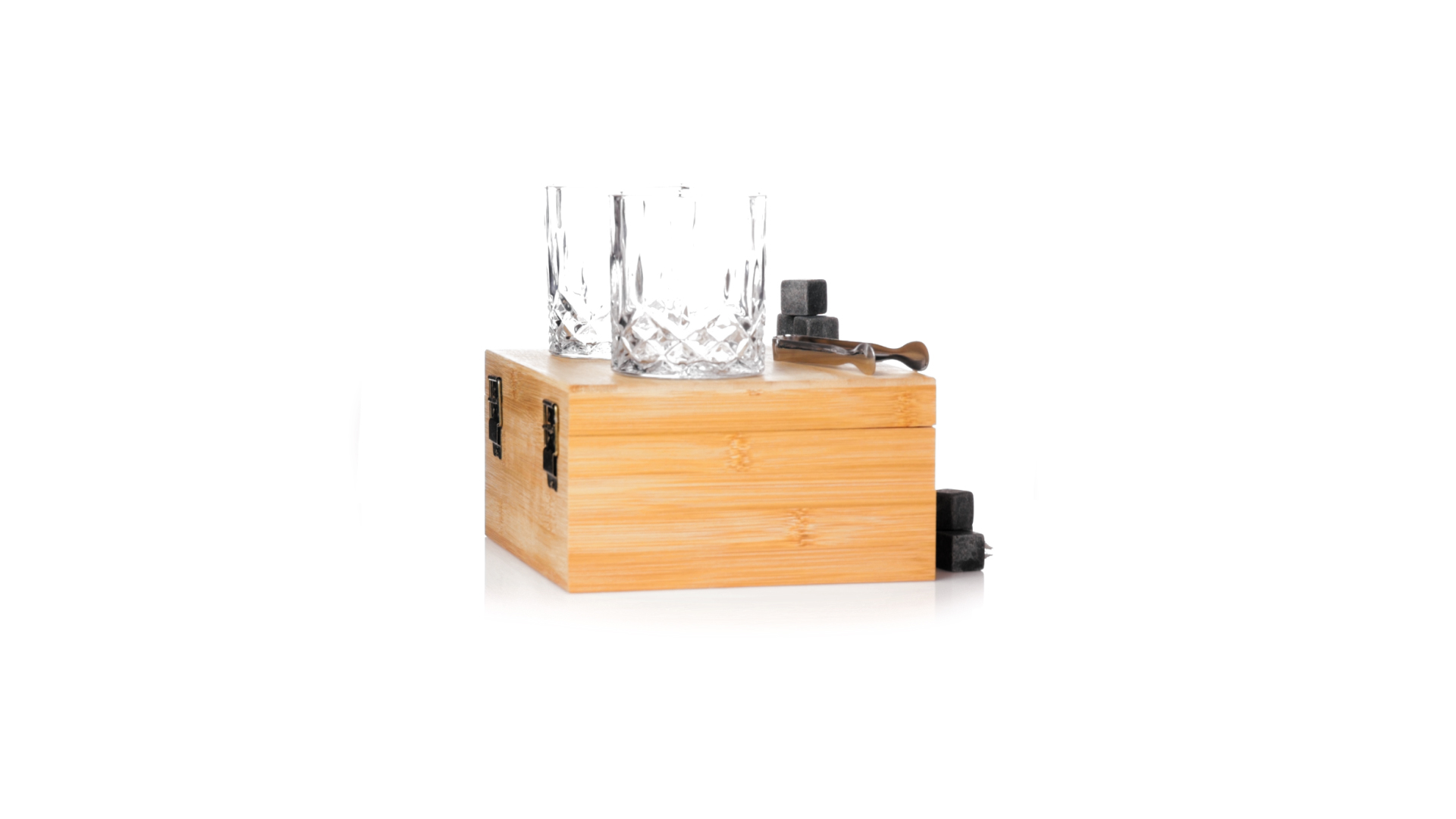 Whisky-Set im eleganten Bambus-Etui mit gestanzter Innenseite. Enthält 2 x 320ml Kristallgläser, Pinzette und 8 wiederverwendbare Natursteinwürfel, im Baumwollbeutel. Präsentiert in einer individuellen Kraftbox.Die wiederverwendbaren Eiswürfel bestehen aus natürlichem Speckstein, auch bekannt als Speckstein oder Speckstein, der das Getränk kalt hält, ohne seine Eigenschaften zu verändern, indem er seinen Inhalt nicht mit Wasser verdünnt, und seinen ursprünglichen Geschmack beibehält.
