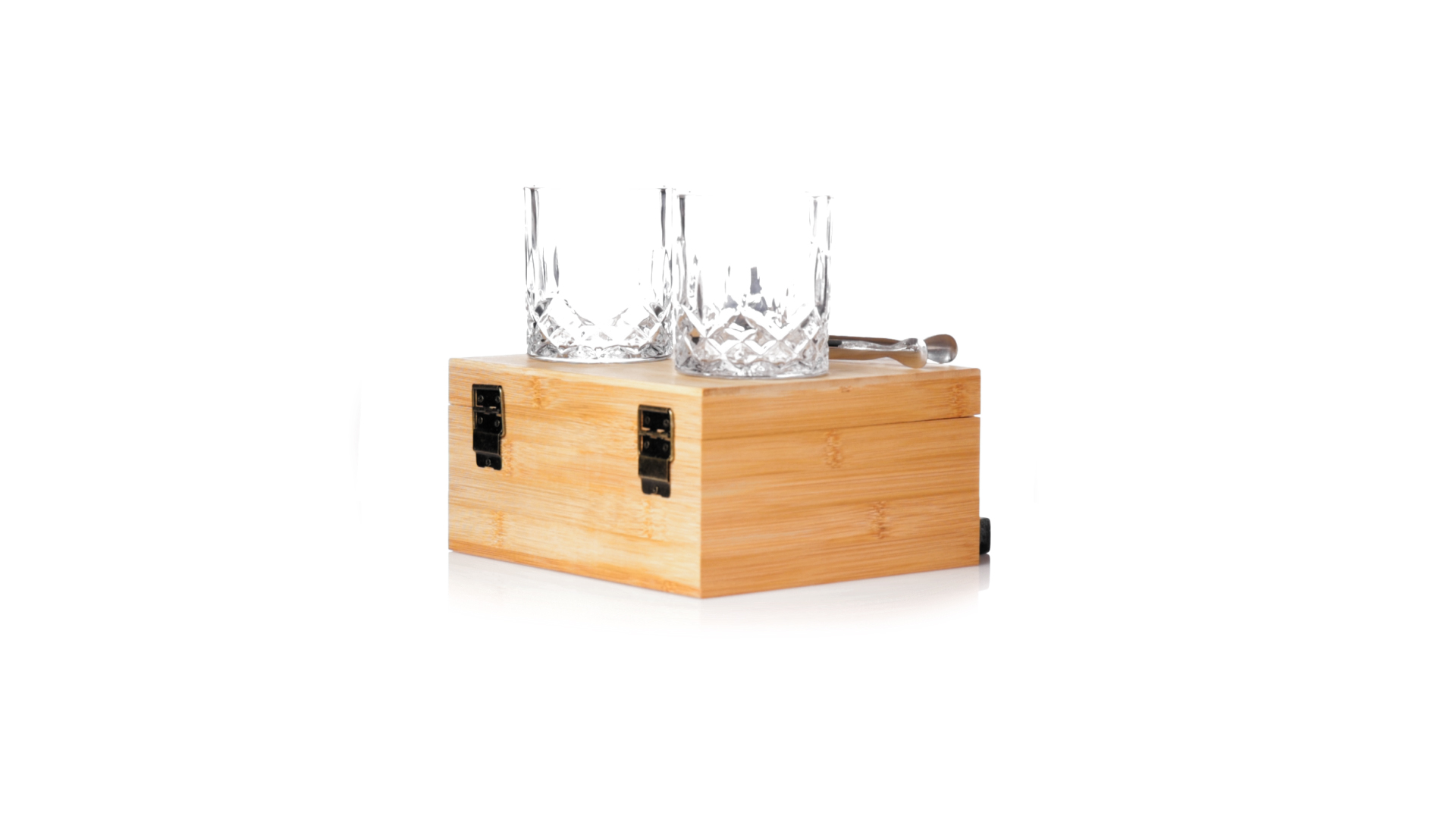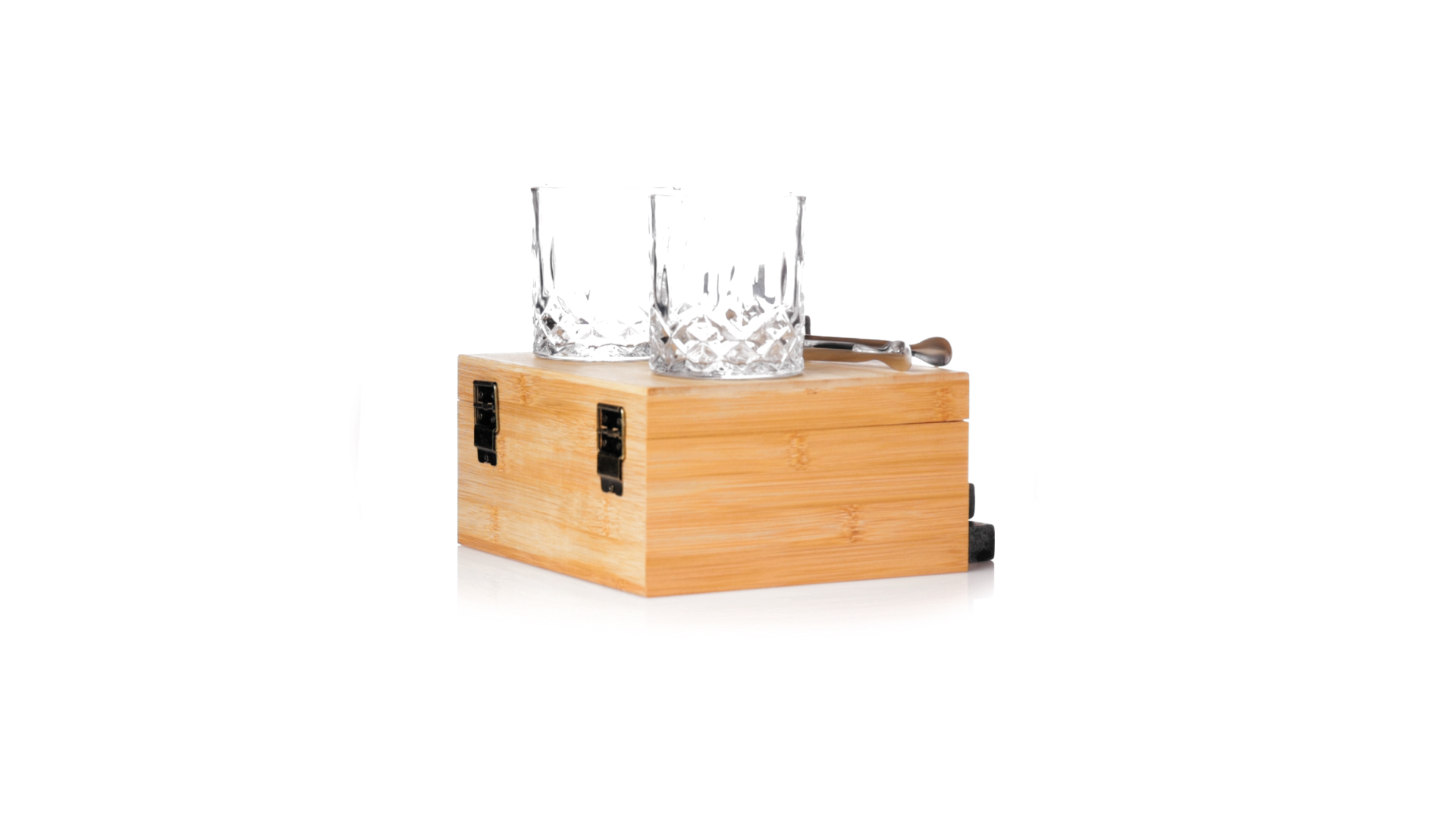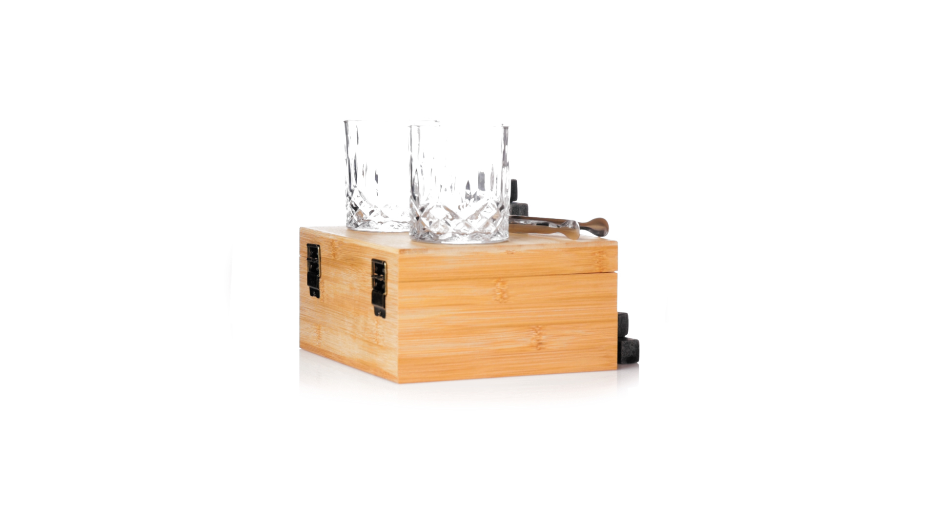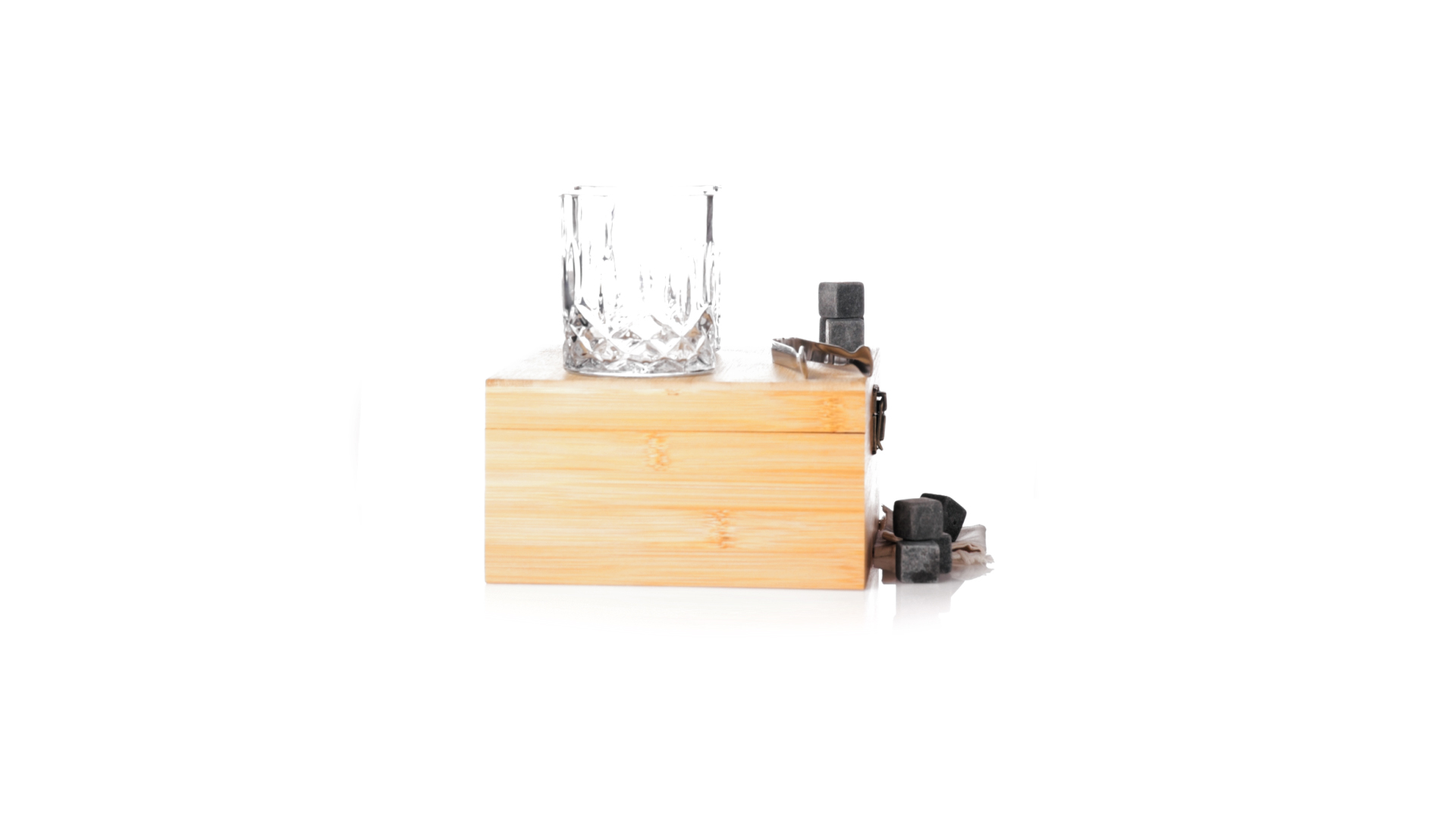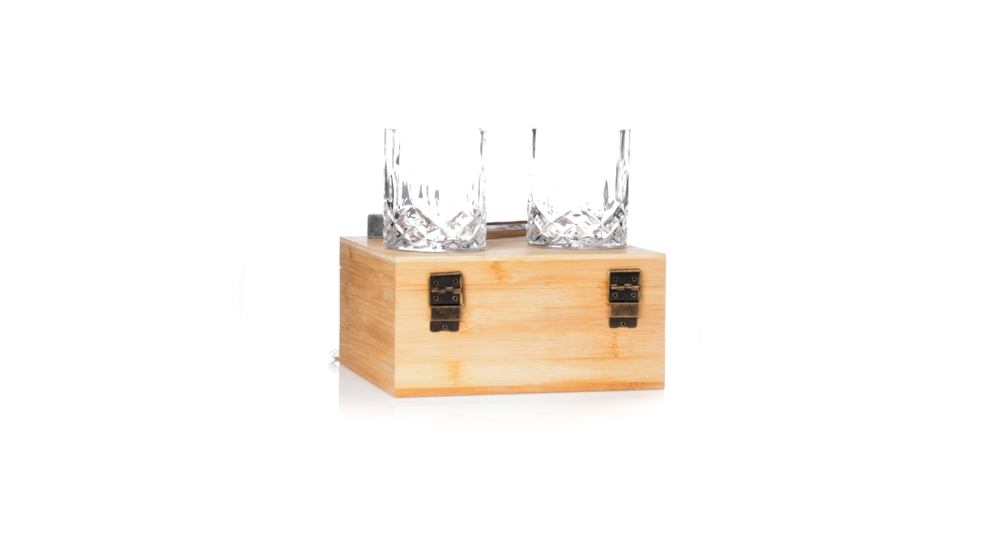 Whisky-Set im eleganten Bambus-Etui mit gestanzter Innenseite. Enthält 2 x 320ml Kristallgläser, Pinzette und 8 wiederverwendbare Natursteinwürfel, im Baumwollbeutel. Präsentiert in einer individuellen Kraftbox.Die wiederverwendbaren Eiswürfel bestehen aus natürlichem Speckstein, auch bekannt als Speckstein oder Speckstein, der das Getränk kalt hält, ohne seine Eigenschaften zu verändern, indem er seinen Inhalt nicht mit Wasser verdünnt, und seinen ursprünglichen Geschmack beibehält.