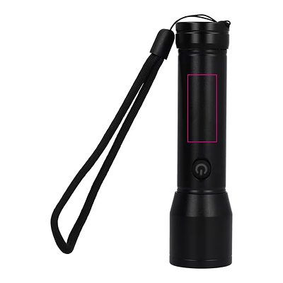 Wiederaufladbare Taschenlampe mit einem 1200-mAh-Akku und 5-W-LED-Licht mit 200 lm Helligkeit. Verfügt über eine Handschlaufe, mehrere Lichtmodi (hoch, niedrig und Blitz) und eine Zoomfunktion. Hergestellt aus recyceltem Aluminium und wasserdicht nach IPX4.