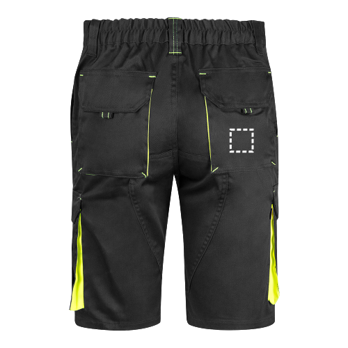 Zweifarbige Stretch-Bermudashorts mit mehreren Taschen (240 g/m²), aus Baumwolle (46%), EME (38%) und Polyester (16%). Mit elastischem Bund, farblich abgesetzten Zwickeln, Zuglasche und Nähten sowie Stoffverstärkung auf der Rückseite. Enthält sechs Taschen (2 französische Taschen, 2 seitliche Zwickeltaschen und 2 Gesässzwickeltaschen). Grösse: 34, 36, 38, 40, 42, 44, 46, 48, 50, 52, 54, 56, 58, 60