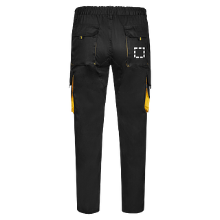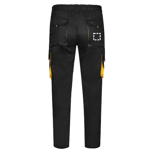 Zweifarbige Twill Arbeitshose mit mehreren Taschen (200 g/m²), aus Baumwolle (35 %) und Polyester (65 %). Mit elastischem Bund und kontrastierenden Farben an den Zwickeln, Zugbändern und Nähten. Enthält sechs Taschen: (2 französische Taschen, 2 seitliche Zwickeltaschen und 2 Gesässzwickeltaschen). Grösse: 34, 36, 38, 40, 42, 44, 46, 48, 50, 52, 54, 56, 58, 60